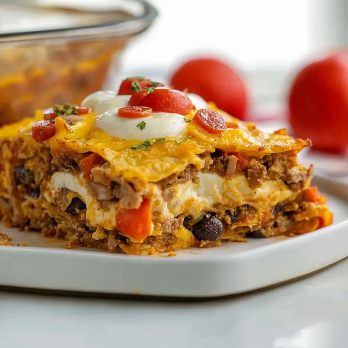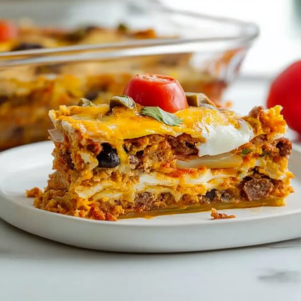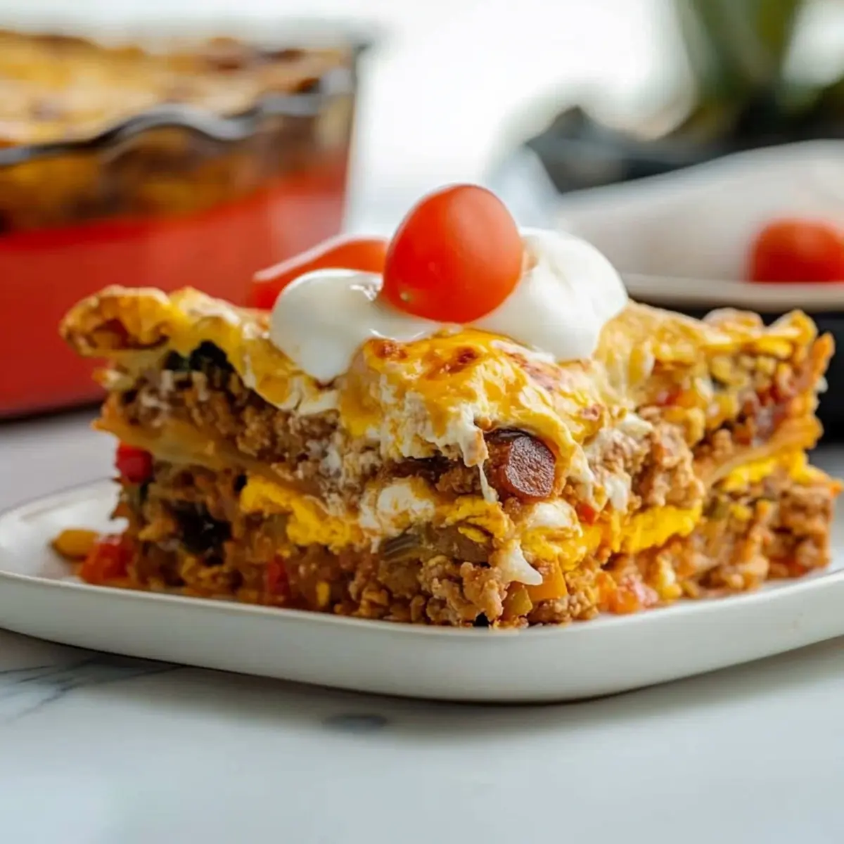 As the sun peeks through my kitchen window, I can already smell the comforting aroma of my Mexican Breakfast Casserole starting to come together. Packed with cheesy eggs, spicy chorizo, and vibrant peppers, this dish is a game changer for busy mornings. Not only can you prepare it the night before, but it also transforms the mundane task of breakfast into a delightful experience that satisfies everyone at the table. It’s hearty, it’s easy to make, and let’s be honest—who doesn’t love a little spice in their morning routine? So, are you ready to bring that lively flavor right into your own home? Let’s dive into this delicious make-ahead breakfast that will have you dreaming of mornings spent around the table with laughter and love. Why is this casserole a must-try? Hearty, Flavorful Delight: This Mexican Breakfast Casserole is a wonderful union of cheesy eggs and spicy chorizo, making it the perfect start to your day. Make-Ahead Convenience: Easily prepare it the night before, allowing you to slide it into the oven on busy mornings. Crowd-Pleasing Impact: Your family and friends will rave about this dish, making it ideal for brunch gatherings or weekend feasts! Versatile Ingredients: Feel free to substitute the chorizo with breakfast sausage, or toss in veggies like spinach for extra nutrition. Comforting Texture: Enjoy a mix of soft tortillas, tender veggies, and gooey cheese that create a satisfying bite packed with flavor. Serve it alongside sliced avocado and salsa for a breakfast that’s not just a meal, but a joyful experience. Looking for more make-ahead breakfast ideas? Check out our Hashbrown Breakfast Casserole and Cheese Croissant Breakfast for more delicious options! Mexican Breakfast Casserole Ingredients For the Base Olive Oil – Adds moisture and flavor; substitute with canola oil for a neutral taste. Large Onion – Provides aromatic flavor and sweetness; can use shallots for a milder taste. Green Pepper – Offers crunch and color; substitute with red or yellow bell peppers. Garlic – Enhances overall flavor; use garlic powder as a substitute (1/8 tsp per clove). For the Filling Ground Chorizo – Adds spice and richness; substitute with ground turkey or beef for a milder version. Homemade Taco Seasoning – Provides a flavorful spice blend; use store-bought taco seasoning if preferred. Frozen Corn – Adds sweetness and texture; use fresh corn when in season. Black Beans – Contributes fiber and protein; substitute with pinto beans for a different flavor. Plum Tomatoes – Contributes juiciness and acidity; use canned diced tomatoes if fresh are unavailable. For the Layers Corn Tortillas – Forms the base layers of the casserole; substitute with flour tortillas for a softer texture. Shredded Mexican Style Cheese – Adds creaminess and flavor; use cheddar or Monterey Jack as alternatives. For the Custard Eggs – Acts as the binding agent and provides protein; no substitute for egg-free version unless using egg replacers. Milk – Adds creaminess to the egg mixture; use almond or oat milk for a dairy-free option. Now that you have the ingredients prepared, you’re just a step away from creating a warm, delicious Mexican Breakfast Casserole that will surely impress your loved ones! Step‑by‑Step Instructions for Mexican Breakfast Casserole Step 1: Preheat the Oven Begin by preheating your oven to 375°F (190°C). While the oven warms up, grab a 9×13-inch baking dish and lightly coat it with cooking spray to prevent sticking. This crucial first step ensures that your Mexican Breakfast Casserole bakes evenly and develops a beautiful golden top. Step 2: Sauté the Vegetables In a large skillet, heat 1 tablespoon of olive oil over medium heat. Add the chopped onion, diced green pepper, and minced garlic, cooking for about 2 minutes until fragrant and slightly softened. The colors will brighten, hinting at the delicious flavors soon to come. Stir occasionally to prevent sticking and ensure even cooking. Step 3: Cook the Chorizo Next, add the ground chorizo and your homemade taco seasoning to the skillet. Cook for 5-7 minutes, breaking the chorizo apart as it browns. You’ll know it’s ready when the chorizo is no longer pink and has developed a nice crust. Stir in the frozen corn, black beans, and chopped plum tomatoes, warming everything through for another few minutes. Step 4: Layer the Tortillas Now it’s time to assemble your Mexican Breakfast Casserole! Layer 12 tortilla quarters evenly at the bottom of the prepared baking dish. Sprinkle a third of the meat mixture from the skillet over the tortillas, followed by ½ cup of shredded cheese. Repeat this layering process two more times, finishing with a layer of tortillas on top for a stable base. Step 5: Mix the Egg Mixture In a mixing bowl, beat together the eggs and milk until well combined. Pour this creamy mixture evenly over the layered casserole, ensuring it seeps through to all layers. The egg will bind everything together as it bakes, creating a wonderful cheesy texture throughout your Mexican Breakfast Casserole. Step 6: Bake the Casserole Cover the dish with aluminum foil and either refrigerate overnight for a make-ahead option or bake immediately. If baking right away, place it in your preheated oven for about 30 minutes. When you remove the foil, look for the edges to be set and the top lightly golden, signaling that it’s time to add the remaining cheese on top. Step 7: Final Bake and Serve Return the uncovered casserole to the oven and bake for an additional 20-25 minutes. You’ll know it’s done when a knife inserted in the center comes out clean. Let it cool slightly before serving hot. Pair your Mexican Breakfast Casserole with sliced avocado, fresh salsa, and a dollop of sour cream for a truly delightful morning treat. How to Store and Freeze Mexican Breakfast Casserole Fridge: Keep leftovers in an airtight container for up to 3 days. Simply reheat in the microwave or oven until