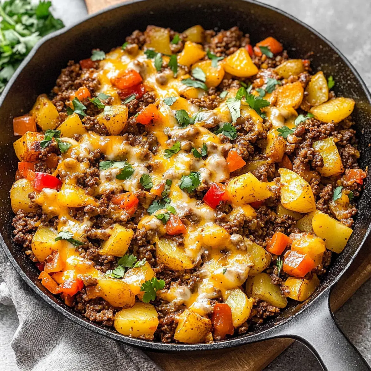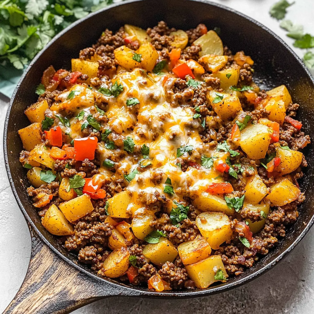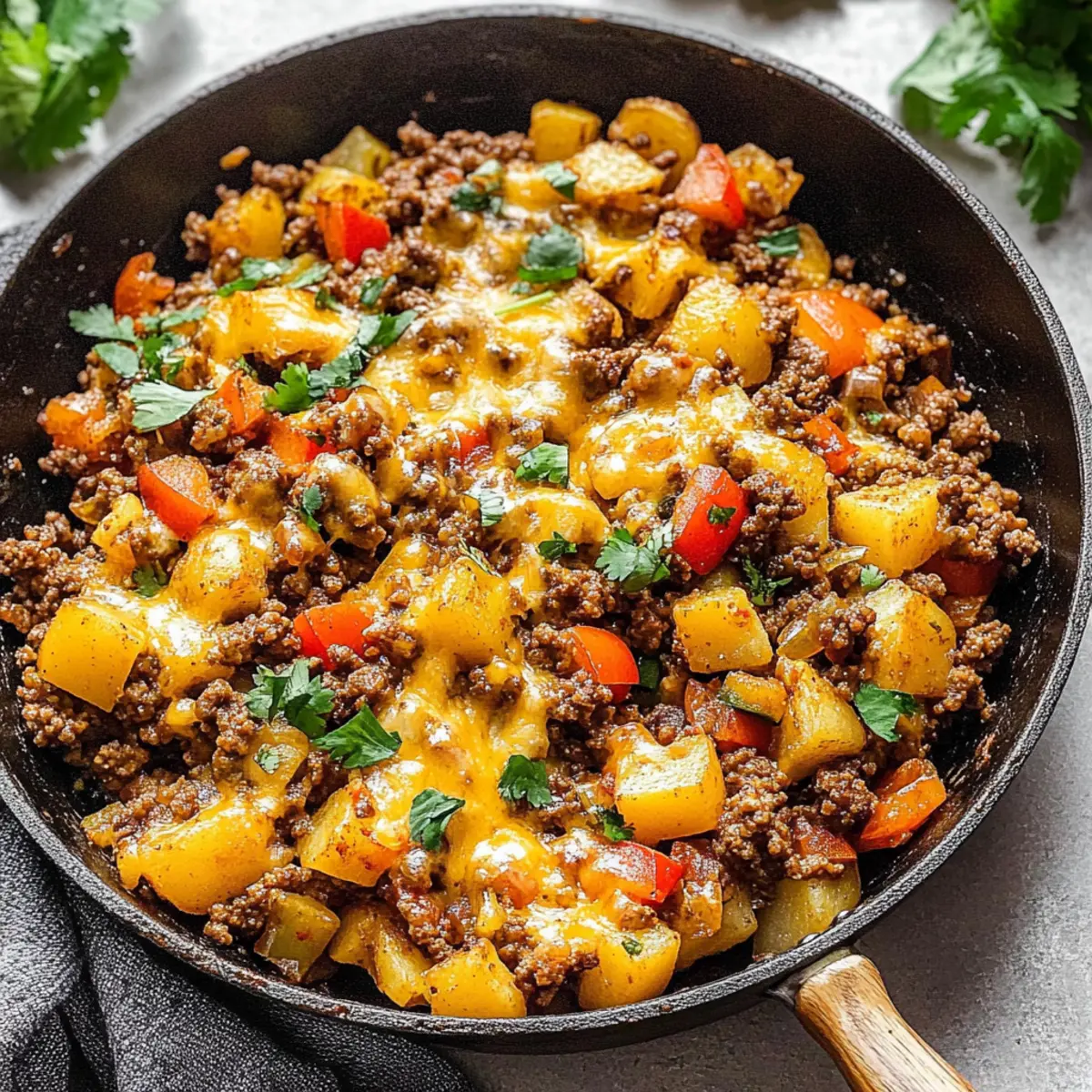 As I stood over my stovetop, the smell of sizzling ground beef mingling with earthy spices filled my kitchen, transporting me to a warm Mexican kitchen where family gathers to celebrate. This Cheesy Mexican Ground Beef and Potato Skillet is everything a busy night could ask for: a delightful one-pan meal that comes together in under 30 minutes, making it the perfect quick dinner solution when time is tight. Loaded with hearty potatoes, colorful bell peppers, and topped with gooey cheese, it’s a family-friendly feast that promises smiles at the dinner table. Best of all, you can customize this recipe with your favorite ingredients, ensuring that every member of the family can enjoy it their way. Curious about how this simple dish can turn your weeknight dinners into a vibrant celebration? Let’s dive in! Why is This Skillet Recipe a Must-Try? Quick and Easy: This one-pan wonder comes together in under 30 minutes, making it perfect for busy weeknights. Family-Friendly: Packed with hearty ingredients, it caters to everyone, ensuring no one leaves the table hungry. Versatile Options: Customize with your favorite** veggies** or swap out beef for turkey for a lighter twist. Flavor-Packed: Infused with aromatic** spices** and topped with gooey cheese, every bite is a taste sensation! Effortless Cleanup: Say goodbye to multiple pots—this skillet does it all, leaving you more time to relax. For a refreshing side, try pairing it with an avocado corn salad or a side of rice and tortilla chips. Mexican Ground Beef and Potato Skillet Ingredients For the Skillet • Avocado Oil – A great cooking fat for sautéing; substitute with olive or vegetable oil if needed. • Potatoes – Yukon gold preferred for a creamy texture, but red or sweet potatoes work too. • Lean Ground Beef – Choose 90/10 or leaner for a healthier option and to avoid greasiness. • Yellow Onion – The aromatic base of the dish; white or red onions can also be used. • Red Bell Pepper – Adds sweetness and color; feel free to use any color bell pepper you prefer. • Kosher Salt and Black Pepper – Essential seasonings; adjust to your taste for the perfect flavor. • Diced Green Chiles – Provides heat and flavor; choose mild or hot based on family preference. • Chili Powder – Imparts warmth and depth; using chipotle will add an extra layer of smokiness. • Ground Cumin – Adds earthy notes; there’s no direct substitute, but you could increase the chili powder. • Smoked Paprika – Brings a smoky flavor; regular paprika can be used, though it’ll be less smoky. • Cilantro – Fresh herb that brightens the dish; feel free to omit if it’s not your favorite. • Shredded Cheese – Melts beautifully on top; options include cheddar, colby jack, or pepper jack. For this fantastic Mexican Ground Beef and Potato Skillet, you’ll find it’s easy to mix up the ingredients based on what you have at home! Step‑by‑Step Instructions for Mexican Ground Beef and Potato Skillet Step 1: Heat the Oil In a large skillet, heat 2 tablespoons of avocado oil over medium-high heat for about 1-2 minutes. Swirl the oil to coat the bottom of the skillet evenly. You want the oil to shimmer but not smoke, indicating it’s hot and ready for cooking the potatoes. Step 2: Cook the Potatoes Add 2 cups of cubed Yukon gold potatoes to the skillet and cook for 5-6 minutes. Stir occasionally until the potatoes turn golden brown and soften slightly, yet maintain their shape. Look for tender edges and a nice crispy surface. This adds a wonderful texture to your Mexican Ground Beef and Potato Skillet. Step 3: Add the Ground Beef Push the potatoes to one side of the skillet and add 1 pound of lean ground beef to the empty space. Sprinkle with kosher salt and black pepper. Cook the beef for about 4-5 minutes, breaking it apart with a spatula until it’s browned and fully cooked. The sizzling sound will tell you it’s time to move to the next step. Step 4: Incorporate Vegetables Stir in 1 diced yellow onion and 1 diced red bell pepper, mixing well for about 3-4 minutes. Allow the veggies to soften while you continue breaking apart the ground beef. The vibrant colors will come together beautifully in your Mexican Ground Beef and Potato Skillet, infusing the dish with warmth. Step 5: Mix in Seasonings Add 1 can of diced green chiles, 1 tablespoon of chili powder, 1 teaspoon of ground cumin, and 1 teaspoon of smoked paprika to the skillet. Stir everything together and cook for another 2-3 minutes, letting the spices meld into the beef and potatoes. The aroma will be inviting, filling your kitchen with rich, savory scents. Step 6: Finish Cooking Cover the skillet and let it cook for an additional 6-8 minutes. This allows the potatoes to fully soften and the flavors to blend beautifully. Make sure to check that the potatoes are tender by piercing them with a fork. Once done, you’ll have a mouthwatering Mexican Ground Beef and Potato Skillet. Step 7: Add Cheese and Garnish Finally, taste the skillet for seasoning and adjust as necessary. Sprinkle 1 cup of shredded cheese over the top, then cover the skillet again to let the cheese melt for about 2-3 minutes. Once melted, garnish with fresh cilantro for a burst of color and flavor. Serve hot for a delightful family meal. Mexican Ground Beef and Potato Skillet Variations Feel free to play around with this recipe to suit your family’s tastes and dietary needs. Turkey Swap: Use ground turkey instead of beef for a lighter, leaner meal that still packs plenty of flavor. Sweet Potato Swap: Try sweet potatoes in place of Yukon gold for a hint of natural sweetness and additional nutrients. Vegetarian Option: Replace the ground beef with lentils or textured vegetable protein for a satisfying meatless meal full of flavor. Spicy Kick: Incorporate jalapeños or a dash of hot sauce for those who love an extra bit of heat in their dish. Cheesy Variations: Swap regular shredded cheese for pepper jack f