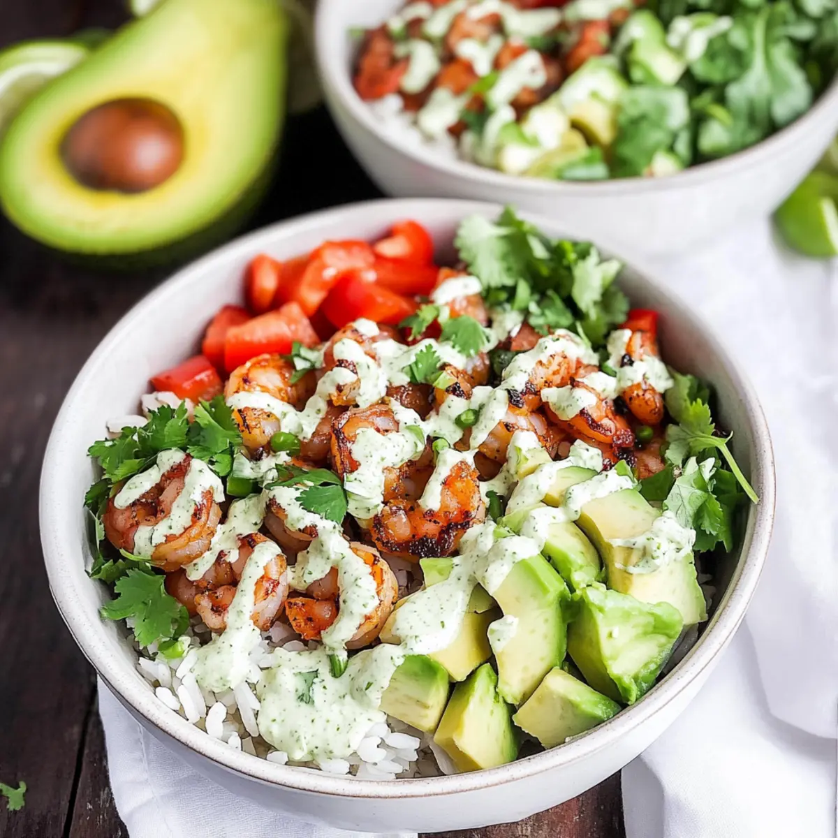 To create your delicious Mexican Rice Bowls with Shrimp, start by placing a generous scoop of the fluffy rice in each bowl. Layer it with warmed pinto beans, diced bell peppers, and avocado. Top with the cooked shrimp, ensuring each bowl gets a good portion. Drizzle the creamy cilantro lime dressing generously over the top, then garnish with extra lime juice and crumbled queso fresco if desired.