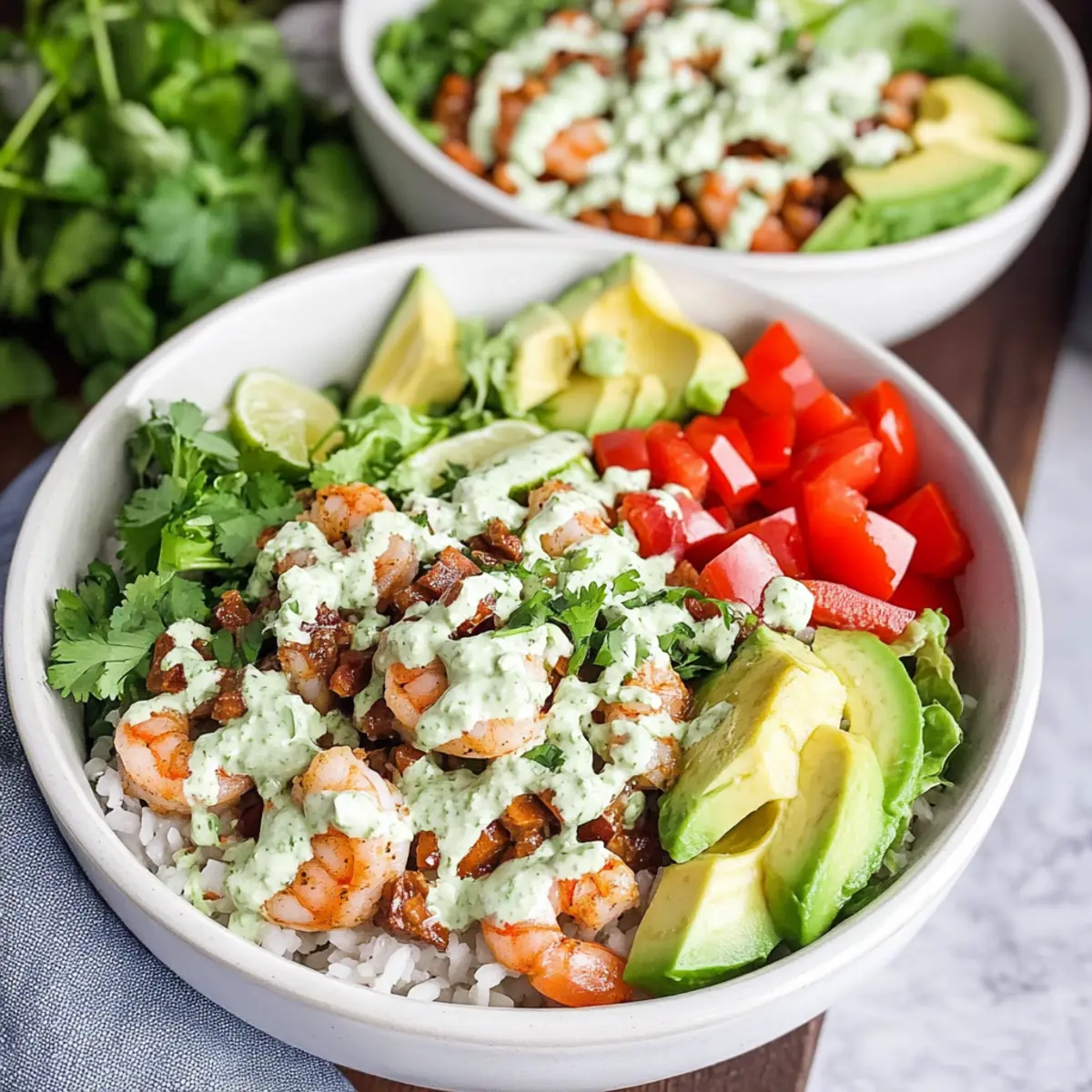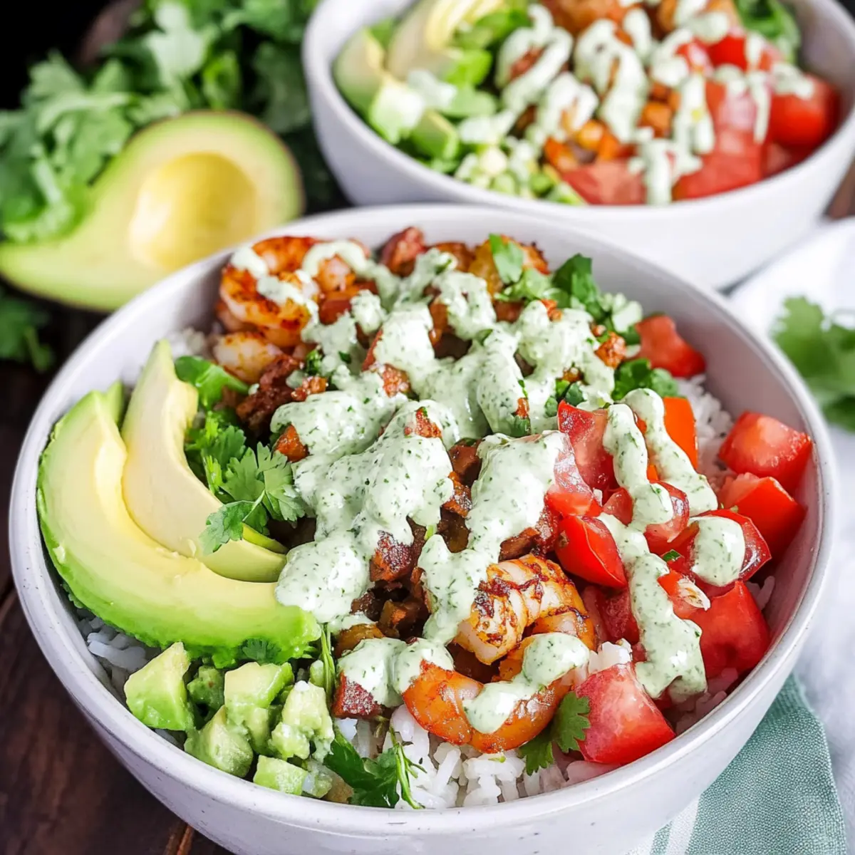 For the creamy cilantro lime dressing, combine ½ cup of sour cream, the juice of 1 lime, a drizzle of honey, a handful of fresh cilantro, and a pinch of salt in a blender. Blend until smooth and creamy, about 1-2 minutes. This zesty dressing will elevate the flavors of your Mexican Rice Bowls with Shrimp, so set it aside while you prepare to assemble.