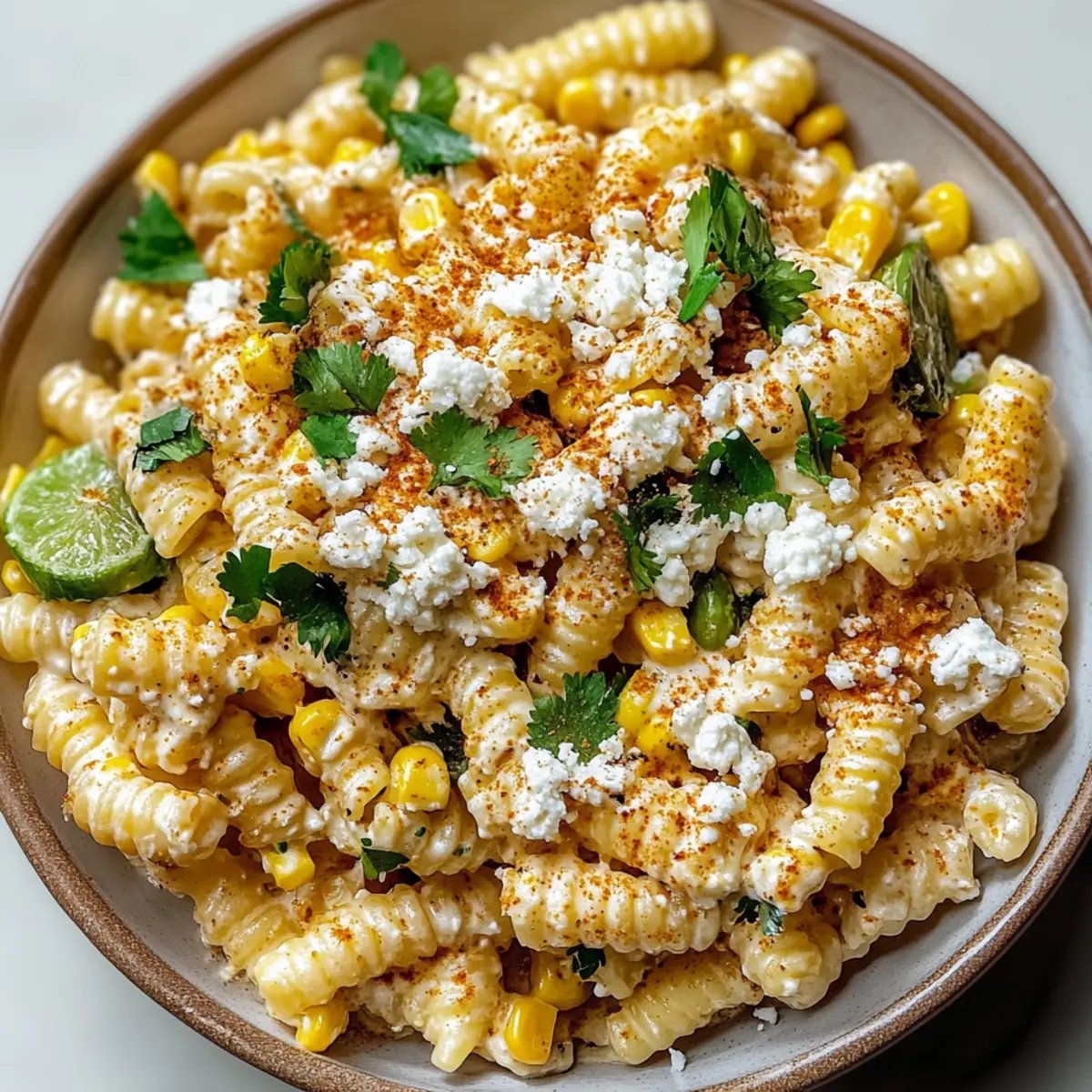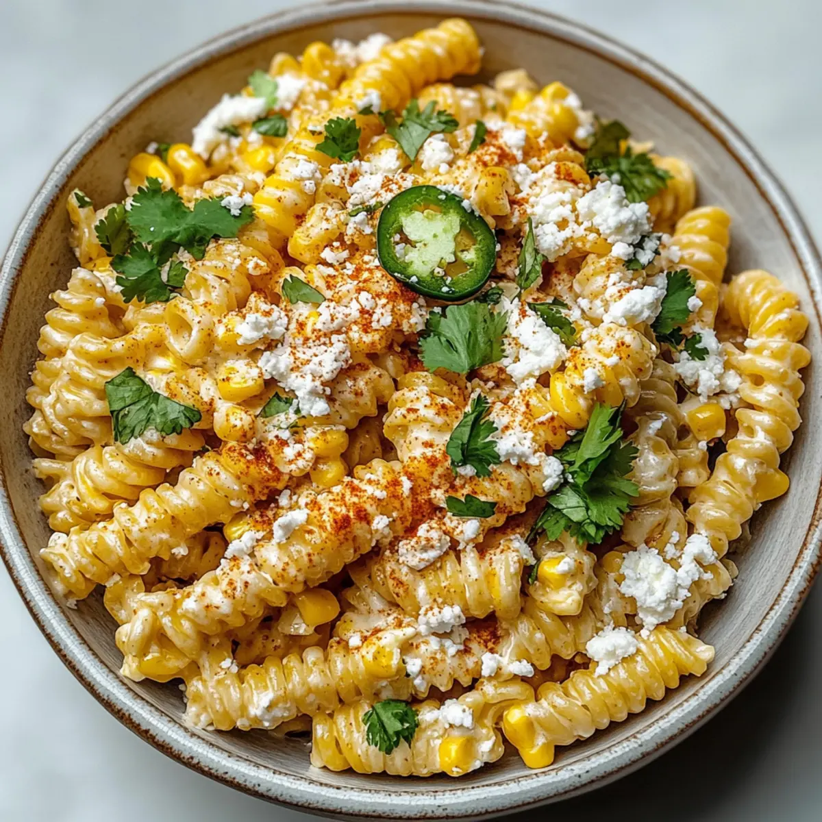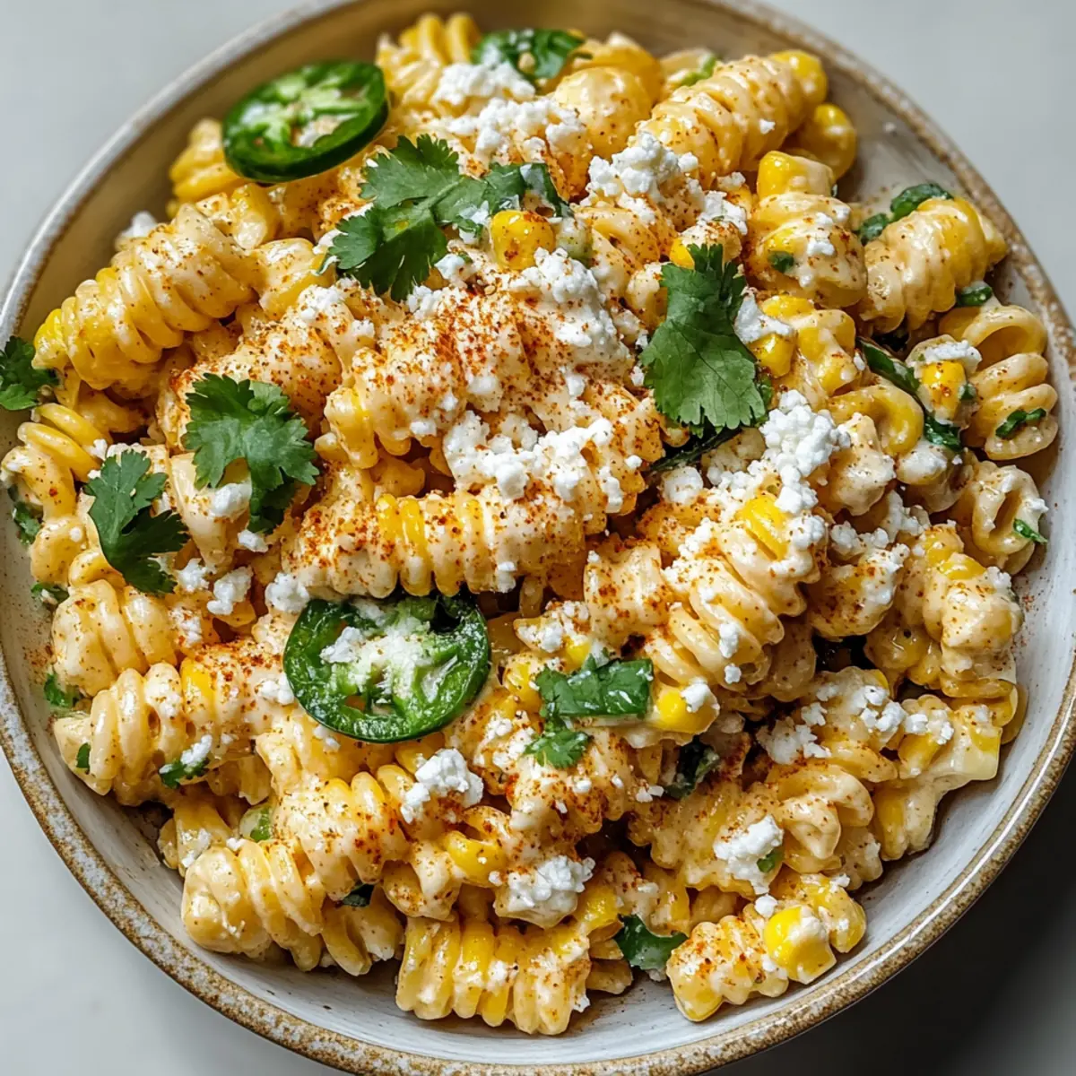 As I took my first bite, a burst of summer sunshine filled my senses, transporting me to vibrant street markets where the aroma of grilled corn mingles with laughter and music. This Creamy Mexican Street Corn Pasta Salad is the perfect companion for warm weather gatherings. Picture smoky charred corn, a rich and creamy dressing, zesty lime, and the delightful crunch of fresh ingredients—all mingling seamlessly with short pasta. Not only is this dish refreshingly satisfying, but it also offers a quick prep time, making it an effortless addition to any potluck or barbecue. Plus, with colorful textures and flavors that’ll impress your guests, you’ll find it’s the ideal dish to relish all summer long. Curious about how to create this deliciously fun twist on traditional elote? Let’s dive into the recipe! Why is this pasta salad a must-try? Flavor Explosion: Each bite of this Mexican Street Corn Pasta Salad delivers a delightful mixture of smoky, creamy, and tangy notes that’s remarkably satisfying. Quick & Easy: With minimal prep time, you’ll have a delicious dish ready for any gathering without spending all day in the kitchen. Versatile Delight: Serve it as a side at a backyard barbecue or as a light lunch on a warm day; it fits seamlessly into any occasion. Colorful Presentation: The vibrant colors of fresh corn and herbs make this salad visually stunning, ensuring it stands out at any potluck. Crowd-Pleaser: Its creamy, rich flavors are a hit with both kids and adults alike, making it a dependable choice for family gatherings. Pair it with grilled meats or complement it with a refreshing Cucumber Caprese Salad for a complete meal! Mexican Street Corn Pasta Salad Ingredients Let’s gather the goodies to create this delightful dish! For the Pasta • Short Pasta (12 oz) – Choose rotini or shells for a sturdy base that holds the creamy dressing. For the Corn • Fresh Corn (4 ears) – Charred corn adds sweetness and a smoky flavor; fresh is best for an authentic taste. For the Dressing • Mayonnaise (0.75 cup) – This creamy base holds everything together; consider reducing for a lighter version. • Sour Cream (0.25 cup) – Provides tanginess; Greek yogurt can be a healthier swap. • Lime Juice (2 tbsp, fresh) – Fresh lime juice balances out the creaminess with a lovely zesty kick. • Chili Powder (1 tsp) – Adds warmth; adjust the amount based on your spice preference. • Smoked Paprika (1 tsp) – Perfectly enhances the charred flavor of the corn with smoky undertones. For the Topping • Cotija Cheese (0.75 cup, crumbled) – Offers a salty, crumbly texture; feta works as a substitute if needed. Now that you have all your ingredients ready, you’re just a few steps away from enjoying this refreshing summer salad bursting with flavor! Step‑by‑Step Instructions for Mexican Street Corn Pasta Salad Step 1: Cook the Pasta Bring a large pot of salted water to a rolling boil. Add 12 ounces of short pasta, like rotini or shells, and cook according to package directions until al dente, usually about 8-10 minutes. Once cooked, drain the pasta and rinse it under cold water to cool it off. Set it aside to reach room temperature while you prepare the other ingredients. Step 2: Char the Corn While the pasta cools, grill or sauté 4 ears of fresh corn over medium-high heat until the kernels are nicely charred, about 10-12 minutes. If grilling, rotate the corn occasionally to ensure even cooking. Once charred, allow the corn to cool slightly, then use a sharp knife to cut the kernels off the cobs and set aside. Step 3: Prepare the Dressing In a medium mixing bowl, combine 0.75 cup of mayonnaise, 0.25 cup of sour cream, 2 tablespoons of fresh lime juice, 1 teaspoon of chili powder, and 1 teaspoon of smoked paprika. Using a whisk, mix the ingredients until smooth and creamy. Taste the dressing and adjust flavors as needed, ensuring it has a perfect balance of tangy and smoky that complements the Mexican Street Corn Pasta Salad. Step 4: Combine Ingredients In a large bowl, add the cooled pasta, charred corn, and prepared dressing. Use a large spatula to gently fold the ingredients together, ensuring every piece of pasta and corn is coated with the creamy dressing. This step is crucial for achieving a well-mixed Mexican Street Corn Pasta Salad that bursts with flavor in every bite. Step 5: Add Cheese Once the ingredients are thoroughly combined, gently fold in 0.75 cup of crumbled cotija cheese. Be careful not to break the pasta or corn while mixing. The cotija will add a delightful salty and crumbly texture to the salad, enhancing the overall flavor profile of this creamy dish. Step 6: Chill & Serve Cover the bowl with plastic wrap and refrigerate the Mexican Street Corn Pasta Salad for at least 30 minutes. This chilling time allows the flavors to meld beautifully, making the salad even more delicious. When ready to serve, garnish with additional cotija cheese or fresh herbs if desired, and enjoy this refreshing summer delight! How to Store and Freeze Mexican Street Corn Pasta Salad Fridge: Store leftover Mexican Street Corn Pasta Salad in an airtight container in the refrigerator for up to 3 days. This ensures the flavors develop and the salad stays fresh. Keep Covered: Always cover the salad to prevent it from absorbing other odors in the fridge and to keep it nice and creamy. No Freezing: Avoid freezing this salad, as the creamy dressing doesn’t thaw well, which could affect the texture and flavor of the dish. Reheating Tips: If you’d like to serve it warm (though it’s best cold), gently reheat by tossing in a pan on low heat for a few minutes, but be mindful to retain the salad’s creamy goodness. Mexican Street Corn Pasta Salad Variations Feel free to personalize your Mexican Street Corn Pasta Salad and make it your own masterpiece! Gluten-Free: Replace short pasta with quinoa or brown rice for a delightful gluten-free twist. Both options add a nutty flavor and s