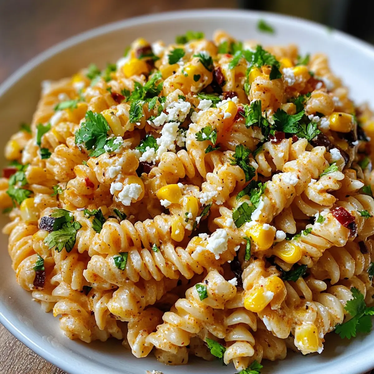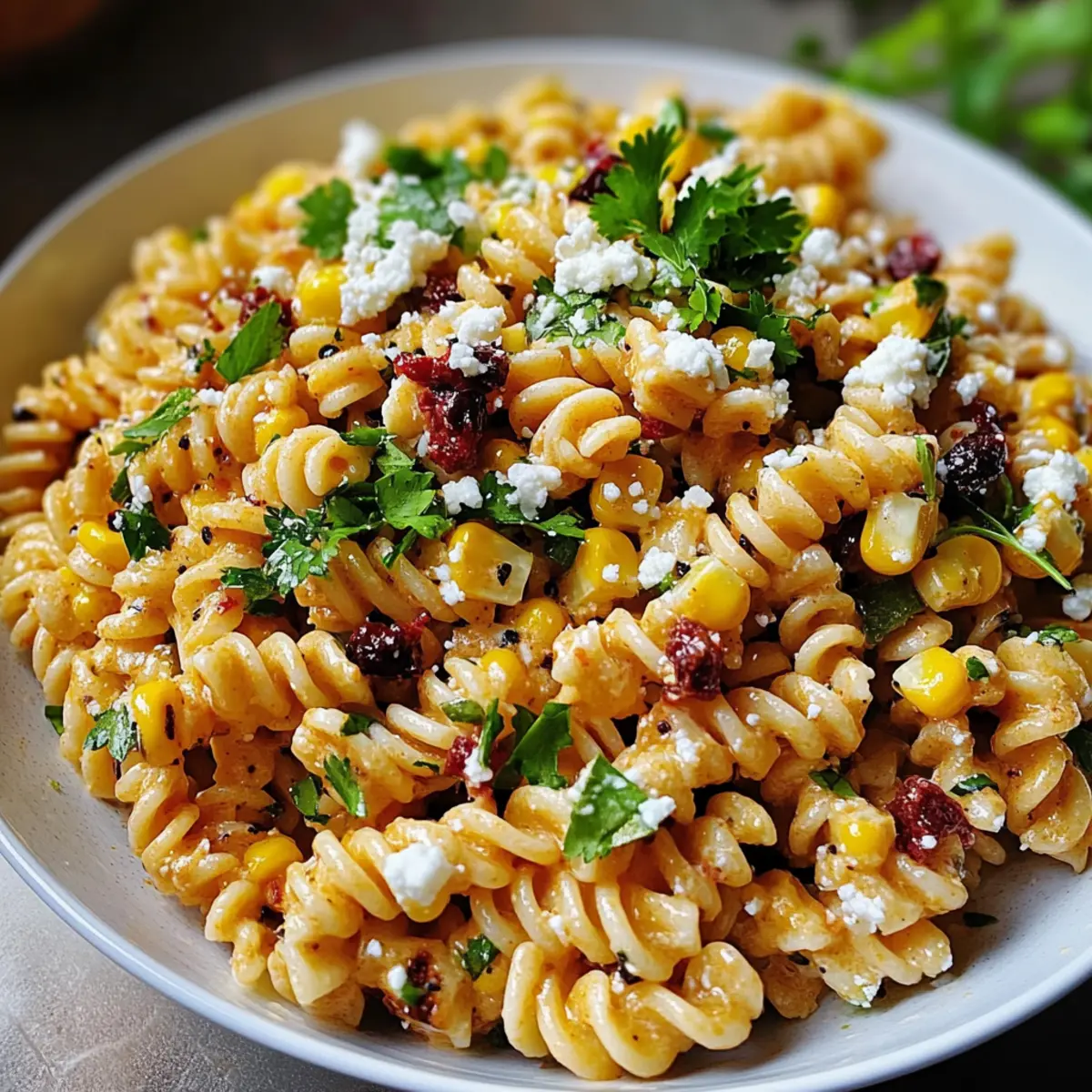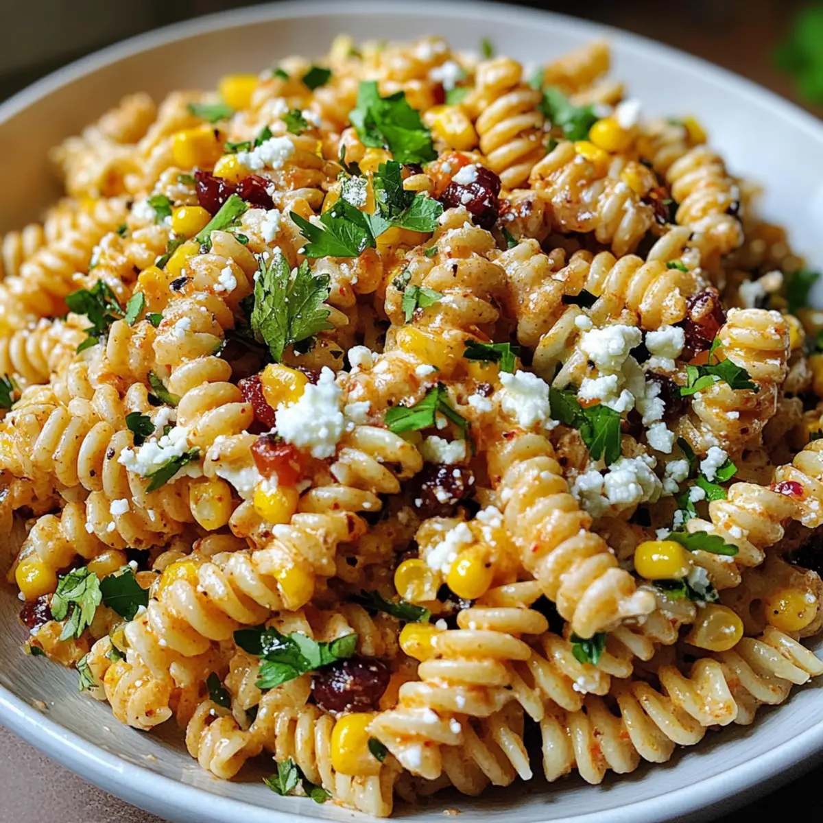 As I stood in my kitchen, the sweet scent of freshly grilled corn wafted through the air, instantly transporting me to sun-soaked summer days. That’s when I knew it was time to whip up my favorite Mexican Street Corn Pasta Salad! This vibrant dish captures all the flavors of classic street corn, combining fire-roasted corn, creamy Cotija cheese, and zesty spices into a delightful salad that’s both refreshing and satisfying. With just 20 minutes of prep, it’s the perfect solution for barbecues, picnics, or a casual meal at home. Plus, you can easily customize it for a gluten-free option, making it accessible for everyone. Are you ready to bring a taste of summer to your table? Let’s dive into this quick and easy recipe! Why is this salad a must-try? Bursting with Flavor: Each bite showcases a delightful mix of sweet and smoky corn, creamy Cotija cheese, and zesty spices that make your taste buds sing. Quick and Easy: Ready in just 20 minutes, it’s perfect for those busy summer days. Adaptable Goodness: Easily customize it with black beans, diced avocado, or spicy jalapeños to cater to your personal taste. Crowd-Pleasing Delight: Perfect for barbecues and picnics, this salad will impress your guests and leave them asking for more! Nutritious Option: Low in calories yet packed with flavor, it’s a guilt-free dish you can enjoy any time. For more summer inspiration, check out my Cucumber Caprese Salad or the hearty Crab Pasta Salad! Mexican Street Corn Pasta Salad Ingredients For the Salad • Pasta – Choose any short pasta like rotini or penne, or use gluten-free pasta for a gluten-free option. • Corn – Fire-roasted corn adds a delicious smoky flavor; canned corn can be used if fresh isn’t available. • Cotija Cheese – This creamy cheese brings a salty bite; if you can’t find Cotija, feta or queso fresco are great substitutes. For the Dressing • Olive Oil – Provides a luscious base for the dressing; avocado oil can also give a unique twist. • Lime Juice – Freshly squeezed lime juice enhances the salad with its zesty acidity, elevating the overall taste. • Spices (cumin, paprika) – They enhance the flavor of the salad; feel free to adjust the amounts or add chili powder for heat. Optional Add-Ins • Diced Avocado – Adds extra creaminess and richness to each bite. • Black Beans – Incorporate for an excellent boost of protein and fiber. • Diced Bell Peppers – They provide lovely color and a satisfying crunch. • Jalapeños or Chili Flakes – For those who like a little kick, toss these in for extra spice! Embrace the wonderful flavors of summer with this Mexican Street Corn Pasta Salad! Step‑by‑Step Instructions for Mexican Street Corn Pasta Salad Step 1: Cook the Pasta Begin by bringing a large pot of salted water to a boil over high heat. Add your choice of short pasta, such as rotini or penne, and cook according to the package instructions until al dente, typically about 8-10 minutes. Once cooked, drain the pasta, rinse it under cold water to halt the cooking process, and then let it chill in a large mixing bowl. Step 2: Prepare the Corn If you’re using fresh corn, fire-roast it on a grill or stovetop for about 10-15 minutes until slightly charred and tender. For a quicker option, simply drain canned corn, ensuring you squeeze out excess moisture. After cooling, cut the kernels off the cob, or if using canned corn, heat them slightly in a pan to enhance their flavor. Step 3: Combine Salad Ingredients In a large bowl, combine the chilled pasta with the prepared corn. Crumble in the creamy Cotija cheese and add any optional ingredients like black beans or diced bell peppers for added texture. Gently toss everything together to distribute the ingredients evenly. Step 4: Whisk the Dressing In a separate bowl, whisk together a mixture of olive oil, freshly squeezed lime juice, and spices like cumin and paprika. Aim for a smooth consistency; the dressing should have a vibrant smell and a slight tangy taste. This zesty dressing will elevate your Mexican Street Corn Pasta Salad beautifully. Step 5: Dress the Salad Pour the dressing over the pasta and corn mixture. Toss everything gently yet thoroughly until the pasta and vegetables are well coated with the dressing. Adjust the seasonings according to your preference; a pinch of salt or more lime juice can enhance the flavors further. Step 6: Chill and Serve You can choose to serve the salad immediately or allow it to chill in the refrigerator for at least 30 minutes. This resting period not only melds the flavors harmoniously but also offers a refreshing experience, especially on warm days. Serve this delightful Mexican Street Corn Pasta Salad chilled or at room temperature for the best taste! Mexican Street Corn Pasta Salad Variations Feel free to get creative and tailor this recipe to your taste buds! Let’s explore some delicious ways to customize your salad. Creamy Avocado: Add diced avocado for an extra layer of creaminess and richness that pairs beautifully with the crunchy corn. It’s like a hug in each bite! Protein-Packed Black Beans: Incorporate black beans for added protein and fiber. They not only boost the nutritional value but also add a hearty texture to the dish. Colorful Bell Peppers: Mix in diced bell peppers for a vibrant splash of color and a satisfying crunch. It adds a touch of sweetness that complements the other flavors perfectly. Spicy Kick: For those who crave heat, toss in some diced jalapeños or a sprinkle of chili flakes. This fiery addition will awaken your taste buds! Zesty Lime & Cilantro: Brighten the salad with an extra squeeze of lime juice and a handful of chopped cilantro. This fresh twist enhances the summer vibe of the dish. Cheese Swap: If Cotija is hard to find, use feta or queso fresco instead. Both options provide a delightful creaminess with their unique flavors. Nutty Surprise: For added crunch, toss in some toasted pumpkin seeds or chopped walnu