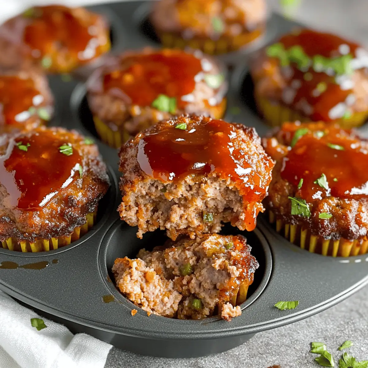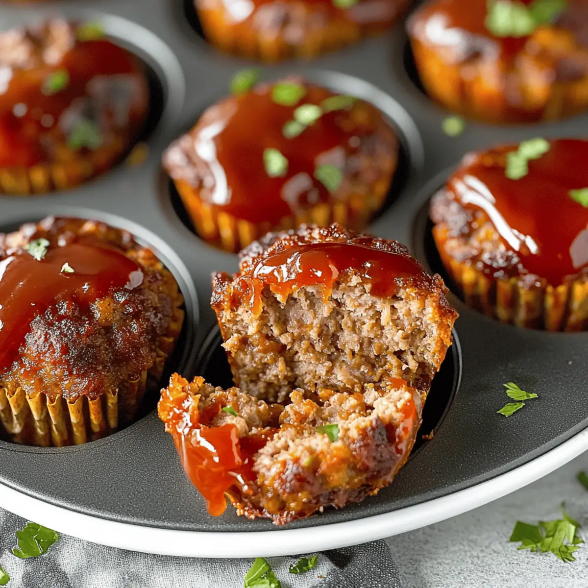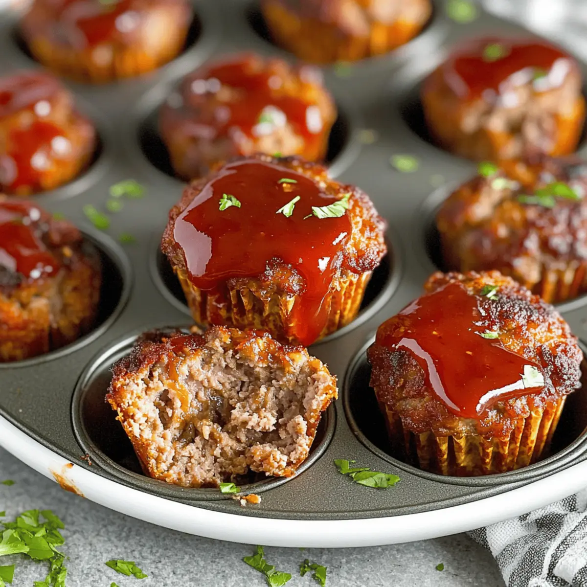 As I stood in my kitchen, the rich aroma of savory spices wafted through the air, transporting me back to family dinners filled with laughter and warmth. Today, I’m excited to share my Quick & Delicious Mini Meatloaf Muffins—an easy, customizable delight that’s perfect for hectic weeknights or cozy gatherings. These little powerhouses not only deliver comfort but are also a fantastic way to cater to various dietary preferences, making meal prep a breeze. With their tender texture and crispy edges, each bite is a joyful reminder that homemade meals can bring everyone together. Ready to create your own delicious version? Let’s dive into this mouthwatering recipe and discover the endless possibilities! Why are Mini Meatloaf Muffins so great? Customization Galore: Each mini meatloaf muffin can be tailored to your taste, whether you prefer spicy, herby, or savory profiles. Quick and Easy: These muffins are not just delicious; they come together in no time, making your weeknight dinners a breeze! Healthy Options: Easy substitutions, like using ground turkey or gluten-free breadcrumbs, ensure everyone can enjoy them without compromising health. Crowd-Pleaser: Perfect for gatherings or family dinners, these bite-sized treats promise to impress—even the picky eaters! Make-Ahead Friendly: Prepare them in advance for simple meal prep. These muffins can be stored or frozen, guaranteeing deliciousness is always just a quick reheat away. Pair them with refreshing sides, like a vibrant salad or homemade mashed potatoes, to create a complete meal. For added excitement, why not experiment with variations and enjoy similar recipes like the Brussels Sprouts Muffins or Mini Tropical Pavlovas? Mini Meatloaf Muffin Ingredients For the Muffin Base Ground Beef – Provides the main protein and structure; ground turkey or chicken can lighten the dish. Breadcrumbs – Adds texture and helps bind the mixture; opt for gluten-free breadcrumbs for a gluten-sensitive option. Eggs – Acts as a binder for the muffins; replace with a flaxseed or chia seed mixture for a vegan alternative. Onions (chopped) – Infuses moisture and flavor; leeks can be used for a milder taste. Ketchup – Adds sweetness and moisture; barbecue sauce makes a delicious alternative. Salt & Pepper – Essential for enhancing flavors; adjust these to suit your palate. Optional Add-Ins Diced Vegetables (e.g., bell peppers, carrots) – Boosts nutrition and flavor; try adding chopped spinach for extra health benefits. These Mini Meatloaf Muffin Ingredients offer a wonderful base for creating a dish that’s not only comforting but also allows for endless customization! Step‑by‑Step Instructions for Mini Meatloaf Muffins Step 1: Preheat the Oven Begin by preheating your oven to 350°F (175°C). This temperature is ideal for baking the mini meatloaf muffins to achieve that perfect balance of crispy edges and tender interior. While the oven warms up, gather your ingredients and a muffin tin, ensuring you are ready for the next steps. Step 2: Mix the Ingredients In a large mixing bowl, combine the ground beef, breadcrumbs, eggs, chopped onions, ketchup, salt, and pepper. If you’re opting for any additional vegetables, now is the time to mix them in! Blend the ingredients together gently, taking care not to over-mix, as this will ensure your mini meatloaf muffins remain tender and juicy. Step 3: Shape the Mixture Next, scoop the meat mixture into a greased muffin tin. Fill each muffin cup about two-thirds full, allowing space for the muffins to rise as they bake. You can use a spoon or your hands—whichever is easier for you. Make sure they’re evenly sized to promote consistent cooking throughout the batch. Step 4: Add Toppings If you’re feeling adventurous, brush the tops of the mini meatloaf muffins with a bit of ketchup or barbecue sauce for extra flavor and moisture. This step adds a nice glaze that enhances the savory profile of your mini meatloaf muffins, giving them an appetizing appearance that’s hard to resist. Step 5: Bake to Perfection Place the muffin tin in your preheated oven and bake for approximately 30 minutes. You’ll know your mini meatloaf muffins are done when they turn a gorgeous golden brown and the juices run clear when tested with a toothpick. An internal temperature of 160°F (70°C) ensures they are perfectly cooked and safe to savor. Step 6: Cool and Serve Once baked, remove the muffin tin from the oven and let the mini meatloaf muffins cool for a few minutes. This resting period allows them to firm up slightly, making it easier to remove them from the tin. After cooling, gently transfer them to a serving platter, ready to delight your family and friends with these delightful homemade bites. Mini Meatloaf Muffins: Customization Ideas Feel free to unleash your culinary creativity with these savory mini meatloaf muffins for a delicious twist! Turkey Substitution: Swap ground beef for ground turkey for a lighter option. This keeps the texture while lowering the fat. Gluten-Free Option: Use gluten-free breadcrumbs to cater to dietary needs without losing that perfect binding quality. They taste just as good! Vegan Alternative: Replace eggs with a mix of flaxseed or chia seeds and water for a tasty vegan version. They’re surprising and enjoyable! Herb Infusion: Add fresh herbs like parsley or thyme to elevate the flavor profile, providing a bright contrast that will awaken your taste buds. Spicy Kick: Incorporate a dash of red pepper flakes or diced jalapeños for a spicy version. This adds a wonderful heat that livens up each bite. Veggie Boost: Toss in finely chopped spinach or grated zucchini for extra nutrients and moisture. Your family won’t even notice, but their bellies will thank you! BBQ Twist: Glaze tops with barbecue sauce before baking for a smoky flavor. This elevates your mini muffins and is always a crowd-pleaser. Cheesy Delight: Add shredded cheese inside the muffin mix or on top before