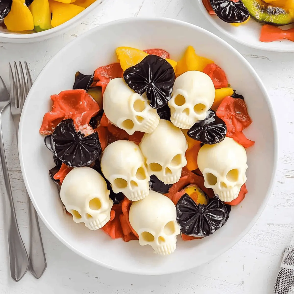 Enjoy spooky mozzarella cheese skulls that are playful and delicious, perfect for Halloween parties.