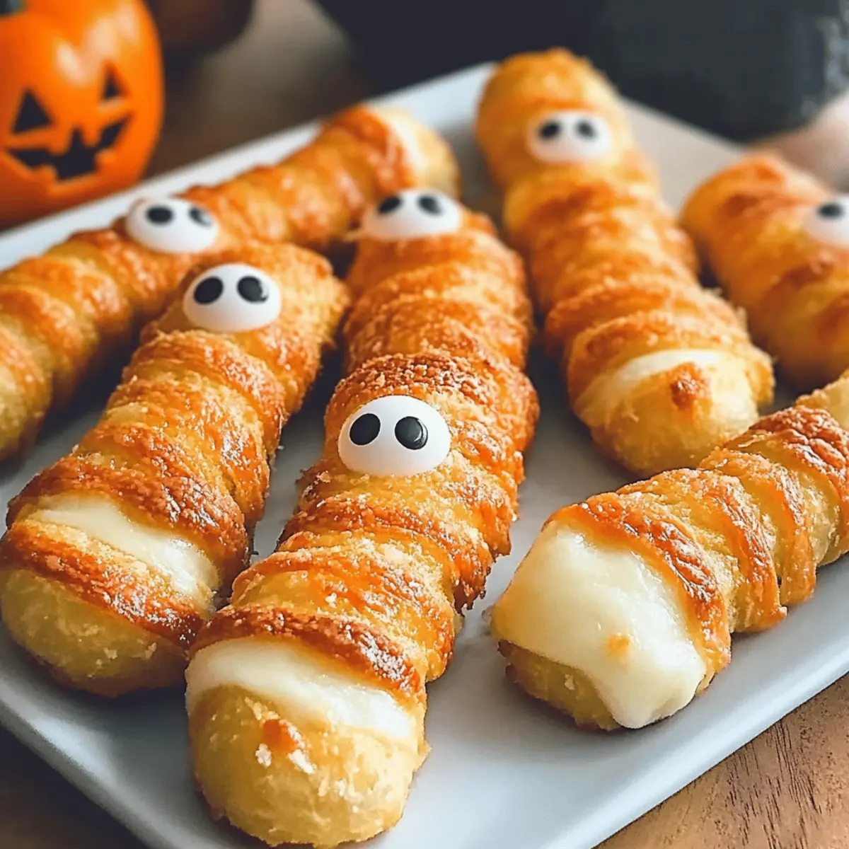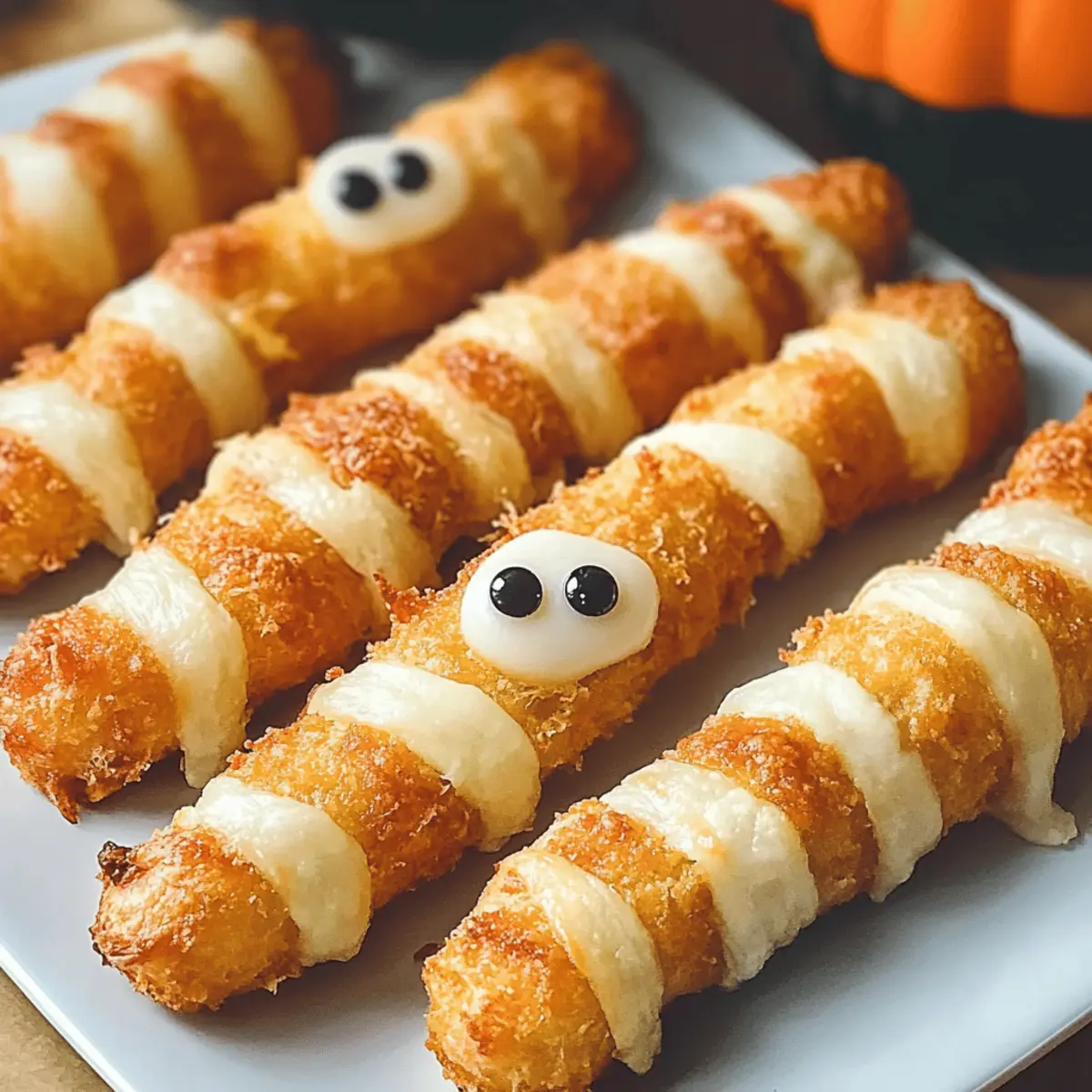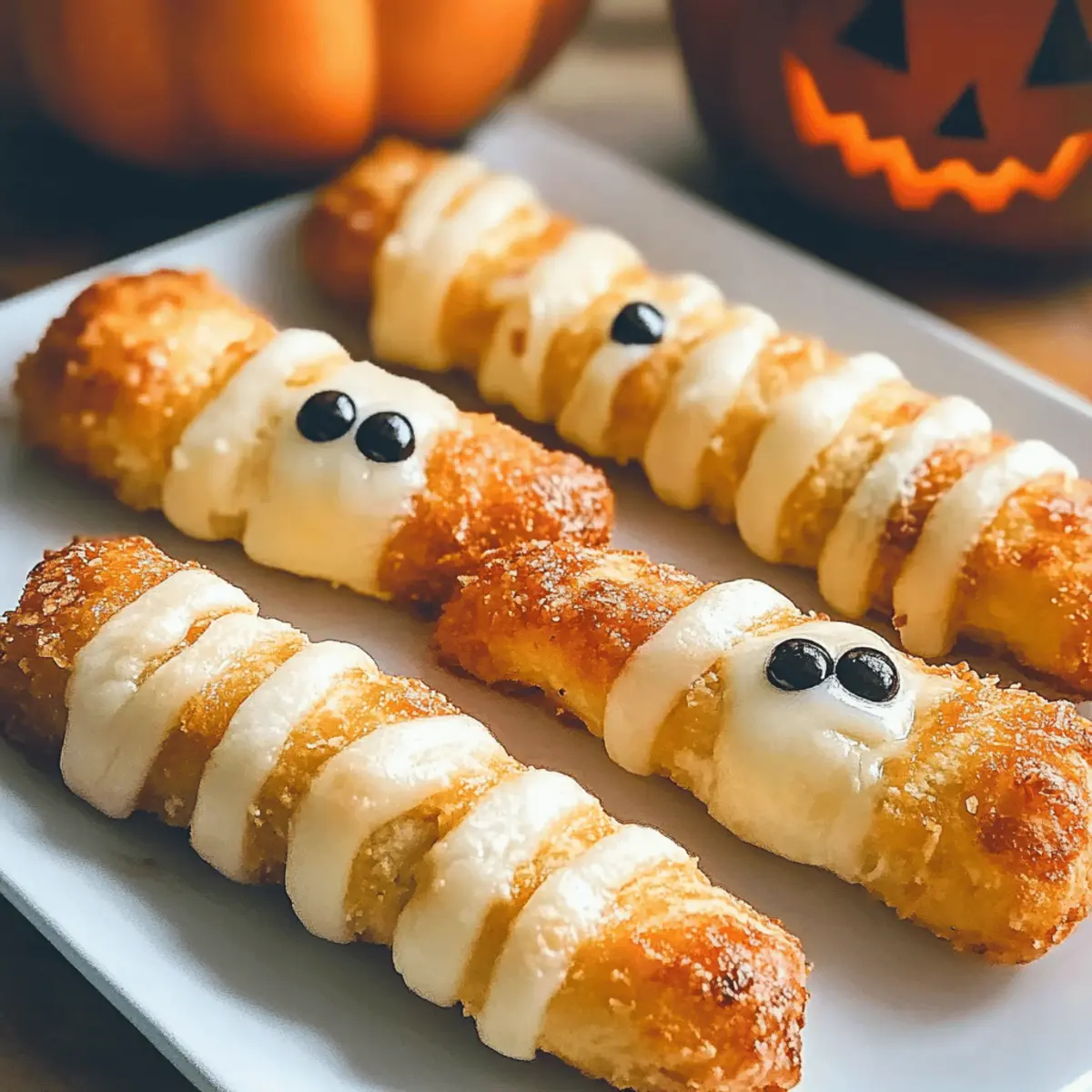 As I was scouring through my favorite Halloween recipes, I stumbled upon the perfect combination of fun and flavor: Mummy Mozzarella Sticks. These delightful treats, with their gooey mozzarella wrapped in flaky crescent dough, are not just a hit with the little ones but also ignite the festive spirit in adults! What I love most about this recipe is how easy it is to whip up—making it a go-to snack for Halloween parties and gatherings. They’re a fantastic crowd-pleaser that brings joy to your table without the fuss of complicated cooking. Plus, with endless possibilities for cheese varieties and dough twists, you can make them as unique as your spooky celebrations. Are you ready to transform an ordinary snack into a playful culinary creation that will make your guests smile? Let’s get started! Why Are Mummy Mozzarella Sticks a Must-Try? Fun and Festive: Mummy Mozzarella Sticks are the ultimate Halloween treat that combines excitement with deliciousness. Your guests will adore their spooky look and tasty goodness, making them a conversation starter at any gathering. Easy to Make: Get ready to whip these up with minimal effort! Just a few simple steps allow you to create an impressive appetizer that’s sure to wow your friends. Versatile Variations: Use different cheese types like pepper jack or cheddar for a flavorful twist. Feeling adventurous? Spice up the dough with some garlic powder or Italian seasoning for an extra kick! Crowd-Pleasing Appeal: Both kids and adults will love these delightful snacks, ensuring your Halloween festivities are a hit. Serve with marinara sauce or ranch for an irresistible dip! Make-Ahead Convenience: Not only do these morsels taste great, but they also keep well! Prepare them in advance, store in the fridge, and simply bake before your guests arrive for a fresh, hot treat. Make your get-together extra special with these tasty Mummy Mozzarella Sticks. They’re as fun to make as they are to eat, and remember, if you’re looking for another easy appetizer option, give my Baked Parmesan Zucchini a try! Mummy Mozzarella Sticks Ingredients Get ready to create these delightful Halloween snacks! For the Sticks • Mozzarella String Cheese Sticks – The star of the show! Ensure they’re well-frozen for that perfect gooeyness. • Refrigerated Crescent Rolls – Provides a flaky wrap; you can substitute with whole-wheat dough for a healthier option. For the Eyes • Candy Eyes – Adds a playful touch to your Mummy Mozzarella Sticks, making them irresistibly spooky! With these simple ingredients, you’re on your way to crafting a delicious and fun treat that embodies the spirit of Halloween! Step‑by‑Step Instructions for Mummy Mozzarella Sticks Step 1: Freeze the Cheese Start by placing the mozzarella string cheese sticks in the freezer for 2 to 4 hours. This crucial step ensures that the cheese is well-frozen, preventing it from melting excessively during baking. As the cheese solidifies, it will maintain its gooey texture, resulting in the perfect Mummy Mozzarella Sticks. Step 2: Preheat the Oven While the cheese is freezing, preheat your oven to 375°F (190°C). This temperature is ideal for achieving golden-brown, flaky crescents. As your oven heats up, prepare a parchment-lined baking sheet where you’ll arrange the wrapped mozzarella sticks once they’re ready. Step 3: Prepare the Dough Unroll one tube of refrigerated crescent roll dough onto a clean surface. Gently press the seams together to form a solid rectangle, which will be easier to cut into strips. Using a pizza cutter or knife, slice the dough into thin strips, ensuring they are long enough to wrap around the cheese sticks. Step 4: Wrap the Cheese Take a frozen mozzarella stick and carefully wrap it completely with the dough strips. Start at one end and spiral the dough around the stick, leaving some gaps to mimic the look of mummy bandages. Be sure to seal the ends tightly to avoid any cheese leakage while baking, ensuring your Mummy Mozzarella Sticks have an adorable appearance. Step 5: Arrange and Brush Place the wrapped mozzarella sticks on your parchment-lined baking sheet, ensuring they are spaced out evenly. In a small bowl, whisk an egg white, then brush it over the dough to give your Mummy Mozzarella Sticks a beautiful golden finish. This step adds a lovely shine and crispness when baked. Step 6: Chill Before Baking Once brushed, chill the wrapped sticks in the refrigerator for about 30 minutes. This will help the dough maintain its shape and prevent it from puffing too much during baking. While they cool, you can prepare your candy eyes for decorating later. Step 7: Bake to Perfection Transfer the baking sheet to your preheated oven and bake for approximately 10 minutes. Keep a close eye on them; they should turn golden brown and flaky. The aroma filling your kitchen will be heavenly, signaling that your Mummy Mozzarella Sticks are almost ready! Step 8: Add the Finishing Touch Once baked, remove the Mummy Mozzarella Sticks from the oven while they’re still warm. Quickly press two candy eyes into the top of each stick to complete their adorable mummy look. Serve them immediately for the best gooey, stretchy experience that will delight your guests! Make Ahead Options These Mummy Mozzarella Sticks are perfect for busy home cooks looking to save time without sacrificing flavor! You can prepare the wrapped cheese sticks up to 24 hours in advance by following the first five steps of the recipe—freeze the mozzarella and wrap it in crescent dough. Once wrapped, chill them in the refrigerator for that hour to set the shape. To maintain their quality, ensure they are stored in an airtight container or tightly wrapped with plastic wrap. When ready to serve, simply bake them as directed, pressing in the candy eyes right before serving to keep them looking fresh and spooky. Enjoy the delightful experience of these delicious treats with minimal effort! Mummy Mozzarella Sticks: Fun V