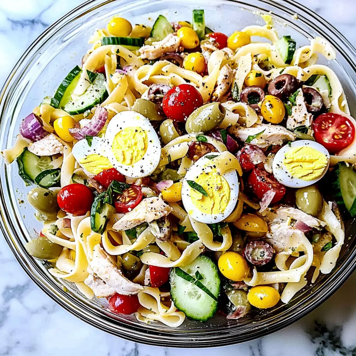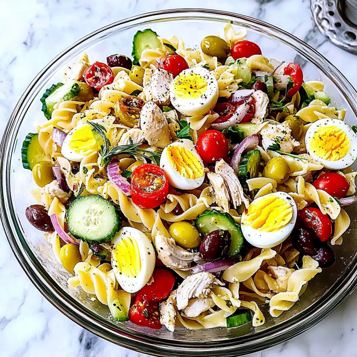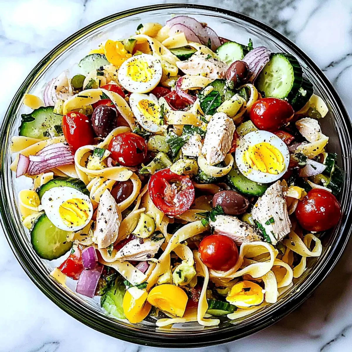 As I tasted the first spoonful of this delightful Nicoise Pasta Salad with Chicken, I felt transported to a sunlit terrace in the South of France, where vibrant colors and fresh flavors reign supreme. This recipe offers a delightful twist on the traditional Nicoise, swapping out tuna for tender shredded chicken, making it a fantastic option for those seeking a protein-packed meal. Perfect for spring and summer, this salad not only showcases a medley of garden-fresh vegetables but also comes together in a flash, allowing you to whip it up for leisurely lunches or breezy picnics. The combination of creamy eggs, crisp greens, and hearty pasta creates a satisfying dish that’s both nutritious and eye-catching. Ready to impress your family and friends with this refreshing salad? Let’s dive into the recipe! Why Choose Nicoise Pasta Salad? Fresh, Flavorful Ingredients: This salad bursts with vibrant, seasonal produce that brightens your plate, making it not only a feast for the taste buds but also for the eyes. Time-Saving Preparation: With minimal cooking involved, you can whip this dish together in just 30 minutes. Perfect for busy days or impromptu gatherings! Protein-Packed Meal: The shredded chicken replaces traditional tuna, providing a satisfying source of protein that keeps you feeling full and energized. Versatility at Its Best: Whether served warm or chilled, this Nicoise Pasta Salad is ideal for any occasion. Pair it with a glass of white wine or serve it alongside a light Cucumber Caprese Salad for a complete meal! Healthy Indulgence: Each serving is balanced, clocking in at approximately 410 calories, making it an ideal choice for those looking for lighter meals without sacrificing flavor. Nicoise Pasta Salad Ingredients For the Pasta • Egg Noodles – The base of the salad, providing structure; consider tagliatelle for a twist. For the Salad • Petite Potatoes – Adds heartiness; baby potatoes can work in a pinch. • Green Beans – Offers a crisp, fresh crunch; blanching them enhances their vibrant color. • Shredded Chicken Breast – A succulent protein source replacing traditional tuna; rotisserie chicken simplifies meal prep. • Cherry Tomatoes – Adding sweet juiciness; halving them ensures easy mixing. • Kalamata Olives – Infuses a briny depth; substitute with green olives if preferred. • English Cucumber – Contributes a refreshing crunch; use pickling cucumber as an alternative. • Red Bell Pepper – Sweetness and color are its attributes; any sweet pepper variety will do. • Red Onion – Provides sharpness; soak it in cold water to mellow the flavor if needed. • Capers – Introduces a tangy note; these can be omitted for a less salty finish. • Hard-boiled Eggs – Richness in garnish form, ensure they’re cooked just right for easy quartering. For the Vinaigrette • Extra Virgin Olive Oil – The heart of the dressing, lending richness to the salad. • Lemon Juice – Freshly squeezed elevates the vinaigrette’s taste remarkably. • Minced Shallot – Adds a gently sweet onion flavor; garlic can be used in its place for a bolder taste. • Dijon Mustard – Provides creamy texture and depth; whole grain mustard can add a pleasant graininess. • Kosher Salt & Black Pepper – Essential seasoning; adjust to taste for a perfectly balanced salad. This Nicoise Pasta Salad will elevate your meal experience with its delightful combination of flavors and fresh ingredients! Step‑by‑Step Instructions for Nicoise Pasta Salad Step 1: Prepare the Vinaigrette In a jar, combine 1/4 cup extra virgin olive oil, 2 tablespoons freshly squeezed lemon juice, 1 minced shallot, 1 tablespoon Dijon mustard, and a pinch of kosher salt and black pepper. Secure the lid and shake the mixture vigorously until well combined and emulsified. Set aside to allow the flavors to meld and work their magic while you prepare the rest of the Nicoise Pasta Salad. Step 2: Cook Potatoes Bring a pot of salted water to a boil over medium-high heat. Add your petite potatoes and let them cook for about 15 minutes, or until they are tender when pierced with a fork. Drain the potatoes and let them cool slightly, then quarter the warm potatoes and drizzle them with a little of the prepared vinaigrette. This will help them absorb delicious flavors as they cool. Step 3: Cook Pasta In the same pot, bring more water to a boil and add the egg noodles. Cook for 7-9 minutes, or until al dente, stirring occasionally to prevent sticking. Once cooked, drain the pasta and rinse it under cool water to stop the cooking process. This will keep your pasta salad from becoming mushy, ensuring perfectly textured noodles in your Nicoise Pasta Salad. Step 4: Blanch Green Beans With the pasta water still hot, add the green beans and blanch them for about 1 minute, until bright green and tender-crisp. Quickly drain and rinse them under cold water to halt the cooking process and preserve their vibrant color and crunch. Your fresh green beans will add a delightful crispness to the Nicoise Pasta Salad. Step 5: Combine Ingredients In a large mixing bowl, combine the cooked and cooled egg noodles, the dressed quartered potatoes, blanched green beans, shredded chicken, halved cherry tomatoes, Kalamata olives, diced cucumber, red bell pepper, soaked red onion, and capers. Gently toss everything together with the remaining vinaigrette, ensuring each ingredient gets a lovely coating of flavor. Step 6: Finish Salad Carefully nestle quartered hard-boiled eggs on top of your colorful Nicoise Pasta Salad for a touch of elegance and richness. Optional: Give it a final sprinkle of salt and pepper to taste. Serve immediately, or allow it to chill for an hour to let the flavors intensify even further. Your refreshing salad is now ready to impress family and friends! Expert Tips for Nicoise Pasta Salad Warm Potatoes: Drizzle vinaigrette over warm potatoes to ensure they soak up delicious flavors, enhancing your Nicoise Past