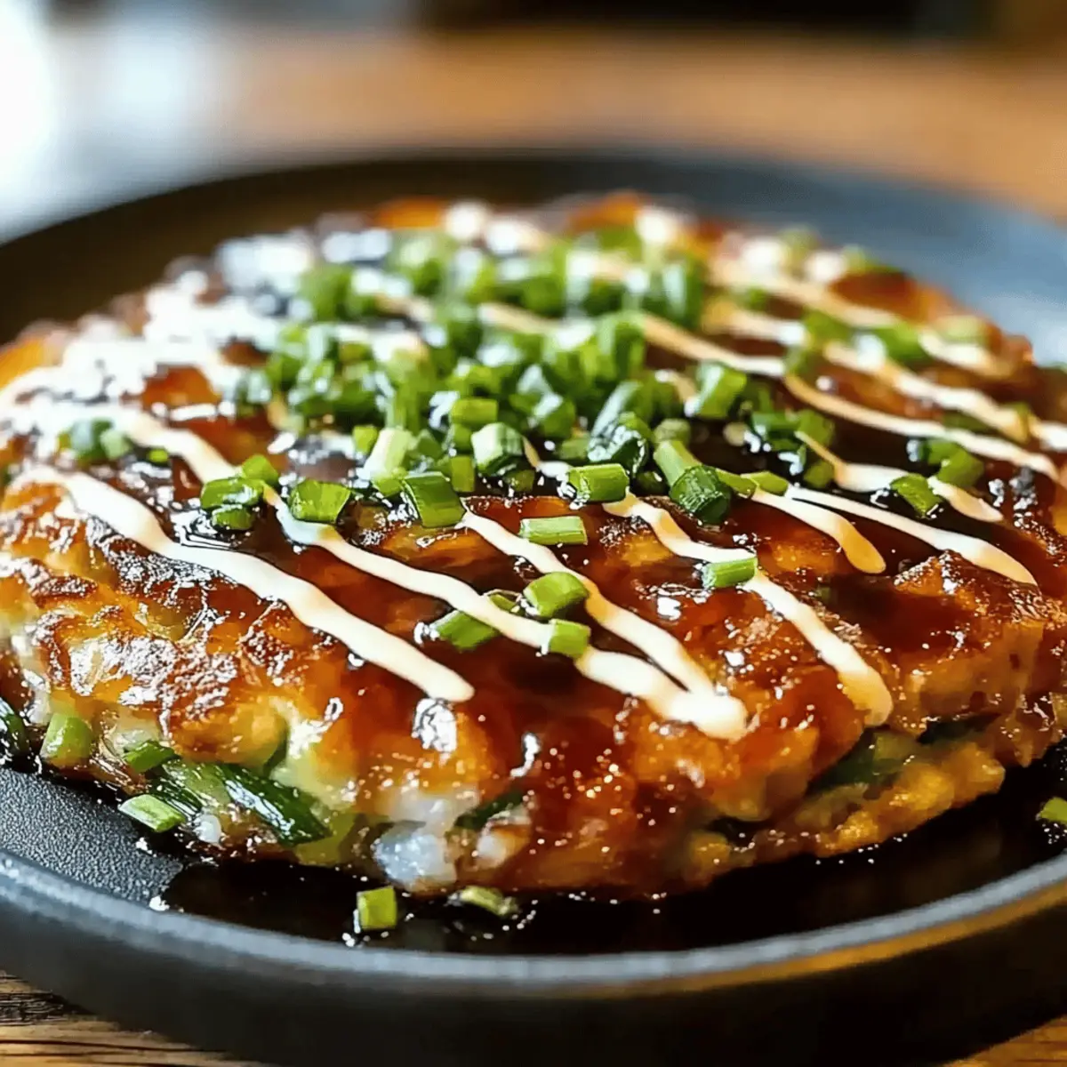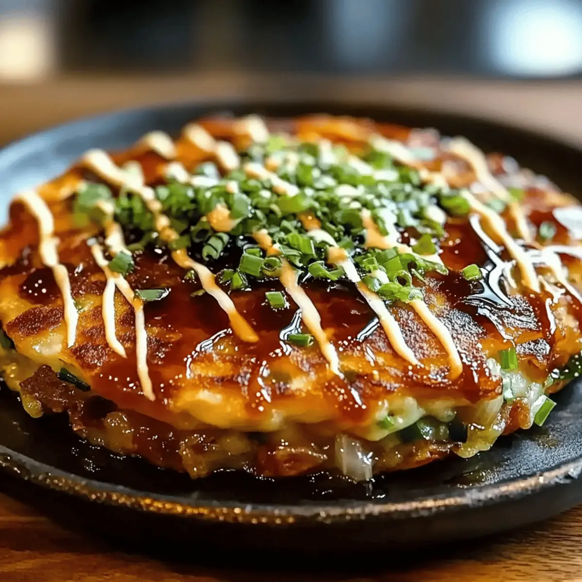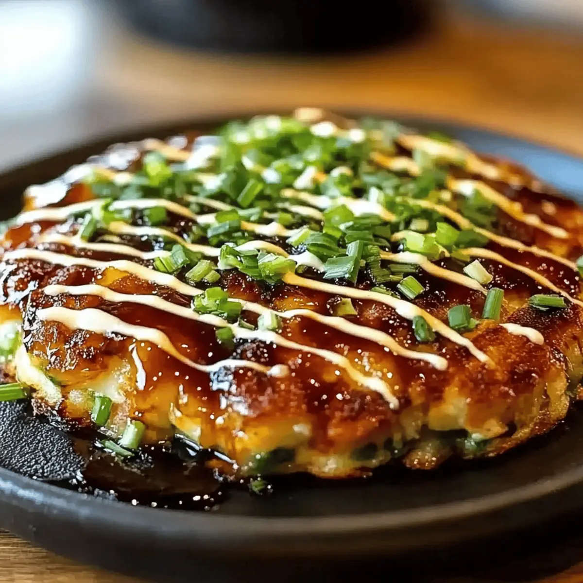 As I flipped the pancake, the enticing aroma wafted through my kitchen, instantly transporting me to the bustling streets of Osaka. Okonomiyaki, often dubbed the “Japanese savory pancake,” is my go-to dish when I crave something unique yet comfortingly familiar. This versatile Okonomiyaki recipe invites you to swap in any ingredients you love—be it succulent shrimp, tender pork, or a vibrant array of vegetables—making it perfect for any dietary preference. Not only is it a quick meal ready in under an hour, but it brings the family together, allowing everyone to get creative during preparation. Whether you’re hosting a casual gathering or enjoying a cozy night in, this recipe delivers satisfaction with every bite. Ready to discover how this mouthwatering dish can become a staple in your home? Let’s dive into the world of Okonomiyaki! Why is Okonomiyaki so Beloved? Customization at its Finest: This Okonomiyaki recipe is all about you! Mix and match your favorite seafood, meat, or vegetables to design a unique flavor profile every time. Quick Preparation: With a cooking time of under an hour, this dish is perfect for busy weeknights or spontaneous gatherings. Crispy Delicacy: The golden-brown crust and tender inside create a delightful contrast that keeps everyone coming back for more. Cultural Experience: Engage your friends and family in a fun, interactive cooking experience, celebrating the spirit of Japanese cuisine. Crowd-Pleasing Appeal: This savory pancake is a hit with everyone, making it excellent for parties or family dinners. Don’t forget to check out more customizable meals like my Baked Ziti or the delightful Mashed Potato Fries for additional inspiration! Okonomiyaki Recipe Ingredients For the Batter • All-purpose Flour – Structure & texture; use gluten-free flour for a gluten-free version. • Eggs – Binding agent that adds richness; can substitute with a flaxseed meal mixture for vegan options. • Dashi (or Water/Vegetable Stock) – Enhances umami flavor; substitute with water for a lighter taste. For the Vegetables • Cabbage – Adds crunch and volume; swap with shredded carrots or zucchini for different textures. • Green Onions – Freshness and flavor; replace with chives if not available. For the Protein • Protein Choices (Pork, Shrimp, etc.) – Adds substance and flavor; customize based on dietary preferences. For the Toppings • Tonkatsu Sauce – Sweet and savory topping; use soy sauce mixed with sugar for a homemade version. • Kewpie Mayo – Creaminess and tang; substitute with regular mayo if needed. • Seaweed Flakes (Aonori) – Aromatic garnish; replace with dried herbs for a different flavor profile. With these Okonomiyaki recipe ingredients in hand, you’re ready to create your perfect savory pancake! Step‑by‑Step Instructions for Ultimate Okonomiyaki: A Savory Japanese Pancake Experience Step 1: Prepare the Batter In a large mixing bowl, combine all-purpose flour, dashi, and eggs. Whisk together until the mixture is smooth and free of lumps, which should take about 2-3 minutes. The batter should be thick yet pourable. This foundational step sets the stage for your delicious Okonomiyaki, ensuring a great texture once cooked. Step 2: Add Vegetables Next, fold in the shredded cabbage and chopped green onions into your batter. Mix gently but thoroughly, allowing the vegetables to be evenly distributed without over-mixing, which may lead to denser pancakes. Look for vibrant colors to shine through your batter, indicating you’re on the right track for a crispy, flavorful Okonomiyaki. Step 3: Heat the Skillet Place a non-stick skillet or griddle over medium heat and let it warm for about 2-3 minutes. To test if it’s ready, sprinkle a few drops of water on the surface; they should sizzle and evaporate almost immediately. This preheating step is vital for achieving that sought-after crispy exterior for your savory pancake. Step 4: Cook the Pancake Pour a generous scoop of the batter onto the skillet, using a spatula to shape it into a thick round pancake. If desired, press your choice of protein, like shrimp or pork, into the top. Let it cook undisturbed for about 3-4 minutes, or until the bottom is golden brown. The edges will start to firm up, giving you a visual cue to prepare for flipping. Step 5: Flip and Finish Cooking Once the underside is beautifully golden, carefully flip the Okonomiyaki with a spatula. Cook the other side for an additional 3-4 minutes until it has the same golden hue and the center is fully cooked through. You can gently press it down with the spatula to ensure even cooking. This step is crucial for that ideal texture combination. Step 6: Serve and Garnish Transfer the perfectly cooked Okonomiyaki to a plate. Drizzle with tonkatsu sauce and Kewpie mayo, creating a delightful contrast of flavors. Finally, sprinkle a generous amount of seaweed flakes (aonori) on top for added aroma. Your ultimate Okonomiyaki is now ready, brightly garnished and inviting for everyone to indulge in its savory goodness! Make Ahead Options These Okonomiyaki are perfect for meal prep enthusiasts! You can prepare the batter and chop your vegetables up to 24 hours in advance by storing them separately in airtight containers. To maintain the crispiness of the cabbage, refrigerate it unblanched. When ready to cook, simply combine the prepared ingredients and proceed with steps 3 through 6. If you prefer, you can also cook the pancakes in bulk and refrigerate them for up to 3 days. To reheat, place on a skillet over medium heat for a few minutes on each side until warmed through and crispy again. This method makes serving these delicious Okonomiyaki a breeze, saving you time on busy weeknights! What to Serve with Ultimate Okonomiyaki? As you savor each bite of your delicious pancake, think about enhancing your meal with complementary dishes that will elevate your dining experience. Creamy Coleslaw: The crisp and refreshing slaw