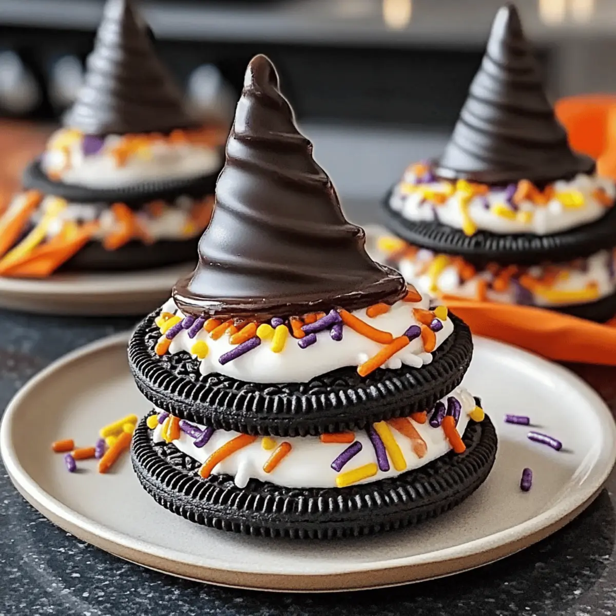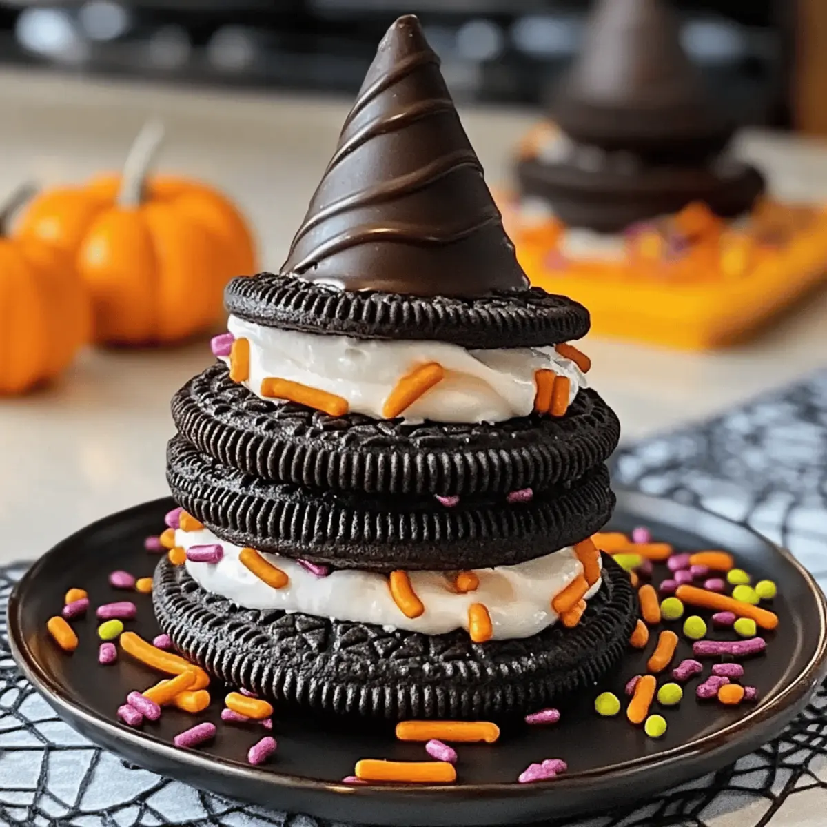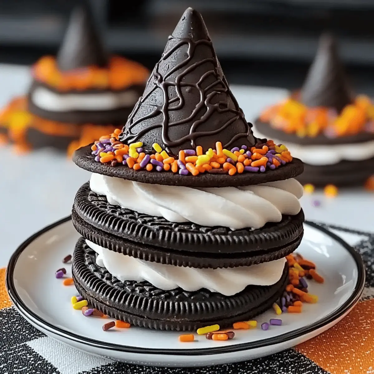 As I sifted through my pantry, I stumbled upon a box of Oreo cookies, and suddenly inspiration struck! With Halloween right around the corner, I decided it was time to whip up some delightful Tasty Oreo Witch Hat Cookies. These whimsical treats not only bring a dash of spooky fun to your dessert table but also come together in no time, making them perfect for busy home chefs like us. With just a handful of ingredients, you can create these playful cookies that are sure to impress everyone from trick-or-treaters to party guests. So, are you ready to join me in crafting these deliciously enchanting treats that will leave both kids and adults smiling? Let’s dive into the magic of baking! Why Are Oreo Witch Hat Cookies a Must? Irresistible Creativity: Harness your inner baker by making these playful treats that are perfect for Halloween! Easy Preparation: With just a handful of ingredients, you’ll whip up these cookies in no time—ideal for busy home chefs. Fun Decorations: The rich chocolate kiss hat paired with colorful sprinkles creates an eye-catching dessert that will wow your guests. Customizable Options: Feel free to experiment with different Oreo flavors or toppings, like those flavored with peanut butter or mint, to add your unique twist. Perfect for Any Occasion: Whether it’s a party, bake sale, or a surprise for trick-or-treaters, these cookies will delight everyone! Get ready for some spooky fun with these Oreo Witch Hat Cookies—they’re sure to bring smiles all around! Oreo Witch Hat Cookies Ingredients • Create your spooky treats with these simple ingredients! For the Cookie Base Oreo cookies – Essential for that crunchy base; swap with your favorite Oreo flavor for a twist. For the Cream Filling Butter (softened) – Adds richness to the filling; margarine can be used for a dairy-free option. Powdered sugar – Sweetens the filling and gives it a frosting-like texture; no real substitutes for the best effect. For the Topping Chocolate kisses – These create the witch’s hat; chocolate-covered marshmallows work in a pinch. White chocolate chips – Melt and drizzle for a sweet contrast; dark chocolate can be substituted for a richer taste. Colorful sprinkles – Perfect for decoration, adding festivity; you can even use candy or nut sprinkles to customize! Get ready to impress with these Oreo Witch Hat Cookies that will surely delight your guests! Step‑by‑Step Instructions for Oreo Witch Hat Cookies Step 1: Preheat and Prepare Start by preheating your oven to 350°F (175°C). While the oven warms, set your workspace with parchment paper or a silicone baking mat for easy cleanup. This is crucial for your Oreo Witch Hat Cookies as it helps achieve that perfectly baked base. Step 2: Separate the Oreos Carefully twist open each Oreo cookie to remove the cream-filled side, setting the empty sides aside. You’ll only need the cream-filled pieces for these delightful cookie creations. Discard the cream-less sides or use them for another sweet treat later. Step 3: Make the Cream Filling In a mixing bowl, combine softened butter with powdered sugar. Using a hand mixer or a spatula, blend until the mixture is light, fluffy, and smooth—about 2 to 3 minutes. This creamy filling will help bind your Oreo sandwich together, making it extra delicious. Step 4: Assemble the Cookie Sandwiches Spread a generous layer of the creamy filling on the cream side of one Oreo. Then, gently press another cream-filled Oreo half on top to form a sandwich. Repeat this process for all your Oreos. You should start seeing your cute Oreo Witch Hat Cookies take shape! Step 5: Melt the Chocolate Kisses Place chocolate kisses in a microwave-safe bowl and heat in short intervals of 20 seconds, stirring in between until completely melted and smooth. This melted chocolate will act as the “hat” for your Oreo sandwiches, giving them a whimsical finish. Step 6: Top Each Cookie Once the chocolate kisses are melted, immediately place one on top of each Oreo sandwich while the chocolate is still warm. The heat will help adhere the hat to the cookie. Arrange them on your prepared baking sheet for a joyful presentation as you craft your Oreo Witch Hat Cookies. Step 7: Drizzle with White Chocolate Next, melt white chocolate chips in the microwave in 20-second increments, stirring until smooth. Using a fork or a piping bag, drizzle the melted white chocolate over each cookie, allowing it to flow and create a festive design. Step 8: Add Colorful Sprinkles While the white chocolate drizzle is still wet, sprinkle colorful decorative sprinkles atop each cookie. This step adds a fun and festive touch that captures the Halloween spirit, making your Oreo Witch Hat Cookies pop with color and excitement! Step 9: Cool and Serve Allow your completed Oreo Witch Hat Cookies to cool on a wire rack for about 15 minutes. This gives the chocolate a chance to set. Once cooled, they are ready to serve, adding a spooky delight to your Halloween festivities. Storage Tips for Oreo Witch Hat Cookies Room Temperature: Store cookies in an airtight container at room temperature for up to 5 days to maintain flavor and freshness. Refrigeration: If you prefer to extend their shelf life, refrigerate the cookies for up to 7 days, but let them return to room temperature before enjoying for optimal taste. Freezing: For longer storage, freeze the assembled Oreo Witch Hat Cookies in a single layer on a baking sheet, then transfer them to a freezer-safe bag for up to 2 months. Thawing: When ready to savor, simply remove them from the freezer and let them thaw at room temperature for about 30 minutes before serving. What to Serve with Tasty Oreo Witch Hat Cookies Embrace the magic of Halloween by pairing these delightful cookies with treats that bring out their whimsical charm. Spooky Milkshakes: A blend of vanilla ice cream, milk, and food coloring will add a festive touch, creating a fun way to enjoy these cookies. Pumpkin Spice Latte: 