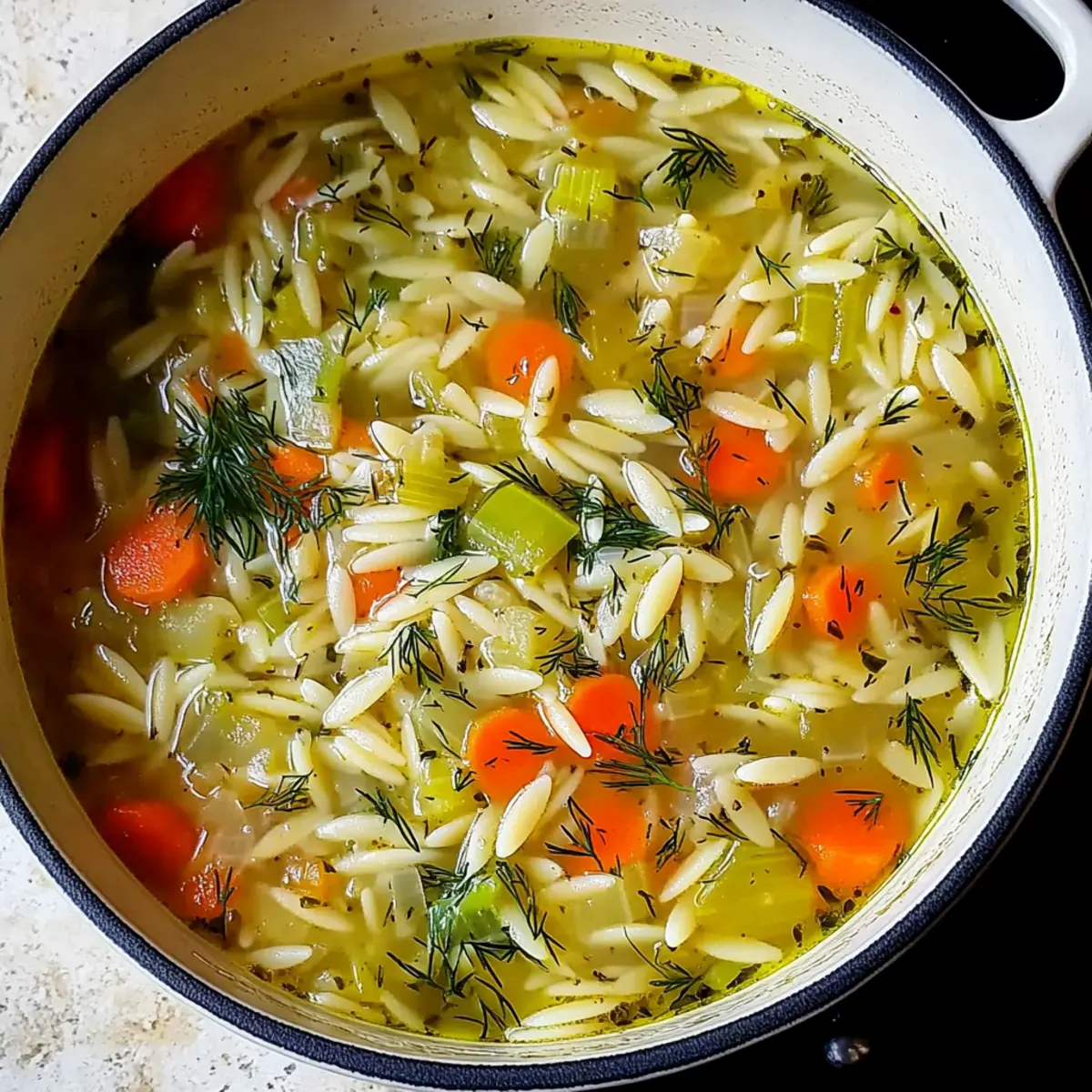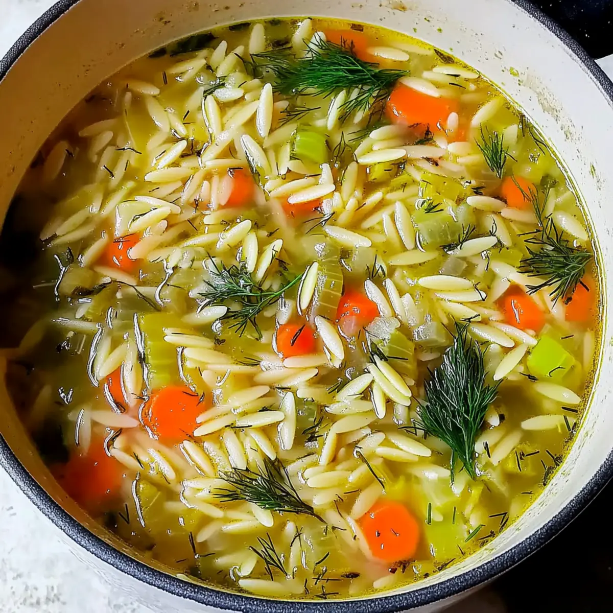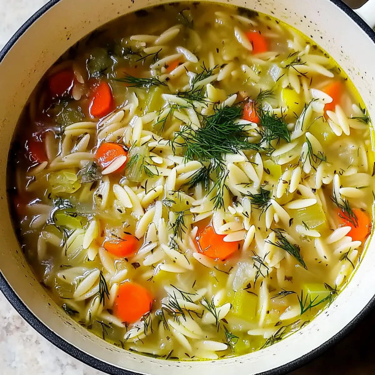 As I stood by the stovetop, the warm aroma of sizzling leeks mingled with the fresh scent of dill, instantly whisking me away to sunlit kitchens and cozy gatherings. This Easy Orzo, Leek, and Dill Soup is all about bringing comfort and warmth to your table without the fuss. Perfect for those busy weeknights, its quick prep time allows you to serve up a delightful, wholesome meal in no time. With the charming texture of orzo and the subtle sweetness of leeks, you’ll find that this dish is not only vegetarian but also a wonderfully satisfying option for everyone, including gluten-free eaters if you choose the right pasta. Ready to create a bowl of warmth that feels like a hug in every bite? Let’s dive into this comforting recipe! Why Is This Soup So Comforting? Quick and Easy: This soup is made in under 30 minutes, perfect for those busy weeknights when you crave something warm and delightful. Wholesome Ingredients: The combination of fresh leeks, aromatic dill, and tender orzo creates a dish that is as nourishing as it is satisfying. Versatile Options: Easily adapt this recipe! You can stir in chickpeas for protein or toss in seasonal veggies like spinach for a nutritional boost. Crowd-Pleaser: Its mild flavors appeal to everyone, making it a fantastic choice for family dinners or casual gatherings. Serve it alongside some crusty bread or a light Greek salad for a complete meal! Orzo, Leek, and Dill Soup Ingredients • Dive into the flavors with these savory essentials! For the Soup Base Olive Oil – adds richness and helps sauté vegetables; any neutral oil can be a fine substitute. Red Onion – provides depth and sweetness; yellow onion is a good alternative for a similar taste. Garlic Cloves – enhances the soup’s savory flavor; fresh cloves are ideal, but powdered garlic works in a pinch. Carrot – brings sweetness and color; parsnips can be used for a unique twist. Leek – imparts a mild onion flavor; remember to clean it thoroughly to remove any dirt. Dried Thyme – offers earthy herbal notes; fresh thyme can be used in double the amount for vibrant taste. For the Soup’s Heart Orzo Pasta – the star ingredient that provides delightful texture; consider rice or corn-based orzo for a gluten-free option. Vegetable Broth – serves as the flavorful base; homemade broth is best, but store-bought is perfectly fine. For Brightness and Flavor Fresh Dill Sprigs – adds a refreshing note that’s crucial for the soup’s character; swap with tarragon if needed. Salt and Pepper – essential seasonings; adjust to suit your taste preferences. Lemon Juice – brightens the dish significantly; freshly squeezed is always recommended for optimal flavor. This delicious Orzo, Leek, and Dill Soup is laden with comforting ingredients that come together harmoniously, bringing a touch of warmth to your day! Step‑by‑Step Instructions for Orzo, Leek and Dill Soup Step 1: Prepare the Vegetables Begin by finely chopping the red onion and garlic cloves, then dice the carrot and leek into small pieces. Make sure to clean the leeks thoroughly, rinsing them under cold water to remove any dirt. Gather a large pot and have your ingredients ready for the next steps, ensuring you have everything within reach. Step 2: Sauté the Base In the large pot, heat a tablespoon of olive oil over medium heat. Once hot, add the chopped onion, garlic, carrot, and leek, sautéing for about 6 minutes. Stir frequently until the vegetables soften and the onions become translucent, releasing their sweet aromas. This step forms the flavorful base of your Orzo, Leek, and Dill Soup. Step 3: Prepare the Broth While the vegetables are cooking, prepare your vegetable broth by dissolving a broth cube in boiling water, resulting in about 6 1/3 cups of broth. Once the broth is ready, set it aside for the next step. By using homemade or high-quality store-bought broth, you’ll ensure maximum flavor for your soup. Step 4: Combine Key Ingredients Once the vegetables are softened, add the orzo pasta and the prepared vegetable broth to the pot. Sprinkle in the dried thyme for an earthy flavor, then carefully stir everything together. Allow the mixture to come to a gentle boil, inviting those enticing scents to fill your kitchen. Step 5: Simmer and Stir Once boiling, reduce the heat to low and let the soup simmer for 12 minutes. Stir occasionally during this time to prevent the orzo from sticking to the bottom of the pot. As it cooks, the orzo will absorb some broth and release its starch, creating a wonderfully comforting texture in your Orzo, Leek, and Dill Soup. Step 6: Season and Finish After simmering, taste your soup and adjust the seasoning with salt and pepper as desired. Stir in the fresh dill sprigs and a splash of lemon juice. The dill will brighten the flavor profile, while the lemon adds a zesty twist that elevates your soup just before serving. Step 7: Serve and Garnish Finally, ladle the delicious Orzo, Leek, and Dill Soup into bowls, making sure each serving gets a generous portion of orzo and veggies. Drizzle a little olive oil on top for added richness, and garnish with extra fresh dill for a beautiful presentation. Serve your soup hot and enjoy the warmth of this comforting dish! What to Serve with Easy Orzo, Leek, and Dill Soup Warm up your dinner table with delightful pairings that elevate this comforting bowl of soup. Crusty Bread: Perfect for dipping, a warm, toasted loaf enhances the soup’s creamy goodness and adds a satisfying crunch. Greek Salad: Fresh cucumbers, tomatoes, and feta add a vibrant, tangy contrast, perfectly balancing the warmth of the soup. Garlic Parmesan Roasted Vegetables: These buttery, herb-infused veggies bring a crispy texture that complements the tender orzo beautifully. Pita Chips with Hummus: Crispy pita chips dipped in creamy hummus offer a crunchy element that’s great for snacking alongside the soup. Chickpea Salad: A protein-packed salad featuring chickpeas and herbs ad