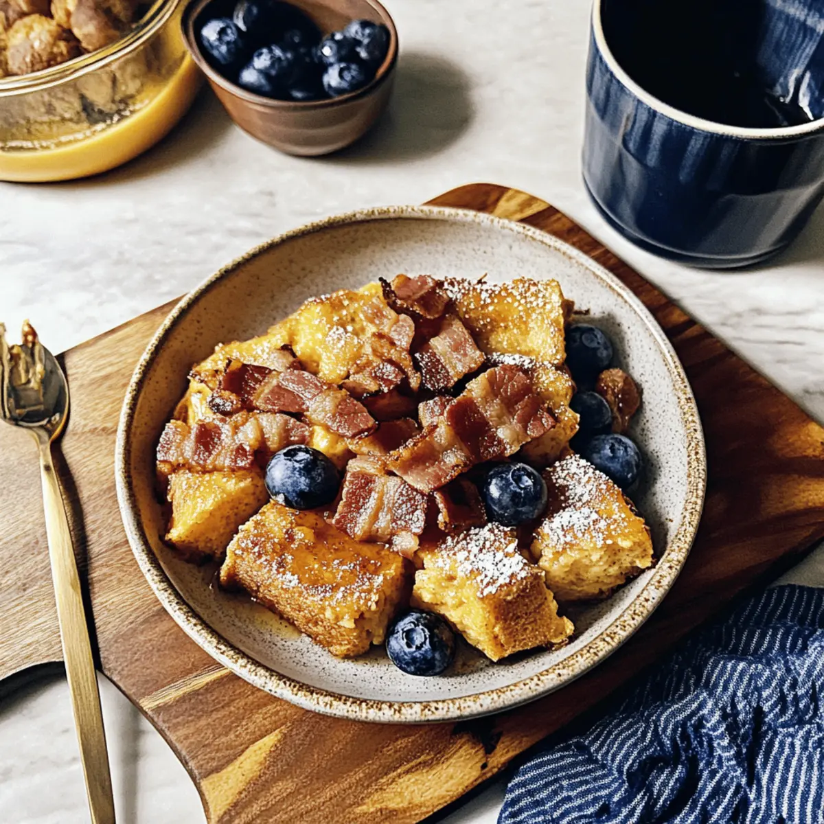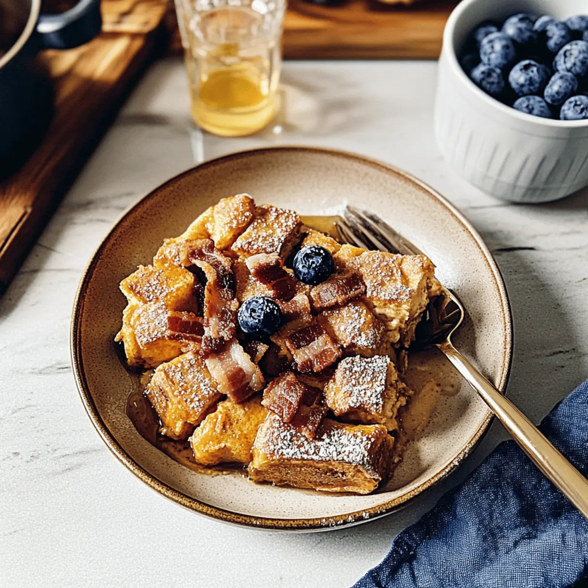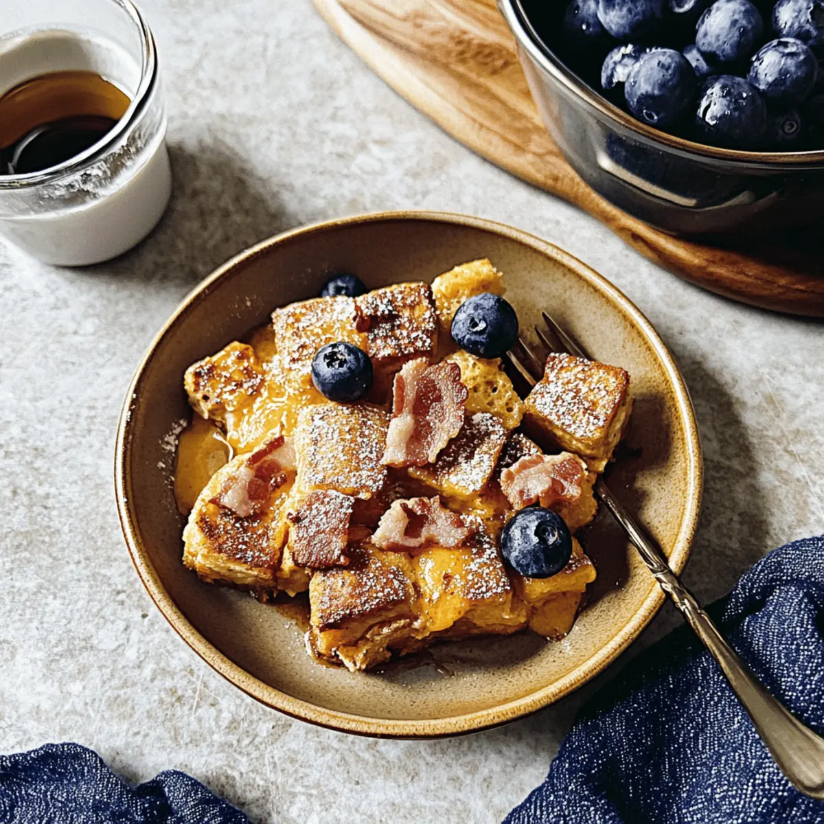 As the sun rises and blankets the kitchen in a gentle glow, the tantalizing aroma of cinnamon wafts through the air, teasing the senses. I often find myself torn: should I whip up my classic pancakes or dive into something new? Enter my Overnight French Toast Casserole with Bacon—a divine creation that effortlessly combines the warmth of breakfast comfort food with the ease of a make-ahead recipe. This crowd-pleaser is not only a delightful way to start the day, but it also allows you to connect with loved ones over an effortless brunch without the last-minute chaos. With minimal prep and ultimate customization options, this dish ensures that everyone can enjoy their favorite flavors. So, what delicious twists will you add to make it your own? What makes Overnight French Toast special? Simplicity: This recipe is an absolute breeze, requiring minimal effort while delivering maximum flavor, perfect even for beginner cooks. Crowd-Pleaser: Easily serves a gathering, making it ideal for brunch with friends or family. Your guests will be impressed! Customizable: Add your favorite ingredients like bacon, sausage, or fresh fruit to cater to everyone’s taste preferences. Check out Mocha Coffee Overnight for another delectable make-ahead option! Texture Bliss: The golden, custardy interior combined with a slightly crisp top creates a delightful contrast with every bite. Make-Ahead Magic: Prepare this dish up to 48 hours in advance, allowing you to enjoy leisurely mornings while savoring an indulgent breakfast! Overnight French Toast Ingredients For the Casserole • Cubed Bread – Forms the base of the casserole; day-old bread absorbs the egg mixture better. • Eggs – Provide structure and richness; use fresh eggs for the best custardy texture. • Milk – Adds creaminess; whole or 2% milk works wonders, or go for non-dairy alternatives. • Table Salt – Enhances flavor; don’t skip this vital ingredient for the best taste. • Granulated Sugar – Sweetens the mix; adjust according to your sweet tooth. • Vanilla Extract – Adds depth; pure vanilla makes a real difference. • Cinnamon – Imparts a warm spice; feel free to adjust based on your taste preferences. • Nutmeg – Provides unique flavor; freshly grated nutmeg has the strongest impact. For Optional Protein • Bacon or Breakfast Sausage – Adds heartiness; perfect for those wanting a savory kick or swap with vegetarian sausage for a meatless option. For Topping • Cinnamon Sugar (optional) – Sprinkle on top before baking for extra sweetness and delightful crunch. This Overnight French Toast casserole is ready for you to personalize, leaving room for your delicious twists and flavors! Step‑by‑Step Instructions for Overnight French Toast Step 1: Prepare Bread Begin by spreading the cubed bread evenly on a large baking sheet. Allow it to dry out at room temperature for about 1 hour, which helps absorb the egg mixture better, preventing sogginess. The bread should feel slightly stale to the touch to ensure it holds its shape during baking. Step 2: Mix Custard In a large mixing bowl, whisk together the eggs, milk, table salt, granulated sugar, vanilla extract, cinnamon, and nutmeg until smooth and fully combined. This custard mixture is the heart of your Overnight French Toast, providing that rich, custardy texture. Aim for a frothy consistency to incorporate air, enhancing the final dish. Step 3: Layer Ingredients Grease a 9″ x 13″ baking pan with non-stick spray or butter. If adding bacon or sausage, layer half of the toasted bread cubes in the pan. Top this layer with the cooked bacon or sausage, followed by the remaining bread cubes, which will soak up the custard nicely. If skipping meat, simply place all bread directly into the pan for a vegetarian delight. Step 4: Combine Pour the prepared egg mixture over the layered bread, ensuring every piece is submerged in the custard. Use a spatula to gently press down any bread that floats above the liquid, giving it a rich and silky base. This step is vital for the classic Overnight French Toast experience; all bread must soak evenly overnight. Step 5: Refrigerate Cover the baking pan tightly with plastic wrap and refrigerate for at least several hours or overnight. Refrigeration allows the flavors to meld beautifully, resulting in a delicious fusion of sweetness and spice. Aim for a full overnight soak if possible, ensuring the bread absorbs maximum flavor. Step 6: Bake The next day, preheat your oven to 350°F (175°C). If desired, sprinkle cinnamon sugar on top of the casserole for a sweet, crunchy finish. Bake for 60 to 70 minutes, until the top is golden brown and a toothpick inserted into the center comes out clean. Watch for a puffed appearance as it bakes, indicating doneness. Step 7: Serve Once baked, let the Overnight French Toast casserole rest for about 5 minutes before slicing into squares. Serve warm, and consider drizzling with maple syrup or adding fresh berries for an extra touch of sweetness and freshness. The cozy aroma is sure to entice everyone at the breakfast table! Expert Tips for Overnight French Toast Dry the Bread: Ensure to fully dry out the bread before soaking; this prevents sogginess and ensures a perfect custardy texture in your Overnight French Toast. Refrigerate Overnight: Always let the mixture soak for at least several hours or up to overnight; this allows flavors to meld beautifully, resulting in a richer taste. Bake to Perfection: Keep an eye on the casserole as it bakes; a golden brown top indicates it’s ready. Underbaking might result in a raw egg texture, which we want to avoid. Top it Off: Consider dusting with cinnamon sugar just before baking for a delightful crunch and added sweetness; it elevates the dish beautifully! Layer Thoughtfully: If using meat, layer the bread and ingredients strategically. This ensures that the flavors are evenly distributed, making the Overnight French Toast extra delicious! Make Ahead Optio