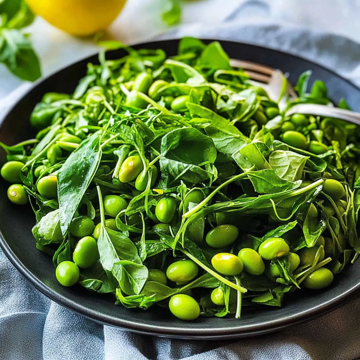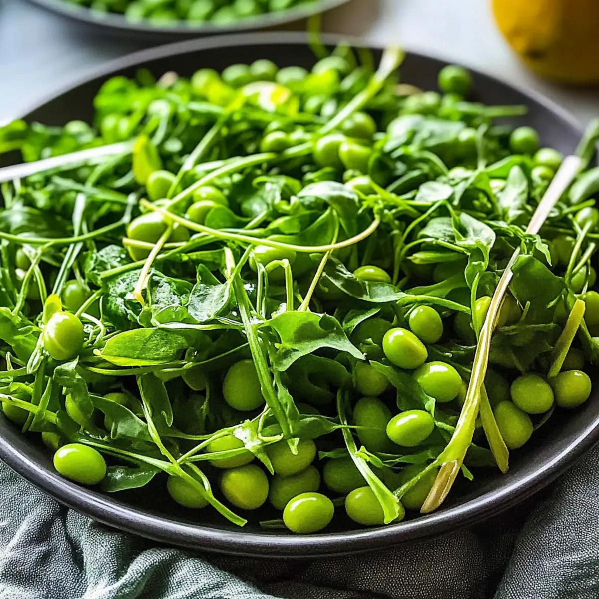 As I tossed the vibrant greens in my bowl, an unexpected delight filled the air—there’s something magical about the fresh crunch of pea shoots. This Pea Shoot Salad recipe is my go-to for a quick, nutritious meal that effortlessly blends sweet flavors and bright colors. Ready in just 5 minutes, it’s not only a breeze to prepare but also a fantastic way to enjoy the simplicity of vegetarian cooking. Whether you’re looking to upgrade your lunch game or serve a light dinner side, this salad is versatile enough to shine alongside any main dish. Plus, if you’re lucky enough to grow your own pea shoots, you’ll find the satisfaction in knowing you’re indulging in something fresh from your garden. Ready to discover why I can’t get enough of this salad? Why is Pea Shoot Salad So Special? Vibrant Colors: This salad bursts with the fresh green of pea shoots and bright mint, making it a feast for the eyes. Quick Preparation: With just 5 minutes needed, you can whip up a satisfying dish without any fuss. Nutrient-Packed: Each serving features vital vitamins A and C, making this a health-conscious choice without sacrificing flavor. Versatile Pairing: Perfect as a main dish or a side, it complements grilled chicken or fish beautifully. You might also enjoy it alongside healthy options like the Chickpea Feta Avocado salad for a delightful lunch combo. Crowd-Pleasing Appeal: This Pea Shoot Salad is sure to impress guests, making it an ideal dish for gatherings or simple family dinners. Its enticing taste makes it a standout! With its bright zing from lemon and light textures, it’s a refreshing alternative to heavy meals, perfect for anyone looking to enjoy homemade goodness. Pea Shoot Salad Recipe Ingredients For the Salad • Pea Shoots – Tender young leaves that bring a sweet, mild flavor, absolutely essential for the pea shoot salad recipe. • Edamame Beans – Adds a delightful protein boost and nutty taste; you can switch to chickpeas for a different flavor profile. • Fresh Mint – Introduces a burst of refreshing aroma; basil or cilantro also work beautifully if you prefer. For the Dressing • Dijon Mustard – Provides a tangy kick to the dressing; any mustard will work, but milder options will change the taste slightly. • Lemon Juice – Brightens the salad and adds acidity; lime juice serves as a great alternative too. • Extra Virgin Olive Oil – Delivers richness and depth; feel free to use avocado oil for a subtler flavor. • Salt & Pepper – Key for enhancing flavors; adjust to your personal taste. Step‑by‑Step Instructions for Pea Shoot Salad Recipe Step 1: Prepare Pea Shoots Start by washing the fresh pea shoots under cold running water to remove any dirt or impurities. Gently shake off excess water or use a salad spinner for thorough drying. This ensures the pea shoots stay crisp and prevent wilting when mixed with the dressing. Visually, they should look bright green and vibrant, perfect for your salad. Step 2: Combine Ingredients In a large mixing bowl, carefully add the dried pea shoots along with the edamame beans. Stir gently to combine them, ensuring that the pea shoots maintain their delicate structure. The green colors should be bright and inviting, making the salad appear fresh and appetizing. This mixture forms the base of your delightful Pea Shoot Salad. Step 3: Make Dressing Grab a small jar with a tight-fitting lid, and combine the extra virgin olive oil, Dijon mustard, lemon juice, salt, and pepper. Close the jar and shake vigorously for about 10 seconds until the dressing is well emulsified and smooth. The mixture should appear creamy and slightly thick, which will cling beautifully to the salad. Step 4: Mix Salad Pour the freshly made dressing over the pea shoot and edamame mixture in the bowl. Using salad tongs or two forks, toss everything gently but thoroughly, ensuring all ingredients get evenly coated with the dressing. The vivid greens should glisten with the tangy dressing, creating a beautiful visual and enhancing the flavor of your Pea Shoot Salad. Step 5: Serve For the final touch, consider garnishing your Pea Shoot Salad with a sprinkle of lemon zest to add an extra zing. Serve the salad immediately to enjoy its peak freshness and crispness. The vibrant colors and enticing aroma will surely win over anyone at your table, making this dish a delightful addition to any meal. Expert Tips for Pea Shoot Salad • Freshness Counts: Always use the freshest pea shoots possible for the best flavor. Wilted greens can dull the taste of your Pea Shoot Salad. • Dry Thoroughly: Ensure pea shoots are completely dry before adding them to the salad to prevent wilting and make for a crispier texture. • Dress Just Before Serving: To keep the salad vibrant and fresh, dress it immediately before serving. This will prevent sogginess and enhance each bite. • Customize Flavors: Feel free to experiment with different herbs, like basil or cilantro, in your Pea Shoot Salad to suit your personal taste preferences. • Make Ahead: Pre-chop your ingredients like mint and make the dressing in advance. Just combine everything fresh at mealtime for a quicker prep! Make Ahead Options These Pea Shoot Salad recipes are truly a friend to busy home cooks looking to simplify their meal prep! You can wash and dry the pea shoots up to 24 hours ahead—just store them in an airtight container in the fridge to maintain their crispness and prevent wilting. Additionally, the dressing can be prepared and refrigerated for up to 4 days; just give it a good shake before using to re-emulsify. When you’re ready to serve, combine the pea shoots with the edamame and toss with the dressing for a fresh and vibrant salad that tastes just as delightful as when made fresh! Enjoy the convenience without sacrificing quality! Pea Shoot Salad Recipe Variations Feel free to put your own spin on this delightful pea shoot salad and make it your own! Chickpea Swap: Replace edamame with