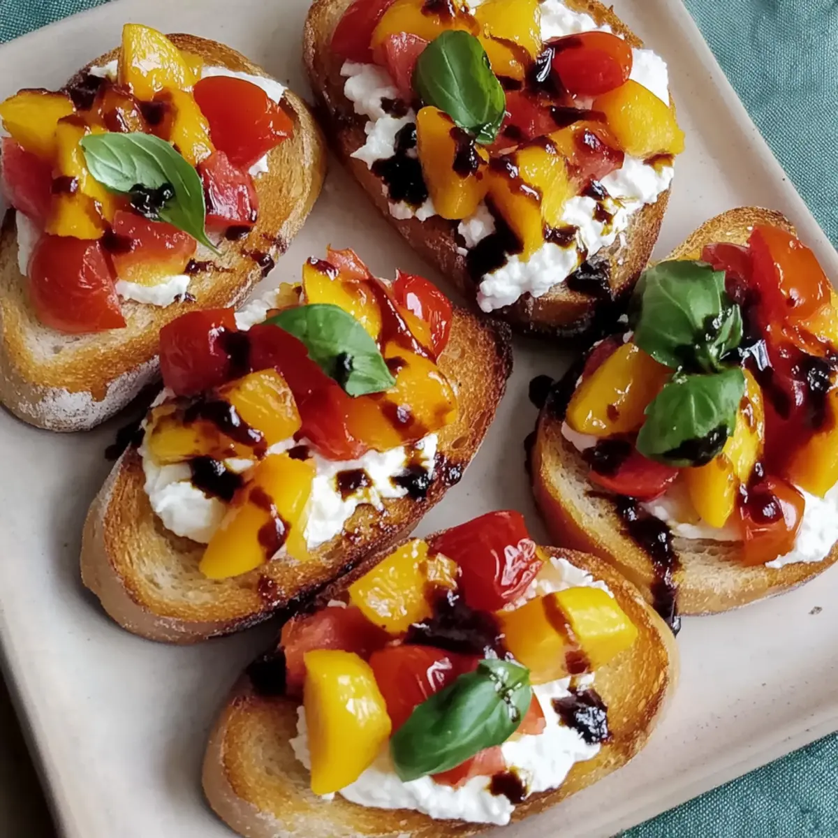 The aroma of summer is in the air, and there’s nothing quite like the thrill of creating a colorful appetizer that captures the season’s essence. My Quick Peach Bruschetta with Whipped Ricotta is a beautiful way to celebrate the fresh, juicy peaches that abound this time of year. With just 30 minutes of prep time, this dish is both effortless and perfect for your warm-weather gatherings. What I love most about this recipe is how customizable it is; you can easily add your favorite herbs or switch up the cheese to suit your palate. Whether you’re hosting a garden party or simply enjoying a cozy evening at home, this delectable bruschetta brings sunshine to your table and will have everyone asking for seconds. Ready to discover the perfect balance of sweet and savory? Let’s dive into this delightful summer treat!