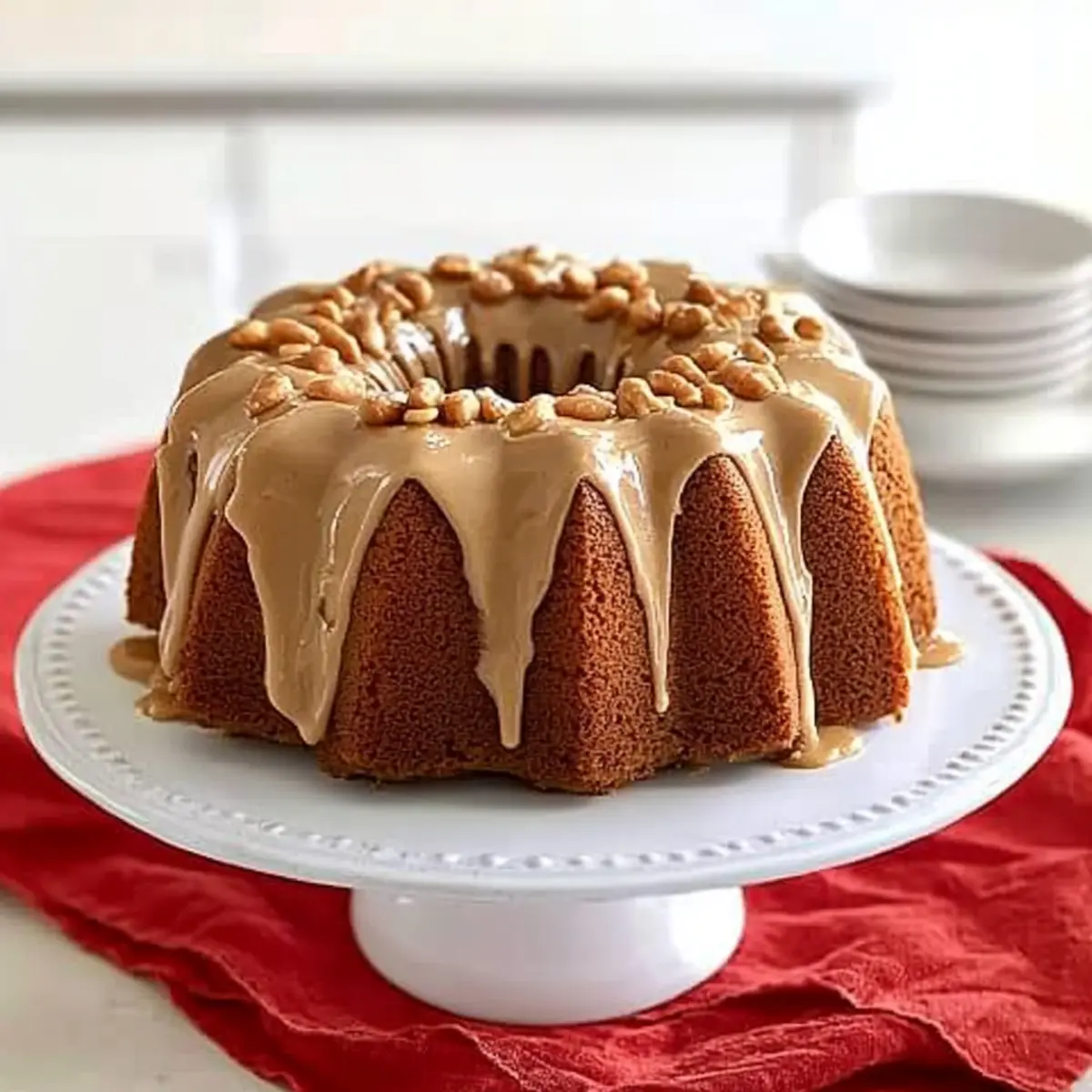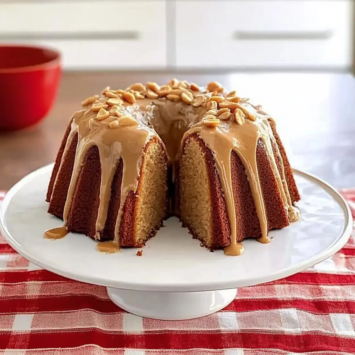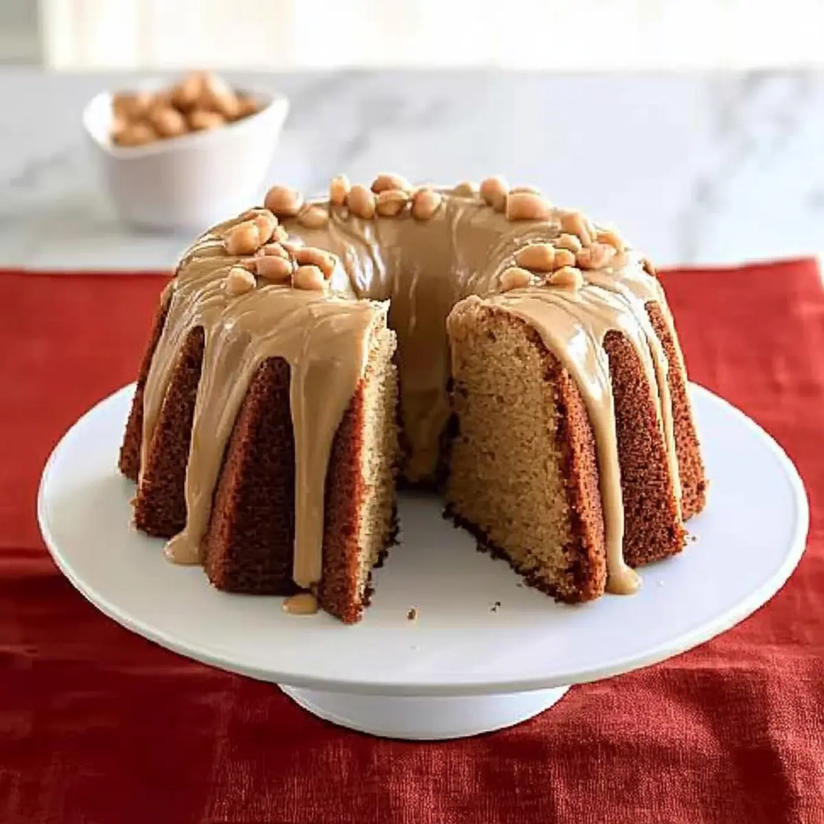 As I wandered through my kitchen the other day, a familiar scent whisked me back to my grandmother’s cozy home, where the rich aroma of baking filled the air. That moment sparked my craving for a slice of her beloved Peanut Butter Cake—an absolute crowd-pleaser that never fails to bring joy. This moist Peanut Butter Bundt Cake with Peanut Butter Glaze is everything you want in a dessert: it’s quick to prepare for those busy weeknights and makes the perfect centerpiece for gatherings, too. With a light and fluffy texture, this cake wraps you in comfort, while the creamy glaze and crunchy peanuts elevate each bite to new heights. Curious to see how you can create this delightful treat? Let’s dive into the recipe! Why is Peanut Butter Cake a Must-Try? Irresistible Flavor: This Peanut Butter Cake combines the rich taste of creamy peanut butter with buttery goodness, creating a melt-in-your-mouth experience that will leave everyone wanting more. Easy to Make: With simple ingredients and straightforward steps, you’ll have this delightful cake baked and ready in no time, making it perfect for busy weeknights or last-minute gatherings. Versatile Serving Options: Dress it up with a scoop of vanilla ice cream or a dollop of whipped cream for an elevated dessert experience. Moist and Fluffy: The cake’s texture is incredibly moist and reminiscent of a soft pound cake, making it a comforting treat for all ages. Perfect for Any Occasion: Whether you’re hosting a party or simply indulging on your own, this cake serves as a pleasing centerpiece that brings joy to any table. Don’t forget to check out my recipe for Chewy Brown Butter Chocolate Chip Cookies for another dessert that delights! Peanut Butter Cake Ingredients • Curious to create a heavenly dessert? Here’s what you need! For the Cake Unsalted Butter – Provides richness and flavor; if using salted butter, simply reduce any extra salt. All-Purpose Flour – Offers structure to the cake; you can use gluten-free flour for a gluten-free alternative. Creamy Peanut Butter – Adds signature peanut flavor and moisture; try almond butter if you’re looking for a nut-free option. Eggs – Provides stability and structure; for a vegan version, replace with flax eggs (1 tbsp flax meal + 2.5 tbsp water per egg). Buttermilk – Adds tanginess and moisture; substitute with regular milk mixed with a tablespoon of vinegar or lemon juice if needed. Granulated Sugar – Sweetens the cake; consider coconut sugar for a lower glycemic index. Water – Keeps the batter moist; you can omit this if using extra buttermilk. Baking Powder – Provides leavening for the cake; make sure it’s fresh for best results. Pure Vanilla Extract – Enhances the flavor; feel free to skip if you’re using flavored peanut butter. For the Glaze Confectioners’ Sugar – Essential for the glaze; no substitutes recommended for achieving the right texture. Dry-Roasted Peanuts – Adds crunch and decoration; any nut can be a great topping for this peanut butter cake. Let the baking begin! Your delicious Peanut Butter Cake is just around the corner. Step‑by‑Step Instructions for Peanut Butter Cake Step 1: Preheat and Prepare the Pan Start by preheating your oven to 350°F (175°C). While it’s warming up, take a 12-cup bundt or a 10-inch tube pan and generously butter and flour it. This will ensure your Peanut Butter Cake releases easily later. Make sure the flour is evenly distributed, tapping out any excess. Step 2: Cream the Butter and Peanut Butter In a large mixing bowl, combine unsalted butter and 1/2 cup of creamy peanut butter. Use an electric mixer to beat them together on medium speed until the mixture is smooth and well blended, about 2-3 minutes. This will create a rich base for your cake, full of that signature peanut flavor. Step 3: Add Eggs and Buttermilk Next, add in the eggs, one at a time, and 1/2 cup of buttermilk to the peanut butter mixture. Mix on low speed until just combined, being careful not to overbeat. This step is crucial for a light texture, ensuring that your Peanut Butter Cake stays fluffy and moist. Step 4: Combine Dry Ingredients With the mixer turned off, add the all-purpose flour, granulated sugar, water, baking powder, and pure vanilla extract to the bowl. Stir gently with a spatula to combine the dry ingredients, then turn on the mixer to low speed. Gradually increase to medium and mix for about 2 minutes until the batter is smooth and creamy. Step 5: Bake the Cake Pour the batter into your prepared bundt pan, smoothing the top with a spatula. Place it in the preheated oven and bake for 45 minutes at 350°F. After this time, reduce the oven temperature to 325°F and continue to bake for an additional 10-15 minutes, or until a skewer inserted into the center comes out clean. This ensures your Peanut Butter Cake is perfectly done. Step 6: Cool the Cake Once baked, remove the cake from the oven and allow it to cool in the pan for about 10 minutes. This will make the cake easier to release. Afterward, carefully invert the pan onto a wire rack to let the cake cool completely. Cooling completely is essential for a great glaze application. Step 7: Prepare the Glaze In a small mixing bowl, whisk together the remaining peanut butter, confectioners’ sugar, and the leftover buttermilk until smooth. The consistency should be creamy and pourable, perfect for drizzling. This glaze elevates the flavor of your Peanut Butter Cake and adds a delightful sweetness. Step 8: Glaze the Cake Once the Peanut Butter Cake is fully cooled, generously spoon the glaze over the top, allowing it to drizzle down the sides. The combination of the moist cake and creamy glaze is a match made in heaven. Finish with a sprinkle of dry-roasted peanuts for that extra crunch and visual appeal. Expert Tips for Peanut Butter Cake Room Temperature Butter: Ensure your butter is softened to room temperature for easy mixing and a smoother batter. Cold butter can lead 
