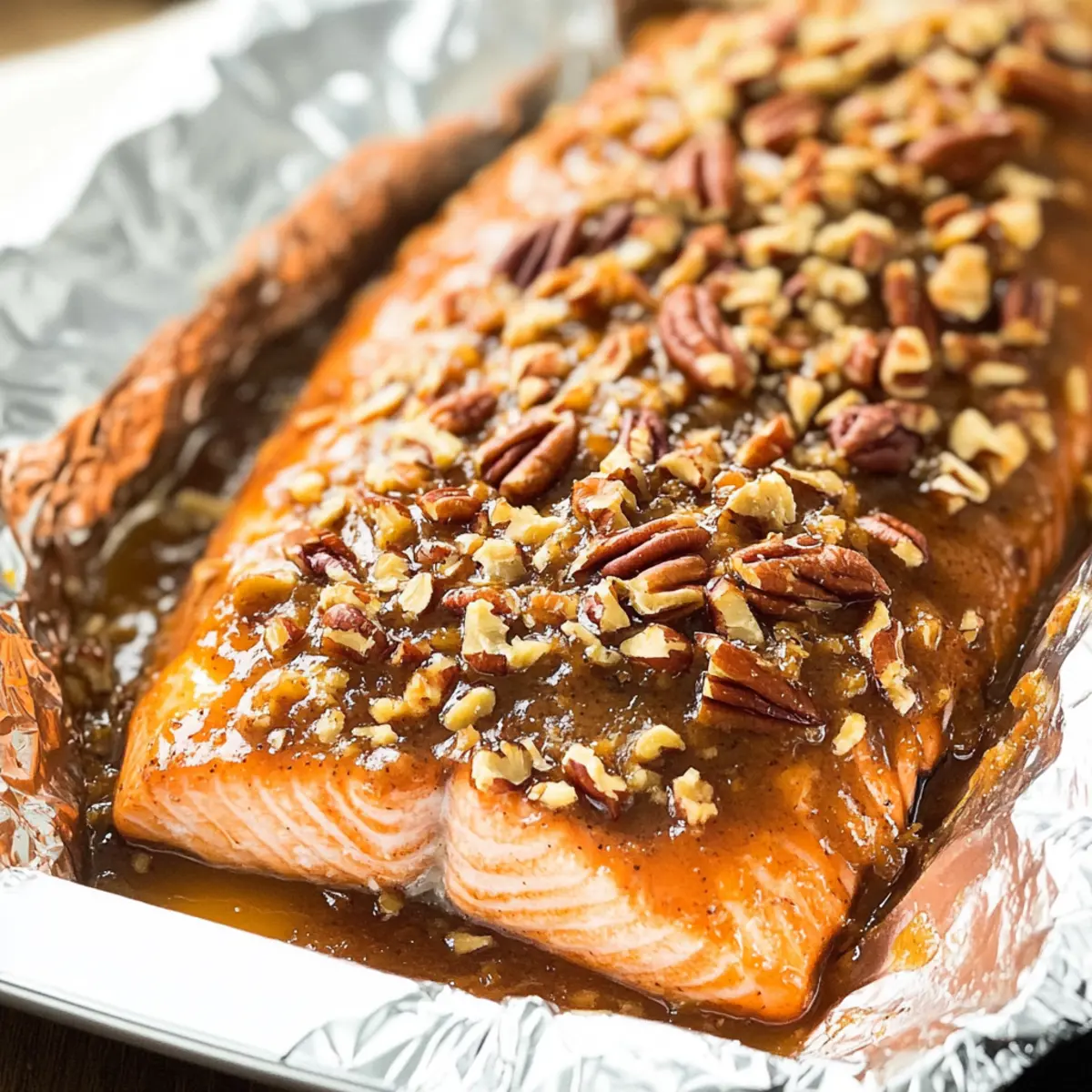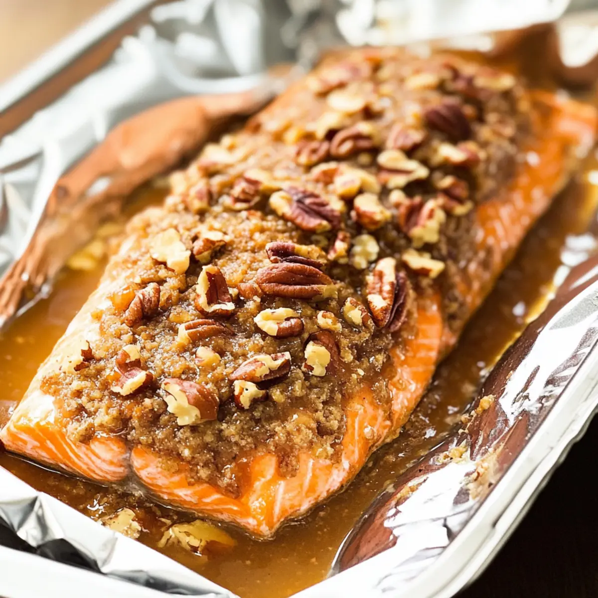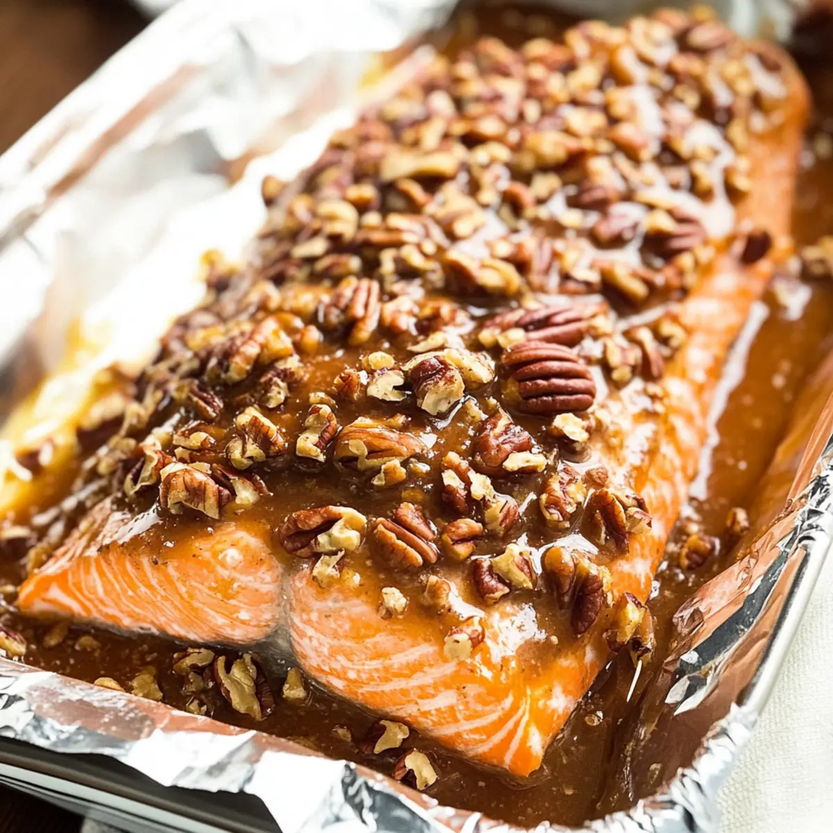 As the oven timer ticks down, the kitchen fills with the irresistible aroma of roasting nuts and savory salmon that instantly transports me to a cozy dinner gathering. This Pecan Crusted Salmon with Apricot-Dijon Glaze is a delightful dish that combines the flaky tenderness of wild-caught salmon with a crunchy, nutty topping. What makes it even better? It’s not only a showstopper for special occasions but also quick enough to whip up on a busy weeknight! With a preparation time of under 30 minutes, it’s the perfect way to enjoy a healthy, dairy-free main course that’s sure to impress. Ready to elevate your dinner table tonight? Let’s dive into making this satisfying meal together! Why is Pecan Crusted Salmon a Must-try? Flavor Explosion: The unique sweet-savory apricot-Dijon glaze paired with crunchy pecans creates a delectable taste sensation that’s hard to resist. Quick Prep Time: With under 30 minutes needed from start to finish, this recipe fits seamlessly into your busy lifestyle, making gourmet dining accessible any day of the week! Nutrient-Rich: Packed with omega-3 fatty acids and lean protein, this Pecan Crusted Salmon brings healthy eating to the forefront without sacrificing flavor. Versatile Variations: Feel free to experiment with different fruit preserves and nut types for a personalized touch – raspberry preserves or even walnuts add their unique flair! Impressive Presentation: The golden-brown crust not only tastes amazing but also looks stunning on the plate, ensuring that your family and friends will be wowed at any gathering! Pecan Crusted Salmon Ingredients • Get ready to create a delightful dish! For the Salmon 1.5 lbs Salmon – Choose wild-caught salmon for the best flavor and health benefits. For the Glaze 2 tablespoons Mayonnaise – This acts as a binder, but Greek yogurt can lighten it up wonderfully. ⅓ cup Apricot Preserves – This adds sweetness; substitute with raspberry jam for a tangy kick! ¼ teaspoon Salt – Enhances overall flavor; feel free to adjust to your liking. 1 teaspoon Dried Rosemary – This herb adds depth; fresh rosemary brings an even more pronounced flavor. ½ teaspoon Smooth Dijon Mustard – This contributes sharpness; switch to spicy brown mustard if you fancy a little heat! For the Crunchy Topping ¾ cup Chopped Pecans – These provide the delightful crunch; consider almonds or walnuts for a different texture. Flaky Sea Salt (optional) – A sprinkle on top elevates the flavors beautifully. With these ingredients, your Pecan Crusted Salmon will shine on any dinner table, impressing your loved ones while you enjoy a delectable, healthy meal! Step‑by‑Step Instructions for Pecan Crusted Salmon Step 1: Preheat the Oven Begin by preheating your oven to 400°F (204°C). While the oven warms up, line a baking sheet with aluminum foil or parchment paper for easy cleanup. Lightly coat it with non-stick spray or a drizzle of oil to prevent any sticking issues, ensuring your Pecan Crusted Salmon comes out perfectly without loss of its delicious crust. Step 2: Prepare the Glaze In a mixing bowl, whisk together 2 tablespoons of mayonnaise, ⅓ cup of apricot preserves, ¼ teaspoon of salt, 1 teaspoon of dried rosemary, and ½ teaspoon of smooth Dijon mustard. Mix until the ingredients are well combined and smooth, creating a sticky glaze that will enhance the flavors of your salmon. Set this flavorful mixture aside, ready to use in the next step! Step 3: Coat the Salmon Take your 1.5 lbs of salmon and place it skin-side down on the prepared baking sheet. With a brush or the back of a spoon, evenly spread the apricot mixture over the top of the salmon fillet. Make sure to cover the surface entirely, so each bite of your Pecan Crusted Salmon is packed with that sweet-savory flavor profile, enticing everyone at the dinner table. Step 4: Add the Pecan Crust Sprinkle ¾ cup of chopped pecans generously over the glazed salmon, pressing gently to ensure they adhere well. This crunchy topping is what makes the dish truly special. At this point, the salmon should look inviting with its golden pecan crust awaiting to be baked, promising a wonderful texture and flavor contrast when served. Step 5: Create a Barrier To prevent the crust from slipping off during baking, fold the edges of the lined foil around the salmon, creating a snug barrier. This simple trick keeps the toppings in place while the fish cooks, ensuring your Pecan Crusted Salmon maintains an appealing presentation and retains the moisture during the baking process. Step 6: Bake the Salmon Transfer the baking sheet to the preheated oven and bake for about 10-12 minutes for individual fillets or 14-18 minutes for a whole fillet. Keep an eye on the salmon as it cooks until it reaches a safe internal temperature of 145°F (63°C) and easily flakes with a fork. The pecans should turn golden and crisp, indicating it’s almost ready! Step 7: Rest and Serve Once baked to perfection, remove the salmon from the oven. Cover it loosely with foil and let it rest for 3-5 minutes. This resting time allows the fish to finish cooking gently and ensures the colors and flavors meld beautifully. Now, your Pecan Crusted Salmon is ready to be plated and served, inviting everyone to savor its delightful aroma and crunch! Pecan Crusted Salmon Variations Feel free to mix things up and make this dish your own with these delightful twists! Fruit Preserves Swap: Use raspberry preserves instead of apricot for a tangy flavor burst. It adds a delightful freshness that elevates the overall dish beautifully. Nut Alternatives: Sliced almonds or chopped walnuts can replace pecans for a different crunch. Try macadamia nuts for a buttery, rich flavor that works wonders with salmon! Different Fish Options: This recipe can also be crafted with steelhead trout or swordfish. Each fish brings its unique flavor and texture, giving you several gourmet options to choose from. Add a Spice Kick: Incorporate cayenne p