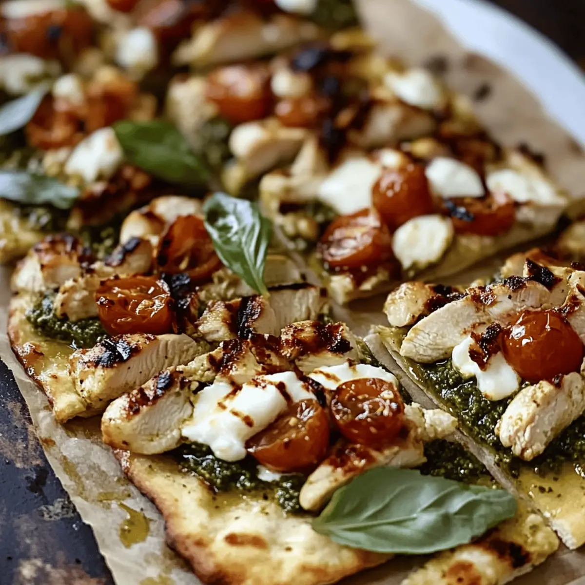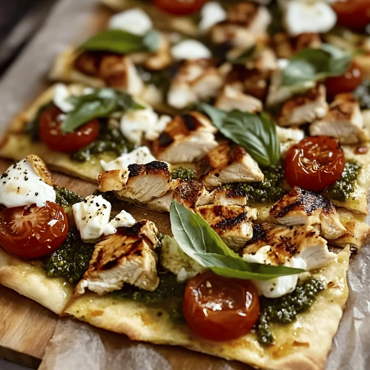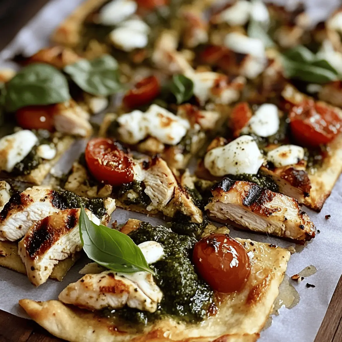 “Is there anything more rewarding than transforming simple ingredients into a feast for the senses? This Easy Pesto Chicken Flatbread brings together juicy grilled chicken, vibrant basil pesto, and gooey melted cheese—all packed onto a crispy flatbread. Not only is this dish quick and easy to whip up, making it a go-to for busy weeknight dinners, but it also invites endless customizations to suit your taste. Whether you’re planning a casual gathering with friends or a cozy meal with family, this recipe is sure to become a crowd-pleaser. Plus, it’s versatile enough to swap out proteins and veggies based on what you have on hand. Ready to elevate your dinner game with a fun twist on a classic flatbread? Let’s dive into this delightful recipe!” Why is This Recipe So Irresistible? Simplicity at Its Best: Preparing this Pesto Chicken Flatbread is a breeze, making it the ultimate quick fix for anyone short on time. Rich, Creamy Flavor: The harmony of fresh basil pesto and gooey melted cheese creates an explosion of taste with every bite. Versatility is Key: Whether you prefer juicy grilled chicken or a vegetarian twist with grilled veggies or tofu, this recipe can easily be tailored to your preferences. Perfect for Gatherings: This dish not only tastes amazing but also looks impressive, making it the ideal centerpiece for casual gatherings or family dinners. Make-Ahead Magic: Assemble your flatbreads in advance and pop them in the oven when you’re ready; it’s a real time-saver! Add a fresh side salad, or consider a delightful pairing like Garlic Butter Chicken and Potatoes Skillet to round out your meal. Enjoy a hassle-free yet delicious dining experience! Pesto Chicken Flatbread Ingredients Prepare to create magic with these simple yet flavorful components! For the Chicken 2 large boneless, skinless chicken breasts – The main protein source; for a vegetarian option, consider grilled vegetables or tofu. 2 tablespoons olive oil – Used for cooking chicken and enriching flavor; substitute with avocado oil if preferred. Salt and pepper, to taste – Essential for seasoning; adjust to your liking for a perfect flavor boost. For the Flatbread 4 pieces of flatbread – Acts as the base for this dish; use store-bought for convenience or try homemade for a personal touch. 1 cup fresh basil pesto – Infuses rich flavor and moisture; both store-bought or homemade pesto work well. For the Toppings 1 cup shredded mozzarella cheese – Provides that gooey, melty texture; alternative cheeses like provolone can be used for a twist. 1/4 cup grated Parmesan cheese – Enhances flavor and provides a nice crispy finish; consider nutritional yeast for a dairy-free option. 1/2 cup cherry tomatoes, halved – Adds a burst of freshness and color; feel free to swap with sun-dried tomatoes or peppery arugula. Fresh basil leaves (for garnish) – Optional, but they’ll add a touch of elegance and fresh aroma to your dish. Let the fun begin as you gather these essentials to whip up your Pesto Chicken Flatbread! Step‑by‑Step Instructions for Pesto Chicken Flatbread Step 1: Preheat the Oven Begin by preheating your oven to 400°F (200°C) to ensure it’s hot and ready for the Pesto Chicken Flatbread. This temperature will help achieve that perfect crispy base while keeping the toppings beautifully melted and flavorful. Step 2: Prepare Chicken While the oven is heating, pat the two boneless, skinless chicken breasts dry with a paper towel. Season them generously with salt and pepper, and any additional spices if desired. Heat two tablespoons of olive oil in a skillet over medium heat, then add the chicken breasts, cooking for 6-7 minutes per side until golden and cooked through, reaching an internal temperature of 165°F (75°C). Step 3: Rest and Slice Chicken Once your chicken reaches that perfect doneness, carefully remove it from the skillet and let it rest on a cutting board for about 5 minutes. This resting time allows the juices to redistribute, ensuring every bite is tender. After resting, slice the chicken into thin strips to be placed on the flatbread later. Step 4: Prepare Flatbread While the chicken is resting, lay your four pieces of flatbread flat on a baking sheet. Evenly spread a generous layer of fresh basil pesto over each flatbread, getting that vibrant green goodness into every corner. This will serve as the flavorful base for your toppings. Step 5: Assemble Flatbread Now it’s time to assemble your Pesto Chicken Flatbread! Distribute the sliced chicken evenly over the pesto-covered flatbreads. Follow this by sprinkling a cup of shredded mozzarella cheese on top, and add the halved cherry tomatoes for freshness and vibrant color. Finish with a sprinkle of grated Parmesan cheese for an extra layer of flavor. Step 6: Bake Carefully place the baking sheet in the preheated oven and bake for 10-12 minutes. You’ll know the Pesto Chicken Flatbread is done when the cheese is melted, bubbly, and the edges of the flatbread are golden brown. Step 7: Broil (Optional) For an irresistible crispy finish, you can broil the flatbreads for an additional 1-2 minutes. Keep a close eye during this step to ensure the toppings don’t burn, looking for a deliciously golden top. Step 8: Slice and Serve Once ready, remove the baking sheet from the oven and allow the flatbread to cool slightly. Using a sharp knife or pizza cutter, slice it into quarters or halves. For a touch of elegance, garnish with fresh basil leaves before serving this delightful Pesto Chicken Flatbread to your family or friends. What to Serve with Pesto Chicken Flatbread Elevate your Pesto Chicken Flatbread with these delightful side dishes that will round out your meal beautifully. Garlic Butter Green Beans: A crisp and flavorful side that adds a fresh crunch and the garlic enhances the overall meal experience. Simple Arugula Salad: This light and peppery salad brings a refreshing contrast to the rich flavors of the flatbread, p
