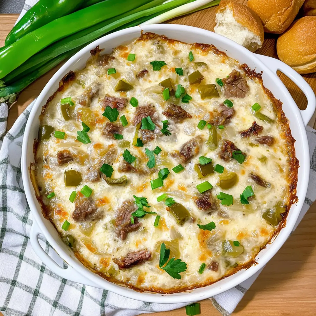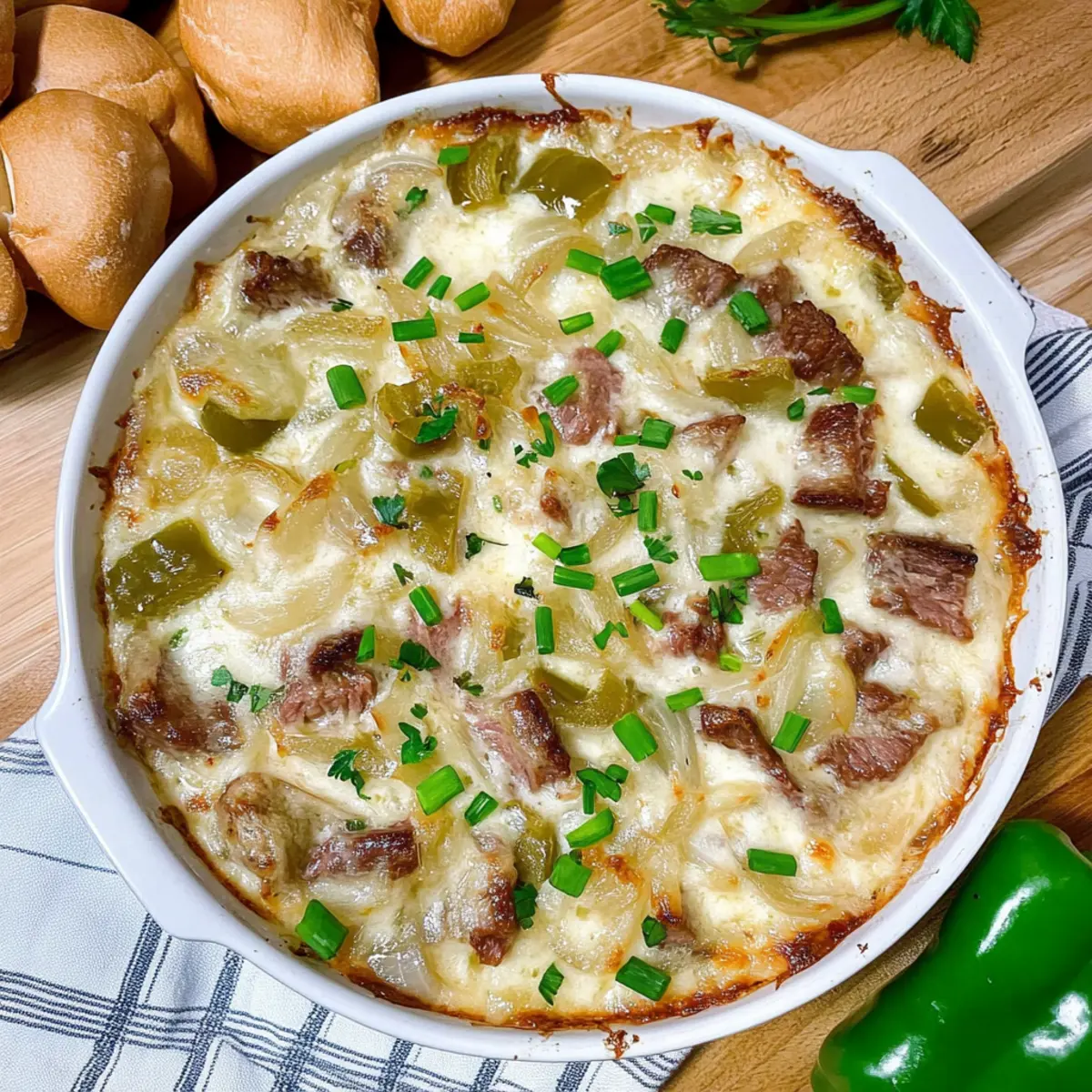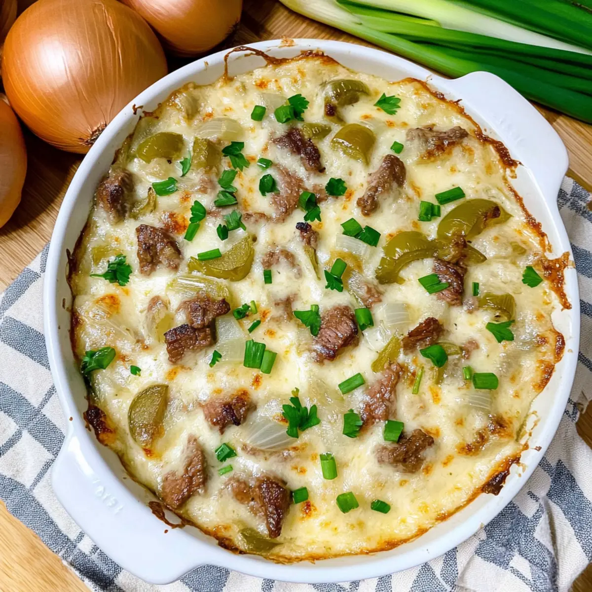 As I stepped into my kitchen, the aroma of sizzling onions enveloped me like a warm hug, instantly whisking me away to a cozy diner where cheesesteaks reign supreme. Today, I’m excited to share my take on a favorite comfort food—the Philly Cheesesteak Dip. This creamy, flavor-packed appetizer combines tender roast beef, savory sautéed onions, and vibrant bell peppers, all smothered in a luxurious blend of three cheeses. Whether you’re hosting a game night or just craving something indulgent, this dip is a sure-fire crowd-pleaser that’s quick to prepare and can even cater to gluten-free needs. So, grab your chips or veggies, and let’s dive into the cheesy goodness. What toppings or dippers will you choose to elevate this creamy delight? Why Does This Dip Steal the Show? Irresistible Flavor: Creamy, savory, and loaded with melty cheese, this dip captures the essence of a classic Philly cheesesteak in every bite. Quick to Prepare: No fuss, just a few simple steps mean you can whip this up even on busy days, perfect for spontaneous gatherings. Crowd Favorite: Guaranteed to make you the star of any party, this dip appeals to both cheese lovers and comfort food enthusiasts alike! Versatile Taste: Customize it with different cheeses or add-ins, like mushrooms or spicy jalapeños, for a personal twist on this delicious recipe. Get ready to serve up something special—this Philly Cheesesteak Dip is a guaranteed hit that pairs beautifully with any dippers you choose! Philly Cheesesteak Dip Ingredients • Everything you need for cheesy joy! For the Dip Roast Beef Deli Meat – Main protein source, adding heartiness; substitute with plant-based deli meat for a vegetarian option. Butter – Adds richness and helps sauté the vegetables for enhanced flavor. Onion – Provides sweetness and depth; use yellow or white onion for the best results. Green Bell Pepper – Introduces freshness and a satisfying crunch; can be replaced with red bell pepper for added sweetness. Cream Cheese – Gives the dip its signature creamy texture; ensure it’s at room temperature for easy mixing. Sour Cream – Adds a tangy element, helping to lighten the dip’s overall richness. Mozzarella Cheese – Melts beautifully for that gooey texture; substitute with Monterey Jack for a slightly different flavor. Provolone Cheese – Contributes a distinctive flavor; shredded mozzarella or Swiss can be used as alternatives. Salt and Black Pepper – Essential seasonings that enhance the overall flavor; adjust to taste. Fresh Parsley (Optional) – Adds a burst of color and freshness for garnishing. Green Onion (Optional) – Provides a pop of color and a mild onion flavor for extra taste appeal. Step‑by‑Step Instructions for Philly Cheesesteak Dip Step 1: Preheat the Oven Begin by preheating your oven to 375°F (190°C). While the oven warms up, take a moment to grease your baking dish or skillet with a bit of cooking spray or butter. This ensures that your creamy Philly Cheesesteak Dip won’t stick and will bake evenly, creating a gorgeous golden finish on top. Step 2: Sauté the Onions In a skillet over medium heat, melt 2 tablespoons of butter. Add finely chopped onions and sauté for 4-5 minutes, stirring occasionally, until they turn a nice caramelized golden brown. Your kitchen will be filled with a delicious, sweet aroma that sets the stage for the flavors in your Philly Cheesesteak Dip. Step 3: Add the Bell Peppers Next, toss in the diced green bell pepper with the caramelized onions. Sauté the mixture for an additional 2-3 minutes until the peppers are tender but still vibrant. This colorful addition brings not only fresh flavor to your dip but also visual appeal that will entice your guests. Step 4: Mix the Cheeses In a separate mixing bowl, combine 8 ounces of softened cream cheese, 1 cup of sour cream, 1 cup of mozzarella cheese, and ½ cup of provolone cheese. Use a spatula or whisk to blend the ingredients smoothly for about 2-3 minutes. The creamy mixture should become well incorporated and velvety, forming the base of your delicious Philly Cheesesteak Dip. Step 5: Combine Ingredients Gently fold in the sautéed onion and green pepper mixture along with 2 cups of chopped roast beef, adding a pinch of salt and black pepper to taste. Mix everything together thoroughly until all the ingredients are combined, ensuring each bite of your dip is packed with the savory goodness of the Philly Cheesesteak flavors. Step 6: Transfer and Bake Carefully transfer the cheesy mixture into your prepared baking dish, spreading it evenly with a spatula. You may reserve a bit of the mixture for topping, if desired. Cover the dish with aluminum foil and place it in the preheated oven, baking for 15-18 minutes, or until it’s bubbling and heated through. Step 7: Brown the Top After the initial baking time, remove the foil and bake for an additional 2-3 minutes to allow the top to get lightly browned and crispy. Keep an eye on it during this final stage to achieve that perfect melt and golden layer on your Philly Cheesesteak Dip. Step 8: Garnish and Serve Once you’ve removed the dip from the oven, sprinkle chopped fresh parsley and sliced green onions over the top for a vibrant garnish. Serve your Philly Cheesesteak Dip immediately with an array of dippers like tortilla chips, crackers, or slices of baguette. Enjoy the warmth and cheesy goodness with family and friends! Make Ahead Options These Philly Cheesesteak Dip preparations are perfect for busy home cooks looking to save time! You can prepare the entire dip up to 24 hours ahead by following the steps through mixing all the ingredients, then transferring it to a covered baking dish. Just refrigerate it until you’re ready to bake. When it’s time to serve, simply pop it in the oven, adding an extra 5 minutes to the baking time to ensure it’s heated through and bubbling. This way, you can enjoy your creamy, savory dip just as delicious as if you made it fres