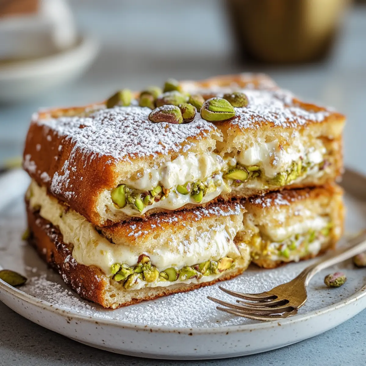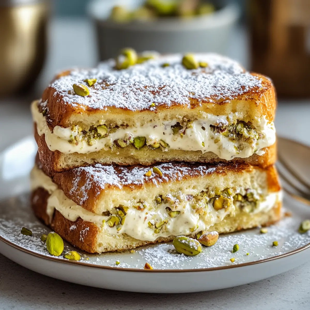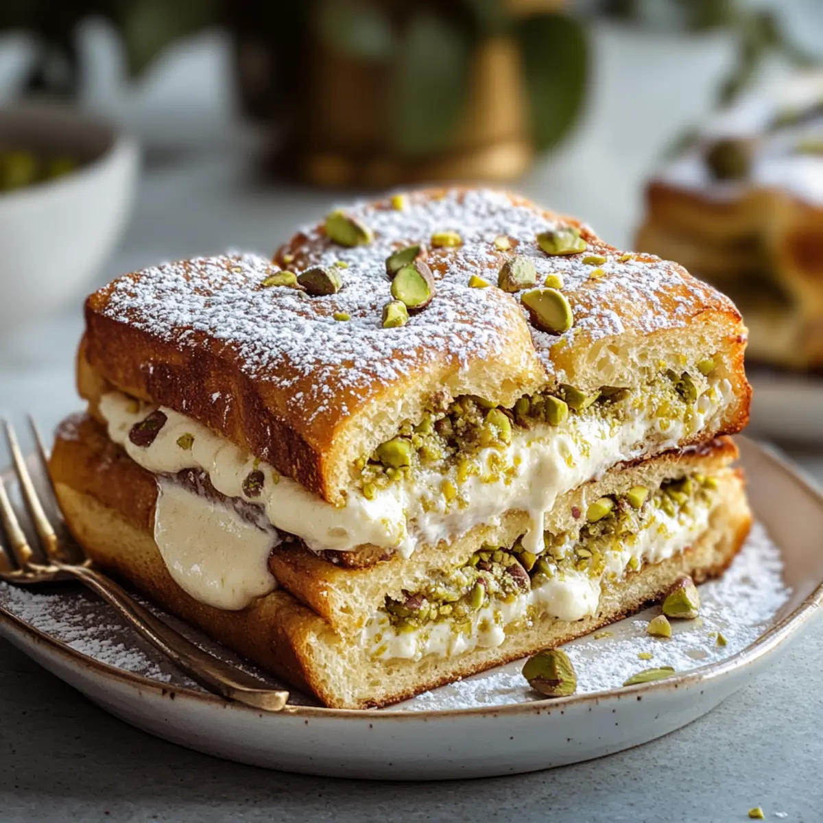As I stood in my kitchen, the sweet, toasty aroma filled the air, whispering promises of a cozy brunch gathering. This Pistachio Cream Stuffed French Toast Bake is no ordinary dish; it’s a celebration of soft brioche and rich, nutty pistachio cream that will elevate your weekends and impress your friends. What I love most is that it’s not just a crowd-pleaser; it’s incredibly easy to prep ahead, making your hosting experience a breeze. Imagine unveiling this golden masterpiece at your next brunch, where every bite offers a delightful surprise of creamy indulgence nestled within fluffy bread. Ready to dive into a recipe that transforms mornings into a joyful event? Let’s get started! Why is this French Toast Bake a Must-Try? Decadent Flavors: The pistachio cream lends a rich, nutty twist to your traditional French toast, creating a truly indulgent treat. Effortlessly Elegant: With just a bit of prep, you can wow your guests while keeping your kitchen stress-free, making it perfect for brunch gatherings. Make Ahead Magic: Advance preparation is easy! Assemble the dish the night before, and bake in the morning, just like you would with a Roll French Toast. Crowd-Pleasing Delight: This bake is guaranteed to be a hit, appealing to both sweet and savory lovers alike, just as popular as my go-to Peanut Butter Bake. Perfectly Textured: The layers of soft brioche combined with a creamy interior create a delightful mouthfeel you’ll crave for brunch after brunch. Get ready to elevate your brunch game with this Pistachio Cream Stuffed French Toast Bake! Pistachio Cream Stuffed French Toast Bake Ingredients • For the Brioche Base Brioche Bread – Soft and rich, it makes the perfect base; substitute with challah if needed. Eggs – These are crucial for the custard base, providing essential structure; beat until frothy for best results. • For the Pistachio Cream Pistachios – The star ingredient offering a luxurious, nutty flavor; can use almonds or pecans for a twist. Mascarpone Cheese – Adds a creamy richness to the filling; cream cheese is an alternative option. Milk – Helps bind the cream and custard; opt for whole milk or a non-dairy substitute for a lighter version. Sugar – Sweetens the filling and balances flavors; adjust to taste or swap in a natural sweetener if desired. Vanilla Extract – Deepens the flavor; for variation, try almond extract for something unique. • For the Custard Mixture Salt – Enhances the overall flavors of the dish; don’t skip this essential step. Remember, this delightful Pistachio Cream Stuffed French Toast Bake makes for a brunch that will leave an impression on everyone at the table! Step‑by‑Step Instructions for Pistachio Cream Stuffed French Toast Bake Step 1: Preheat & Prep Begin by preheating your oven to 350°F (175°C) while you prepare the baking dish. Grease a 9×13-inch baking dish generously with butter or cooking spray to prevent sticking. This will ensure that your Pistachio Cream Stuffed French Toast Bake slides out easily once baked, leaving you with a beautifully presented dish to serve. Step 2: Make Pistachio Cream In a food processor, blend the pistachios until they form a fine meal, releasing their fragrant oils. Transfer this to a mixing bowl, then gently fold in the mascarpone cheese, sugar, and milk until you achieve a velvety, smooth mixture. This luscious pistachio cream will be the enchanting filling for your French toast bake, creating a delightful surprise in every bite. Step 3: Whisk Custard In a separate bowl, whisk together the eggs, milk, sugar, vanilla extract, and salt. Beat the mixture vigorously until it becomes frothy and well combined; this will create the rich custard base you need for the dish. The frothy texture indicates that you have incorporated enough air, which is essential for that perfect fluffy result in your Pistachio Cream Stuffed French Toast Bake. Step 4: Layer Begin layering by placing half of the brioche slices evenly across the bottom of your prepared dish. Generously spread the pistachio cream over this first layer of bread, ensuring every slice is coated. Next, top with the remaining brioche slices, gently pressing them down to create a snug fit. This layering will help the creamy filling meld beautifully with the bread during baking. Step 5: Soak Pour the frothy custard mixture evenly over the layered bread, ensuring it seeps between the slices. Gently press the bread down with a spatula to encourage absorption. Allow the dish to sit for at least 15-30 minutes at room temperature, or refrigerate it overnight for an even richer flavor. This soaking step is crucial for achieving a moist and custardy texture in your Pistachio Cream Stuffed French Toast Bake. Step 6: Bake Once soaked, place the baking dish uncovered in the preheated oven and bake for 35-40 minutes. Watch for the top to turn golden brown and slightly puffed, and ensure the center of the bake is set and not jiggly. A skewer inserted in the middle should come out clean. This baking process will transform your Pistachio Cream Stuffed French Toast Bake into a heavenly, golden masterpiece perfect for brunch. What to Serve with Pistachio Cream Stuffed French Toast Bake Picture a joyous brunch spread, where each dish dances together in harmony, inviting everyone to indulge in flavors and warmth. Crispy Bacon: A salty, savory contrast to the sweet, creamy bake, adding a delightful crunch to your brunch plate. Fresh Berries: Juicy strawberries, blueberries, or raspberries serve as a vibrant, refreshing garnish that cuts through the richness beautifully. Maple Syrup: Warm maple syrup drizzled over the bake enhances its sweetness while lending a luxurious finish to each bite. Greek Yogurt Parfait: Creamy yogurt layered with granola and fruits adds a refreshing element to balance the richness of the French toast. Mixed Green Salad: A light, zesty salad brings a crunch and bright notes to the table, providing a lovely contrast to