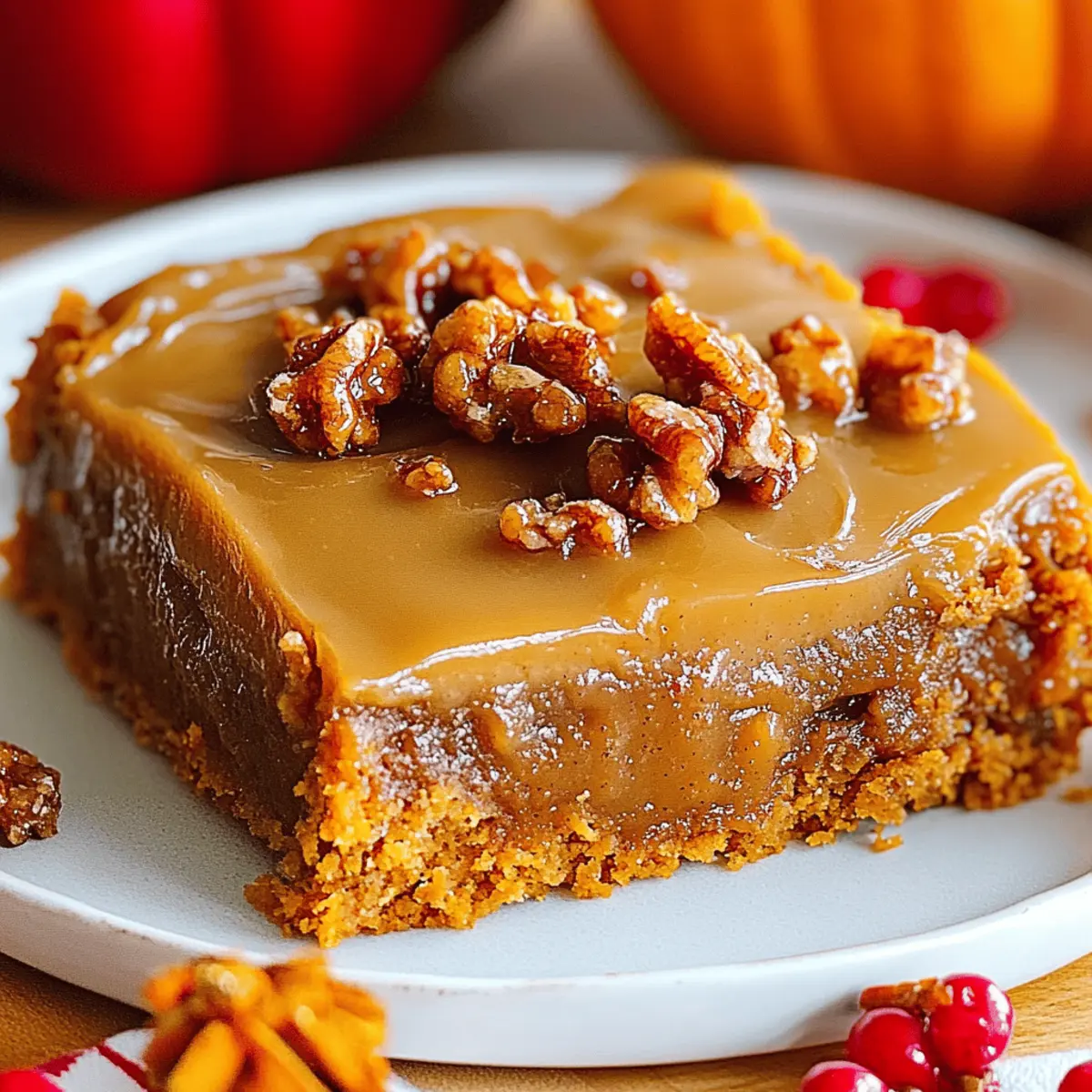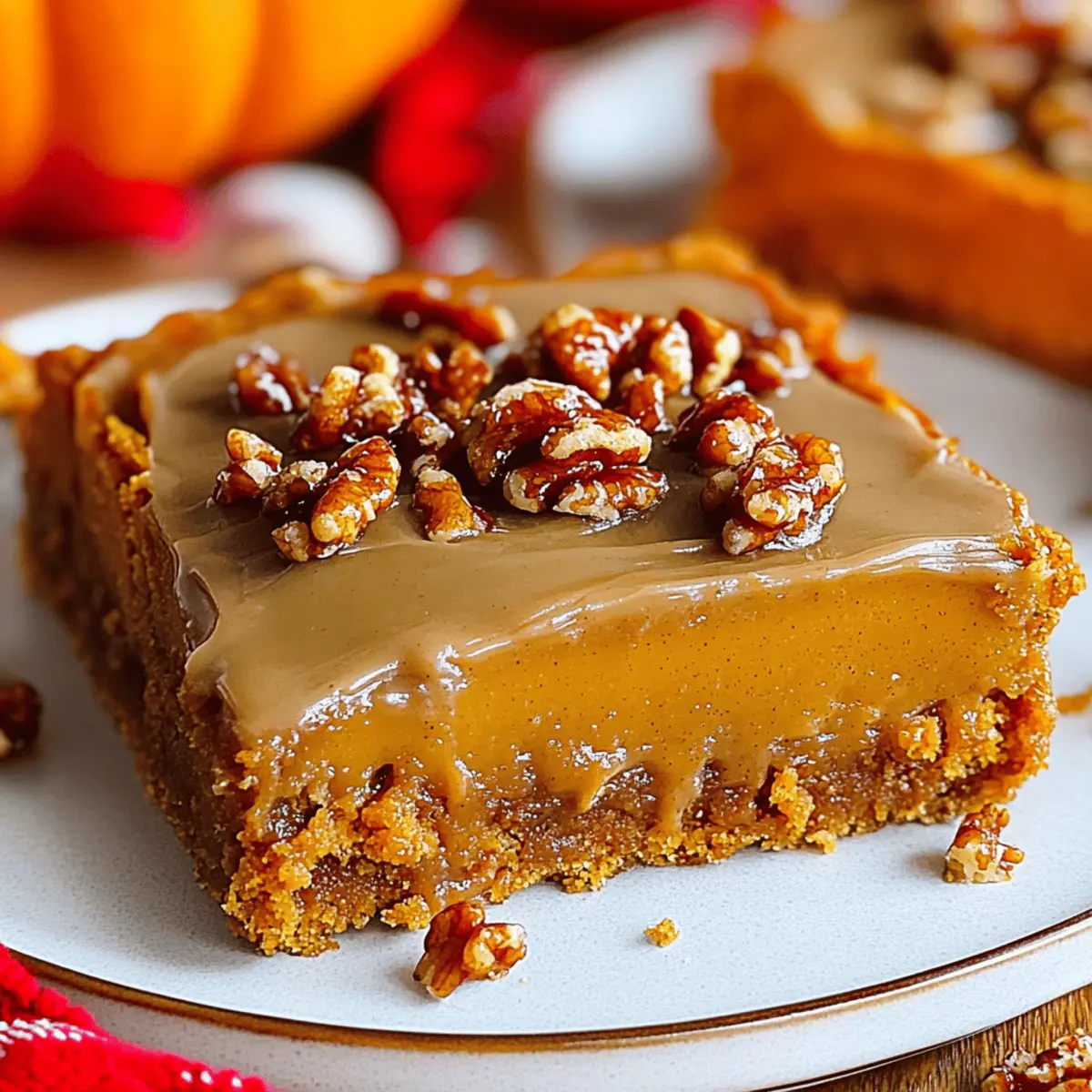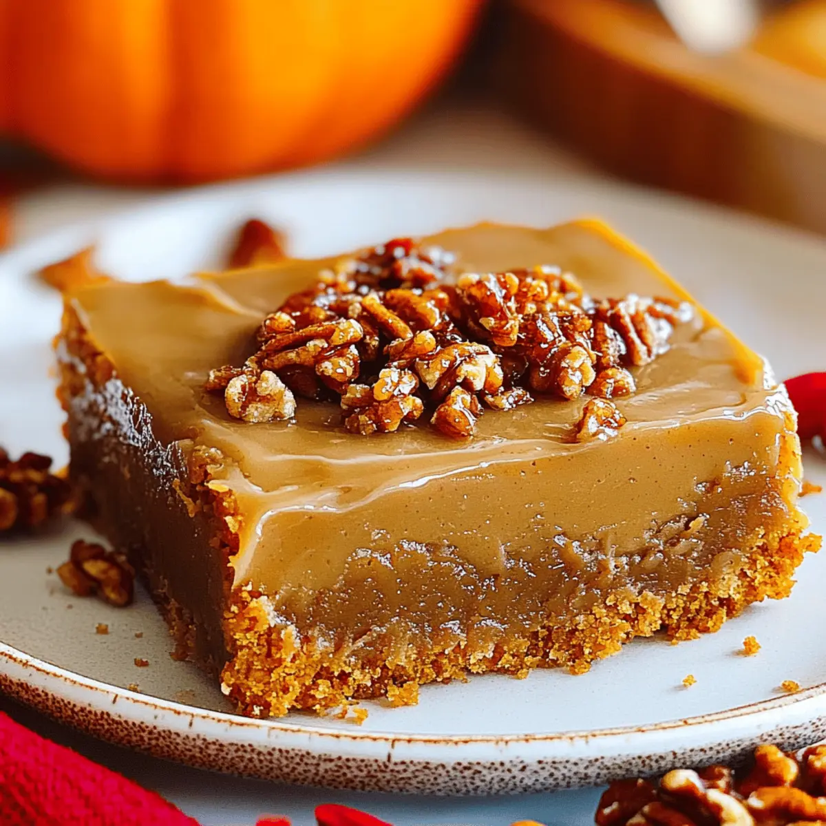 As the leaves start to fall and the air turns crisp, nothing says autumn quite like the aroma of freshly baked Praline Pumpkin Bars wafting through your kitchen. These delightful treats capture the essence of pumpkin pie with a fun twist, featuring a creamy layer topped with a crunchy praline that will make your taste buds dance. What makes these bars truly irresistible, besides their ease of preparation, is that they are fully customizable to fit dietary needs—think gluten-free or dairy-free options! Whether you’re hosting a Thanksgiving gathering or simply enjoying a cozy night in, these bars are sure to become a seasonal favorite. Ready to discover how to bring this autumn classic to your home? Let’s dive into the recipe! Why Are These Bars So Irresistible? Unmatched Flavor: The luscious blend of pumpkin and spices brings a cozy warmth that perfectly captures the essence of fall. Decadent Topping: A crunchy praline layer adds a delightful texture that contrasts beautifully with the soft pumpkin base. Customizable Options: Easily adapt these bars to suit your dietary needs—choose gluten-free flour or swap in vegan ingredients for a dairy-free dessert. Quick and Easy: With a simple recipe and minimal prep time, you can whip up these delicious bars without any hassle. Perfect for Sharing: Whether at a holiday gathering or a cozy night in, these bars will impress friends and family alike—served warm with a scoop of ice cream, they become a show-stopping treat! If you love exploring seasonal flavors, try out some of our other favorites like Pumpkin Spice Smoothie and Spiced Pumpkin Pancakes. Praline Pumpkin Bars Ingredients • Get ready to bake your fall favorite! For the Pumpkin Base Pumpkin Puree – Provides moisture and flavor; essential for the perfect pumpkin bars. Brown Sugar – Adds a depth of sweetness; crucial for that cozy flavor. Butter – Provides richness; substitute with vegan butter for a dairy-free option. Eggs – Acts as a binder; can be replaced with flax eggs for a vegan version. All-Purpose Flour – Creates structure; opt for gluten-free flour if needed. Baking Powder – Helps the bars rise; check for freshness for the best results. Baking Soda – Works with baking powder for a light texture; ensure it’s active. Spices (Cinnamon, Nutmeg) – Adds warmth and delightful aroma; adjust to your taste. Salt – Balances the sweetness; essential for enhancing all the flavors. For the Topping Powdered Sugar – Sweetens the frosting; can be reduced for a less sweet treat. Milk – Adjusts the frosting consistency; use plant-based milk for dairy-free. Extra Butter – Adds creaminess to the frosting; adjust for your desired texture. This ingredient list is your first step towards making the mouthwatering Praline Pumpkin Bars that everyone will adore. Happy baking! Step‑by‑Step Instructions for Praline Pumpkin Bars Step 1: Preheat and Prepare the Baking Dish Begin by preheating your oven to 350°F (175°C). While the oven warms up, take a 9×13-inch baking dish and line it with parchment paper for easy removal later on. This creates a smooth base for your Praline Pumpkin Bars and ensures they won’t stick. Step 2: Mix Wet Ingredients In a large mixing bowl, combine 1 cup of pumpkin puree, 1/2 cup of melted butter, and 1 cup of brown sugar. Use a whisk to mix them thoroughly until the mixture is smooth and creamy, with a slight gloss on the surface. This step infuses your bars with that rich pumpkin flavor, a cornerstone of the Praline Pumpkin Bars. Step 3: Incorporate Eggs Next, crack in two large eggs and blend them into your pumpkin mixture. Make sure to beat them until fully integrated, creating a homogeneous batter that’s visibly thicker. The eggs will help bind the ingredients together, giving your bars their delightful texture. Step 4: Combine Dry Ingredients In a separate bowl, whisk together 1 1/2 cups of all-purpose flour, 1 teaspoon of baking powder, 1 teaspoon of baking soda, and your chosen spices like cinnamon and nutmeg. Ensure to add a pinch of salt to enhance the flavors. This dry mixture is critical for the structure of your Praline Pumpkin Bars, so mix well. Step 5: Combine All Mixtures Gradually add the dry ingredients to your wet mixture, folding gently with a spatula until just combined. Be careful not to over mix; the batter should still be slightly lumpy. This ensures your bars remain soft and moist—exactly what we want in Praline Pumpkin Bars! Step 6: Bake Pour the batter into the prepared baking dish, smoothing the top with a spatula. Slide the dish into the preheated oven and bake for 25 to 30 minutes. Check for doneness by inserting a toothpick in the center; it should come out clean or with just a few moist crumbs. Step 7: Prepare Frosting While the bars are baking, prepare your frosting by mixing 2 cups of powdered sugar with 1/4 cup of melted butter and enough milk to achieve a smooth consistency, about 2 tablespoons. Adjust the milk as needed to get the right thickness for spreading over your cooled bars. Step 8: Cool and Frost Once the bars are done, allow them to cool completely in the baking dish on a wire rack. This may take about 30 minutes. Once cool, generously spread the frosting over the top of your Praline Pumpkin Bars before cutting them into squares for serving. Praline Pumpkin Bars Variations Feel free to get creative and customize your Praline Pumpkin Bars with these delightful variations! Gluten-Free: Use a 1:1 gluten-free baking flour to make these bars suitable for everyone, ensuring no one misses out on this fall treat. Dairy-Free: Substitute regular butter for vegan butter and use a plant-based milk in the frosting for a dairy-free dessert. The flavor and texture will still shine! Nutty Additions: Fold in 1 cup of chopped pecans or walnuts for an added crunch that complements the creamy pumpkin base beautifully. Chocolatey Twist: Incorporate dark chocolate chips or swirls of melted chocolate into the b