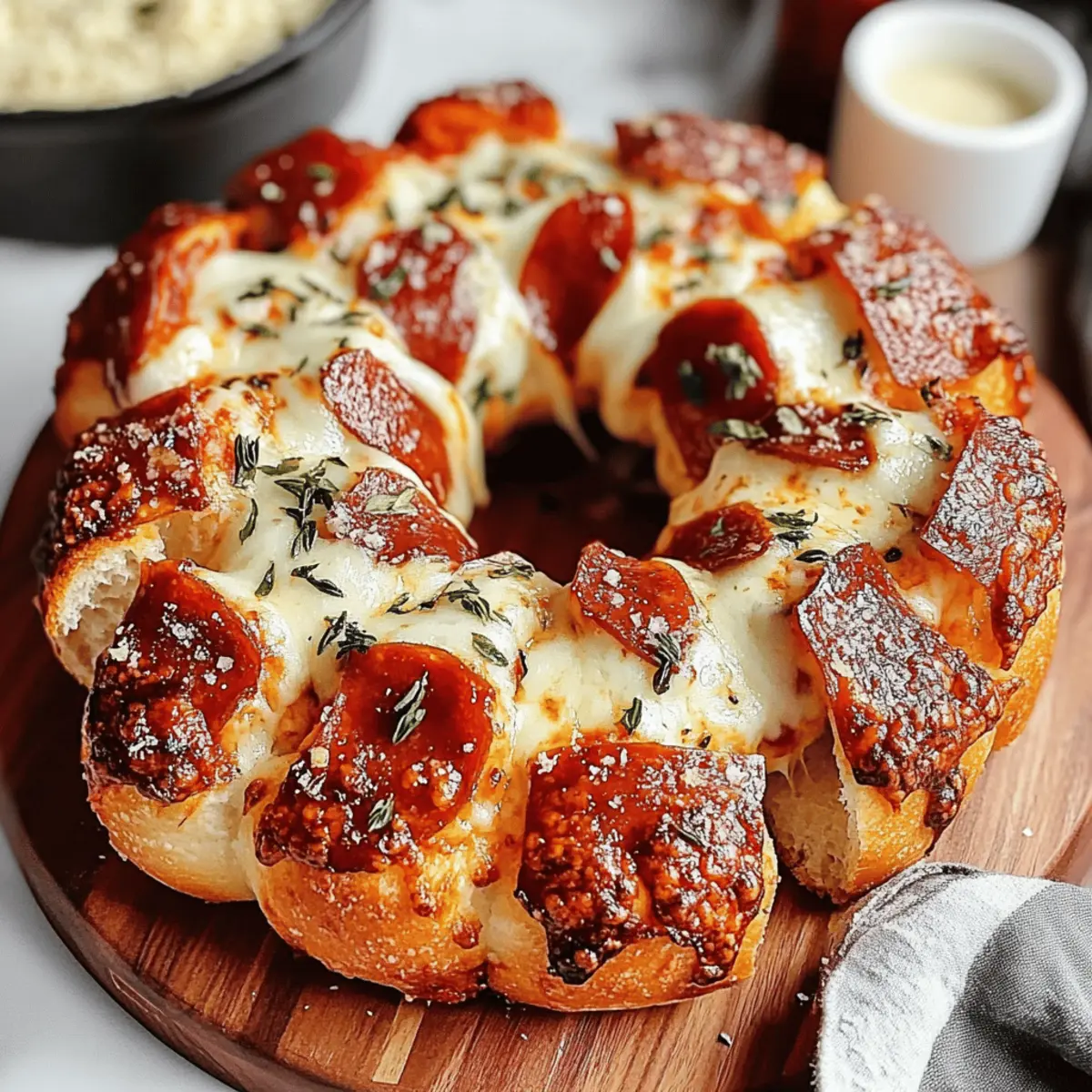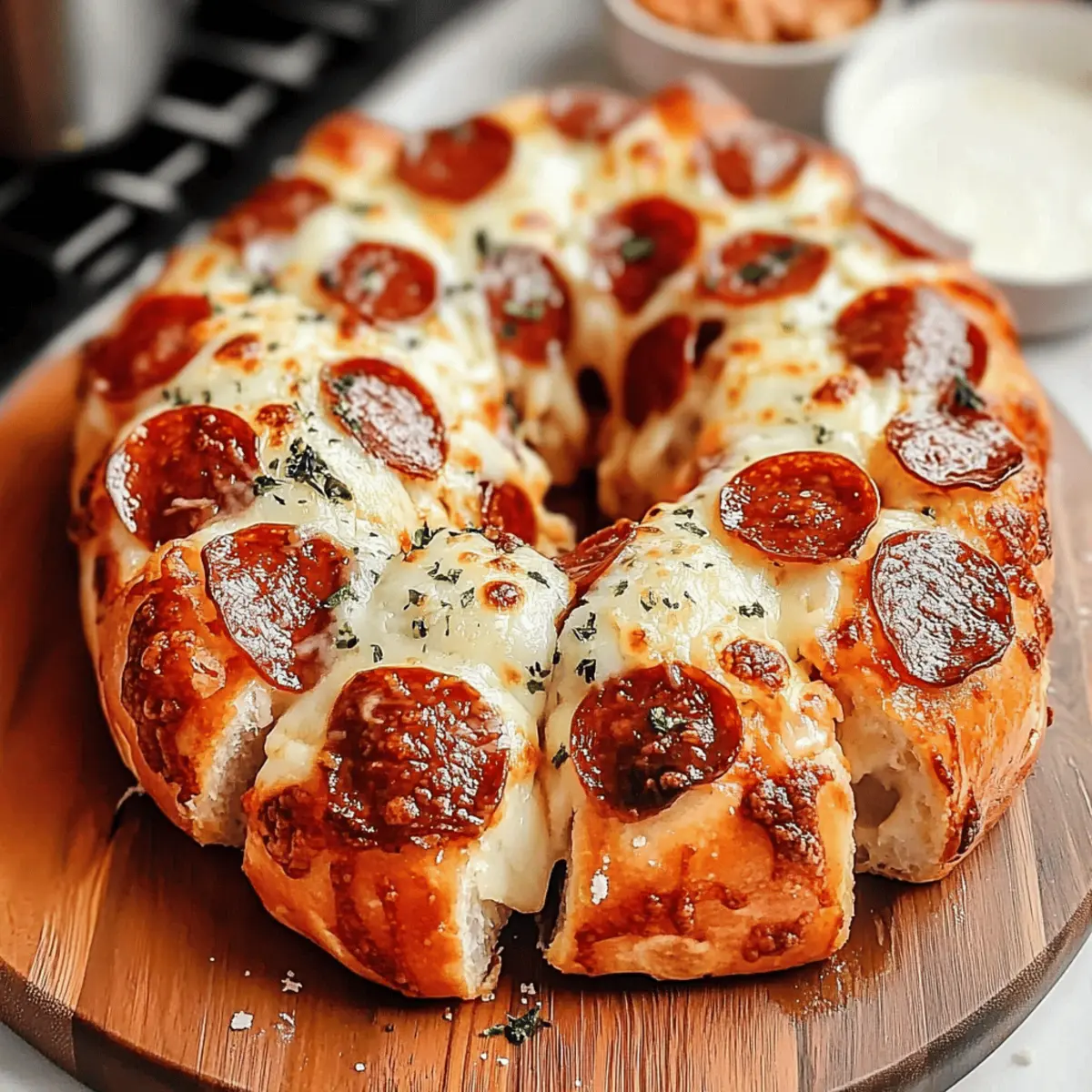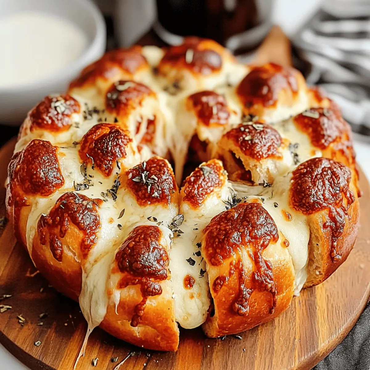 As I pulled the warm, golden loaf from the oven, the enticing aroma of garlic and herbs instantly wrapped around me like a warm hug. This Cheesy Pull Apart Pizza Bread isn’t just about satisfying hunger; it transforms a regular dinner into an interactive, shareable feast that will have everyone gathered around the table, tearing apart pieces in delightful anticipation. With its gooey mozzarella and customizable toppings, this recipe balances convenience and creativity—perfect for busy weeknights or lively game nights. Not only is it easy to make, but it’s also a guaranteed crowd-pleaser that’s adaptable to suit every taste—even the pickiest eaters. What toppings will you choose for your mouthwatering masterpiece? Why Is Pull Apart Pizza Bread So Special? Interactive Experience: Each piece is designed for sharing and engaging with family and friends, creating lasting memories around the table. Customizable Options: Tailor toppings to your preferences, from classic pepperoni to BBQ chicken, ensuring everyone gets their favorite. Quick and Easy: With store-bought dough as an option, this recipe simplifies dinner prep while still delivering on flavor. Flavor-Packed: The combination of melted cheese and fragrant garlic herb oil guarantees a mouthwatering treat. Perfect for Any Occasion: Whether it’s game night, a family gathering, or just a cozy night in, this pizza bread is always a hit! Enjoy it with a side of marinara sauce for dipping, or pair it with a simple salad for a delightful meal. Pull Apart Pizza Bread Ingredients Experience the joy of making Pull Apart Pizza Bread with these simple, essential ingredients! For the Dough • Pizza Dough – Use store-bought for convenience, or make your own for a personal touch. For the Garlic Herb Oil • Olive Oil – Adds moisture and enhances flavor; reserve some for brushing on top. • Garlic (4 cloves, minced) – Fresh garlic provides aromatic depth; roasted garlic adds a sweeter touch. • Dried Oregano (1 tsp) – A staple herb for pizza flavor; swap for fresh if available. • Dried Basil (1/2 tsp) – Complements the oregano beautifully; fresh basil works wonders too. • Red Pepper Flakes (1/4 tsp, optional) – Adds a lovely kick; adjust to taste for spice preference. For the Cheesy Filling • Parmesan Cheese (1/2 cup, grated) – Offers nutty depth; Pecorino Romano is a fantastic substitute. • Mozzarella Cheese (2 cups, shredded) – The star for gooeyness; consider blending with provolone for a twist. For the Garnish • Fresh Parsley (1/4 cup, chopped) – Adds a pop of color and freshness; basil or chives can be used instead. For Dipping • Pizza Sauce – An optional but delightful accompaniment that enhances the pull-apart pizza bread experience. Step‑by‑Step Instructions for Pull Apart Pizza Bread Step 1: Prepare Garlic Herb Oil In a small bowl, combine ½ cup of olive oil with 4 minced garlic cloves, 1 teaspoon of dried oregano, ½ teaspoon of dried basil, and optional ¼ teaspoon of red pepper flakes. Allow the mixture to sit for about 15 minutes to let the flavors meld together, creating a fragrant garlic herb oil that will enhance the flavors of your Pull Apart Pizza Bread. Step 2: Preheat Oven Preheat your oven to 375°F (190°C) while you prepare the baking dish. Grease a 9-inch springform pan with a light coat of olive oil to prevent the Pull Apart Pizza Bread from sticking and to ensure a beautifully golden-brown crust. The warm oven will help the bread rise to perfection. Step 3: Roll Dough On a floured surface, roll out your pizza dough into a rectangle measuring approximately 12×18 inches. Aim for an even thickness that will allow the dough to cook uniformly. Once rolled, admire the sight of your prepared dough, as it sets the foundation for the cheesy goodness to come in your Pull Apart Pizza Bread. Step 4: Brush with Oil Generously brush the rolled-out dough with the prepared garlic herb oil, making sure to coat it well but leaving some of the oil for later. This will infuse the dough with flavor, resulting in a savory experience with every pull. Take a moment to appreciate the aroma of garlic wafting from the dough. Step 5: Sprinkle Cheese Evenly sprinkle ½ cup of grated Parmesan cheese and 2 cups of shredded mozzarella cheese across the entire surface of the oiled dough. Make sure every inch is covered for that gooey, cheesy flavor in your Pull Apart Pizza Bread. The mix of cheeses will melt beautifully, creating delightful pockets of goodness. Step 6: Cut Strips Using a sharp knife or pizza cutter, slice the dough into 1-inch strips. Take your time to ensure that the cuts are straight and even. After cutting, stack several strips together to prepare for the next step, visualizing how they will soon become the irresistible pieces of Pull Apart Pizza Bread. Step 7: Cut Squares Next, cut the stacked strips into 1-inch pieces to form bite-sized squares. You’ll want to do this gently so that the layers remain intact and maintain their shape. Stack them on a large plate, ready to be assembled into the springform pan, picturing your Pull Apart Pizza Bread coming to life. Step 8: Arrange in Pan Carefully place the dough squares into the prepared springform pan, standing them upright with the cut sides facing up. Layer them snugly but without squishing, forming a beautiful arrangement of the squares. This method allows for easy pulling apart while baking, resulting in a visually appealing Pull Apart Pizza Bread. Step 9: Brush Top Use the remaining garlic herb oil to generously brush the top of the assembled dough squares. This final touch will enhance the flavor and ensure a tasty, golden-brown crust. As you brush, take in the enticing aroma of garlic permeating the kitchen, heightening your anticipation for this flavorful treat. Step 10: Bake Cover the springform pan tightly with aluminum foil and bake the Pull Apart Pizza Bread in the preheated oven for 25 minutes. Then, remove the foil and con