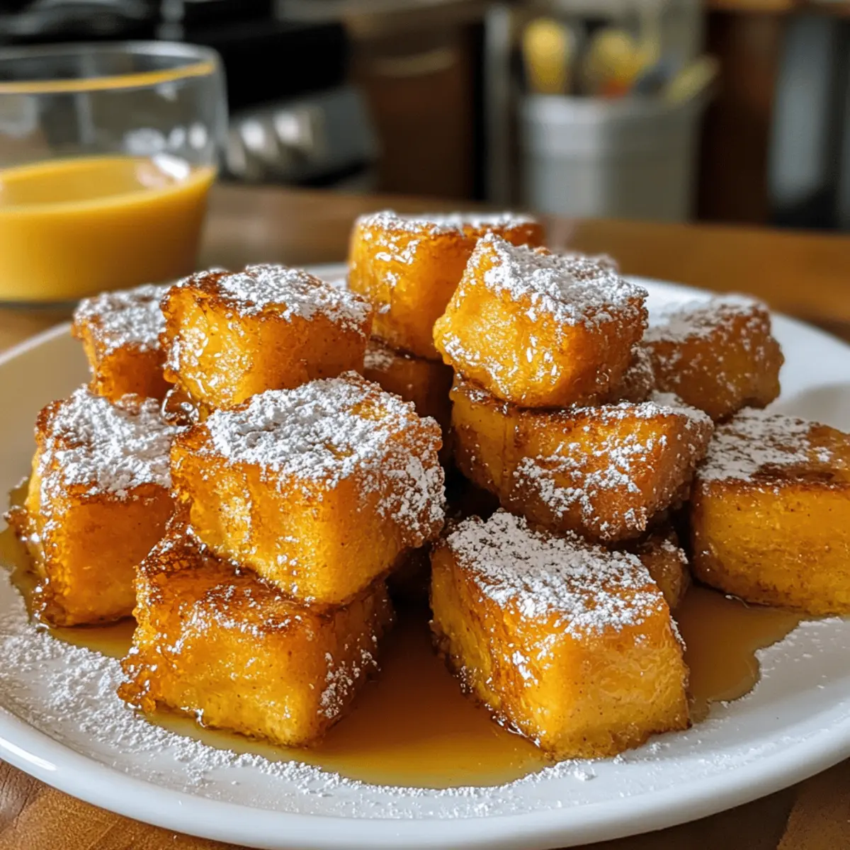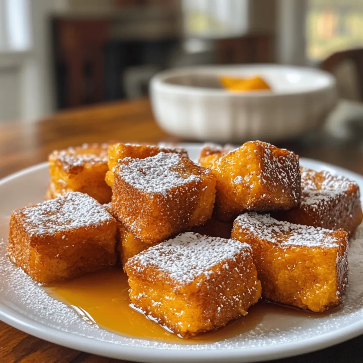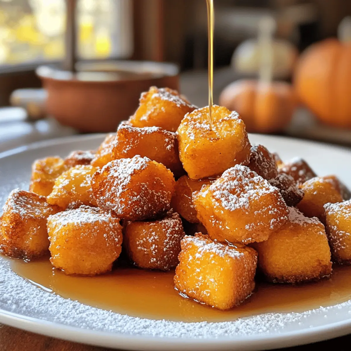 Every autumn, there’s a certain magic that fills the air, prompting us to indulge in cozy comfort food. That’s exactly why I’m excited to share my recipe for Pumpkin French Toast Bites—tiny morsels of joy that celebrate the flavors of the season! These delightful bites are not only beginner-friendly, making them perfect for novice chefs, but they also whip up in no time, allowing you to enjoy a scrumptious breakfast or brunch without the fuss. Imagine the warm embrace of pumpkin puree and warm spices melting in your mouth, providing that culinary hug we all crave. So, why wait? Let’s dive into the simple steps that will transform your mornings from ordinary to extraordinary! Are you ready for a cozy fall treat that will have everyone coming back for seconds? Why Are Pumpkin French Toast Bites Irresistible? Coziness in Every Bite: Each piece is infused with the warm, inviting essence of pumpkin and spices, making them the ultimate fall comfort food. Beginner-Friendly: The straightforward process allows anyone to whip up these delicious bites, perfect for both seasoned chefs and kitchen novices. Quick to Prepare: With a simple soak and fry method, you can have these bites ready in no time—ideal for busy mornings or leisurely brunches. Versatile Serving Options: Drizzle with maple syrup, dust with powdered sugar, or pair with whipped cream for a delightful twist that suits your mood. Perfect for Gathering: Impress your family and friends during fall gatherings, as these delightful bites will surely disappear quickly! Pumpkin French Toast Bites Ingredients Dive into the cozy flavors of fall with these essential ingredients! For the Batter Brioche or Challah Bread – Provides a soft, rich base; you can substitute with any bread, like gluten-free, adjusting the soaking time. Eggs – Acts as a binding agent, creating a wonderful custard-like coating. Milk – Lightens the custard mix for a silky texture; feel free to use plant-based alternatives like almond or soy. Pumpkin Puree – Adds moisture and sweetness, essential for that delightful pumpkin flavor. Granulated Sugar – Balances spices and helps to caramelize for that perfect golden crust. Vanilla Extract – Enhances the overall depth of flavor and warmth in your bites. Ground Cinnamon – Provides the warmth and sweetness that defines this cozy recipe. Ground Nutmeg – Elevates the pumpkin flavor, contributing to the warm spice blend. Ground Ginger – Adds a bright note and layers of flavor to your bites. Salt – Enhances sweetness and overall flavor, tying all the ingredients together. Butter – Used for frying to create that crispy crust while adding a rich flavor. For Serving Maple Syrup and Powdered Sugar – Adds the perfect sweetness and lovely visual appeal to your Pumpkin French Toast Bites! Step‑by‑Step Instructions for Pumpkin French Toast Bites Step 1: Prepare the Batter In a large mixing bowl, combine eggs, milk, pumpkin puree, sugar, vanilla extract, cinnamon, nutmeg, ginger, and salt. Whisk these ingredients together until the mixture is entirely smooth and well-blended, which should take about 2–3 minutes. This creamy custard base is essential for your Pumpkin French Toast Bites, so make sure there are no lumps before proceeding to the next step. Step 2: Soak the Bread Cut your brioche or challah bread into bite-sized cubes and gently add them to the pumpkin mixture. Use a spatula to carefully fold the bread pieces into the batter, ensuring each cube is well-coated. Allow the bread to soak for about 10–15 minutes, stirring occasionally. This will help the flavors meld and ensure the bites are rich and flavorful when cooked. Step 3: Heat the Skillet Preheat a non-stick skillet over medium heat and melt 1 tablespoon of butter until it bubbles but doesn’t brown. Make sure the pan is hot enough that you hear a sizzle when adding the bread, but not so hot that the butter smokes. The melted butter will create a perfectly crispy crust for your Pumpkin French Toast Bites. Step 4: Cook the First Batch Once the butter is ready, carefully add half of the soaked bread cubes in a single layer in the skillet. Make sure not to overcrowd the pan to allow even cooking. Cook the bites for about 3–4 minutes on each side. They should turn a golden brown and become crispy, giving a wonderful contrast to the soft interior. Step 5: Finish Cooking the Bites After the first batch is cooked, transfer the bites to a plate and keep them warm in a low oven, if desired. Return the skillet to the heat, adding another tablespoon of butter. Add the remaining soaked bread cubes to the skillet and repeat the cooking process. Ensure they brown evenly, just like the first batch, for a delightful finish. Step 6: Serve with Delight Once all your Pumpkin French Toast Bites are cooked, it’s time to serve! Drizzle them with warm maple syrup and dust with powdered sugar for a finishing touch. These cozy bites are best enjoyed fresh and warm, bringing the flavors of fall to your breakfast table. Make Ahead Options These Pumpkin French Toast Bites are perfect for meal prep enthusiasts! You can soak the bread cubes in the pumpkin mixture up to 24 hours in advance, allowing the flavors to meld beautifully overnight. For best results, refrigerate them in an airtight container to maintain moisture. You can also cook the bites ahead of time; simply let them cool completely and store in the fridge for up to 3 days. When you’re ready to serve, reheat them in a skillet over medium heat for just a few minutes until warm, ensuring they stay crispy on the outside. This way, you’ll enjoy delightful, hassle-free mornings without sacrificing flavor! Expert Tips for Pumpkin French Toast Bites Bread Choice Matters: Use brioche or challah for a fluffy, rich texture. If using other types, adjust soaking time accordingly to prevent sogginess. Beat the Eggs Well: Whisk the eggs thoroughly to create a smooth custard mix—a lumpy mixture may lead to 