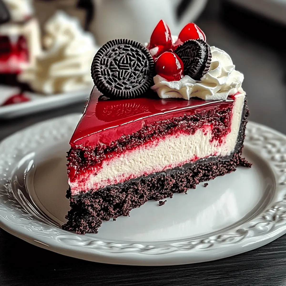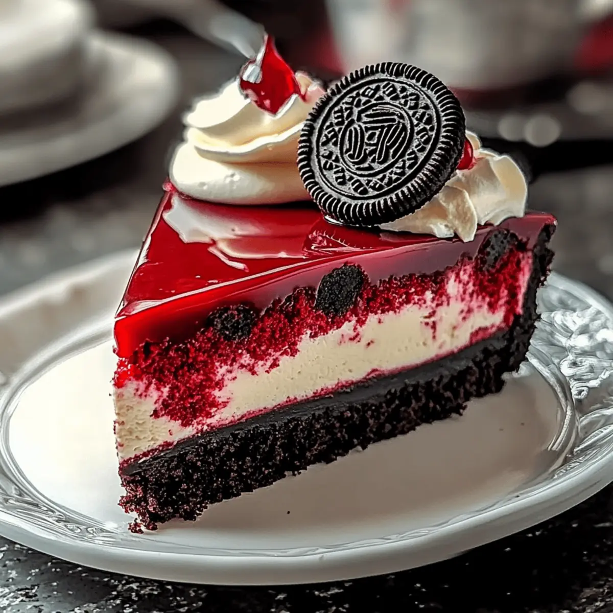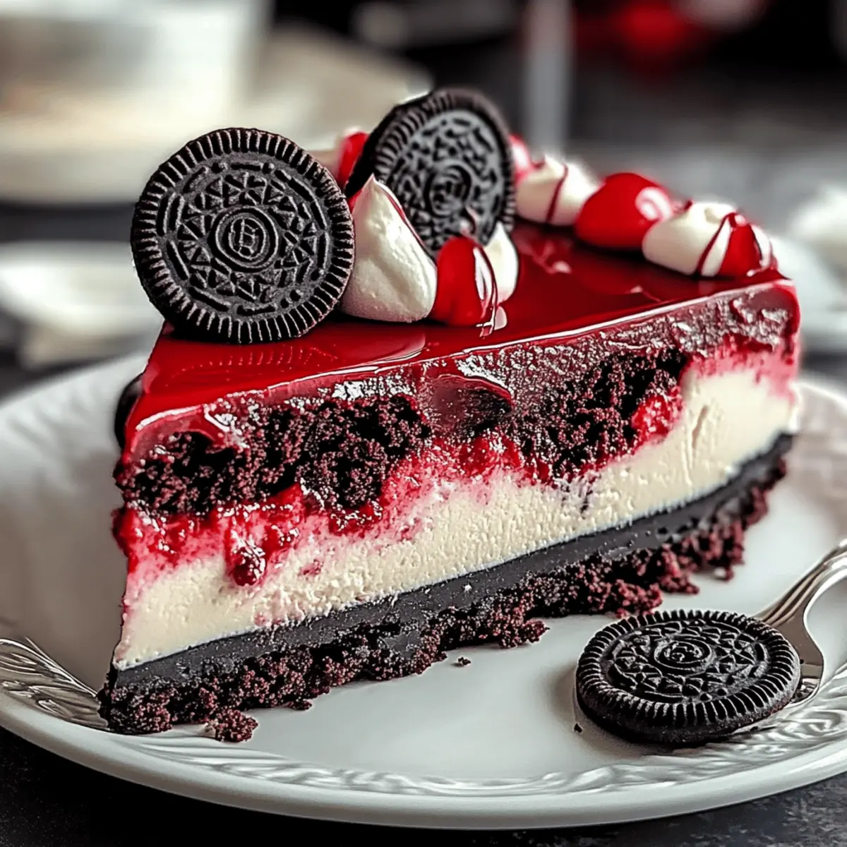 As I marveled at the deep crimson hue of my freshly baked Red Velvet Oreo Cheesecake, I couldn’t help but think about how this beauty is destined to steal the spotlight at any gathering. Combining the indulgent charm of red velvet cake with the creaminess of cheesecake, and then topped off with crunchy Oreo bits, each slice is a delightful celebration of flavors and textures. Not only is this show-stopping dessert a visual feast, but it’s also a breeze to prepare—perfect for those busy weekends when you want to wow friends and family without spending the whole day in the kitchen. Plus, it’s gluten-free, making it a thoughtful choice for everyone at the table. Are you ready to dive into this luscious world of chocolatey goodness? Why is this cheesecake a must-try? Decadent Delight: This Red Velvet Oreo Cheesecake is a stunning blend of flavors that will impress even the pickiest eaters. Easy to Prepare: With straightforward steps, it’s beginner-friendly yet provides an impressive result. Gluten-Free Option: A perfect dessert for all guests, accommodating those with gluten sensitivities. Crowd-Pleasing Appeal: Everyone loves the combination of silky cheesecake and crunchy Oreo bits—it’s guaranteed to bring smiles! Make Ahead: Prep it a day in advance, allowing you to enjoy your gathering without stress. Versatile Variations: Experiment by using different cookie crusts or adding unique toppings, making it your own! Red Velvet Oreo Cheesecake Ingredients For the Crust Oreo Cookies – Crushed to create a chocolatey, crunchy crust; swap for chocolate wafer cookies for a twist. Butter – Melted to bind the crust together; you can use coconut oil for a dairy-free alternative. For the Cheesecake Filling Cream Cheese – At room temperature to ensure a smooth, creamy texture; essential for the rich base. Granulated Sugar – Sweetens the cheesecake; consider using brown sugar for a deeper sweetness. Cocoa Powder – Dutch-processed is preferred for an enhanced chocolate flavor. Red Food Coloring – Gives the cheesecake its signature vibrant hue; gel coloring works best for brightness. Eggs – Room temperature eggs are key to creating a rich, cohesive filling. Sour Cream – Adds tanginess and creaminess; Greek yogurt can be used as a substitute. Heavy Cream – For a luxuriously rich filling; can be omitted if you want a lighter texture. Vanilla Extract – Enhances all the flavors; optional, but highly recommended for depth. Vinegar – Adds acidity for a well-balanced cheesecake; lemon juice is a good alternative. Enjoy creating your very own Red Velvet Oreo Cheesecake, a treat that’s sure to impress! Step‑by‑Step Instructions for Red Velvet Oreo Cheesecake Step 1: Preheat the Oven Begin by preheating your oven to 325°F (163°C). This ensures the temperature is just right for baking the cheesecake. While the oven heats up, grab your 9-inch springform pan and prepare to make the crust. Step 2: Make the Oreo Crust Crush 24 Oreo cookies into fine crumbs, either in a food processor or using a zip-top bag and a rolling pin. Mix these crumbs with melted butter until fully combined. Press the mixture firmly into the bottom of your prepared springform pan, creating an even layer. Bake for 8–10 minutes until slightly set, then let it cool while you prepare the filling. Step 3: Prepare the Cheesecake Filling In a large mixing bowl, beat room temperature cream cheese with an electric mixer until smooth and creamy, about 2 minutes. Gradually add in granulated sugar, cocoa powder, vanilla extract, vinegar, and red food coloring. Mix until everything is thoroughly combined and there are no lumps visible, forming a rich, velvety mixture that defines your Red Velvet Oreo Cheesecake. Step 4: Incorporate the Eggs and Cream Add the room temperature eggs one at a time, mixing gently after each addition just until combined. Be careful not to overmix at this stage to prevent air bubbles that can crack the cheesecake. Then, fold in sour cream and heavy cream until the filling is smooth; finish by mixing in some chopped Oreo pieces for a delightful crunch. Step 5: Assemble the Cheesecake Pour the smooth cheesecake batter over your cooled Oreo crust, spreading it evenly with a spatula. For added flair, dollop some leftover cream cheese mixture on top and use a knife to gently swirl it into the filling to create a marbled effect. This adds visual interest to your Red Velvet Oreo Cheesecake. Step 6: Create a Water Bath Wrap the bottom of the springform pan tightly with aluminum foil to prevent water from seeping in. Place the pan inside a larger baking dish and carefully fill the outer pan with hot water until it reaches halfway up the sides of the springform. The water bath will help maintain moisture and prevent cracking during baking. Step 7: Bake the Cheesecake Carefully place the entire setup in your preheated oven and bake for 55–65 minutes. The edges should be set, while the center remains slightly jiggly. Once time is up, turn off the oven, crack the door open slightly, and let the cheesecake cool in the oven for one hour—this gradual cooling helps to prevent cracks. Step 8: Chill and Serve After cooling, remove the cheesecake from the oven and the water bath. Refrigerate for at least 6 hours—preferably overnight—to allow it to firm up completely. When ready to serve, carefully release the cheesecake from the springform pan and slice it into beautiful pieces. Your Red Velvet Oreo Cheesecake is now ready to impress everyone! What to Serve with Red Velvet Oreo Cheesecake As you prepare to indulge in a slice of this delightful dessert, think about enhancing your gathering with perfect pairings that elevate your taste experience. Fresh Berries: The tartness of strawberries or raspberries adds a refreshing contrast, balancing the richness of the cheesecake beautifully. Whipped Cream: Light and airy, this classic topping complements the dense cheesecake, offering a lovely contrast in t