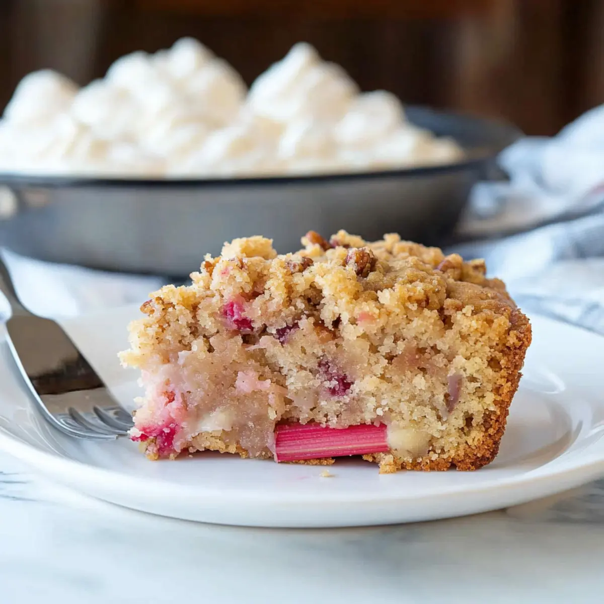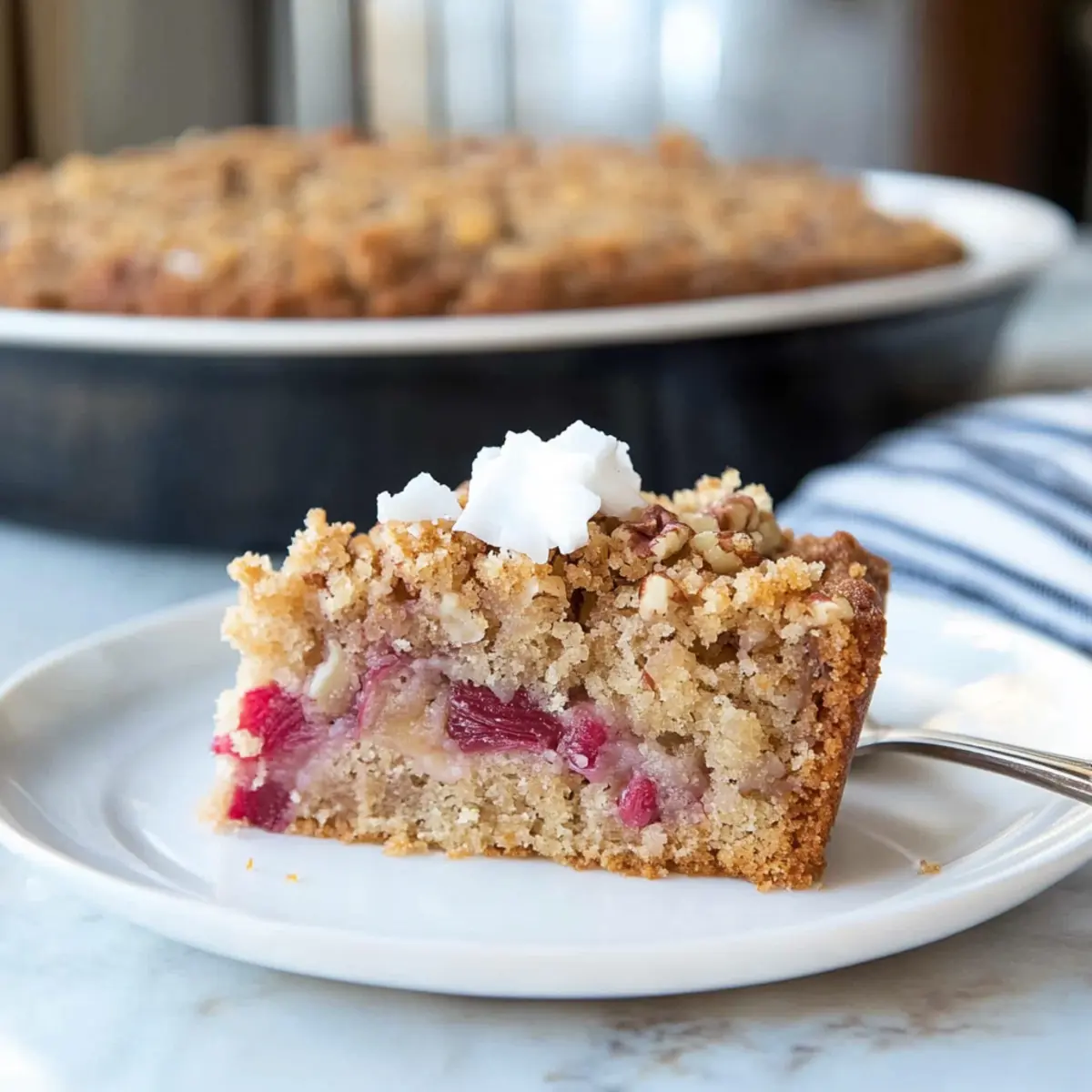 With the first signs of spring, I find myself drawn to the farmer’s market, where vibrant stalks of rhubarb beckon me to create something special. This Old-Fashioned Rhubarb Cake with Pecan-Coconut Crumble is the perfect way to celebrate the season! Not only does this delightful dessert bring a blend of tangy rhubarb and rich toppings together, but it also offers a comforting, homey vibe that makes it an instant crowd-pleaser. Whether you’re hosting a potluck or simply looking to enjoy a slice with afternoon tea, this cake is a fabulous choice. Plus, the crunchy pecan and coconut topping adds an irresistible twist that elevates this classic recipe. Are you ready to dive into the exciting world of rhubarb baking? Let’s get started! Why is Rhubarb Cake a Must-Bake? Spring Delight: This Rhubarb Cake captures the essence of the season, with its vibrant tang and comforting textures. Old-Fashioned Charm: The classic recipe brings nostalgia, perfect for family gatherings or casual afternoon snacks. Easy Preparation: Simple steps make it accessible, even for novice bakers. Versatile Toppings: Feel free to customize with alternatives, like almonds instead of pecans. Crowd-Pleaser: Share it at potlucks or with friends over tea—the flavors are sure to impress! Enjoy with a dollop of whipped cream for the ultimate treat! Rhubarb Cake Ingredients For the Cake • ¾ cup brown sugar – Sweetness and moisture; substitution: can use light or dark brown sugar for varying flavors. • ½ cup granulated sugar – Additional sweetness. • ½ cup butter (softened) – Adds richness and flavor; substitution: can use margarine or vegan butter for a dairy-free option. • 1 egg – Provides structure and moisture; note: can be replaced with ¼ cup applesauce for a vegan version. • 1 teaspoon vanilla extract – Enhances flavor depth. • 1 cup buttermilk – Contributes to cake tenderness; note: substitute with homemade buttermilk (1 tablespoon vinegar + fill with milk to 1 cup line). • 2 cups all-purpose flour – Main structure of the cake. • 1 teaspoon baking soda – Acts as a leavening agent. • ½ teaspoon salt – Balances sweetness and enhances flavor. • 2 cups chopped rhubarb – Key ingredient, provides tanginess. For the Topping • ½ cup sugar – Sweetness for the crumble. • 3 tablespoons cold butter – Adds richness and texture. • ¼ teaspoon cinnamon – Adds warmth and spice. • ½ cup shredded coconut – Provides texture and flavor. • ½ cup chopped pecans – Adds crunch and nutty flavor. To Serve • Whipped cream or Cool Whip – Creamy contrast to the cake’s texture. This delightful Rhubarb Cake is perfect for welcoming spring and sharing with loved ones! Step‑by‑Step Instructions for Rhubarb Cake Step 1: Preheat Your Oven Begin by preheating your oven to 350°F (175°C). While the oven warms up, generously grease a 13×9 inch baking pan with butter or non-stick spray to ensure easy release after baking. This preparation step is crucial for a perfectly baked Rhubarb Cake that doesn’t stick to the pan. Step 2: Cream Butter and Sugars In a large mixing bowl, combine ½ cup softened butter, ¾ cup brown sugar, and ½ cup granulated sugar. Using an electric mixer, beat the mixture on medium speed until it becomes light and fluffy, which should take about 3-5 minutes. This airy base is essential for a moist and tender Rhubarb Cake. Step 3: Incorporate Egg and Vanilla Add 1 egg and 1 teaspoon of vanilla extract to the creamed butter and sugar mixture. Continue mixing until the ingredients are well combined and the batter is smooth, which will take about a minute. This step infuses the cake with rich flavor, setting the stage for the delightful tanginess of the rhubarb. Step 4: Combine Dry Ingredients In a separate bowl, whisk together 2 cups all-purpose flour, 1 teaspoon baking soda, and ½ teaspoon salt. This combination of dry ingredients will provide the perfect structure for your Rhubarb Cake. Once mixed, gradually incorporate this dry mixture into the wet ingredients in the mixing bowl. Step 5: Mix Wet and Dry Ingredients Alternately add 1 cup of buttermilk and the dry mixture to the batter in the large bowl. Start with a third of the flour mix, then half of the buttermilk, and repeat until all ingredients are combined, stirring gently. Avoid overmixing, as this will ensure a tender crumb in your Rhubarb Cake. Step 6: Fold in Rhubarb Gently fold in 2 cups of chopped rhubarb using a spatula. Ensure the rhubarb is evenly distributed throughout the batter to maintain the cake’s lovely texture and flavor balance. This step will enhance the tartness of the cake, creating a delightful contrast with the sweetness of the topping. Step 7: Spread Batter in Pan Carefully pour the rhubarb batter into the prepared baking pan, spreading it evenly with a spatula. The batter should fill the pan right to the edges. This step is crucial for ensuring even baking and a consistent texture in your Rhubarb Cake. Step 8: Prepare the Topping In a bowl, mix together ½ cup of sugar, 3 tablespoons of cold butter, ¼ teaspoon of cinnamon, ½ cup of shredded coconut, and ½ cup of chopped pecans. Use your fingers or a pastry cutter to combine these ingredients until they form small, pea-sized clumps. This crunchy topping will add a delightful texture to your cake. Step 9: Top the Cake Evenly sprinkle the crumble mixture over the batter in the baking pan. Make sure it covers the entire surface, allowing the crunchy pecan and coconut topping to bake into the Rhubarb Cake, creating a sweet and textural contrast that elevates each slice. Step 10: Bake the Cake Place the cake in your preheated oven and bake for 45–50 minutes. Check for doneness by inserting a toothpick into the center; it should come out clean. This step ensures that your Rhubarb Cake is perfectly baked and ready to be enjoyed. Step 11: Cool and Serve Once baked, remove the cake from the oven and let it cool in the pa