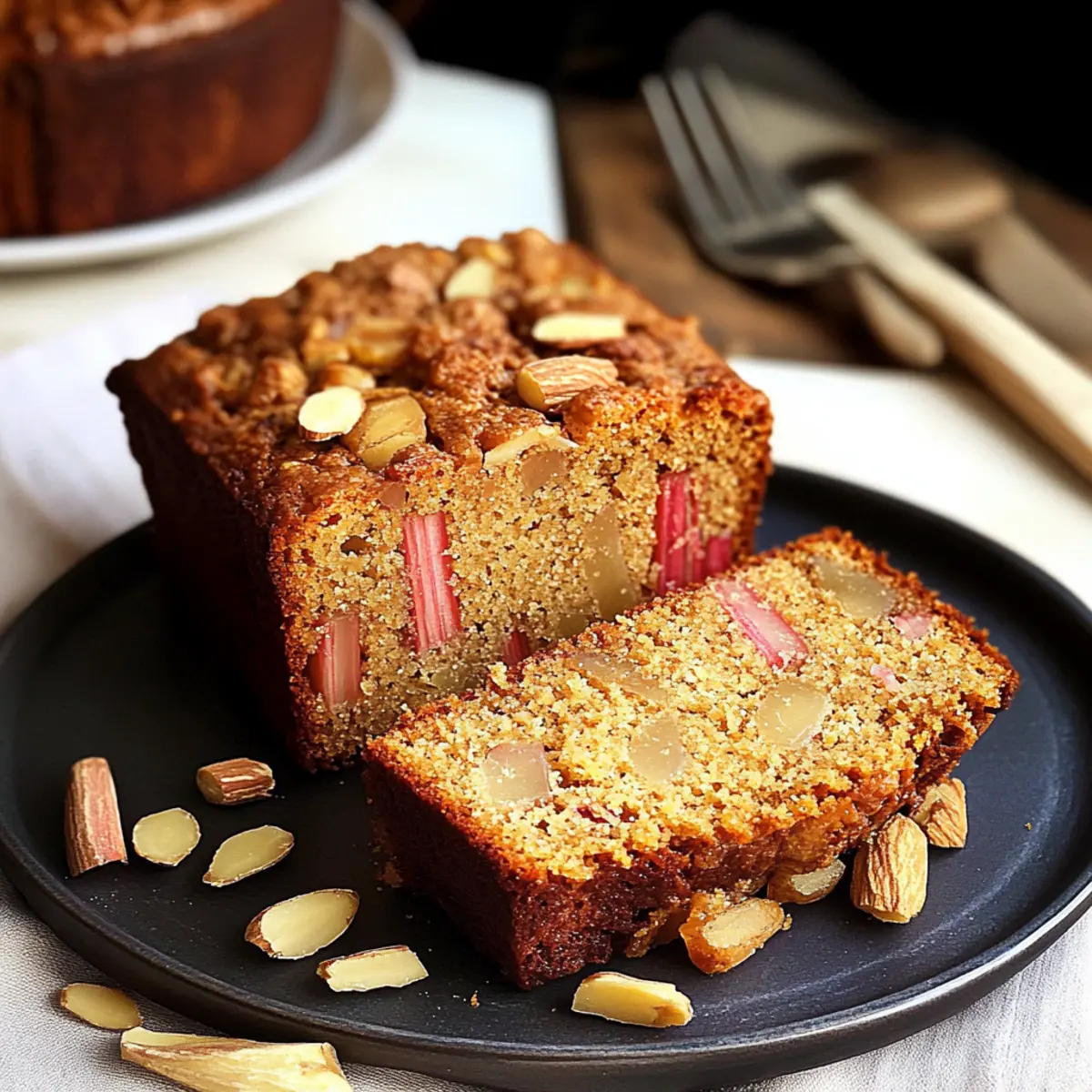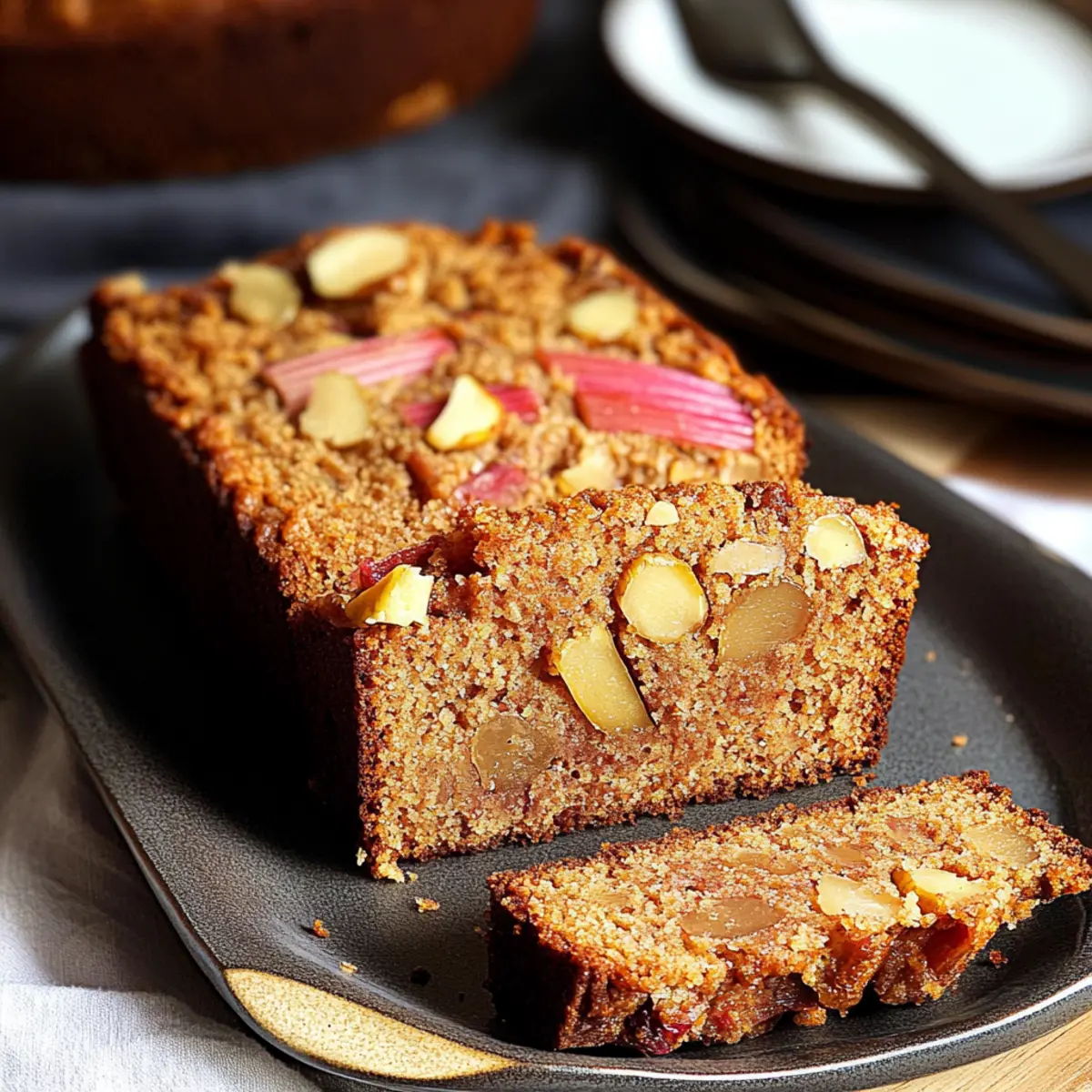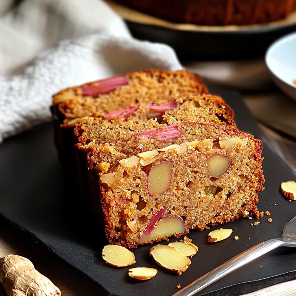 The tangy aroma of baking rhubarb & ginger cake fills the room, transporting me to a quaint British tea shop, where the charm lies not just in the setting but in the delightful flavors. This Easy Rhubarb & Ginger Loaf Cake is a perfect companion for those cozy afternoons, marrying tart rhubarb and warm crystallized ginger with the rich sweetness of dark brown Muscovado sugar. It’s wonderfully simple to prepare, making it an ideal choice for home bakers of all levels. Plus, with its moist texture paired with a crunchy almond topping, it’s a crowd-pleaser that brightens any snack time. Are you ready to embrace this delightful baking adventure? Why Is This Cake a Must-Bake? Simplicity: This recipe is easy to follow, perfect for home bakers of all skill levels. Rich Flavor: The combination of tart rhubarb and warm ginger creates a taste sensation that’s truly unique. Versatile: Whether enjoyed as a cozy afternoon tea treat or a delightful dessert, this loaf cake suits any occasion. Moist Texture: The dark brown Muscovado sugar keeps the cake wonderfully moist, while the almond topping adds a delightful crunch. Time-Saving: Ready in just under an hour, you can whip this up quickly, allowing more time to relax with a cup of tea. For something equally delightful, you might also enjoy my Blueberry Buttermilk Pancake casserole! Rhubarb & Ginger Cake Ingredients • For this delightful rhubarb & ginger cake, you’ll need simple yet flavorful ingredients that come together beautifully. For the Cake Rhubarb – 230 grams – Adds tartness and moisture to the cake. Substitution Note: Frozen rhubarb can be used if thawed first. Butter – 150 grams, softened – Creates a rich texture for the cake. Dark Brown Muscovado Sugar – 150 grams – Offers a caramel-like sweetness. Substitution Note: Light brown sugar can be used for a lighter flavor. Crystallised Stem Ginger – 30 grams, minced – Adds warmth and spice to elevate the taste. Substitution Note: Fresh ginger may provide a different flavor profile; use caution with quantity. Plain Flour – 150 grams – Forms the structure of the cake. Baking Powder – 2 teaspoons – Acts as a leavening agent, ensuring the cake rises properly. Eggs – 2 large – Bind ingredients together and help the cake rise. For the Topping Almonds – 30 grams, blanched and finely chopped – Provides a crunchy topping. Substitution Note: Can omit for nut-free versions; no direct replacement needed. Step‑by‑Step Instructions for Easy Rhubarb & Ginger Loaf Cake Step 1: Preheat and Prepare Baking Tin Begin by preheating your oven to 190°C (375°F). While it heats up, take a 1 lb loaf tin and thoroughly grease it with butter or non-stick spray, then dust it with flour. This preparation ensures that your Easy Rhubarb & Ginger Loaf Cake will release easily once baked, setting you up for a beautiful presentation. Step 2: Add Almonds to the Base Next, sprinkle the bottom of the greased loaf tin with the finely chopped almonds. This layer will create a delightful crunchy topping for your cake. Make sure the almonds are evenly distributed across the base for consistent texture and flavor around the loaf, ensuring each slice celebrates that irresistible almond crunch. Step 3: Cream Butter and Sugar In a large mixing bowl, combine the softened butter and dark brown Muscovado sugar. Use an electric mixer to cream them together for about 10 minutes until the mixture turns light and fluffy. This process incorporates air, resulting in a beautifully moist Easy Rhubarb & Ginger Loaf Cake. Watch for a pale color change as you mix, indicating it’s ready for the next step. Step 4: Incorporate Eggs Add the eggs to the creamy mixture one at a time, mixing well after each addition. If the batter looks slightly split, don’t worry; that’s okay. Each egg will help bind the mixture together nicely, making it easier to incorporate the subsequent ingredients smoothly while ensuring the cake rises perfectly during baking. Step 5: Stir in Ginger Gently fold in the minced crystallized stem ginger into the batter. The warm, spicy notes of ginger will harmonize beautifully with the tartness of the rhubarb. Use a spatula to ensure the ginger is evenly distributed, creating bursts of flavor throughout your loaf cake that will leave everyone craving more. Step 6: Combine Dry Ingredients Sift together the plain flour and baking powder in a separate bowl. Gradually fold this dry mixture into the wet batter. Be gentle to maintain the airiness you’ve created; overmixing can make the Easy Rhubarb & Ginger Loaf Cake dense. Stop mixing as soon as you see no dry flour to achieve that tender crumb texture you desire. Step 7: Fold in Rhubarb Now, gently fold in the chopped rhubarb until it is evenly combined into the batter. This step is crucial, as the rhubarb provides moisture and a delightful tang. Take your time to ensure no large clumps remain, allowing that distinctive rhubarb flavor to shine through in each slice of your loaf cake. Step 8: Transfer to Loaf Tin Once everything is nicely mixed, transfer the batter to your prepared loaf tin. Use a spatula to smooth the top, ensuring an even surface for baking. This step helps it rise uniformly while baking, allowing you to achieve that perfect loaf shape that’s visually appealing and satisfying to serve. Step 9: Bake to Perfection Place the loaf tin in the preheated oven and bake for 48-50 minutes. The cake is ready when a skewer inserted into the center comes out clean, and it springs back lightly when touched. Keep an eye on it during the last few minutes; the aroma of the Easy Rhubarb & Ginger Loaf Cake will fill your kitchen, signaling its delicious readiness. Rhubarb & Ginger Cake Variations Let your creativity flow as you customize this delightful cake to suit your tastes! Nut-Free: Omit the almonds altogether for a nut-free version while maintaining texture with a touch of extra sugar on top. Berries: Swap in fresh or frozen berri