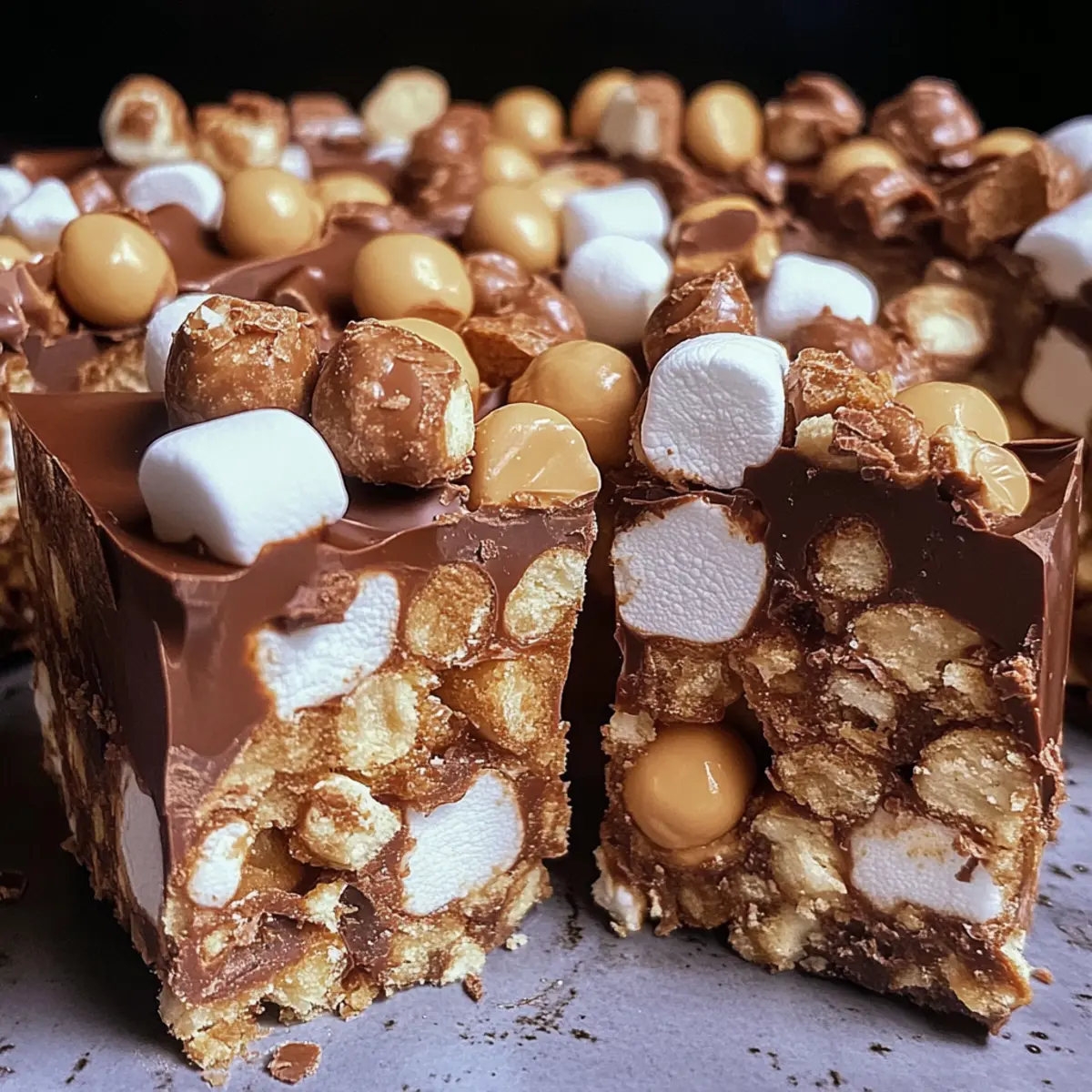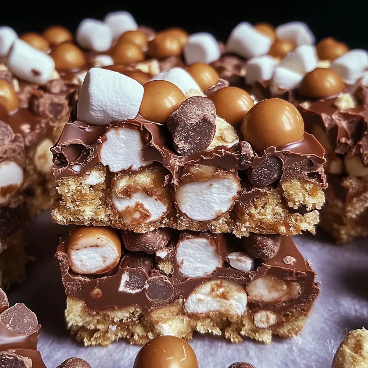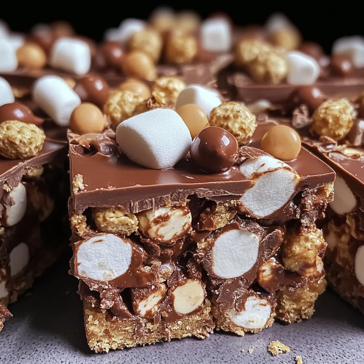 As I unwrapped the vibrant package of Maltesers, an irresistible urge to create something extraordinary washed over me. Enter the No-Bake Maltesers Rocky Road Bars – a heavenly treat that marries rich dark and milky chocolate with the delightful crunch of biscuits and the softness of marshmallows. This recipe is not only a swift endeavor, taking just around 30 minutes of your time, but it’s also a guaranteed showstopper that will have your family and friends coming back for seconds. Perfect for gatherings or cozy nights in, these bars are your new go-to for a delicious crowd-pleaser. Why not give in to your sweet cravings and make a batch today? What special twist will you add to your Rocky Road Bars? Why are Rocky Road Bars so delightful? Simplicity, these bars require no baking, making them perfect for anytime cravings. Rich Flavor from the combination of dark and milk chocolate creates an indulgent treat. Crowd-Pleaser status is guaranteed—who can resist that delightful mix of crunchy biscuits and chewy marshmallows? Versatile by nature, you can easily customize them with added nuts or different chocolates. Quick to Prepare, ready in about 30 minutes, they are a perfect solution for any last-minute dessert need. Why not pair them with a scoop of vanilla ice cream for an extra treat, just like with my Soft Baked Bars or serve alongside a slice of Peach Crumble Bars for a comforting dessert duo? Rocky Road Bars Ingredients • Whip up these irresistible Rocky Road Bars with simple ingredients you’ll love! For the Base Butter – Adds richness and helps bind ingredients; use unsalted for better flavor control. Golden Syrup – Provides sweetness and moisture; corn syrup is a fine substitute if needed. Dark Chocolate – Contributes a rich flavor base; go for high-quality chocolate for the best experience. Milk Chocolate – Balances the bitterness of dark chocolate with its creamy sweetness. Fillings Malted Milk Biscuits – Offer a delightful crunch and texture; graham crackers work well as a substitute. Mini Marshmallows – Bring chewiness and sweetness; opt for gelatine-free for a vegetarian-friendly option. Maltesers – The star of the show! These chocolate-coated candies provide a delightful crunch; feel free to swap with similar treats. Step‑by‑Step Instructions for Rocky Road Bars Step 1: Prepare the Tin Start by lining an 8-inch square tin with baking paper, ensuring you leave some overhang for easier removal later. Lightly grease the paper with butter to prevent sticking. This will be the foundation for your Maltesers Rocky Road Bars, so make sure it’s set up nicely before moving on to the delicious mixture. Step 2: Melt Ingredients In a medium saucepan, combine the butter, golden syrup, dark chocolate, and milk chocolate. Place the pan over low heat, gently stirring continuously until everything is melted and well combined, forming a silky chocolate mixture. This should take about 5–7 minutes. Once melted, remove from heat and let it cool for 10 minutes. Step 3: Mix Fillings While the chocolate mixture is cooling, take a large mixing bowl and add the broken malted milk biscuits, mini marshmallows, and the cherished Maltesers. Gently combine these ingredients, making sure they are evenly distributed. The combination of textures in this step will set the stage for your indulgent Rocky Road Bars. Step 4: Combine Mixtures Pour two-thirds of the cooled chocolate mixture over the biscuit and marshmallow combination. Stir it gently until all the pieces are well-coated with the rich chocolate, which will help bind everything together. This is the moment your Rocky Road Bars start to come alive with flavor and texture. Step 5: Set in Tin Transfer the coated mixture into your prepared tin, pressing it down with a spatula to ensure it’s compact and smooth. Fill any gaps with the remaining chocolate mixture, drizzling it generously over the top. Tap the tin lightly on the countertop to remove any air bubbles and create a snug fit for the bars. Step 6: Decorate To add a personal touch to your Maltesers Rocky Road Bars, scatter extra Maltesers on top. For a decorative flair, press some of them in half into the mixture. This not only enhances the presentation but also guarantees a delightful chocolatey bite in every piece. Step 7: Chill Place your creation in the refrigerator and allow it to chill for at least 3-4 hours or overnight if you can resist. This chilling time is crucial for setting the bars firm, ensuring you achieve those perfect clean cuts when you’re ready to slice them up. Step 8: Slice and Store Once set, remove the Rocky Road Bars from the tin using the overhang of the parchment paper. Use a sharp knife to cut them into squares or rectangles, making sure to wipe the knife between cuts for clean edges. Store any leftovers in an airtight container at room temperature for up to two weeks—if they last that long! Storage Tips for Rocky Road Bars Room Temperature: Store your Rocky Road Bars in an airtight container at room temperature for up to 1-2 weeks. This will help retain their deliciously chewy texture. Refrigeration: For a firmer texture, refrigerate the bars, where they can stay fresh for up to 3 weeks. Just make sure they are tightly sealed to prevent them from drying out. Freezing: If you want to save some for later, wrap individual bars in plastic wrap and place them in a freezer-safe container. They can be frozen for up to 3 months. Thawing: When ready to enjoy, simply remove from the freezer and let the Rocky Road Bars thaw at room temperature for about 15-20 minutes before serving. What to Serve with No-Bake Maltesers Rocky Road Treats Satisfy your sweet tooth with a decadent spread of delicious options that will elevate your dessert experience. Vanilla Ice Cream: The creamy texture complements the chewy Rocky Road Bars beautifully, balancing rich flavors with a refreshing chill. Chocolate Sauce: Drizzling warm chocolate sauce on top adds an ex