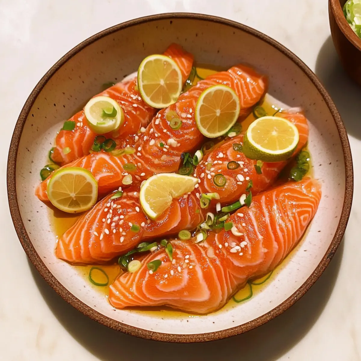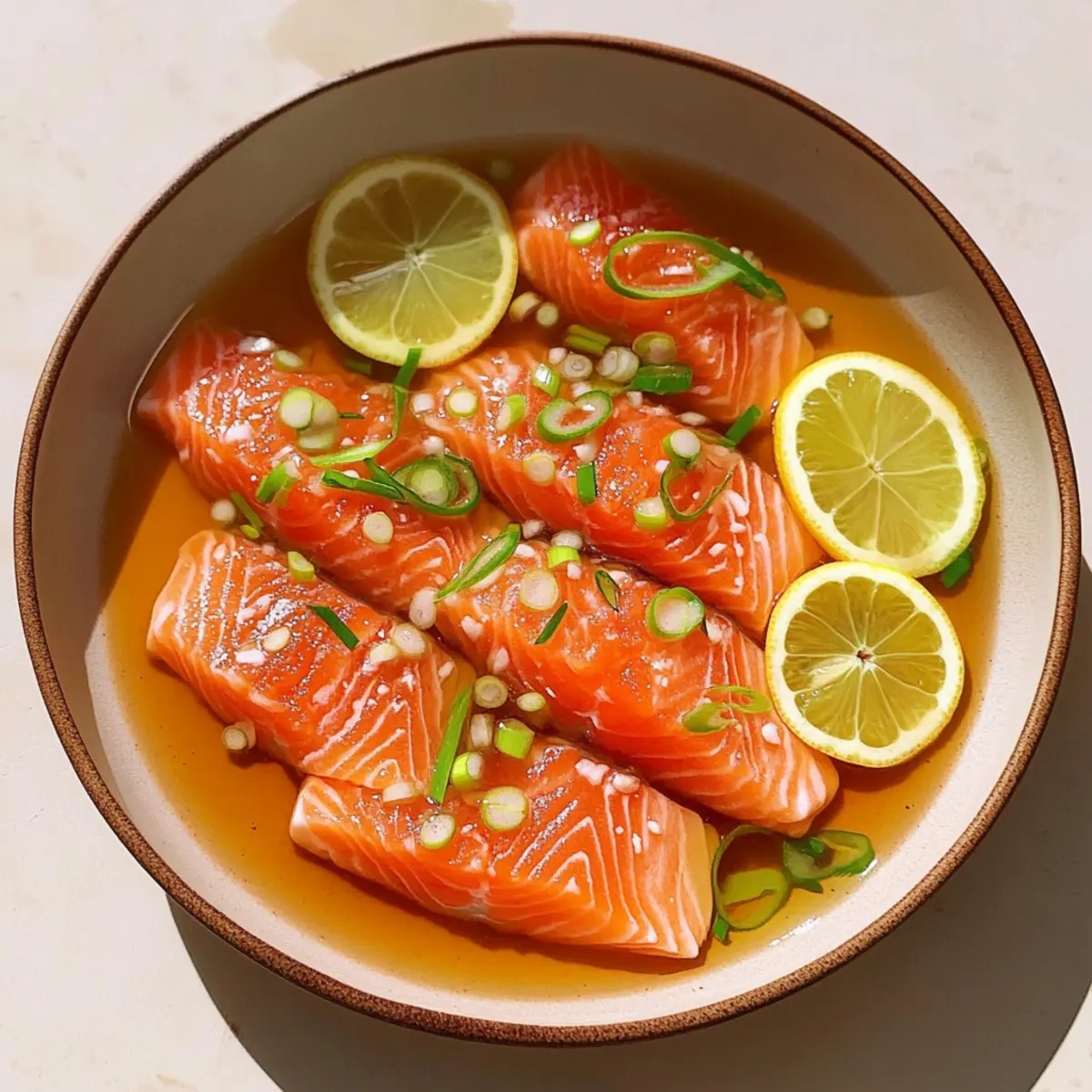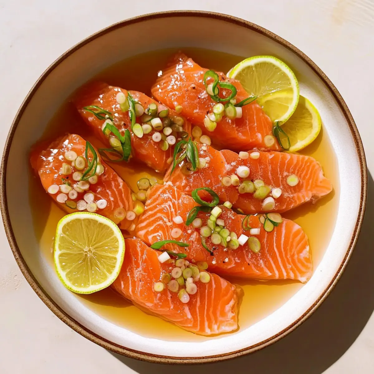 It was one of those evenings when a light, vibrant dinner was just what I craved—nothing heavy, just fresh ingredients and delightful flavors. That’s when I stumbled upon the idea for this Citrus Soy Salmon Crudo. With absolutely no cooking involved, this recipe is not only a show-stopper, but it’s also gluten-free, making it perfect for everyone at your table. The silky texture of sushi-grade salmon paired with a zesty citrus soy dressing creates a balance that’s simply irresistible, and it all comes together in just minutes. Whether you’re hosting a gathering or enjoying a quiet meal at home, this elegant appetizer will leave everyone feeling satisfied and impressed. Ready to elevate your dinner game? Let’s dive in! Why is Salmon Crudo So Special? Freshness is key: Using sushi-grade salmon means your dish will burst with flavor and texture. No Cooking Needed: This recipe saves time and hassle, making it ideal for busy weeknights or last-minute gatherings. Versatile Garnish Options: You can dress it up with microgreens or edible flowers, allowing you to customize presentation. Crowd-Pleaser: Perfect as an appetizer, this dish impresses guests and pairs beautifully with other fresh recipes like Grilled Shrimp Bowl or Zucchini Feta Basil. Delightfully Light: With only 175 calories per serving, you can indulge without guilt! This is the perfect addition to your culinary repertoire. Salmon Crudo with Citrus Soy Ingredients • Elevate your appetizer game with these fresh ingredients. For the Crudo Raw Salmon – Choose sushi-grade salmon for safety and a rich, buttery flavor. Shallot – Finely minced to introduce a subtle onion sweetness; green onions are a nice, milder substitute. Extra Virgin Olive Oil – Adds a luscious richness and balances out the tangy flavors; opt for high-quality for the best results. For the Dressing Lemon Juice – Brightens the dish with acidity and freshness; you can also use extra lime juice if needed. Lime Juice – Contributes zesty notes that harmonize beautifully with salmon; feel free to replace it completely with lemon juice. Soy Sauce – Provides umami depth; tamari works as a great gluten-free alternative. For Garnish Scallions or Chives – Fresh herbs add a touch of color and bright flavor; slice them thinly for a beautiful presentation. Micro-Greens or Edible Flowers – Elevate your dish with these stylish touches for added visual appeal. Flaky Salt – A sprinkle at the end intensifies flavor, enhancing the crudo experience. Let these vibrant, fresh ingredients shine in your Salmon Crudo with Citrus Soy! Step‑by‑Step Instructions for Salmon Crudo with Citrus Soy Step 1: Mince the Shallot Begin by finely mincing the shallot, ensuring the pieces are small enough to blend seamlessly into the dressing. This will take about 3-5 minutes. Keep an eye on your knife technique for even pieces, as this will enhance the flavor without overwhelming the dish. Set the minced shallot aside in a small bowl while you prepare the citrus juices. Step 2: Juice the Citrus Juice one lemon and one lime into a medium bowl, aiming for about 3 tablespoons of each. You can use a citrus juicer or simply squeeze by hand, removing any seeds that may fall in. This process should take around 5 minutes, and the citrus juice will add brightness and acidity to your Salmon Crudo with Citrus Soy. Make sure to combine the two juices well for a balanced flavor. Step 3: Slice the Salmon If your salmon isn’t pre-sliced, carefully slice the sushi-grade salmon against the grain into ¼-inch thick pieces. Use a very sharp knife for the best results, allowing a clean cut and preventing any tearing. Spend about 5-7 minutes on this step. Arrange the thin slices aesthetically on a serving plate for a beautiful presentation once the dish is assembled. Step 4: Whisk Together the Dressing In the bowl with the citrus juices, add the minced shallot and soy sauce. Whisk everything together until well combined, which should take about a minute. This citrus soy dressing provides a zesty, umami kick to your Salmon Crudo and will enhance each bite of salmon. Taste the dressing and adjust if necessary—feel free to add a hint of sweetness with honey or agave if desired. Step 5: Drizzle Olive Oil On the same serving plate you arranged the salmon, drizzle 1 tablespoon of extra virgin olive oil evenly over the fish. This adds richness and helps balance the bright citrus flavors. The olive oil should glisten on the salmon slices, creating an inviting appearance. Take about a minute to complete this step so that every piece gets a delicious coating. Step 6: Add More Olive Oil Next, drizzle an additional tablespoon of olive oil over the salmon slices to enhance both texture and flavor. The olive oil will enrich the dish and help the citrus soy dressing stick well. In just about a minute, your Salmon Crudo with Citrus Soy will start to look delectable with a shiny finish, inviting everyone to dig in. Step 7: Pour the Citrus Soy Dressing Pour the citrus soy dressing carefully around the salmon pieces rather than directly on top, allowing the flavors to mingle without overwhelming the delicate fish. Aim to coat the plate with the dressing for both flavor and aesthetic appeal. This will take about a minute—watch as the colorful dressing cascades around the salmon, creating an eye-catching presentation. Step 8: Garnish and Serve Finally, garnish your Salmon Crudo with sliced scallions, chives, or micro-greens for added color and freshness. Finish with a sprinkle of flaky salt to elevate the flavors even further. This step will take you about 2-3 minutes, and once complete, serve the dish immediately to enjoy the maximum flavor and freshness of your beautiful Salmon Crudo with Citrus Soy. Make Ahead Options These Salmon Crudo with Citrus Soy dressing are perfect for meal prep enthusiasts! You can slice the sushi-grade salmon and keep it well-wrapped in the refrigerator for up to 24 hours before 