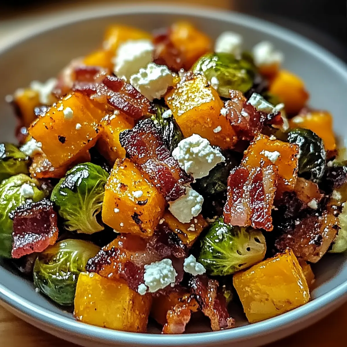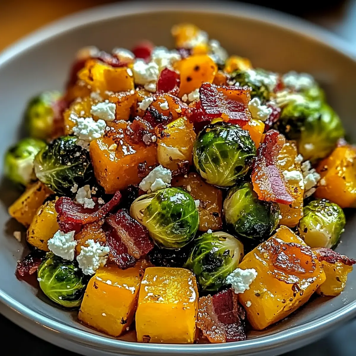 As I pulled open the fridge, a forgotten bag of Brussels sprouts stared back at me—an unexpected culinary challenge! This moment sparked my creativity and led to these Savory Honey-Glazed Brussels Sprouts and Butternut Squash, a dish that’s not just a feast for the eyes but also a tantalizing delight for your taste buds. The quick prep time makes it perfect for those busy weeknights when you want something nourishing yet packed with flavor. Plus, it’s easily adaptable for various diets—swap out bacon for smoked tempeh if you’re going vegetarian! Ready to savor the rich fusion of superfoods, cranberries, and feta? Let’s dive in! Why are Savory Honey-Glazed Brussels Sprouts a Must-Try? Irresistible Flavor Combo: The sweet honey glaze paired with the saltiness of bacon and creaminess of feta creates a mouthwatering masterpiece. Quick & Easy Prep: With just a few simple steps, you’ll have a delicious side ready in under 30 minutes, perfect for your busy nights. Versatile Dish: Whether you’re a meat-lover or need a vegetarian option, this dish adapts effortlessly—consider swapping bacon for smoked tempeh for an equally satisfying finish. Nutrient-Rich Ingredients: Packed with vitamins from Brussels sprouts and butternut squash, each bite offers health benefits without sacrificing flavor. Crowd-Pleasing Appeal: Serve it at gatherings, and watch it disappear, making it a standout choice that everyone will love, just like my favorite savory chicken piccata meatballs! Savory Honey-Glazed Brussels Sprouts Ingredients • Dive into the deliciousness of Savory Honey-Glazed Brussels Sprouts with these carefully curated ingredients! For the Vegetables Brussels Sprouts – Halved; provides a robust, slightly bitter base that caramelizes beautifully when roasted. Butternut Squash – Peeled and cubed; adds natural sweetness and creamy texture, but sweet potatoes can be used for an even sweeter profile. For the Glaze Olive Oil – Extra virgin for flavor; helps in achieving that perfect caramelization on the veggies. Honey – For glaze; contributes a delightful sweetness and a glossy finish that enhances the overall dish. Salt – To taste; enhances the natural flavors of the vegetables and balances the sweetness of honey. Pepper – To taste; adds warmth and depth to the dish. For the Add-Ins Bacon – Cooked and crumbled; offers a salty, savory crunch, but can be omitted for a vegetarian version—substitute with smoked tempeh for flavor. Dried Cranberries – Adds a tangy sweetness and chewy texture; feel free to swap in raisins if cranberries aren’t available. Feta Cheese – Crumbled on top; provides a creamy, tangy richness that complements all the ingredients, or try goat cheese for a different twist! Step‑by‑Step Instructions for Savory Honey-Glazed Brussels Sprouts Step 1: Preheat the Oven Begin by preheating your oven to 400°F (200°C). This step is crucial for achieving perfectly roasted Savory Honey-Glazed Brussels Sprouts and Butternut Squash. While the oven warms, line a baking sheet with parchment paper to prevent sticking and make cleanup easier. Your baking sheet should be ready for the festive flavors to come! Step 2: Prepare the Vegetables In a large mixing bowl, toss together the halved Brussels sprouts and cubed butternut squash with extra virgin olive oil, honey, salt, and pepper. Coat everything evenly to ensure that each piece of the vegetables will develop that irresistible glaze. The mixture should glisten, showcasing the vibrant colors of the veggies as they await their transformation. Step 3: Roast the Vegetables Spread the prepared Brussels sprouts and butternut squash evenly onto the lined baking sheet, ensuring they are in a single layer for optimal roasting. Place them in the preheated oven and roast for 25-30 minutes. Halfway through this time, flip the vegetables with a spatula to promote even cooking and achieve a caramelized exterior. Step 4: Mix in Add-Ins Carefully remove the baking sheet from the oven once the veggies are tender and golden, and immediately mix in the crumbled bacon and dried cranberries. The warmth from the roasted vegetables will help plump the cranberries, adding a delightful chewiness. Stir gently to combine these add-ins for an explosion of flavors in your Savory Honey-Glazed Brussels Sprouts. Step 5: Add Feta and Serve Finally, sprinkle crumbled feta cheese over the warm roasted vegetables for a creamy, tangy finish. The feta will soften slightly upon contact with the heat, enhancing the dish’s flavor profile. Serve the Savory Honey-Glazed Brussels Sprouts immediately for the best taste experience, and enjoy a dish that’s sure to impress at any table! Expert Tips for Savory Honey-Glazed Brussels Sprouts Uniform Cutting: Ensure vegetables are cut into similar sizes for even roasting and caramelization, enhancing the flavorful experience of your Savory Honey-Glazed Brussels Sprouts. Bacon Baking: Cook bacon on a separate tray to avoid mess and ensure crispy results. This way, you can focus on perfectly roasting your veggies without distraction. Cooling Before Feta: Allow the roasted vegetables to cool slightly before adding feta. This helps maintain the cheese’s texture and prevents it from becoming too melty. Taste Testing: Always taste your dish before serving. Since salt levels can vary between bacon and feta, adjust seasoning accordingly to achieve the perfect balance of flavors. Ingredient Substitutions: Don’t hesitate to swap ingredients to suit your dietary preferences. For a vegetarian version, smoked tempeh or paprika can bring depth to your Savory Honey-Glazed Brussels Sprouts! What to Serve with Honey-Glazed Brussels Sprouts and Butternut Squash? Creating a memorable meal is all about balance, and these delightful Brussels sprouts provide the perfect opportunity for tasty pairings! Roasted Chicken: Juicy and succulent, roasted chicken adds a savory richness that complements the honey-glazed sweetness b