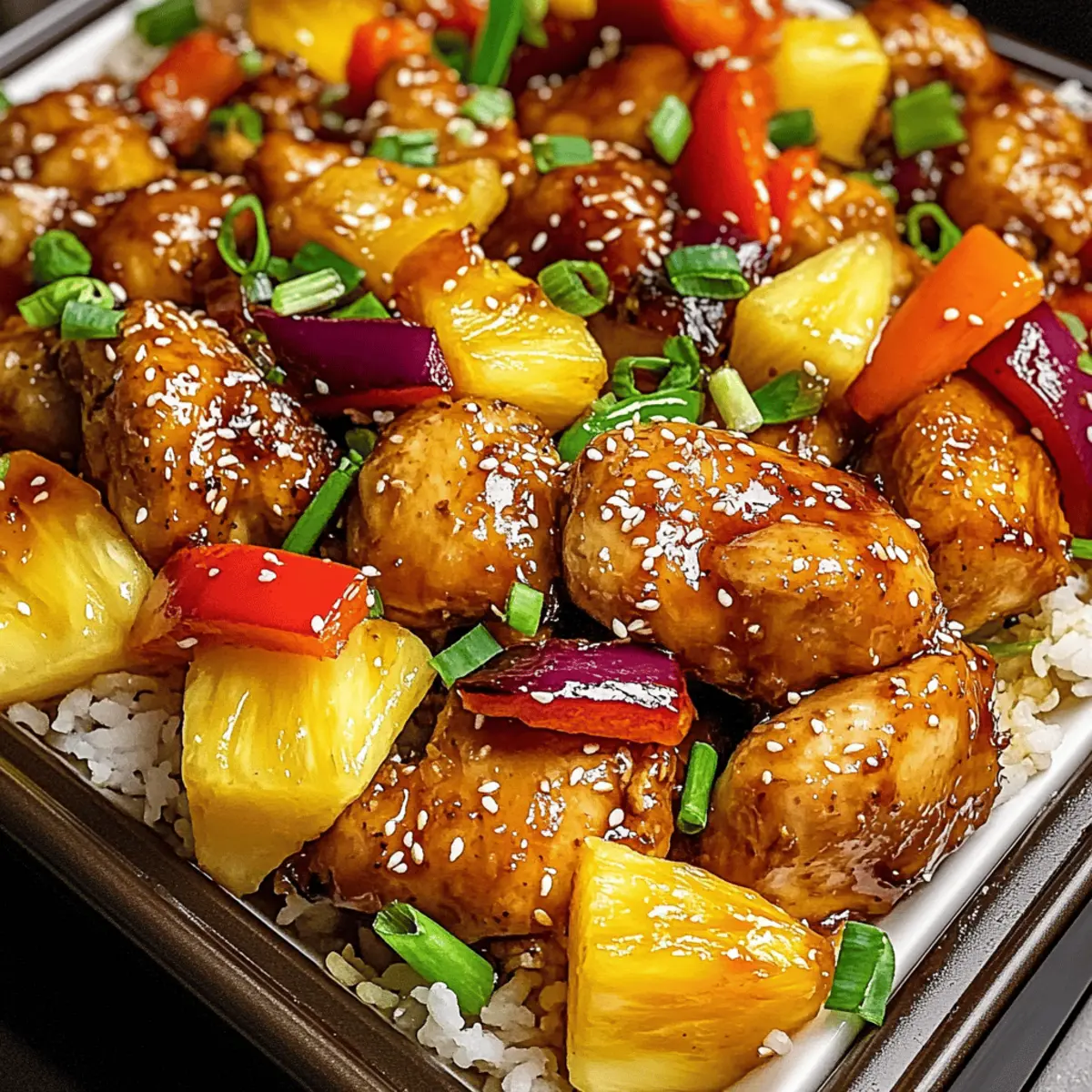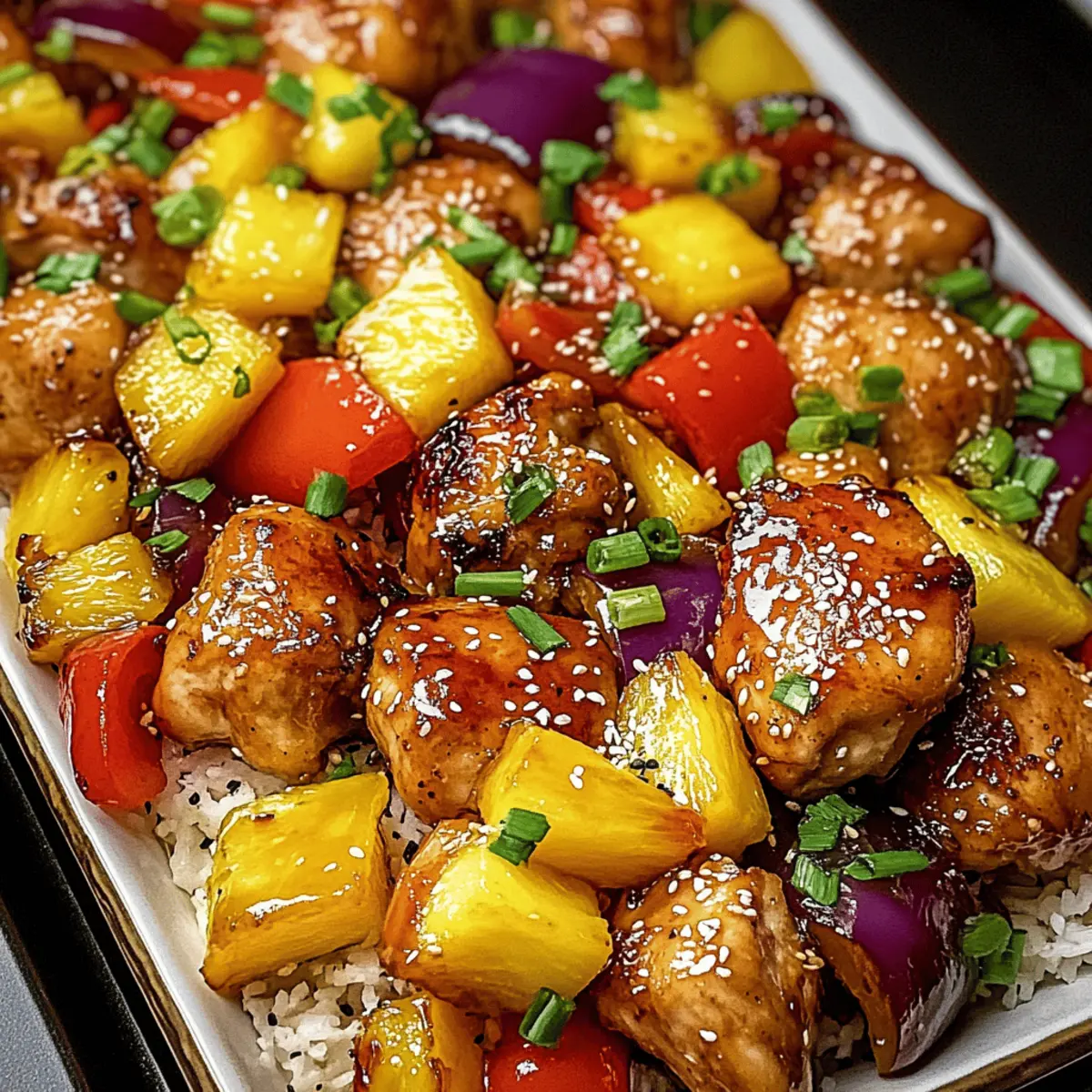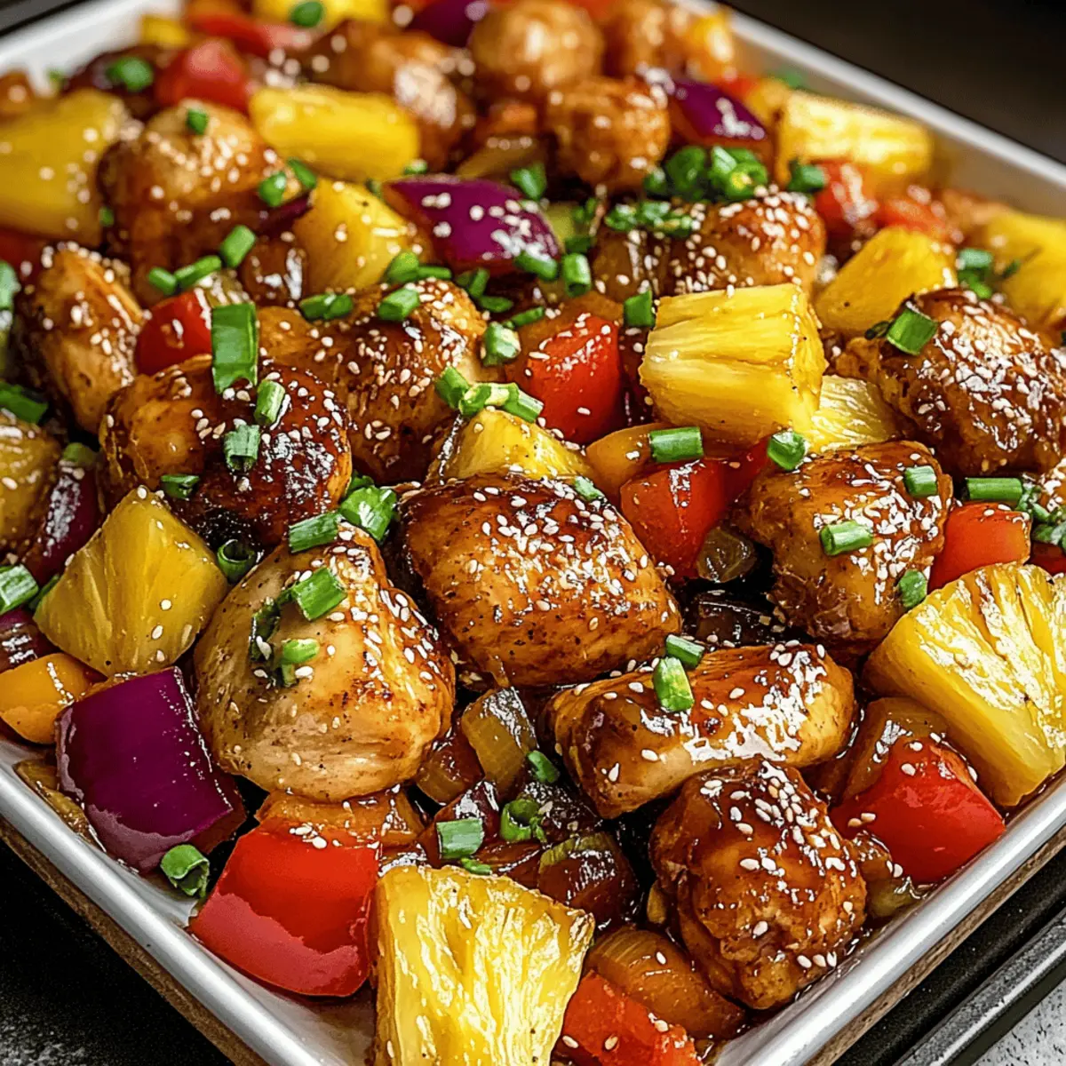 As I pulled the warm, fragrant dish from the oven, a symphony of sweet and savory aromas enveloped my kitchen. This Sheet Pan Teriyaki Chicken and Pineapple recipe captures the essence of a tropical getaway right on your dinner table. It’s the perfect solution for those busy weeknights when you crave something homemade but don’t want to sacrifice flavor or wellness. With just a handful of ingredients and minimal cleanup, you’ll impress family and friends alike while keeping your weeknight meals stress-free. Plus, this easy recipe is easily adaptable for different tastes, ensuring everyone at your table feels satisfied. Are you ready to transform your weeknight dinners with this delightful dish? Why Choose Sheet Pan Teriyaki Chicken? Ease of Preparation: This sheet pan meal is a game-changer for busy days, requiring minimal assembly and just one pan for cooking! Flavor Explosion: The blend of teriyaki sauce and fresh pineapple creates a deliciously sweet and savory profile that your taste buds will adore. Colorful Veggies: Vibrant bell peppers and juicy pineapple not only make for a stunning presentation but also boost the nutritional value of your meal. Versatile Serving Options: Pair the dish with rice, quinoa, or even cauliflower rice for a customizable experience that suits any dietary preference. Family-Friendly Appeal: This dish is a hit with all ages, making it a great option for family dinners or gatherings. If you love easy, flavorful meals, you’ll also want to check out my Garlic Butter Chicken for another crowd-pleasing recipe! Sheet Pan Teriyaki Chicken and Pineapple Ingredients For the Chicken and Vegetables Boneless, skinless chicken breasts – A hearty protein that absorbs teriyaki flavors beautifully; for a vegetarian twist, try tofu or tempeh. Pineapple – Essential for adding sweetness and juiciness; mango chunks work well as an alternative. Red and yellow bell peppers – They provide a colorful crunch; feel free to substitute with zucchini for a different texture. Small red onion – Enhances the dish’s depth of flavor; yellow onion can be used if needed. Olive oil – Helps roast vegetables evenly and prevents sticking; canola or avocado oil can be swapped in. For the Sauce Teriyaki sauce – The key ingredient that delivers that signature taste; note that you can make a homemade version using soy sauce, brown sugar, and honey. Soy sauce – Adds an umami punch that complements the teriyaki sauce. Honey – Balances out the savory flavors with sweetness; maple syrup is a great substitute for a vegan option. Rice vinegar – Brightens the dish with acidity; apple cider vinegar will also do the trick. For Seasoning & Garnish Garlic powder – Adds aromatic depth; fresh minced garlic can be used for a stronger flavor. Salt and pepper – Essential for seasoning to taste. Sesame seeds (for garnish) – Adds a delightful crunch; optional but highly recommended. Green onions, sliced (for garnish) – Provides freshness and color; feel free to omit if you don’t have them. For Serving Cooked rice (optional) – Serves as a satisfying base; quinoa or cauliflower rice make excellent low-carb alternatives. Get ready to indulge in the deliciousness of Sheet Pan Teriyaki Chicken and Pineapple, where each bite is bursting with flavor, and every ingredient plays a part in making weeknight meals a breeze! Step‑by‑Step Instructions for Sheet Pan Teriyaki Chicken and Pineapple Step 1: Preheat Your Oven Start by preheating your oven to 400°F (200°C). This ensures an optimal cooking temperature for your Sheet Pan Teriyaki Chicken and Pineapple. While the oven heats up, grab a large baking sheet and either line it with parchment paper or lightly grease it with olive oil to prevent sticking, setting the stage for easy cleanup. Step 2: Prepare the Vegetables In a spacious mixing bowl, combine the pineapple chunks, red and yellow bell peppers, and small red onion slices. Drizzle with olive oil and sprinkle with garlic powder, salt, and pepper—these spices will enhance the flavors beautifully. Toss everything together until each piece is well coated, creating a vibrant medley ready to shine on your sheet pan. Step 3: Arrange Chicken and Veggies Evenly spread the seasoned chicken breasts and colorful vegetable mixture onto the prepared baking sheet. Be sure to arrange them in a single layer for even cooking, allowing the chicken to absorb the sweet teriyaki flavor. The vibrant colors of the bell peppers and pineapple will entice your appetite as they await roasting. Step 4: Mix the Sauces In a separate bowl, whisk together the teriyaki sauce, soy sauce, honey, and rice vinegar. This flavorful combination is the key to the dish’s sweet and savory profile. Once blended, drizzle the sauce generously over the chicken and vegetables, ensuring every piece gets a coating of that delicious glaze. Step 5: Roast in the Oven Slide the baking sheet into your preheated oven and roast everything for 25-30 minutes. Keep an eye on the chicken; it should reach an internal temperature of 165°F (74°C), while the vegetables should become tender and slightly caramelized. This cooking method will meld all the flavors together, creating a delightful aroma throughout your kitchen. Step 6: Rest and Garnish After roasting, let the Sheet Pan Teriyaki Chicken and Pineapple rest for a few minutes out of the oven. This allows the juices to settle into the chicken for a juicy bite. Finally, garnish your dish with a sprinkle of sesame seeds and sliced green onions for an extra touch of texture and freshness, bringing this vibrant dish to life. Step 7: Serve and Enjoy If desired, serve your flavorful teriyaki chicken over a bed of cooked rice, quinoa, or cauliflower rice for a nutritious and satisfying meal. The colorful medley of pineapple and vegetables will elevate your dining experience, making this an easy weeknight favorite that your family will love. What to Serve with Sheet Pan Teriyaki Chick