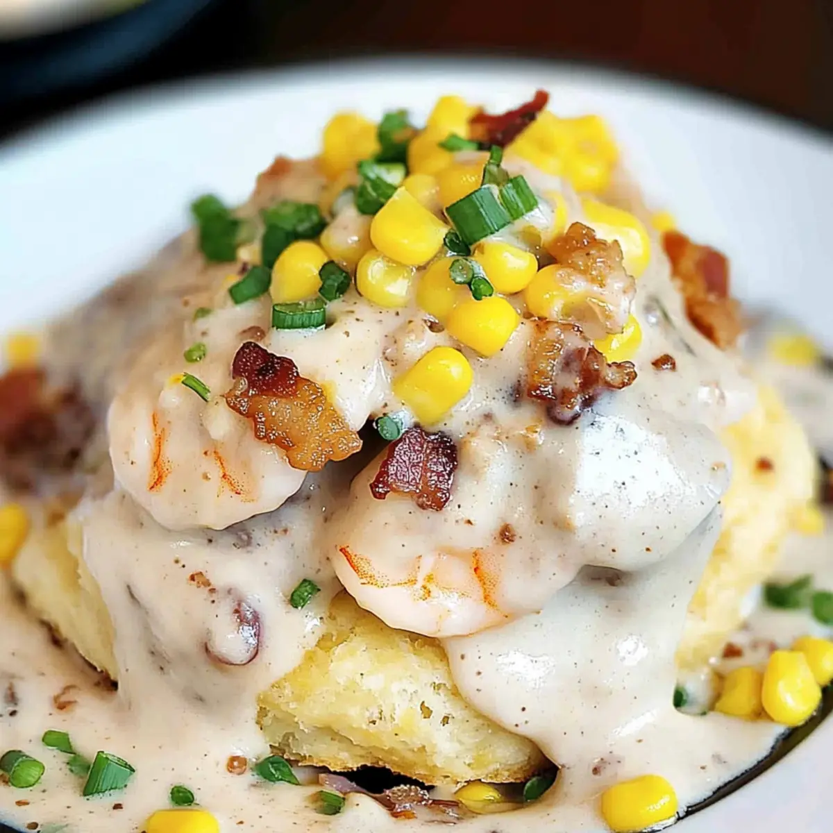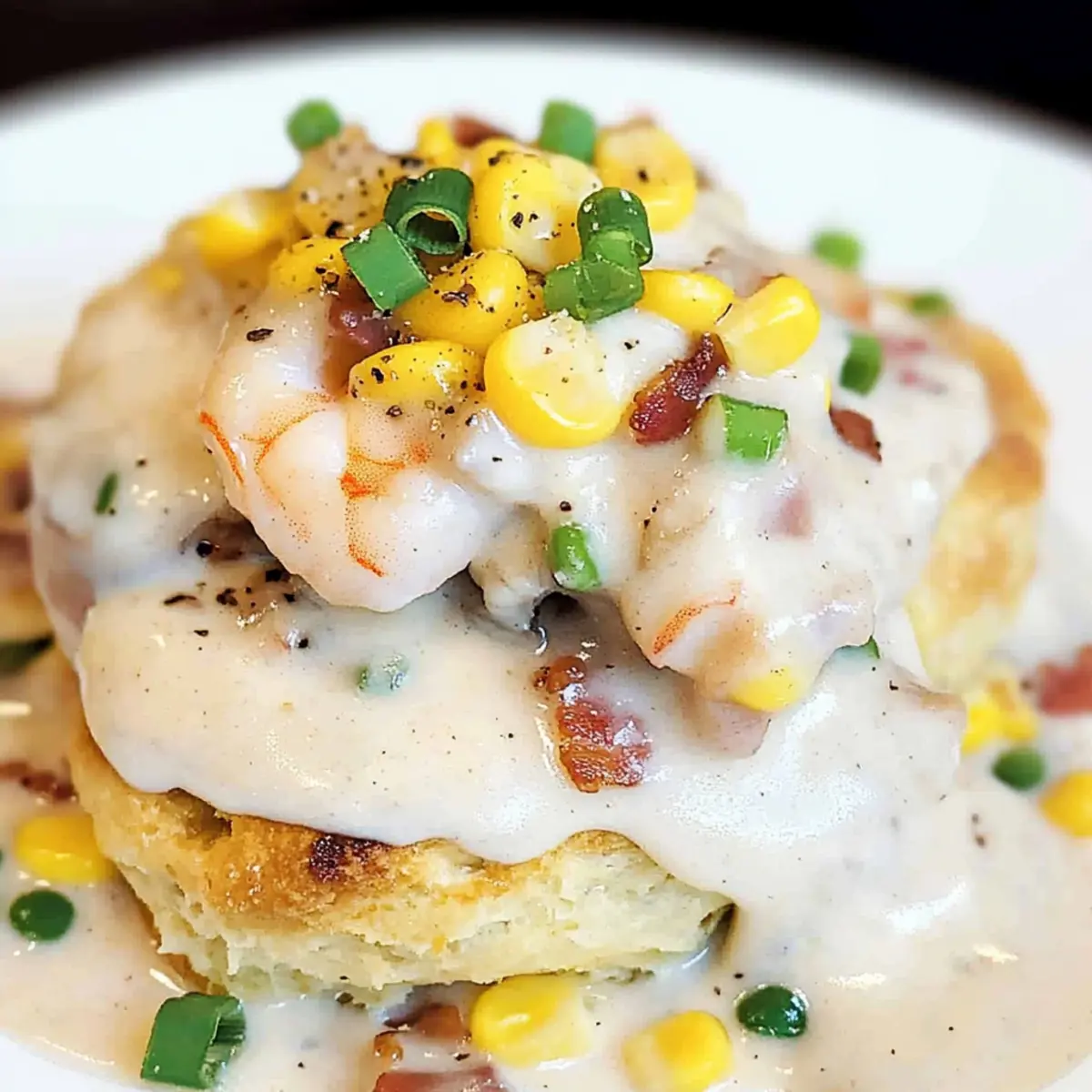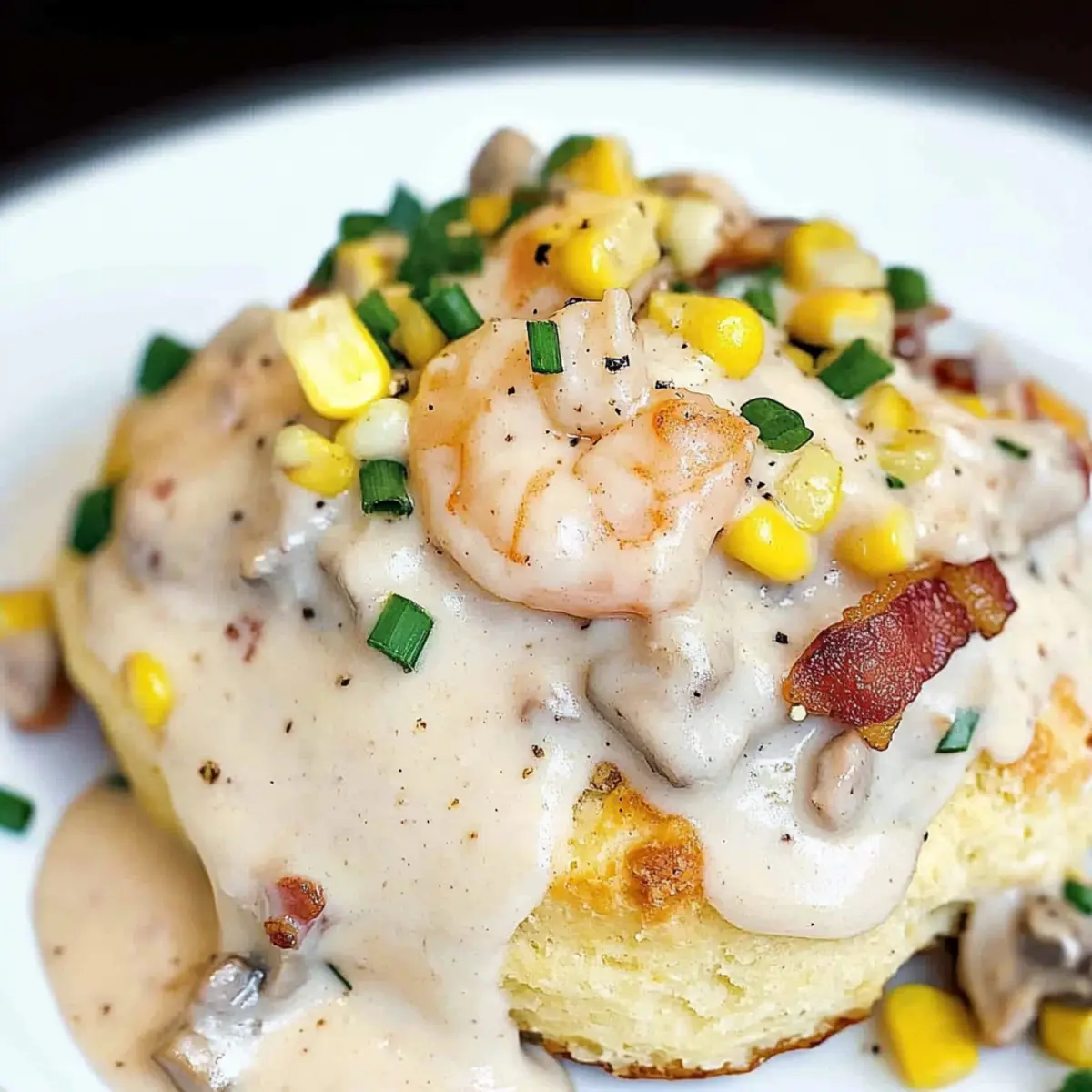 As the aroma of sizzling bacon mingles with the salty tang of fresh seafood, my kitchen transforms into a cozy Southern getaway. This Shrimp Gravy over Cheddar Bay Bacon Biscuits is not just a meal; it’s a warm hug on a plate, inviting friends and family to gather around the table. With its creamy, dreamy gravy and flaky, cheesy biscuits, this dish is a delightful fusion that’s sure to impress your loved ones. Not only is it a crowd-pleaser, but it also comes together quickly, making weeknight dinners feel special without the stress. Ready to elevate your comfort food game? Let’s dive into this delicious journey together! Why is this recipe a must-try? Comforting, this Shrimp Gravy over Cheddar Bay Bacon Biscuits brings a taste of Southern charm right to your dinner table. Quick preparation makes it ideal for busy weeknights, allowing you to whip up a restaurant-quality meal in no time. Unique flavors blend creamy shrimp gravy with cheesy, bacon-enhanced biscuits, making each bite a true delight. Crowd-pleaser status is guaranteed—wonderful for gatherings or family dinners, everyone will adore this dish! And if you’re craving something different, try adding potatoes or even diced jalapeños for an extra kick. Experience comfort food at its finest! Shrimp Gravy over Cheddar Bay Bacon Ingredients For the Biscuits Unsalted Cold Butter – Adds richness and flakiness; margarine can be substituted, but the texture may vary. All-Purpose Flour – Provides structure; use a gluten-free flour blend for gluten-free biscuits. Baking Powder – Acts as a leavening agent; don’t substitute with baking soda as they differ in function. Kosher Salt – Enhances flavor; regular salt can be used but reduce the amount since it’s finer. Buttermilk – Adds moisture and tang; substitute with a milk-vinegar mix (1 cup milk + 1 tbsp vinegar) if needed. Sharp Cheddar Cheese – Provides a strong flavor and meltiness; can swap with Monterey Jack for a different taste. Bacon – Imparts smokiness and crunch; use bacon bits for a vegetarian option or omit entirely. Seafood Seasoning – Adds that essential Cajun flavor; Old Bay or any Cajun spice blend works well. For the Gravy Shrimp (peeled and deveined) – The star of the dish, offering sweetness; chicken or tofu can be substituted for a different protein. Mushrooms – Contributes umami flavor; can be omitted or replaced with zucchini for a veggie boost. Olive Oil – Ideal for sautéing; vegetable oil or butter can also be used. Unsalted Butter – Used to make the roux; regular butter is fine but keep salt levels in check. Corn Kernels – Adds sweetness and texture; frozen corn is convenient, while fresh corn shines in season. Half and Half – Provides creaminess; for a thicker sauce, substitute with full-fat milk or cream. Kosher Salt, Fresh Cracked Pepper – Essential for seasoning; adjust to taste. With these ingredients in hand, you’re well on your way to creating the unforgettable Shrimp Gravy over Cheddar Bay Bacon Biscuits that will surely wow your family and friends! Step‑by‑Step Instructions for Shrimp Gravy over Cheddar Bay Bacon Biscuits Step 1: Preheat the Oven Begin by preheating your oven to 450°F (232°C) to prepare for baking the biscuits. This ensures a perfectly golden and flaky texture once you place the dough inside. Line a baking sheet with parchment paper or a silicone mat for easy cleanup later on. Step 2: Make the Biscuit Dough In a large bowl or a food processor, mix together the all-purpose flour, baking powder, and kosher salt. Cut in the cold unsalted butter until the mixture resembles coarse crumbs, ensuring it’s crumbly. This step is crucial for achieving the delightful flakiness in your Cheddar Bay bacon biscuits. Step 3: Add Cheese and Bacon Sprinkle in the sharp cheddar cheese and crisp bacon bits, then pour in the buttermilk. Mix gently until just combined; be careful not to overwork the dough to keep the biscuits tender. Using a spoon or a scoop, drop approximately 8 mounds of dough onto your prepared baking sheet. Step 4: Season and Bake Now, lightly sprinkle your seafood seasoning over the tops of the biscuits for an added flavor boost. Place the baking sheet in the preheated oven and bake for 10-15 minutes, or until the biscuits are puffed up and golden brown—this is when you’ll see their wonderful flaky texture shine through. Step 5: Prepare the Shrimp While the biscuits are baking, season the shrimp with olive oil, salt, and additional seafood seasoning. Heat a skillet over medium-high heat, then cook the shrimp for about 2-3 minutes on each side until they turn pink and are cooked through. Remove the shrimp from the skillet and set aside to keep them tender. Step 6: Sauté the Vegetables In the same skillet, add a drizzle of olive oil if necessary, and sauté the mushrooms over medium heat until they are softened, approximately 4-5 minutes. The earthy aroma will complement the shrimp beautifully, and this mixture will add depth to your shrimp gravy. Step 7: Make the Roux In a medium saucepan over low heat, melt unsalted butter and whisk in equal parts all-purpose flour to create a roux. Cook for about 2 minutes until it’s bubbly and lightly golden, then gradually whisk in half-and-half, stirring until the mixture thickens to a creamy consistency, about 3-5 minutes. Step 8: Combine Ingredients for Gravy Fold in the cooked shrimp and sautéed mushrooms along with the corn kernels to the creamy gravy mixture. Stir gently to combine, ensuring that the shrimp are heated through but remain tender and juicy. Season with more kosher salt and fresh cracked pepper to taste. Step 9: Serve the Dish For the final assembly, split the warm Cheddar Bay bacon biscuits in half. Generously spoon the rich shrimp gravy over the bottom half, then place the top half back on. Drizzle with additional gravy for that extra flair, and garnish with chopped green onions and crispy bacon bits before serving. Storage 