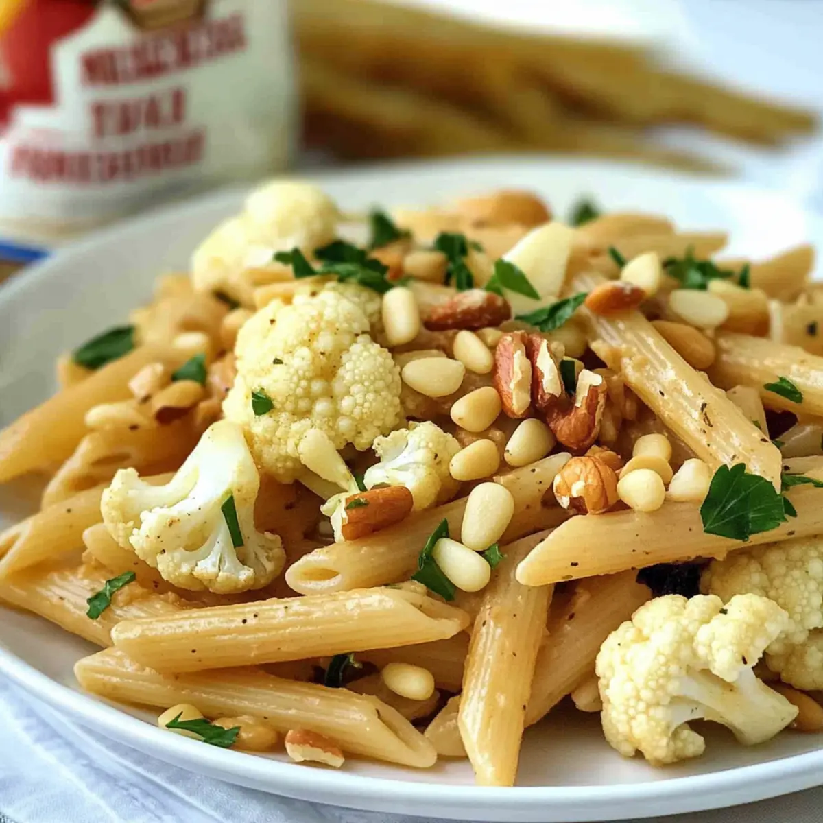As I stood in my kitchen breathed in the vibrant aromas of Sicilian cuisine, I couldn’t help but feel transported to sun-soaked shores, where bright flavors danced in the air. This Sicilian Cauliflower Pasta, featuring red lentil penne, is a delightful twist on traditional pasta dishes, combining roasted cauliflower, sweet golden raisins, and briny capers in a medley of textures. Best of all, it comes together in just 20 minutes, making it a fantastic choice for a quick weeknight dinner that doesn’t compromise on nutrition. Plus, it’s vegetarian and easily adaptable for gluten-free diets, ensuring that everyone can savor this dish without worry. Who wouldn’t want a recipe that not only tantalizes the taste buds but also champions wholesome ingredients? Curious to discover how to make this vibrant, delicious pasta? Let’s dive in! Why Choose Sicilian Cauliflower Pasta? Flavor Explosion: This dish blends roasted cauliflower with the sweetness of golden raisins and tangy capers, creating a symphony of flavors that will delight your palate. Quick & Easy: Ready in just 20 minutes, this recipe is perfect for busy weeknights without sacrificing nutrition. Versatile Ingredients: Substitute with broccoli for a change or explore various pasta shapes to customize your dinner experience! Nutrient-Rich: With red lentil penne, you’re not just indulging; you’re fueling your body with protein and fiber. Crowd-Pleaser: Perfect for family dinners or gatherings, this Sicilian Cauliflower Pasta will impress your guests and take them on a flavorful journey. For more vibrant pasta ideas, be sure to check out Cajun Chicken Pasta or Spinach Mushroom Pasta! Sicilian Cauliflower Pasta Ingredients For the Pasta • Red Lentil Penne – This gluten-free pasta serves as a hearty base, providing structure and a protein boost. For the Roasted Cauliflower • Cauliflower – Roasted to perfection, it adds a nutty, hearty texture; broccoli is a great substitute if you prefer. • Olive Oil – Essential for roasting to enhance flavors; avocado oil is a nice alternative. • Red Pepper Flakes – These bring a warm heat to the dish; feel free to omit them for a milder flavor. For the Flavor Boosts • Golden Raisins – Their sweetness beautifully balances the savory elements; use regular raisins or dried cranberries if needed. • Capers – They add a salty, briny note that brightens the dish; chopped green olives can work as a mild substitute. • Fresh Lemon Juice – It adds a burst of acidity; vinegar can be used in a pinch, but fresh is preferred. • Kosher Salt & Black Pepper – These are essential for seasoning to taste; adjust as you prefer. For the Finishing Touches • Fresh Flat Leaf Parsley – This herb adds freshness and color; basil can be swapped in for a different flavor. • Toasted Pine Nuts – They provide a nutty crunch; you can swap with walnuts or omit for a nut-free option. • Freshly Grated Parmesan Cheese – A sprinkle of umami richness that completes the dish; use nutritional yeast for a vegan-friendly choice. Get ready to whip up this delicious and nutritious Sicilian Cauliflower Pasta that not only satisfies but also makes your dinner table sing! Step‑by‑Step Instructions for Sicilian Cauliflower Pasta Step 1: Cook the Pasta Start by bringing a large pot of salted water to a boil. Add the red lentil penne and cook according to package instructions until al dente, usually around 7-9 minutes. Once cooked, reserve ½ cup of the pasta cooking liquid, then drain the pasta and set it aside. This will help to create a luscious sauce later. Step 2: Prepare the Cauliflower While the pasta cooks, prepare the cauliflower by slicing it into ¾-inch thick planks and breaking them into small florets. You want enough surface area for roasting. Set these aside, as you’ll toss them directly into a large unheated skillet. This step ensures even roasting when the heat is applied. Step 3: Roast the Cauliflower In the same large skillet, drizzle a generous amount of olive oil and add the cauliflower in a single layer. Sprinkle the florets with red pepper flakes for that lovely heat. Cover the skillet and place it over medium-high heat. Cook for about 5 minutes, allowing the cauliflower to brown beautifully without stirring; this promotes caramelization. Step 4: Add Flavorful Ingredients Once the cauliflower is browned, remove the skillet’s cover and give it a good stir. Incorporate the golden raisins, capers, fresh lemon juice, kosher salt, and black pepper. Sauté everything together for another 2-3 minutes until the cauliflower is tender and the raisins are plump, absorbing the lovely flavors around them. Step 5: Combine Pasta and Sauce Now, reduce the heat to low and add the cooked red lentil penne to the skillet with the sautéed cauliflower. Pour in the reserved pasta water gradually, mixing until everything is well combined and coated in the delicious sauce. Toss in the fresh parsley, ensuring it’s evenly distributed throughout the Sicilian Cauliflower Pasta. Step 6: Serve with Garnishes To finish, serve the pasta warm in bowls or on plates, garnishing each serving with toasted pine nuts for crunch and freshly grated Parmesan cheese for added richness. Enjoy the delightful flavors and textures of this Sicilian Cauliflower Pasta, straight from your kitchen! What to Serve with Sicilian Cauliflower Pasta Complement your dinner with delightful accompaniments that enhance the flavors of this vibrant dish. Garlic Bread: Perfect for scooping up those delicious pasta remnants, garlic bread adds a crispy bite and aromatic delight to your meal. Mixed Green Salad: Fresh greens tossed with a light vinaigrette provide a refreshing contrast, enhancing the hearty flavors of the Sicilian Cauliflower Pasta. Roasted Asparagus: The earthy taste of roasted asparagus, lightly seasoned, brings a beautiful pop of color and complements the sweetness of the raisins beautifully. Lemonade Spritzer: A spa