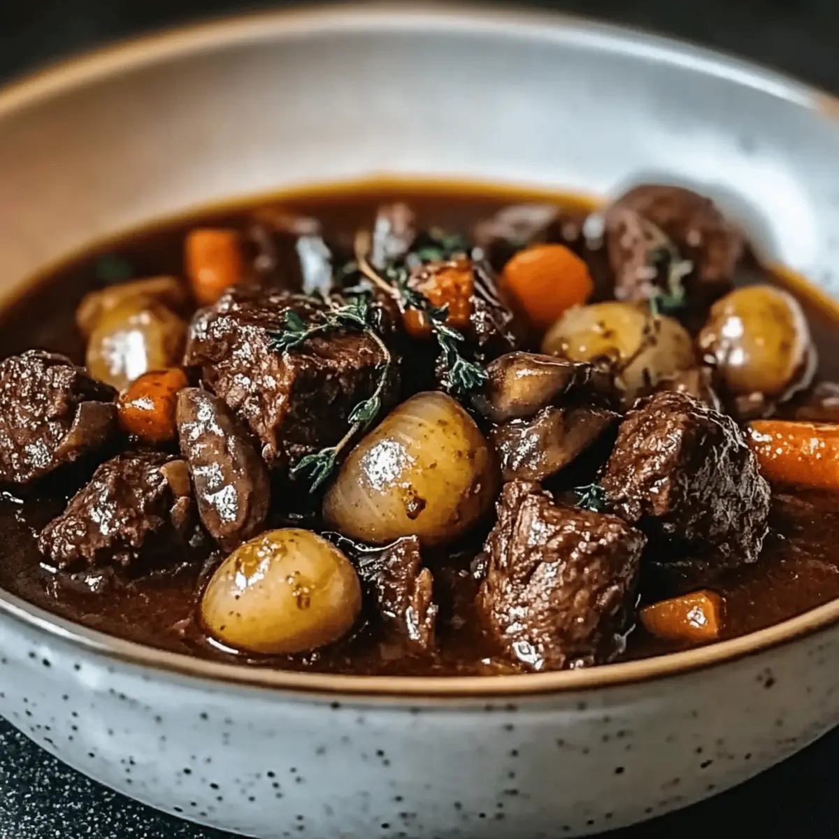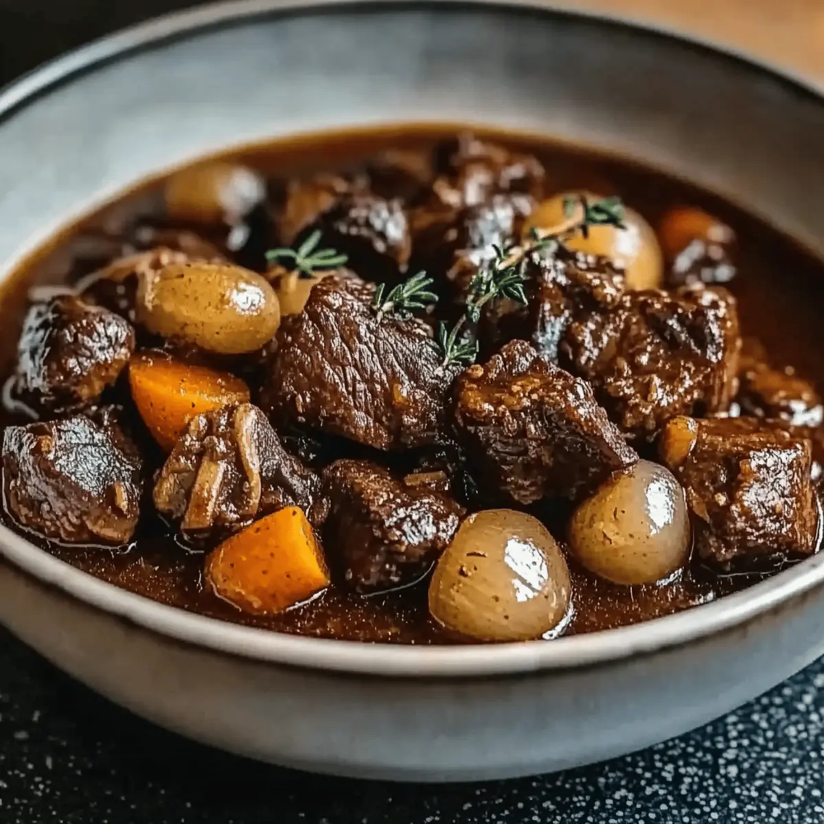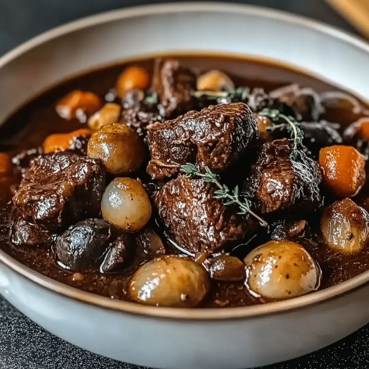 The gentle aroma of simmering beef wafting through the kitchen draws me back to cozy evenings spent with family, where comfort food took center stage. Today, I’m excited to share my take on a beloved classic: Slow-Cooked Beef Bourguignon. This traditional French dish marries tender chunks of beef with rich red wine and fragrant herbs, resulting in a meal that is both hearty and unforgettable. Perfect for chilly nights or special gatherings, this recipe only requires about 30 minutes of hands-on prep—leaving you free to savor those precious moments with loved ones. Plus, it’s adaptable; you can easily swap out ingredients to suit your taste or dietary needs. Are you ready to elevate your cooking game and experience the cozy warmth of this delightful stew? Let’s dive in!