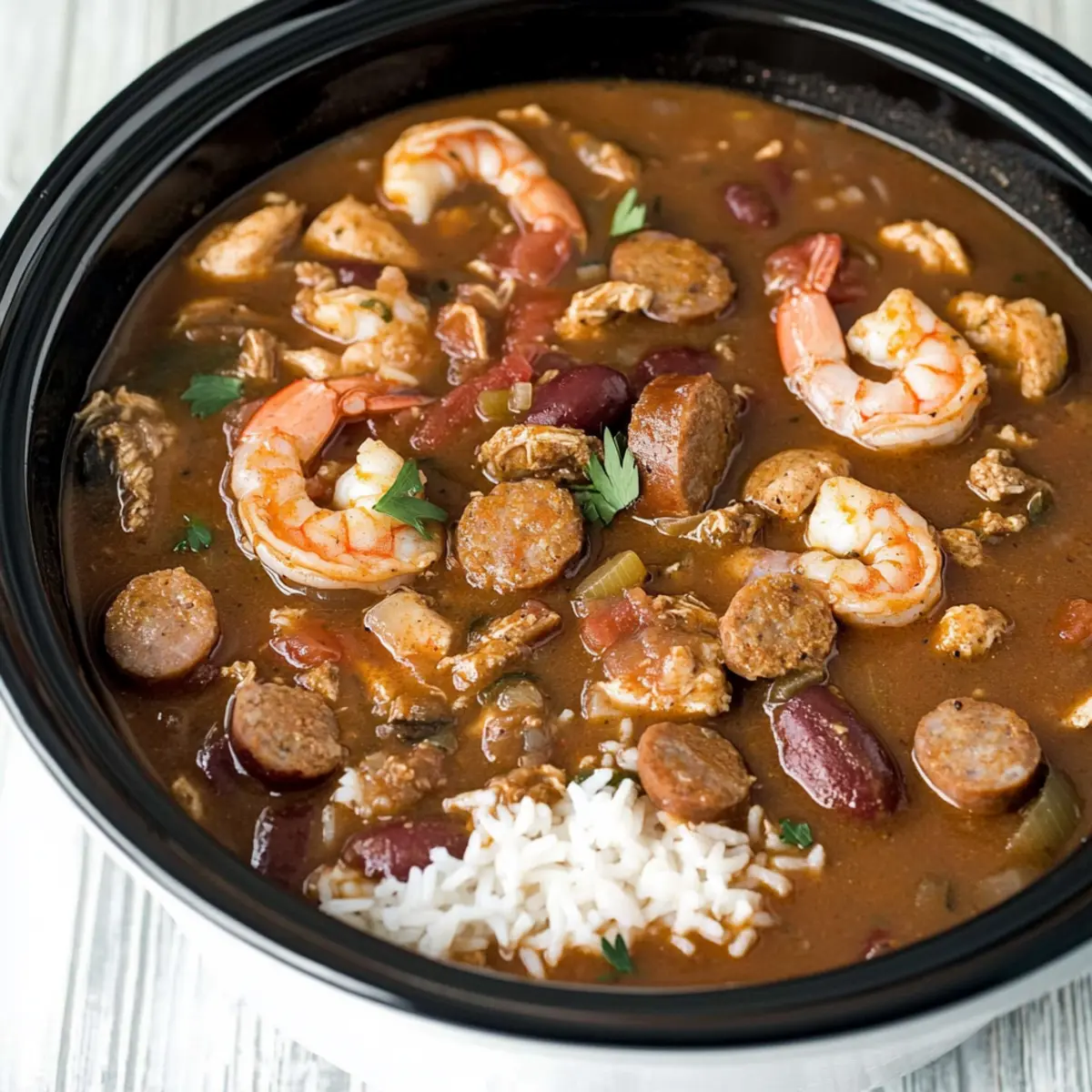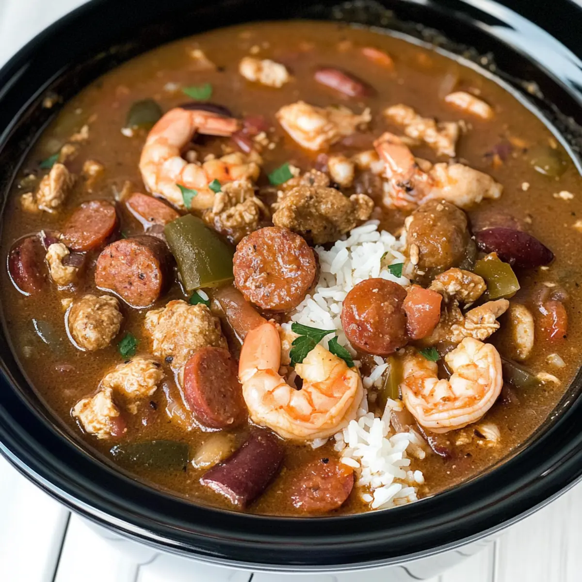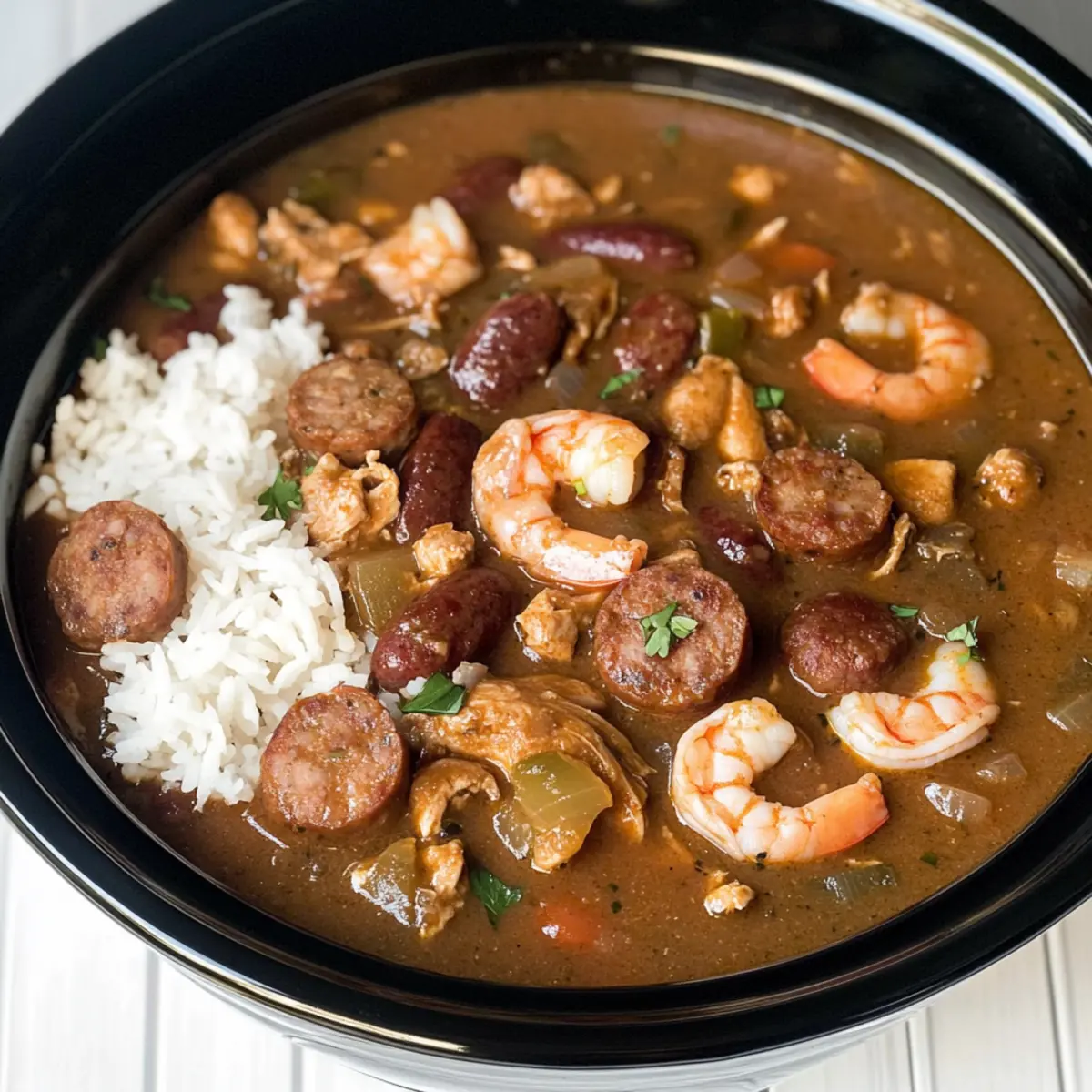 As I slowly stirred the pot, the rich aroma of spices and simmering seafood filled my kitchen, instantly transporting me to the vibrant streets of New Orleans. This Slow Cooker Cajun Gumbo is not just a dish; it’s a heartfelt invitation to gather around the table and celebrate the flavors of Mardi Gras. With tender meats, fresh shrimp, and a medley of vegetables, this hearty stew is a perfect blend of comfort and festivity. Plus, the simplicity of using a slow cooker means you can spend more time enjoying the festivities rather than slaving over the stove. Ready to create your own festival of flavors? Let’s dive into the details of this irresistible recipe! Why Is Slow Cooker Cajun Gumbo a Must-Try? Flavorful Adventure: The vibrant mix of spices makes every bite a celebration of Cajun culture and tradition. Effortless Cooking: Simply toss everything into the slow cooker, and let it do the magic while you relax or entertain guests. Hearty Satisfaction: This robust stew warms you from the inside, perfect for cozy nights or festive gatherings. Customizable Fun: Easily swap ingredients based on your preferences; want more seafood or prefer a vegetarian option? Go for it! Crowd-Pleaser: Serve it at your next gathering, and watch everyone go back for seconds—it’s that irresistible! Plus, don’t forget to pair it with some crusty bread for dipping or enjoy it alongside other comforting dishes like Slow Cooker Beef or Cajun Chicken Pasta. Slow Cooker Cajun Gumbo Ingredients For the Roux Vegetable Oil – Provides fat for cooking the roux and enhances flavor. All-Purpose Flour – Acts as the thickening agent to achieve a rich gumbo texture. For the Vegetables Celery – Adds a savory element and depth of flavor. Bell Peppers – Provides sweetness and a slight crunch, essential in Cajun cuisine. Onion – Enhances the base flavor of the gumbo. Garlic – Adds aromatic depth; sauté before adding to slow cooker. For the Base Chicken Broth – Serves as the liquid base for the gumbo; can use low-sodium. Diced Tomatoes – Adds acidity and depth; canned works well for convenience. Creole Seasoning – Infuses the dish with classic Cajun spices (check for saltiness). For the Proteins Chicken (preferably boneless thighs) – Adds protein and heartiness. Andouille Sausage – Provides a smoky flair and reflects traditional gumbo recipes. Shrimp – Offers a sweet and tender contrast to the meats; use fresh or frozen. For the Goodness Okra – Thickens the stew and adds a unique texture; omit if not preferred. Fresh Thyme – Adds herbal freshness; can substitute with dried thyme if necessary. To Serve White Rice – Typically served as a base for the gumbo; can use brown or cauliflower rice as alternatives. Fresh Herbs (e.g., parsley) – For garnish and an added burst of freshness. This Slow Cooker Cajun Gumbo is a delicious way to embrace the spirit of Mardi Gras and share a comforting meal with loved ones! Step‑by‑Step Instructions for Slow Cooker Cajun Gumbo Step 1: Prepare the Roux In a medium skillet over medium heat, combine vegetable oil and all-purpose flour, whisking constantly for about 15 minutes. You’re aiming for a beautiful chocolate brown roux—look for a rich, nutty aroma! Once ready, carefully transfer this magic elixir to your slow cooker, ensuring every drop makes it in. Step 2: Sauté Vegetables Add the finely chopped celery, bell peppers, and onion to the roux in the slow cooker, stirring well to blend. Let these sauté for about 2 minutes until they soften slightly, then throw in minced garlic for another 2 minutes. This new mixture should be fragrant and colorful, inviting the goodness of Cajun flavors into your Slow Cooker Cajun Gumbo. Step 3: Combine Ingredients Now it’s time to build your gumbo! Pour in chicken broth and diced tomatoes, followed by a generous sprinkle of Creole seasoning and diced chicken thighs. Add the sliced Andouille sausage, okra, and fresh thyme, stirring everything together until well mixed. This hearty base is already coming to life, and it’s only the beginning! Step 4: Cooking Process Cover your slow cooker and set it to cook on HIGH for about 3 ½ to 4 hours or on LOW for 6 ½ to 7 hours. The goal is to allow the flavors to dance together and the chicken to become tender. You’ll know it’s close when your home fills with the mouthwatering scent of spices and simmered goodness. Step 5: Add Shrimp In the last 20 minutes of cooking, gently stir in the shrimp, ensuring they’re evenly distributed throughout the gumbo. Watch them turn pink and curl slightly, which is the perfect indicator that they are just cooked through. This addition of shrimp elevates your Slow Cooker Cajun Gumbo to even greater heights! Step 6: Cook Rice While the gumbo finishes, cook your white rice according to package instructions in a rice cooker or on the stovetop. When done, fluff the rice and keep warm. This simple side will soak up all the delicious flavors from your flavorful gumbo, making each bite an experience. Step 7: Serve Ladle the piping hot Slow Cooker Cajun Gumbo over a generous scoop of rice on individual serving plates or bowls. Consider adding a dollop of rice right on top of the gumbo for an inviting presentation. Finally, garnish with fresh herbs, such as parsley, to add a pop of color and freshness on your plate. Slow Cooker Cajun Gumbo Variations Feel free to get creative and make this Cajun Gumbo even more your own with these exciting variations! Turkey Swap: Substitute chicken with turkey for a leaner option while keeping the flavors rich and comforting. Vegetarian Delight: Omit meats completely; instead, add more beans like kidney or black beans along with extra vegetables for texture. Spicy Kick: Boost the heat by adding diced jalapeños or a dash of cayenne pepper; just be cautious not to overpower the other flavors. Seafood Medley: Mix in crab or scallops along with shrimp for a luxurious seafood gumbo that takes it up a notch.