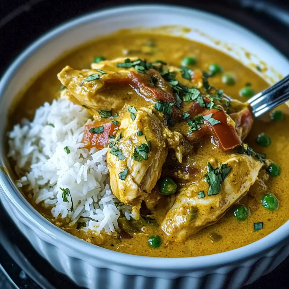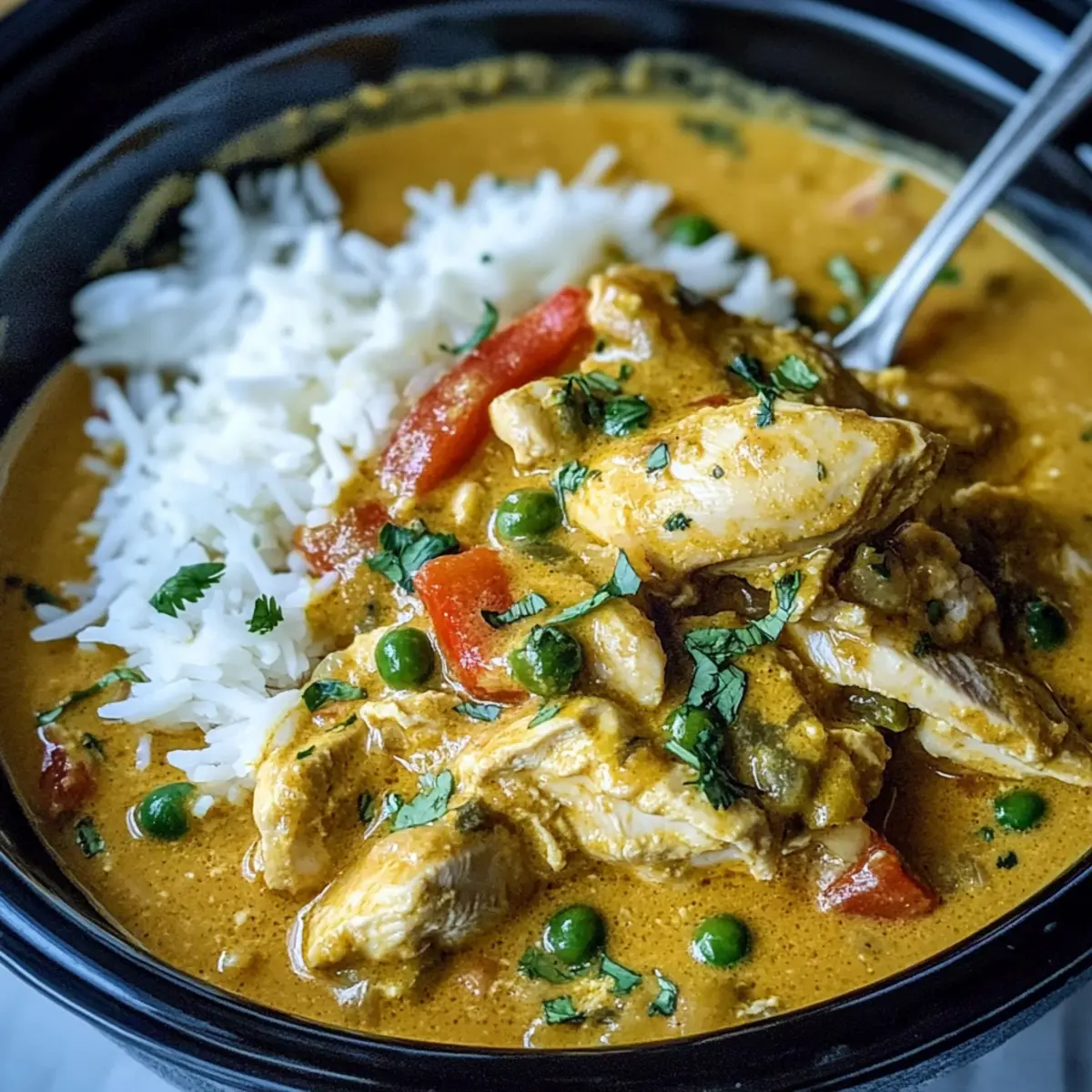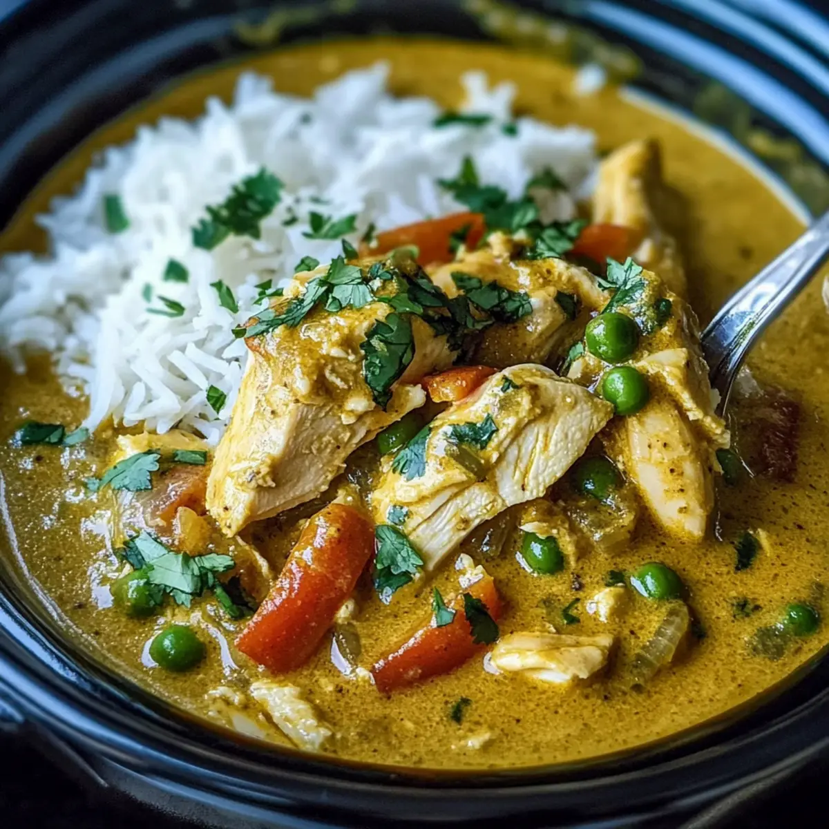 About 30 minutes before the end of the cooking time, stir in the sliced red bell peppers and frozen peas. This adds not only color but also delightful texture to your Slow Cooker Coconut Curry Chicken. Ensure the lid is back on securely, allowing the veggies to steam and warm through without becoming mushy.