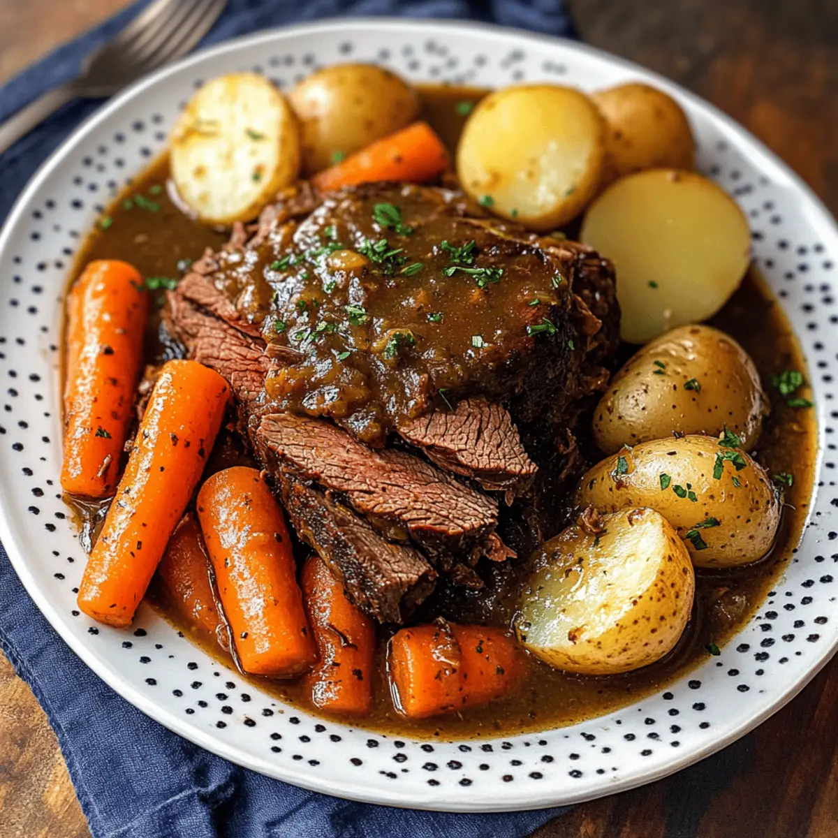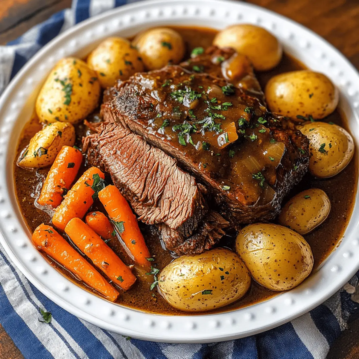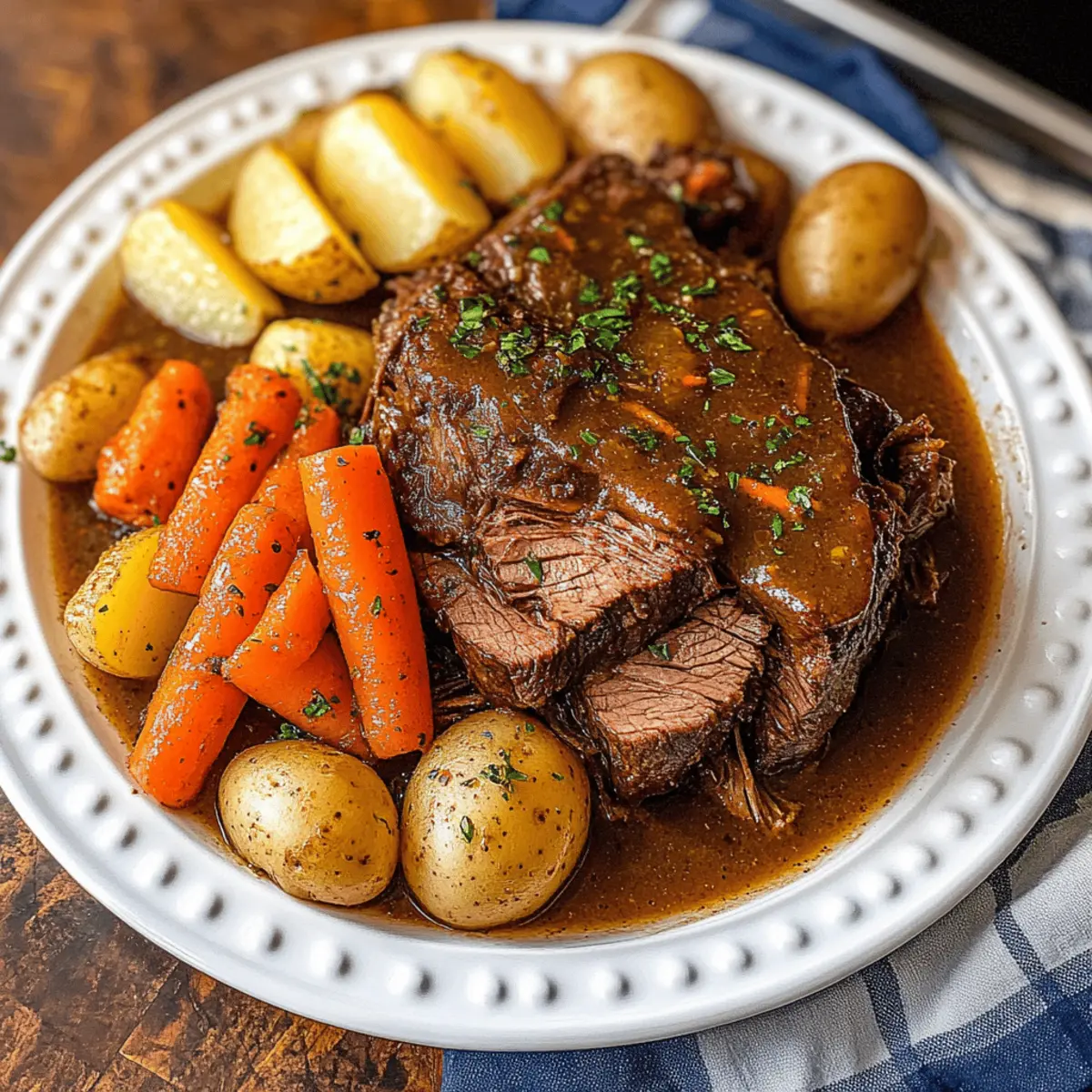 As the sun dips below the horizon, a savory aroma wafts through the kitchen, instantly whisking me back to family dinners filled with laughter and warmth. Today’s recipe for Slow Cooker Pot Roast will not only satisfy your cravings for comfort food but also wrap you in familiar, cozy flavors that make any meal feel special. With this ultimate crockpot pot roast, you can enjoy a tender, juicy roast accompanied by perfectly cooked vegetables—all while letting your slow cooker do the heavy lifting. It’s an effortless way to create a heartwarming dinner with minimal prep time, ensuring you spend more moments with loved ones. Imagine the delight when you present this fork-tender feast at your table! Ready to elevate your cooking game and discover the secret to a spoon-worthy gravy? Let’s dive in! Why is This Pot Roast So Special? Tender, Melt-in-Your-Mouth Goodness: With slow cooking, the roast becomes unbelievably tender, making every bite a savory delight. Effortless Preparation: Simply sear and toss ingredients into your slow cooker—let it work its magic while you enjoy your day! Rich, Flavorful Gravy: The homemade gravy, thickened with cornstarch, takes the meal to an impressive new level. Family-Friendly Comfort: This dish is perfect for family dinners, satisfying even the pickiest eaters—guaranteed smiles all around. Versatile & Customizable: Swap out proteins or add extra veggies like parsnips for a unique twist, keeping dinner exciting. Dive into this recipe and bring the warm aroma of a homecooked meal to your table, just like the beloved Slow Cooker Beef your loved ones crave! Slow Cooker Pot Roast Ingredients • For the best results, gather these essentials! For the Roast • Beef Roast – Use a chuck roast for optimal tenderness and flavor. • Olive Oil – Aids in searing the meat, adding richness to the overall flavor. • Salt & Pepper – Essential for seasoning; don’t skimp on these basics! For the Flavor Base • Onion – Provides sweetness; yellow or white onions work beautifully. • Garlic – Fresh garlic adds aromatic depth; substitute with garlic powder if necessary. • Tomato Paste – Adds richness and umami; can be swapped with a bit of ketchup. • Brown Sugar – Brings balance to savory flavors; coconut sugar is a great healthier option. • Italian Seasoning – Introduces herby notes; a mix of oregano and basil works well too. • Garlic Powder & Onion Powder – Optional but recommended for added depth. • Chili Powder – Adjust to your taste for a warm kick. For Cooking & Serving • Beef Stock – Provides moisture and flavor; opt for low-sodium if desired. • Carrots – Adds sweetness and color; baby carrots can be a quick alternative. • Potatoes – Any type is suitable, but Yukon gold or red potatoes hold their shape well. • Thyme, Rosemary, Bay Leaves – Fresh herbs add a wonderful fragrance; dried herbs are also fine. • Cornstarch – Perfect for thickening the gravy; flour can be used for a gluten alternative. • Parsley (for garnish) – Fresh parsley adds a lovely touch of color on the plate. Get ready to enjoy a delightful Slow Cooker Pot Roast that melts in your mouth! Step‑by‑Step Instructions for Savory Slow Cooker Pot Roast Step 1: Prepare the Roast Begin by patting your chuck roast dry with paper towels and generously seasoning it with salt and pepper. This not only enhances the flavor but also helps to create a beautiful crust. Preheat your large sauté pan over medium-high heat. You’ll want the pan hot enough that a drop of water sizzles upon contact before moving to sear the meat. Step 2: Sear the Roast Drizzle olive oil into the preheated pan, allowing it to warm for a few seconds, then carefully place the seasoned roast in the pan. Sear for about 4 to 5 minutes on each side or until a rich, golden-brown crust forms. This step ensures maximum flavor for your Slow Cooker Pot Roast, sealing in those delicious juices as you brown all sides. Step 3: Sauté Onions Once the roast is beautifully seared, transfer it to a plate. In the same pan, reduce the heat to medium and add sliced onions with a pinch of salt and pepper. Sauté the onions for approximately 4 minutes until they soften and begin to caramelize, picking up any flavorful bits left from searing the roast. The onions will add a wonderful sweetness to your dish. Step 4: Add Flavorful Ingredients Stir in minced garlic, tomato paste, brown sugar, Italian seasoning, and any additional seasonings like garlic powder or chili powder. Allow this aromatic mixture to cook for about a minute until fragrant, stirring constantly. This builds a flavorful base for your Slow Cooker Pot Roast, giving it depth and richness that your family will love. Step 5: Deglaze the Pan Pour in the beef stock to deglaze the pan, scraping up any browned bits with a wooden spoon. This crucial step adds essential flavor to your cooking liquid. Once combined, carefully transfer the flavorful mixture to your slow cooker, creating a comforting foundation for your roast. Step 6: Assemble in Slow Cooker Surround the seared roast with chopped carrots and potatoes, ensuring they are evenly distributed. Pour in the remaining beef stock, and add fresh thyme, rosemary, and bay leaves. Season lightly with additional salt and pepper if desired. As you layer these ingredients, visualizing the delicious Slow Cooker Pot Roast to come will elevate your cooking spirits! Step 7: Set Cooking Time Cover the slow cooker and set it on low for about 8 hours, or on high for 4 to 5 hours, allowing the magic of slow cooking to take place. Resist the urge to peek inside, as this can disrupt the cooking process and prevent the roast from reaching that tender, fork-worthy perfection everyone craves. Step 8: Prepare the Gravy Once the cooking time is complete, carefully strain the cooking liquid into a saucepan over medium heat. This will become the base for your rich gravy. From here, mix cornstarch with a coup