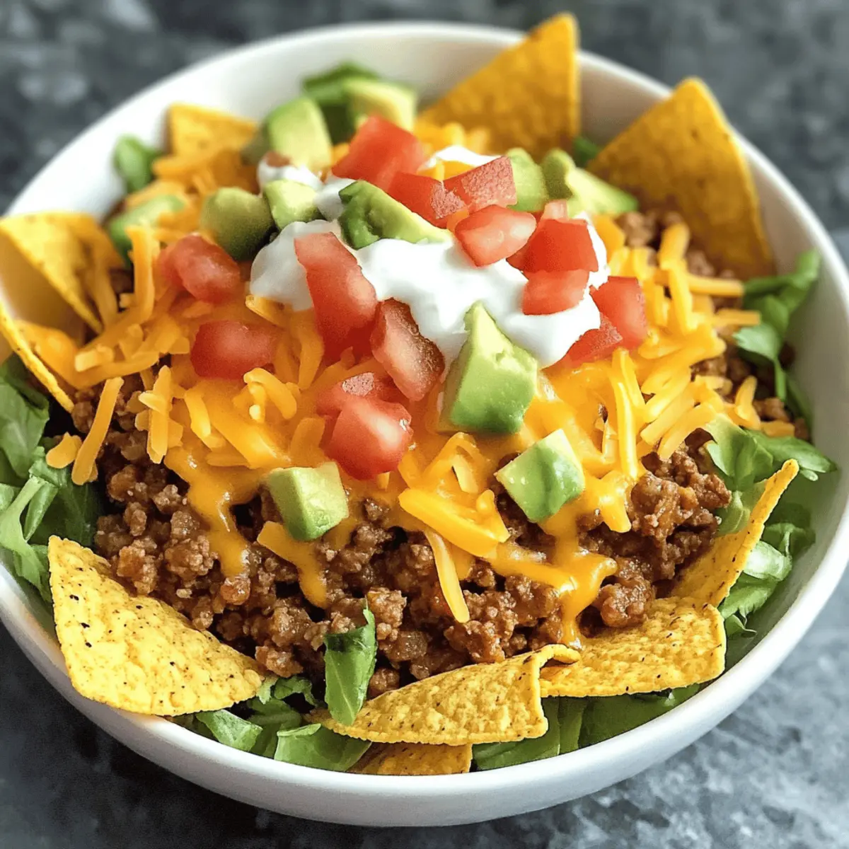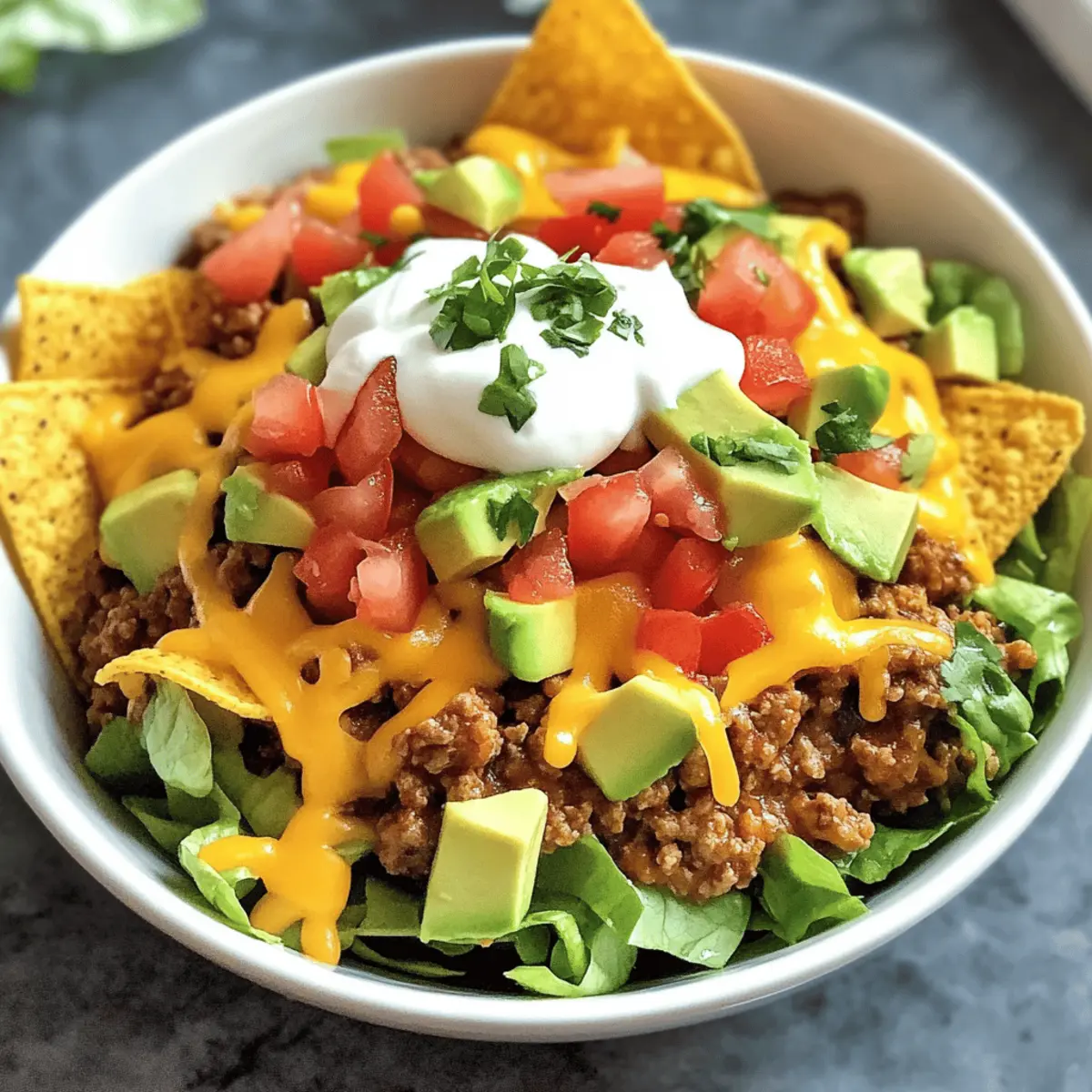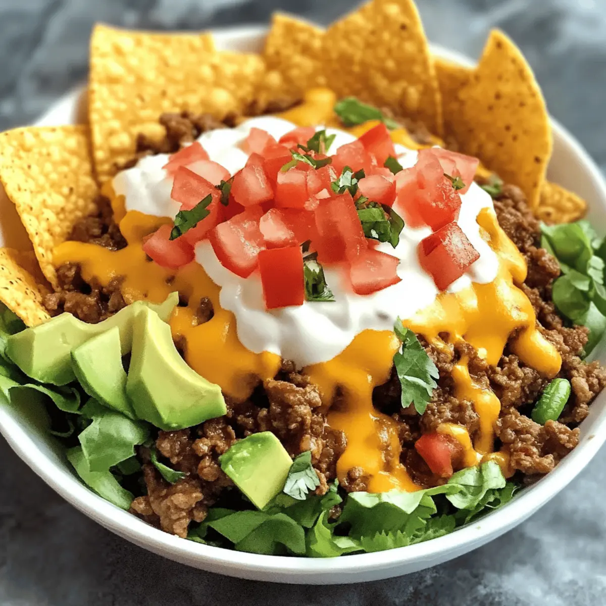 As the scent of spices starts wafting through the kitchen, I can’t help but smile—dinner is set to be a delightful feast tonight. Slow Cooker Smothered Fritos Taco Bowls are making their way to the table, a recipe that seamlessly combines all the bold flavors of Tex-Mex with the effortless charm of slow cooking. This dish is perfect for those busy weeknights or casual gatherings where you want to impress without the fuss. Not only is it customizable to fit your dietary needs, but it also offers a comforting crunch thanks to the Fritos topping. Now, who wouldn’t love a cozy meal that satisfies cravings while allowing room for creativity? Can you hear those Fritos calling? Let’s dive into this mouthwatering recipe together! Why Will You Love This Dish? Easy Preparation: You’ll appreciate how simple it is to throw everything in the slow cooker, making dinner a breeze even on the busiest days. Flavor Explosion: This recipe combines savory ground beef, zesty taco seasoning, and creamy soups to create an unforgettable taste experience. Customizable: Tailor it to meet any dietary preferences with easy swaps like ground turkey or plant-based proteins, plus a variety of toppings! Comforting Crunch: The Fritos provide a delightful contrast, making every bite satisfying and full of texture. Crowd-Pleaser: Perfect for gatherings—everyone will rave about the deliciousness! Serve with a side of grilled vegetables or a fresh salad for a complete meal. If you’re looking for more easy-to-make dishes, try my Slow Cooker Beef or Slow Cooker Butter recipes! Slow Cooker Smothered Fritos Taco Bowls Ingredients For the Filling • Ground Beef – The star of the show; swap for ground turkey or chicken if you prefer a leaner option. • Taco Seasoning Mix – Packs robust flavor; try homemade seasoning for a healthier twist. • Ro-Tel (Diced Tomatoes with Green Chilies) – Adds moisture and a kick; any diced tomatoes can substitute if needed. • Cheddar Cheese Soup – Creates that creamy texture; a homemade cheese sauce is a great all-natural choice. • Cream of Mushroom Soup – Elevates richness; use a plant-based cream soup for a vegetarian version. • Milk – Thins out the mixture for creaminess; almond or oat milk works well for dairy-free needs. • Shredded Cheddar Cheese – Enhances cheesiness; consider reduced-fat cheese for a lighter option. • Fritos Corn Chips – The crunchy base; baked Fritos are a healthier choice to keep them light. Optional Toppings • Sour Cream – A classic garnish to add creaminess; Greek yogurt is a healthy alternative. • Shredded Lettuce – For freshness; top it off with whatever greens you have on hand. • Diced Tomatoes – Adds color and juiciness; swap with salsa for a tangy twist. • Sliced Jalapeños – A kick of spice; fresh cilantro can provide that fresh flavor too. • Chopped Onions – Brings a crunch and sharpness; green onions can be a milder option. • Avocado – Creamy and nutritious; guacamole is a delicious alternative for extra flavor. • Salsa and Hot Sauce – Perfect for those who like it spicy; choose your favorite brand! This Slow Cooker Smothered Fritos Taco Bowls recipe is all about comfort and customization—let your creativity soar! Step‑by‑Step Instructions for Slow Cooker Smothered Fritos Taco Bowls Step 1: Brown the Beef In a skillet over medium heat, brown 1 pound of ground beef, breaking it up with a wooden spoon. Cook it for about 5–7 minutes, or until it’s no longer pink. Use a slotted spoon to drain the excess fat and return the beef to the skillet. This creates a flavorful base for your Slow Cooker Smothered Fritos Taco Bowls. Step 2: Add Flavor Stir in your favorite taco seasoning mix and 1 can of Ro-Tel diced tomatoes with green chilies into the skillet. Let it simmer for 3–5 minutes, allowing the flavors to meld together. You’ll see the vibrant colors develop and smell the aromatic spices, setting the stage for the creamy filling. Step 3: Prepare the Sauce In your slow cooker, combine 1 can each of cheddar cheese soup and cream of mushroom soup, followed by ½ cup of milk. Use a whisk to blend until smooth and creamy. The mixture should have a rich texture, making it the perfect accompaniment to the beef mixture for your Slow Cooker Smothered Fritos Taco Bowls. Step 4: Combine Ingredients Fold the seasoned beef mixture into the creamy sauce in the slow cooker, mixing thoroughly. Then, stir in 1 cup of shredded cheddar cheese until it’s well incorporated. This creates a hearty filling that’s bursting with flavor, waiting to be transformed into your comforting taco bowl. Step 5: Slow Cook to Perfection Cover the slow cooker with its lid and cook on low for 3–4 hours. The filling should be bubbling and heated through by the end of the cooking time. Stir halfway through to ensure even heating and to infuse the flavors together beautifully for those delectable Slow Cooker Smothered Fritos Taco Bowls. Step 6: Serve with Crunch Before serving, lay a generous bed of Fritos corn chips on individual plates. Spoon the creamy beef mixture over the Fritos, allowing the rich sauce to cascade down. Top with additional shredded cheese and your favorite toppings such as sour cream, diced tomatoes, or sliced jalapeños for an extra burst of flavor and texture. Expert Tips for Slow Cooker Smothered Fritos Taco Bowls Drain Grease: Make sure to thoroughly drain the cooked ground beef to prevent your dish from being greasy. This ensures a delightful flavor balance. Stir Occasionally: Stirring the filling halfway through the cooking time promotes even heat distribution, especially important in slow cookers with hot spots. Crunchy Fritos: For maximum crunch, add the Fritos just before serving. This keeps them crispy and elevates the overall texture of your Slow Cooker Smothered Fritos Taco Bowls. Layer Wisely: Serve over a generous bed of Fritos to soak up the sauce without becoming soggy. It’s the perf