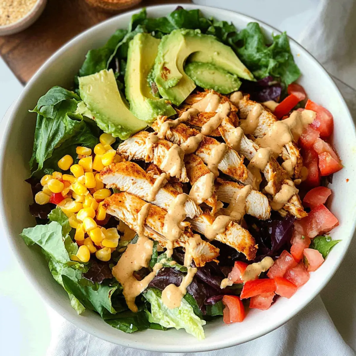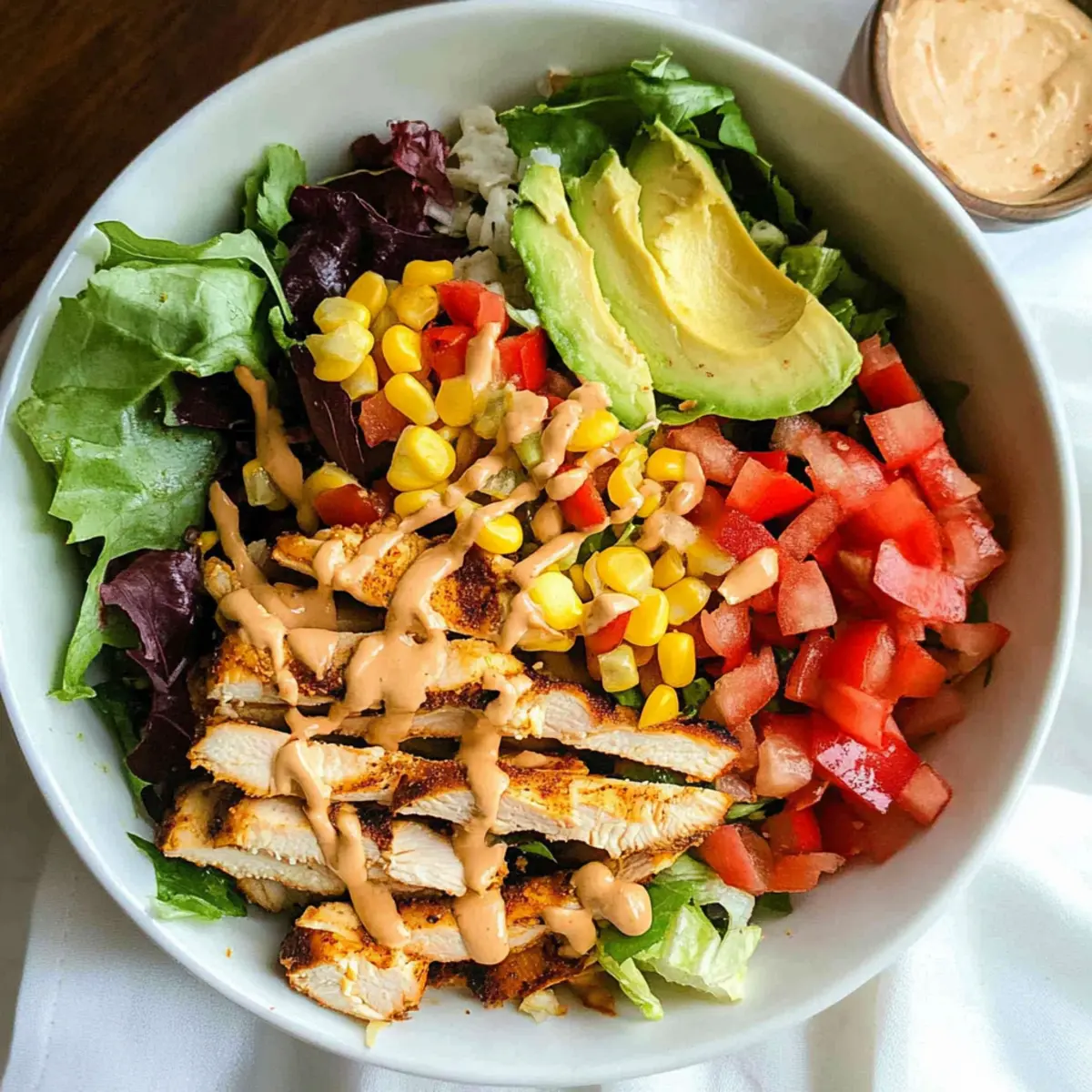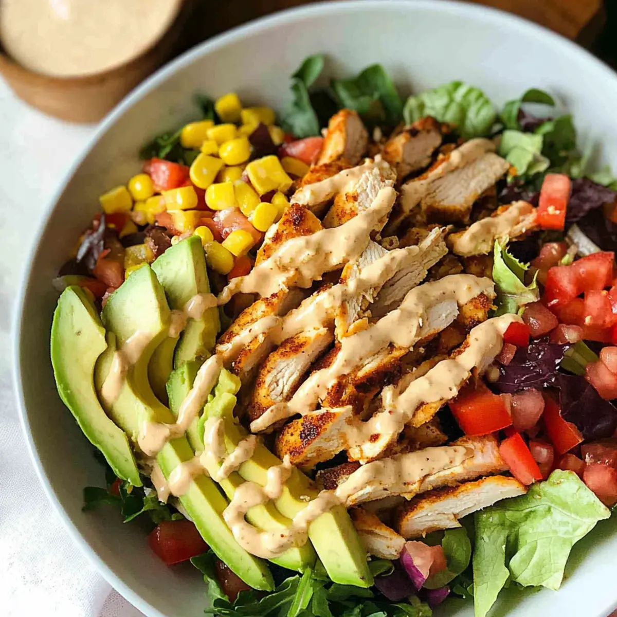 As I tossed together vibrant greens, juicy tomatoes, and perfectly marinated chicken, a delightful aroma filled my kitchen, calling me to discover the magic of a Flavor-Packed Southwest Chicken Salad. This dish beautifully marries fresh ingredients with a zesty twist, making it a go-to for anyone craving a satisfying meal without the wait. With its quick prep and high protein content, it’s perfect for those busy weeknights when you just want something delicious without a fuss. Imagine enjoying each crunchy bite, filled with the warmth of southwest spices and the freshness of garden veggies. Are you ready to whip up your new favorite salad? Why is this salad a game-changer? Vibrant Flavors: This is not just any salad; it bursts with bold southwest flavors that make it utterly irresistible. Quick & Easy: With just a 30-minute marination, you’ll have a scrumptious meal ready in under an hour, ideal for busy weeknights. Nutritious Delight: Packed with high-protein ingredients like chicken and black beans, this dish will keep you satisfied and energized. Fresh Ingredients: Each crunchy bite is a symphony of fresh vegetables like cucumbers and tomatoes, offering both texture and nutrients. Customizable Options: Make it your own by mixing in toppings like cheese or olives, perfect for those who love personalization in their dishes. Crowd-Pleasing: Serve this salad at gatherings or as a filling lunch option, and watch it disappear quickly, appealing to all taste buds! Don’t forget to also check out my Garlic Parmesan Chicken for another quick and delicious dinner idea! Southwest Chicken Salad Ingredients • Here’s everything you need for a Flavor-Packed Southwest Chicken Salad. For the Salad Chicken Breast – Provides lean protein and substance; consider using pre-sliced chicken for convenience. Romaine Hearts – Adds crispness and freshness; iceberg can also be used for a similar crunchy texture. Black Beans – Contributes additional protein and a creamy texture; swap with pinto beans if desired. Corn – Offers sweetness and crunch; either canned or frozen corn works perfectly. Avocado – Brings creaminess and healthy fats; ripe avocados are key for the best flavor. For the Veggies Tomato – Infuses freshness with vibrant color; cherry tomatoes are a sweet alternative. Jalapeño – Adds a spicy kick; adjust the amount based on your heat tolerance. Cilantro – Enhances flavor with its fresh herbaceous note; parsley can be used if you’re not a fan. Bell Pepper – Brings additional crunch and sweetness; choose any color you prefer. Onion – Offers depth and sharpness; red onion can add a touch of sweetness. For the Crunch Tortilla Strips – Adds that perfect crunch; feel free to substitute with crushed tortilla chips. For the Dressing Southwest Dressing – Elevates the flavor profile; homemade or store-bought works well, depending on your time. Ranch or Avocado Crema – Great alternatives based on your taste preference for a richer flavor. Get ready to create a delicious Southwest Chicken Salad that everyone will love! Step‑by‑Step Instructions for Southwest Chicken Salad Step 1: Marinate the Chicken Begin by slicing the chicken breasts into thinner pieces for quick marination. In a bowl, combine the chicken with olive oil, lime juice, salt, and southwest seasoning. Allow the chicken to marinate for 20-30 minutes, letting the flavors soak into the meat, which should begin to glisten and take on a fragrant aroma. Step 2: Cook the Chicken Heat a skillet over medium heat, ensuring it’s hot before adding the marinated chicken. Cook the chicken pieces for 3-5 minutes on each side, aiming for a golden brown crust while ensuring the internal temperature reaches 165°F. The chicken should feel firm and the juices should run clear when done. Step 3: Rest and Slice the Chicken Once cooked, transfer the chicken to a cutting board and let it rest for 5 minutes. This resting period allows the juices to redistribute, keeping the chicken moist. After resting, slice the chicken into elegant strips, ready to top your vibrant Southwest Chicken Salad. Step 4: Prepare the Greens Meanwhile, chop the romaine hearts into bite-sized pieces, ensuring they’re crisp and fresh. In a large salad bowl, toss the chopped romaine with your choice of dressing to coat the greens lightly and evenly. The greens should glisten with dressing for the best presentation. Step 5: Assemble the Salad Now it’s time to build your Southwest Chicken Salad! Top the dressed romaine with black beans, sweet corn, diced bell pepper, chopped red onion, fresh cilantro, creamy avocado, diced tomato, and slices of jalapeño. Arrange the toppings artistically for a colorful and appetizing appearance. Step 6: Finish with Dressing and Crunch Drizzle any remaining dressing over the salad to enhance its flavor, making sure it covers all the beautiful ingredients. Finally, add a handful of tortilla strips on top for that delightful crunch, which contrasts beautifully with the creamy and fresh textures of the salad. Step 7: Serve and Enjoy Your Southwest Chicken Salad is now ready to be served! Scoop generous portions onto plates, showcasing the colorful layers of ingredients. This salad not only looks stunning but is packed with vibrant flavors, making it a fantastic meal option for any occasion. Make Ahead Options These Southwest Chicken Salad components are perfect for meal prep enthusiasts! You can marinate the chicken up to 24 hours in advance, allowing the flavors to fully develop and saving time on busy weeknights. To keep it fresh, store your marinated chicken in an airtight container in the refrigerator. Additionally, chop the vegetables like romaine, bell peppers, and onions ahead of time and refrigerate them separately for up to 3 days; this keeps them crisp. When you’re ready to serve, simply cook the marinated chicken as directed, then combine all ingredients in a bowl, drizzle with dressing, and finish with crun