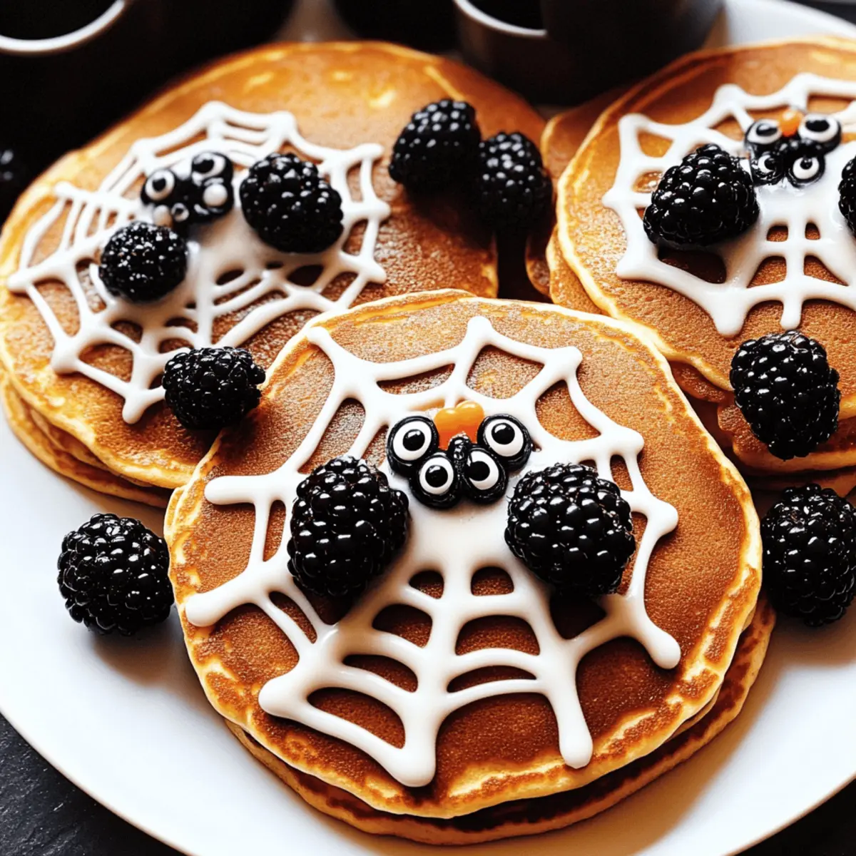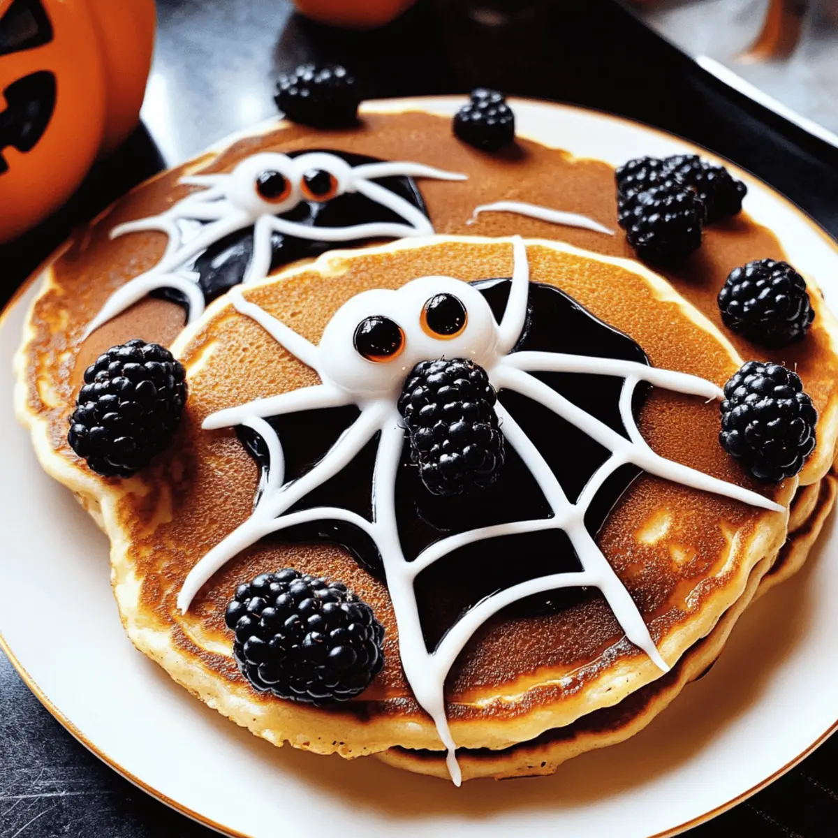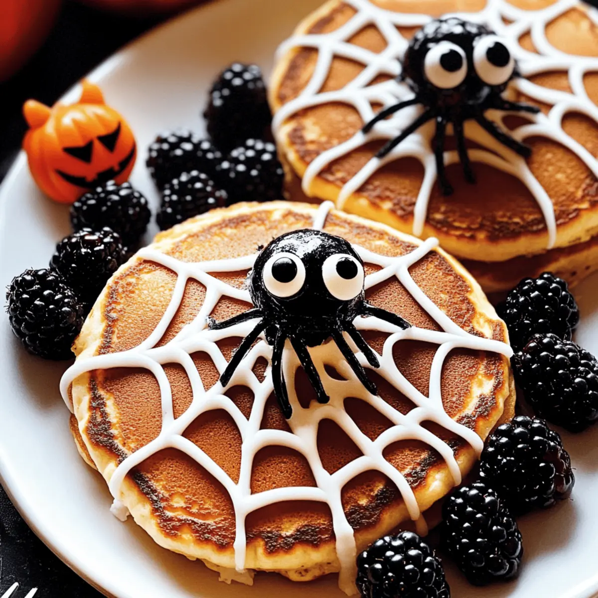 As I stumbled into the kitchen on a crisp Halloween morning, the faint scent of pancakes wafted through the air, promising a day of fun and festivities. Today, I’m whipping up some adorable Easy Spider Pancakes! These are not just any breakfast; they’re a delightful way to celebrate the holiday while keeping things simple and tasty. The versatility of this recipe allows you to use your favorite pancakes, whether they come homemade, from a mix, or even frozen. Plus, decorating them with blackberries that double as “spiders” adds an element of creativity that kids will absolutely love. These pancakes are the perfect blend of easy prep and a fun, festive spirit, making them a great addition to your Halloween breakfast table. Curious about how to transform ordinary pancakes into a spooky delight? Let’s dive into this charming recipe! Why Are Spider Pancakes So Fun? Adorable Fun: These pancake creations bring a playful twist to breakfast, perfect for getting everyone into the Halloween spirit! Kid-Friendly Creativity: Children will joyfully participate in decorating their “spiders,” making each breakfast not just a meal but a fun activity. Versatile Base: Use any pancake style you love! Whether homemade, from a mix, or frozen, you can customize it to your preferences. Check out my Oatmeal Apple Pancakes for more pancake inspiration! Quick and Easy: With simple ingredients and minimal prep, you can whip these up in no time—ideal for busy mornings. Sweet Visual Appeal: The contrast of sweet icing drizzles and fresh fruit makes for a visually stunning dish that even picky eaters won’t resist. Perfect for Celebrations: These Spider Pancakes aren’t just for Halloween; their playful design can be adapted for birthdays or brunches, offering endless possibilities! Spider Pancakes Ingredients For the Pancakes • Your favorite pancakes – Use homemade, pre-mixed, or frozen pancakes to suit your preference. For the Icing • White icing – Mix powdered sugar with water until smooth; adding vanilla extract gives it a lovely flavor. For the Decorations • Blackberries – These serve as the “spiders” on your pancakes; you can also swap them out for raspberries or blueberries. • Candy googly eyes – A fun addition that brings your spider creations to life; if you’re out, use small candies attached with icing instead. Bring your culinary creativity to the forefront with these delightful Spider Pancakes, making your Halloween breakfast both fun and delicious! Step‑by‑Step Instructions for Spider Pancakes Step 1: Prepare Your Pancakes Begin by cooking your favorite pancakes according to the package directions or your homemade recipe. If you’re using frozen pancakes, heat them in a toaster or microwave until warm and fluffy, ideally for about 1-2 minutes. Aim for a nice golden brown color on each side if made from scratch. Once done, stack them on a large serving plate, ensuring they’re warm to help the icing stick later. Step 2: Make the Icing In a mixing bowl, combine powdered sugar with a splash of water, stirring until you achieve a smooth, drizzle-friendly consistency. For extra flavor, whisk in a drop of vanilla extract. The icing should be thick enough to hold its shape when piped, so adjust with more sugar or water as needed—aim for around 2-3 minutes of mixing until glossy and free of lumps. Step 3: Pipe the Spiderweb Design Transfer the prepared icing into a small sandwich bag and snip off one corner to create a piping bag. Starting from the center of the pancake stack, gently pipe a spiral outwards, then branch off with thin lines to form a charming spiderweb. This whimsical design should only take about 2-3 minutes. Keep a steady hand for even lines, allowing your Spider Pancakes to look cute and festive! Step 4: Add the Blackberries Carefully place one or two blackberries on top of each pancake to represent the adorable “spiders.” Using your fingers, gently press them in place, ensuring they secure well without squishing the pancake. Take a moment to arrange them creatively on the stack, allowing the pancake presentation to shine. This setup should take about 2 minutes, and the juicy blackberries will add a lovely color contrast. Step 5: Attach Candy Eyes To bring your spider-themed pancakes to life, add candy googly eyes onto each blackberry using a dab of leftover icing. A small drop on the back of each candy works wonderfully. Spend around 1-2 minutes placing the eyes, making your Spider Pancakes irresistibly cute! This touch not only makes them playful but also perfect for Halloween fun. Step 6: Serve and Enjoy Once your adorable Spider Pancakes are fully decorated, serve them immediately with additional fruit or yogurt on the side, if desired. Present them with a warm smile as the delightful sights and sweet aroma fill your kitchen. It’s time to gather your family and dive into this festive breakfast creation together—ideal for making lasting Halloween memories! Make Ahead Options These Easy Spider Pancakes are perfect for meal prep, allowing you to savor more time during your busy Halloween morning! You can prepare your pancake batter up to 24 hours in advance; simply store it in the refrigerator in an airtight container to keep it fresh. For an even quicker breakfast, make the pancakes themselves ahead and refrigerate them for up to 3 days. When you’re ready to serve, just reheat the pancakes in a pan or microwave—this keeps them soft and delicious. Finally, prepare the icing ahead of time and store it in a sealed container, ensuring it maintains its perfect drizzle consistency. Assemble your Spider Pancakes by piping the icing, adding the blackberries, and attaching the candy eyes just before serving for a delightful and festive presentation! How to Store and Freeze Spider Pancakes Fridge: Store leftover Spider Pancakes in an airtight container in the refrigerator for up to 2 days. Reheat gently in the microwave or on a skillet before 