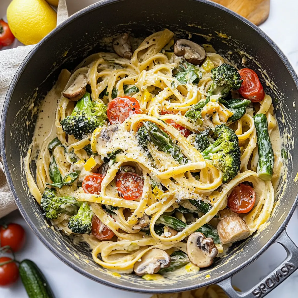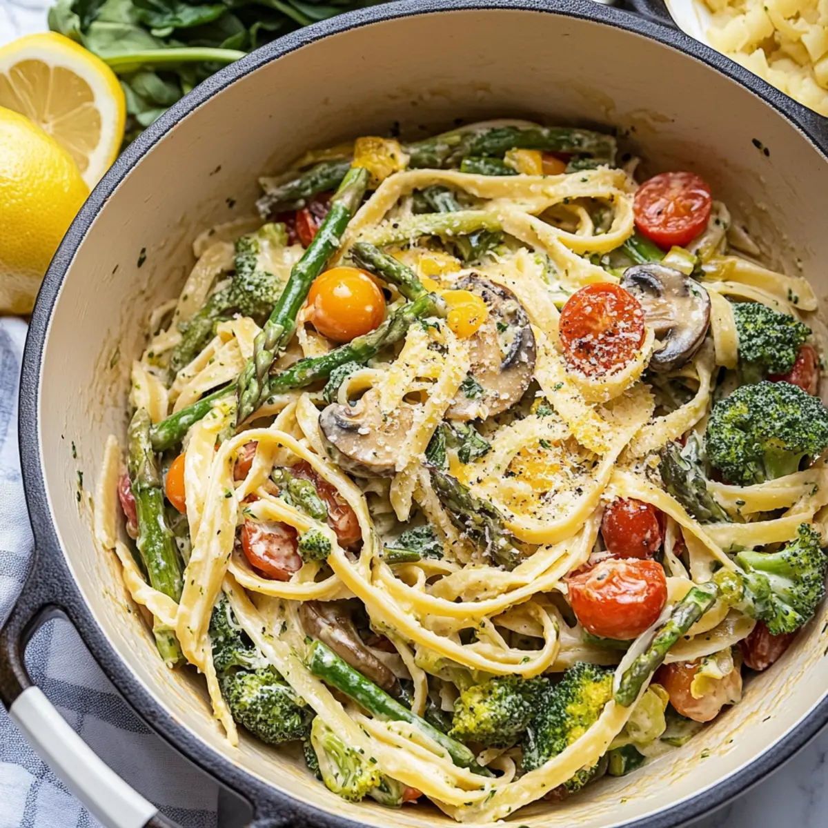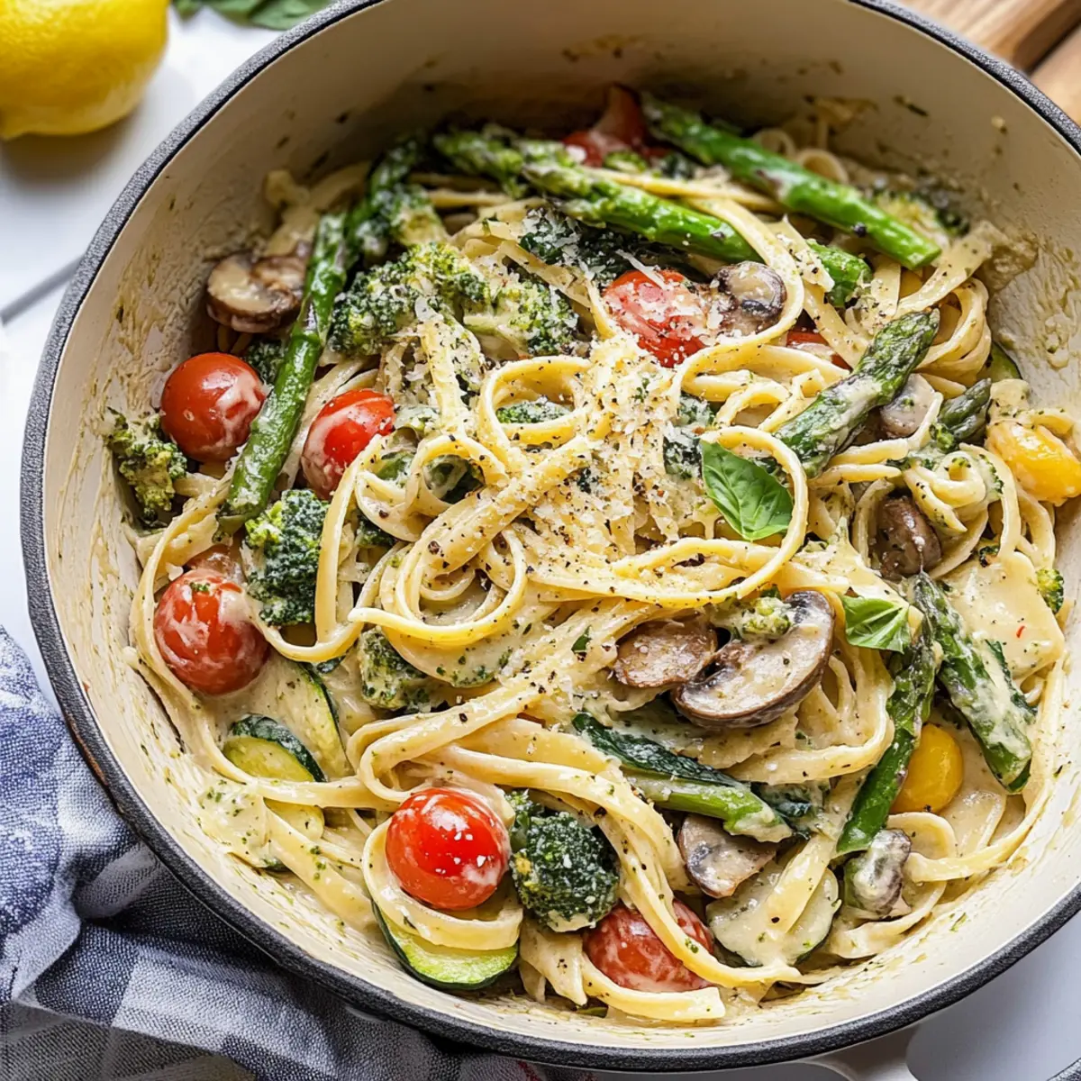 As I stood in my kitchen with a colorful array of fresh spring vegetables, I could feel the excitement of creating something special. That’s when I decided to whip up a dish that perfectly celebrates the season: Creamy Spring Pasta Primavera. This delightful recipe combines a medley of sautéed veggies—think crunchy asparagus, tender broccoli, and juicy cherry tomatoes—all enveloped in a rich Parmesan cream sauce. Not only is this dish a feast for the eyes, but it’s also a quick 40-minute wonder, making it the ideal choice for family dinners or delicious meal prep. Plus, with the freedom to swap in your favorite seasonal vegetables, you can tailor it to your taste. Ready to discover how to bring the essence of spring to your dinner table? Let’s dive in! Why is Spring Pasta Primavera a Must-Try? Vibrant, Fresh Ingredients: This recipe celebrates the season with a colorful array of vegetables. Easy Preparation: In just 40 minutes, you can whip up a delicious meal, perfect for busy weeknights or gatherings. Customizable Flavor: Swap in your favorite veggies or add proteins like shrimp for a heartier dish. Creamy Comfort: The rich Parmesan cream sauce elevates every bite, making it a crowd-pleaser. Health-Conscious Choice: Packed with nutrients from fresh produce, this dish aligns with your healthy eating goals. Experience the joy of homemade goodness that everyone will love! If you enjoy this, you’ll also want to check out my Cajun Chicken Pasta for more wholesome inspiration! Spring Pasta Primavera Ingredients Here’s everything you need to create a delightful plate of Spring Pasta Primavera! For the Pasta Dry fettuccine pasta – Forms the base of the dish; any similar pasta like linguine or spaghetti can sub. For the Creamy Sauce Unsalted butter – Adds creaminess to the sauce; margarine can be used as a substitute. All-purpose flour – Thickens the sauce; a gluten-free flour blend can replace it for gluten-free versions. Heavy whipping cream – Provides richness; half-and-half or evaporated milk can substitute for a lighter version. 2% or skim milk – Balances the creaminess; any milk type works. Grated Parmesan cheese – Offers salty umami; nutritional yeast can replace for a dairy-free option. Grated lemon zest – Adds brightness to the flavor. Fresh lemon juice can enhance the sauce’s freshness. Minced fresh basil – Imparts aromatic herbal notes; dried basil can suffice in a pinch. For the Vegetables Extra-virgin olive oil – Essential for sautéing vegetables, adds flavor. Use any light vegetable oil if unavailable. Fresh asparagus – Adds crunch and a fresh, earthy flavor. Can substitute with green beans. Fresh broccoli – Provides texture and a touch of bitterness. Other greens like kale can be used. Sliced mushrooms – Contributes depth of flavor and umami. Any mushrooms can substitute, including cremini or shiitake. Zucchini – Offers moisture and mild sweetness; can be swapped for yellow squash. Garlic – Enhances overall savoriness; fresh is best, but garlic powder can work in a pinch. Cherry tomatoes – Adds natural sweetness and color. Grape tomatoes or sun-dried tomatoes are good alternatives. Baby spinach – Provides nutrients and wilts down nicely; can replace with arugula for a peppery flavor. Frozen peas – Sweet and easy; fresh peas can also be used when in season. Seasoning Salt and pepper – For seasoning; adjust according to taste. Prepare to enjoy the abundance of spring with this deliciously creamy and inviting Spring Pasta Primavera! Step‑by‑Step Instructions for Spring Pasta Primavera Step 1: Sauté the Vegetables In a large skillet, heat 2 tablespoons of extra-virgin olive oil over medium-high heat. Add the asparagus, broccoli, sliced mushrooms, and zucchini, sautéing for 3–5 minutes until they are just tender and vibrant in color. Stir frequently to prevent sticking, and enjoy the delightful aroma filling your kitchen as the vegetables begin to soften. Step 2: Add Garlic and Spinach Next, lower the heat slightly and add minced garlic, cherry tomatoes, baby spinach, and frozen peas to the skillet. Continue cooking for another 2–3 minutes until the spinach wilts and the cherry tomatoes burst slightly, releasing their juices. Season the mixture generously with salt and pepper, then set the colorful vegetable medley aside in a bowl. Step 3: Cook the Pasta Bring a large pot of salted water to a rolling boil over high heat. Add the dry fettuccine pasta and cook according to package instructions, generally about 8–10 minutes, until it’s al dente with a slight bite. Before draining, reserve about ¾ cup of the pasta cooking water; then drain the pasta and set it aside. Step 4: Make the Creamy Sauce In the same skillet used for the vegetables, melt 2 tablespoons unsalted butter over medium heat. Whisk in 2 tablespoons of all-purpose flour, cooking until it turns golden, about 1–2 minutes. Gradually pour in 1 cup of heavy whipping cream and ½ cup of 2% milk, stirring continuously until the sauce bubbles and thickens, about 3–4 minutes, creating a creamy base for the Spring Pasta Primavera. Step 5: Combine Ingredients Once the sauce has thickened, remove the skillet from heat and whisk in ¾ cup of grated Parmesan cheese, 1 tablespoon of grated lemon zest, and ¼ cup of minced fresh basil. Stir well until the cheese is fully melted and incorporated into a creamy and flavorful sauce, adjusting seasoning with salt and pepper to taste. Step 6: Toss Everything Together Gently fold the cooked fettuccine pasta and sautéed vegetables back into the creamy sauce. If necessary, add the reserved pasta water a little at a time to achieve your desired consistency, creating a luscious coating for the pasta. Serve your vibrant Spring Pasta Primavera warm, garnished with extra Parmesan and basil for a finishing touch. Spring Pasta Primavera Variations Feel free to explore these delightful twists to make the dish truly your own! Seasona