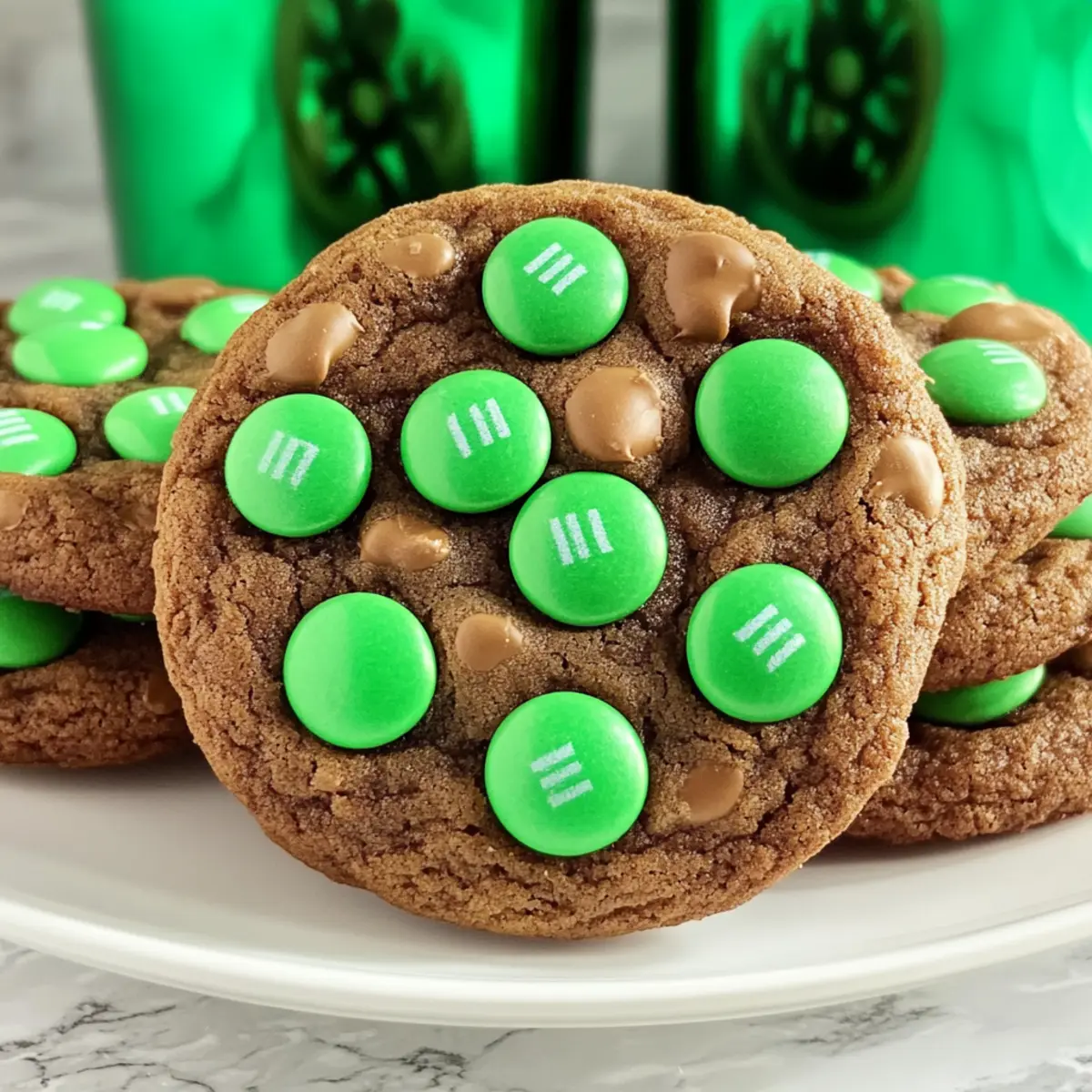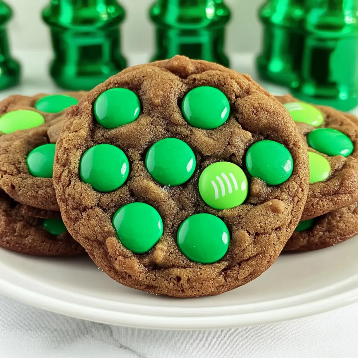 As the scent of peppermint wafts through the air, it’s hard not to feel the excitement of St. Patrick’s Day right around the corner! That’s why I’m thrilled to share my recipe for St. Patrick’s Day Mint M&M Cookies, the perfect mash-up of festive fun and delightful flavor. These cookies are a breeze to whip up, making them an excellent choice for last-minute baking. With a soft, cake-like texture and that satisfying crunch from Mint M&M candies, they’re bound to be a hit at any gathering. Plus, they’re colorful enough to brighten up your celebration. Want to know my secret for ensuring they turn out perfectly every time? Scroll down for the full recipe and tips! Why Are These Cookies a Must-Make? Festive Delight: With vibrant green Mint M&M’s, these cookies bring a splash of color to your St. Patrick’s Day celebrations. Easy Preparation: Whip them up with just a few simple ingredients and minimal effort, making them the ultimate last-minute treat. Unique Flavor Fusion: The combination of chocolate and refreshing mint creates a delightful taste that will have everyone reaching for more. Soft and Chewy Texture: Each bite offers a cake-like, chewy consistency that contrasts perfectly with the crunchy candies, elevating your cookie experience. Crowd-Pleasing Treat: They’re perfect for parties, gatherings, or just to enjoy at home – everyone will love these festive bites! For more fun and delicious cookie ideas, check out my Cinnamon Roll Cookies or my Chewy Brown Butter Chocolate Chip Cookies. St. Patrick’s Day Mint M&M Cookies Ingredients • These ingredients will help you create the festive cookies that everyone will love! For the Cookie Dough Butter (Sweet Cream, Salted) – Adds richness and moisture; ensure it’s softened for easy mixing. Granulated Sugar – Provides essential sweetness and structure to your cookies. Brown Sugar (packed) – Contributes moisture and deep caramel notes for a richer flavor. Eggs – Acts as a binder for the dough, ensuring perfect cookie texture. Vanilla Extract – Enhances overall flavor; opt for pure vanilla for the best taste. All-Purpose Flour – Builds structure; avoid over-measuring to prevent dense cookies. Unsweetened Cocoa Powder – Infuses cookies with rich chocolate flavor; make sure it’s unsweetened. Baking Soda – A leavening agent that ensures a light and airy texture. Salt – Balances the sweetness and elevates the flavor. For the Topping Dark Chocolate Mint M&M’s – The stars of the show! Use these for a festive touch and minty crunch in your St. Patrick’s Day Mint M&M Cookies. Step‑by‑Step Instructions for St. Patrick’s Day Mint M&M Cookies Step 1: Preheat the Oven Begin by preheating your oven to 350°F (175°C). This is an essential step to ensure your cookies bake evenly and achieve that perfect soft texture. While the oven warms up, gather your baking sheets and line them with parchment paper to prevent the cookies from sticking. Step 2: Mix the Dry Ingredients In a medium bowl, combine the all-purpose flour, unsweetened cocoa powder, baking soda, and salt. Whisk the mixture together until well blended; it should have a uniform color and texture. This step helps aerate the flour and ensures the leavening agents are evenly distributed, setting a solid foundation for your St. Patrick’s Day Mint M&M Cookies. Step 3: Cream the Butter and Sugars In a large mixing bowl, use a hand mixer or stand mixer to cream together the softened butter, granulated sugar, and packed brown sugar. Beat on medium speed for about 3-4 minutes until the mixture is light, fluffy, and pale in color. This process is crucial as it incorporates air into the mixture, contributing to the cookies’ delightful texture. Step 4: Add Eggs and Vanilla Next, beat in the eggs, one at a time, ensuring each is fully incorporated before adding the next. Pour in the pure vanilla extract and mix until everything is well combined. The egg mixture should appear smooth and glossy, giving a rich base for your St. Patrick’s Day Mint M&M Cookies. Step 5: Combine Wet and Dry Mixtures Gradually add the dry mixture to the wet ingredients, folding it in with a spatula or mixing on low speed. Mix just until combined; be careful not to overmix, which can lead to tough cookies. You’ll know it’s ready when there are no visible flour clumps and the batter has a rich chocolate color. Step 6: Form the Cookie Dough Using a cookie scoop or your hands, roll the dough into balls, each about 1.5 ounces. Place the cookie dough balls on the lined baking sheet, leaving around 2 inches of space between each ball to allow for spreading. As you do this, admire how the dough looks rich and inviting, setting the stage for your flavorful St. Patrick’s Day Mint M&M Cookies. Step 7: Add Mint M&M’s Gently press a few Mint M&M candies into the top of each cookie dough ball, ensuring they’re evenly spaced for a festive touch. This not only adds color but also ensures a delicious minty crunch in every bite! The candies should sit slightly recessed into the dough, making them visually appealing and tasty. Step 8: Bake the Cookies Place the baking sheet in the preheated oven and bake for 9 to 11 minutes or until the cookies are just set but still soft in the center. They should puff up and have slightly cracked surfaces. Resist the urge to over-bake; they’ll continue to set as they cool on the sheet, resulting in perfect St. Patrick’s Day Mint M&M Cookies. Step 9: Cool Before Serving Once baked, remove the baking sheet from the oven and let the cookies cool on the sheet for about 5 minutes. This allows them to firm up without breaking. After cooling briefly, transfer the cookies to wire racks to cool completely. The cookies will be soft and chewy, delivering that delightful fullness with every bite. What to Serve with St. Patrick’s Day Mint M&M Cookies Delight your taste buds with a full meal highlighting these festive, minty treats, perfect for celebrat
