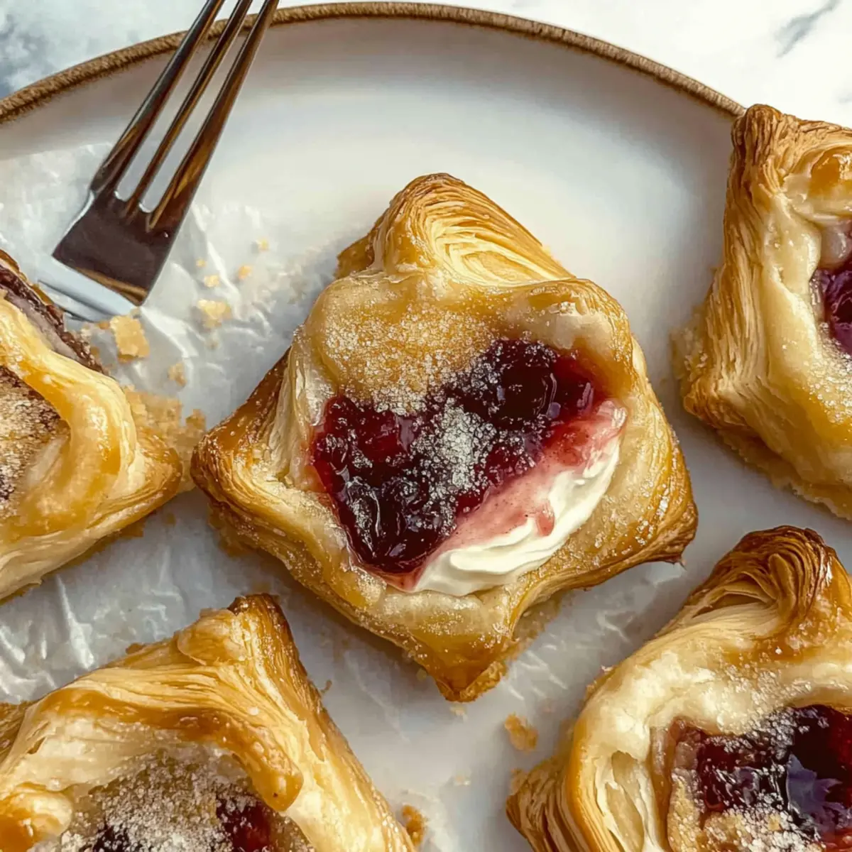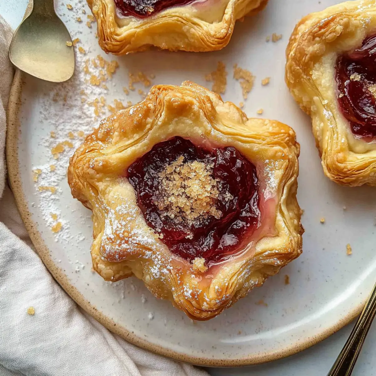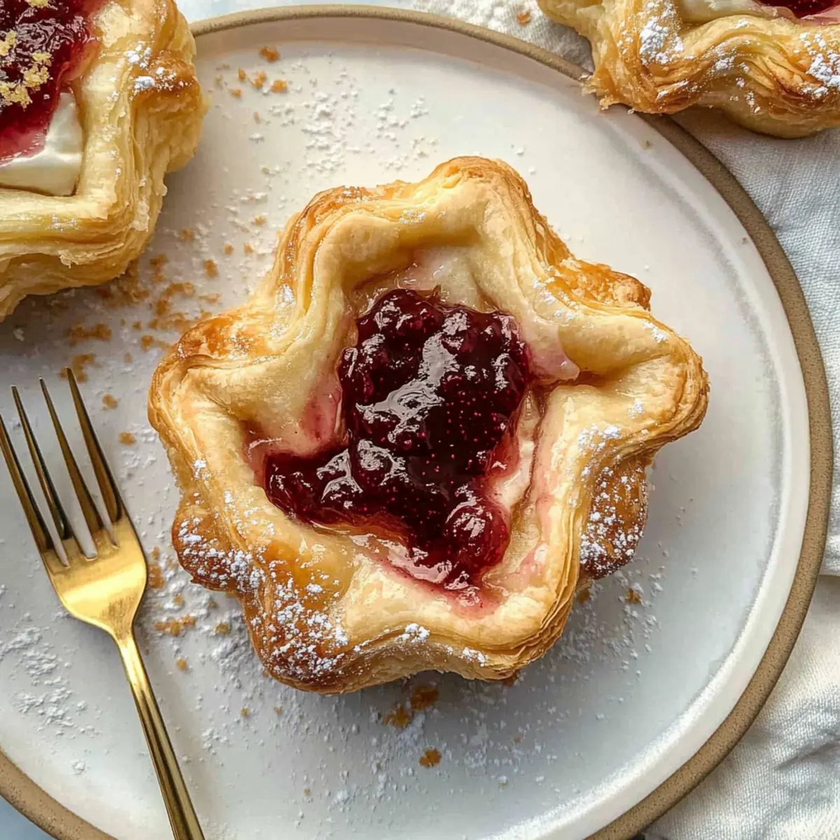 As winter wraps its chilly fingers around us, the longing for cozy indulgences grows stronger. One of my favorite delights for the season is the Gluten-Free Starbucks Sugar Plum Danish—a sweet, festive pastry that warms both heart and home. This recipe captures the essence of the beloved Starbucks treat, with a flaky gluten-free crust cradling a creamy cheese filling and a vibrant plum jam. It’s not just a treat for the taste buds; it’s a quick bake that can be whipped up in just 30 minutes, making it perfect for those busy mornings or holiday gatherings. Plus, you can easily customize the jam to fit your taste or dietary needs! So, are you ready to step into your kitchen and recreate this delightful pastry? Why is this Danish recipe irresistible? Quick Baking: You can enjoy this delicious pastry in just 30 minutes, perfect for those busy mornings when you crave something special. Gluten-Free Goodness: This recipe offers a flaky, satisfying crust that invites everyone to the table, with no need to compromise on taste. Festive Flavor: The rich combo of sweet cream cheese and vibrant plum jam captures the essence of winter celebrations, bringing warmth to every bite. Versatile Fillings: Feel free to swap in your favorite jams or even experiment with flavors like pumpkin pie filling for a fun twist! Coffee Shop Quality at Home: Skip the long lines at Starbucks; with this easy copycat recipe, you can have café-worthy pastries right from your own kitchen. For more fun baking ideas, check out my recipes for Fruity Pebble Sugar cookies and Cinnamon Sugar Cruffins. Starbucks Sugar Plum Danish Ingredients For the Cream Cheese Filling • Cream Cheese – Adds creaminess and tang; ensure it’s softened for easy mixing. • Granulated Sugar – Sweetens the filling; consider substituting with a low-calorie sweetener for a healthier twist. • Lemon Juice – Brightens the flavor; feel free to swap with lime juice if needed. • Vanilla Extract – Enhances sweetness; opt for pure vanilla for the best flavor. • Salt – Balances sweetness; a small yet crucial ingredient for depth of flavor. For the Jam Filling • Plum Jam – Provides fruity sweetness; substitute with seedless raspberry, strawberry, or mixed berry jam for variety. • Cinnamon – Adds warmth and spice; consider including nutmeg and cloves for deeper flavor notes. For the Pastry • Gluten-Free Puff Pastry – The delightful base of this Danish; you can use store-bought gluten-free pastry for convenience. • Egg – Used for the egg wash; gives the pastry a golden-brown finish. Feel free to gather these ingredients, and let’s create a cozy moment in your kitchen with this delicious Starbucks Sugar Plum Danish! Step‑by‑Step Instructions for Starbucks Sugar Plum Danish Step 1: Preheat the Oven Begin by preheating your oven to 425°F (220°C). This is crucial for ensuring a beautifully flaky and crispy pastry. While the oven heats, you can gather your ingredients and get everything ready for assembling your delicious Starbucks Sugar Plum Danish. Step 2: Prepare Cream Cheese Filling In a mixing bowl, combine softened cream cheese, granulated sugar, lemon juice, vanilla extract, and a pinch of salt. Using an electric mixer or a whisk, blend until the mixture is smooth and creamy, about 2-3 minutes. This filling will be the creamy heart of your danish, so make sure there are no lumps. Step 3: Prepare Jam Filling In another bowl, stir together the plum jam and cinnamon, adding any additional spices if desired for extra warmth. Mix until thoroughly combined, about 1 minute. The jam will provide a delightful burst of flavor atop the cream cheese filling in your Starbucks Sugar Plum Danish. Step 4: Shape the Pastry Roll out your gluten-free puff pastry on a lightly floured surface into 6 rectangles or rounds, about 1/4 inch thick. Once shaped, use a fork to poke holes in each piece to prevent bubbling during baking. This step is essential for achieving that perfect flaky texture. Step 5: Fill the Pastry Spoon a generous dollop of the cream cheese filling into the center of each pastry shape, taking care not to overfill. Leave enough space around the edges for sealing. It’s important to get the right balance; you don’t want the filling to ooze out while baking. Step 6: Bake Base Place the filled pastries on a parchment-lined baking sheet and bake in your preheated oven for about 10 minutes. You want the edges to turn golden and the pastry to puff up nicely. Keep an eye on them, as gluten-free pastries can sometimes bake faster than conventional ones. Step 7: Add Jam Filling After 10 minutes, carefully remove the pastries from the oven. Spoon a small amount of the prepared jam filling onto the center of each danish, swirling it gently into the cream cheese filling. If desired, sprinkle some coarse sugar on top to enhance the sweetness of your Starbucks Sugar Plum Danish. Step 8: Final Bake Return the pastries to the oven and bake for an additional 4-6 minutes, or until the tops are golden brown and the jam is bubbling slightly. This final bake will create that irresistible golden crust and melty filling that makes these danishes so delightful. Step 9: Cool Once baked, remove the danishes from the oven and let them cool on a wire rack for a few minutes before serving. This cooling time allows the filling to set slightly, making your delicious Starbucks Sugar Plum Danish easier to enjoy while still warm. How to Store and Freeze Starbucks Sugar Plum Danish Room Temperature: Store leftovers in an airtight container at room temperature for 1-2 days to keep them fresh without losing their delightful texture. Fridge: For longer storage, keep the danishes in the refrigerator for up to 5 days. Make sure they are well-wrapped to prevent them from drying out. Freezer: If you want to keep them even longer, freeze the cooled danishes in a single layer on a baking sheet, then transfer to an airtight freezer bag for up to 3 months. Rehea