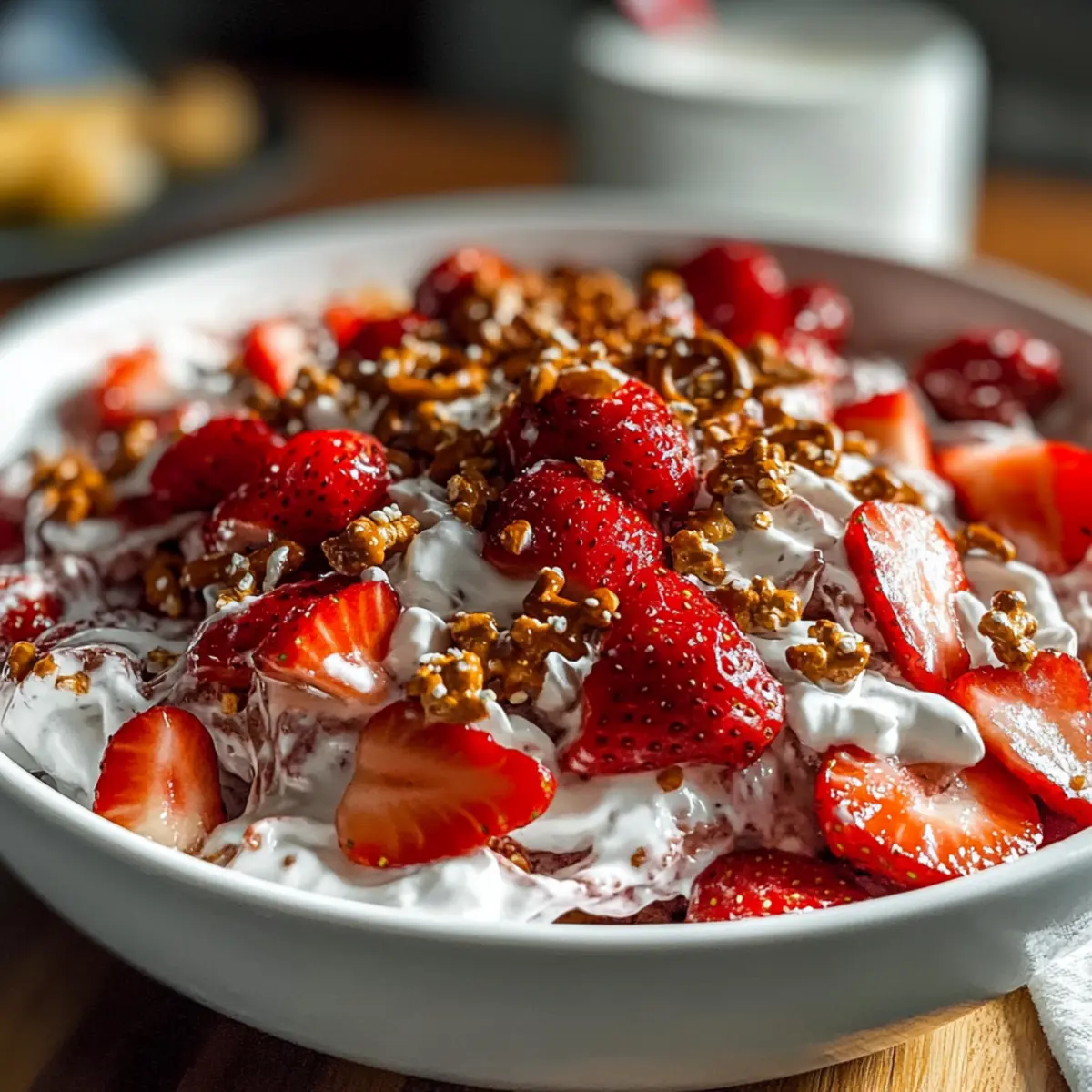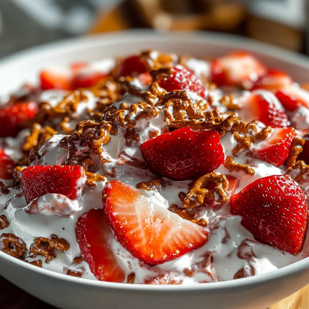 Standing in my kitchen, I can almost hear the laughter of friends and family gathered around a picnic table, enjoying endless summer afternoons. That’s the essence captured in my refreshing Strawberry Crackle Salad—a delightful medley of sweet, juicy strawberries, crispy pretzel bits, and creamy goodness that instantly transports you back to those carefree days. This isn’t just any salad; it’s a dessert salad that perfectly balances flavors and textures, making it a crowd-pleaser at your next gathering or BBQ. With its quick prep and nostalgic twist, you’ll find it’s as easy to whip up as it is to devour. Ready to revive those sun-soaked memories and create new ones? Why is Strawberry Crackle Salad a must-try? Nostalgic Appeal: This Strawberry Crackle Salad brings back fond memories of summer picnics, blending sweet strawberries with crunchy pretzels. Effortless Preparation: With just a few simple steps, you can create a stunning dish that looks and tastes gourmet. Crowd-Pleasing Delight: It’s a dessert salad that delights both kids and adults alike, making it perfect for gatherings and BBQs. Versatile Ingredients: Easily adaptable for dietary preferences, whether swapping for gluten-free options or non-dairy ingredients. Try it alongside other fresh delights like Cucumber Caprese Salad for a refreshing meal! Quick Chill Time: Simply refrigerate for an hour, and it’s ready to impress your guests without a long wait. Strawberry Crackle Salad Ingredients • Get ready to whip up a refreshing and delightful dish! For the Crunch Mix Crushed Pretzels – Provides a delightful crunch; gluten-free pretzels can substitute for a gluten-free version. Chopped Pecans – Adds a nutty flavor; feel free to use walnuts or almonds as alternatives. Brown Sugar – Sweetens the pretzel mixture; coconut sugar is a lower processed option to consider. Butter (melted) – Binds everything together; margarine or a dairy-free butter alternative works for a vegan twist. For the Creamy Base Sliced Strawberries – The star of the salad, lending sweetness; swap for other berries like raspberries or blueberries if you wish. Cream Cheese (softened) – Adds a rich, creamy texture; opt for non-dairy cream cheese for a dairy-free version. Granulated Sugar – Enhances the sweetness of the cream cheese mixture; honey or agave syrup can serve as a substitute. Vanilla Extract – Infuses additional flavor; almond extract provides a wonderful alternative. Cool Whip – Creates a light and airy finish; homemade whipped cream or vegan options also work beautifully. Now that you’ve gathered your ingredients, you’re one step closer to enjoying this delightful Strawberry Crackle Salad! Step‑by‑Step Instructions for Strawberry Crackle Salad Step 1: Preheat the Oven Begin by preheating your oven to 400°F (200°C). While the oven heats, line a baking sheet with parchment paper. This will help prevent sticking and ensure even cooking. Step 2: Prepare the Crunch Mixture In a medium bowl, combine the crushed pretzels, chopped pecans, and brown sugar. Mix well to distribute the ingredients evenly, then pour in the melted butter. Stir until the mixture is fully combined and the pretzels are coated, creating a delightful crunch for your Strawberry Crackle Salad. Step 3: Bake the Crunch Spread the pretzel mixture onto the prepared baking sheet, ensuring it is evenly distributed. Bake for 8–10 minutes, or until the mixture is bubbly and slightly golden. Keep an eye on it to prevent burning. Once done, remove from the oven and let it cool completely. Step 4: Prepare the Creamy Base In a large mixing bowl, beat softened cream cheese, granulated sugar, and vanilla extract together until the mixture is smooth and creamy. This will form the luscious base of your Strawberry Crackle Salad. Step 5: Fold in the Whipped Topping Gently fold in the Cool Whip into the cream cheese mixture, being careful to maintain its airy texture. This lightens the mixture beautifully and enhances the overall richness of the salad. Once combined, place the bowl in the refrigerator for at least one hour to chill before serving. Step 6: Combine the Ingredients When you’re ready to serve, gently fold in the sliced strawberries and half of the cooled pretzel crunch into the chilled cream mixture. This step brings together the bright, juicy flavors with the creamy goodness, creating a delightful contrast in textures. Step 7: Serve the Strawberry Crackle Salad Transfer the combined salad into a serving dish and top with the remaining pretzel crunch for an added layer of texture. The Strawberry Crackle Salad is now ready to impress your guests, offering a delicious and refreshing treat for any occasion! Expert Tips for Strawberry Crackle Salad Cool the Crunch: Allow the pretzel mixture to cool completely before breaking it into pieces to ensure that it maintains its delightful crunch in the salad. Chill for Flavor: For the best flavor experience, refrigerate the salad for at least one hour before serving. This allows the creamy base to meld beautifully with the strawberries. Gentle Folding: When combining the Cool Whip and cream cheese, use a gentle folding technique to maintain the light and airy texture that defines this Strawberry Crackle Salad. Taste and Adjust: Don’t hesitate to adjust the sweetness! Taste the creamy mixture and add more sugar or honey if you prefer a sweeter salad. Berry Substitutions: Feel free to mix it up! Use a combination of berries like blueberries or raspberries for a different twist on the classic flavors, while keeping the nostalgia intact. How to Store and Freeze Strawberry Crackle Salad Refrigerator: Keep the Strawberry Crackle Salad in an airtight container for up to 2–3 days. It’s best enjoyed fresh, but refrigerating helps maintain its creamy texture and flavors. Freezer: It’s not recommended to freeze the salad, as the creamy components don’t thaw well, which could affect its delightful texture. 