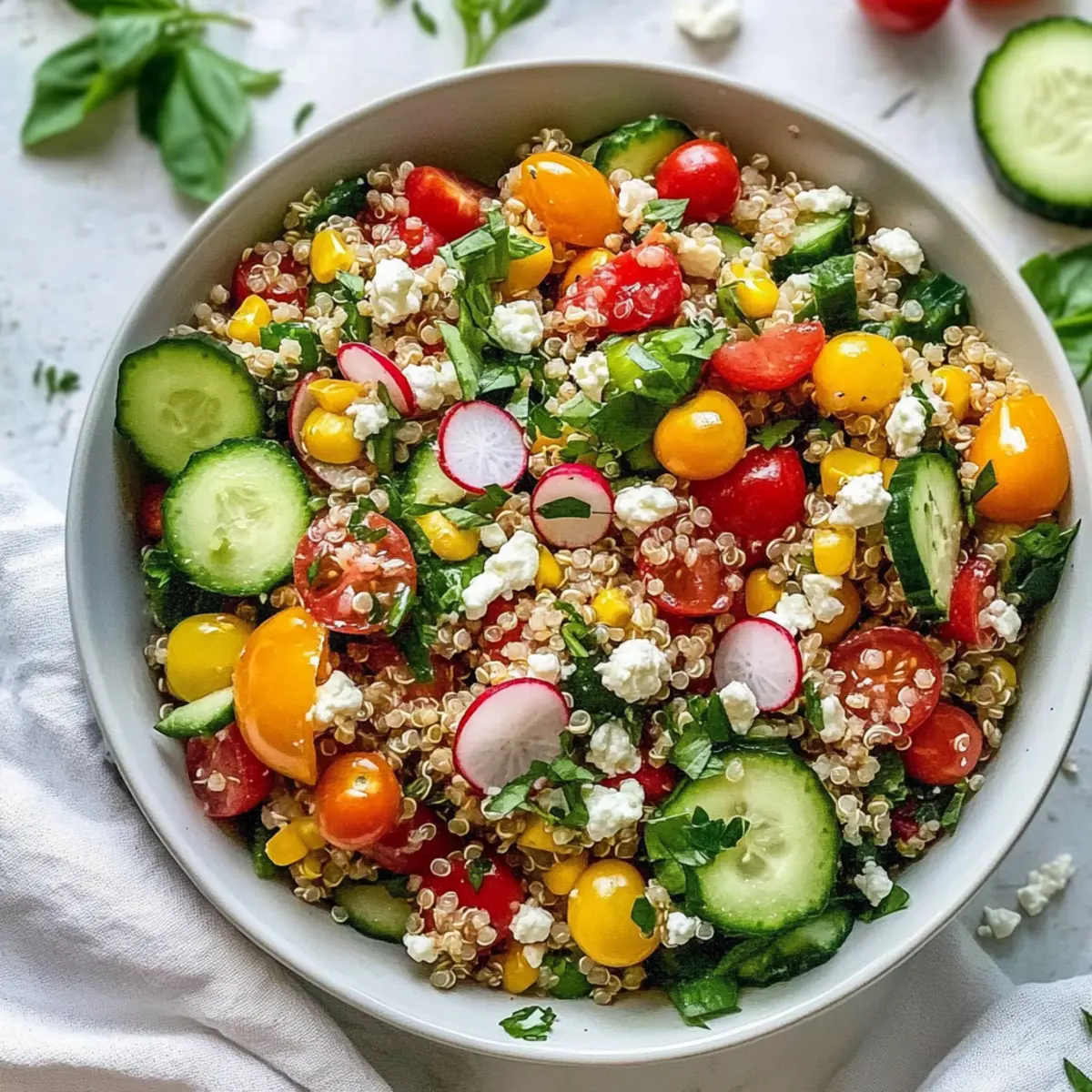 As I savored the first bite of my colorful Summer Grain Salad, a wave of sunshine seemed to hit my palate. With its blend of quinoa, farro, and vibrant garden veggies, this dish offers a delightful harmony of textures—perfect for embracing those warm, carefree days. Easy to whip up and ideal for meal prep, this salad shines as a guilt-free indulgence that satisfies while still allowing you to enjoy leisurely summer evenings. With the potential for a gluten-free twist based on your grain choice, it’s a versatile staple that can adapt to whatever you have on hand. Are you ready to explore how simple fresh ingredients can create a dish that not only looks good but tastes like summer in a bowl? Why is this Summer Grain Salad amazing? Vibrant, Wholesome Ingredients: The colorful medley of quinoa, farro, and fresh veggies brings bright flavors and essential nutrients to your table. Customizable Variety: Easily swap ingredients based on your preferences or what’s in season, allowing for endless creativity! Add smoky chickpeas or tender grilled chicken for a protein boost. Make-Ahead Delight: Perfect for weekly meal prep, this salad stays fresh for days, developing deeper flavors with time—ideal for busy schedules! Crowd-Pleasing Option: Serve it at gatherings, and watch it disappear! This salad works wonderfully alongside grilled meats or even as a stand-alone dish. Gluten-Free Possibilities: For those avoiding gluten, simply choose quinoa or other gluten-free grains to cater to everyone’s needs. Tantalizing and versatile, just like refreshing salads such as Cucumber Caprese Salad and Crab Pasta Salad! Summer Grain Salad Ingredients • Get ready for a delightful dish! For the Grains Quinoa – A protein-packed base that adds a nutty flavor; great gluten-free option! Farro – Offers a chewy, earthy bite; can be swapped with brown rice for a different texture. For the Vegetables Radishes – Introduce a peppery crunch; could use carrots for sweetness if you prefer. Cherry Tomatoes – Their sweetness bursts with every bite; grape tomatoes are a perfect substitution. Cucumber – Adds refreshing crunch; firm radishes can work in a pinch if cucumber isn’t available. Yellow Bell Pepper – For sweetness and bright color; red or orange peppers make a fine alternative. Green Beans – Crispy texture makes this salad vibrant; asparagus would be another great swap. Corn – Sweet and crunchy, raw is best; use canned corn in a pinch if fresh isn’t available. Red Onion – Imparts a sharp flavor; scallions can offer a milder twist if desired. For the Dressing White Wine Vinegar – Provides tang to the vinaigrette; apple cider vinegar can also do the trick. Lemon Juice – Brightens the flavors; feel free to swap with lime juice for a fun twist. Shallot – Adds aromatic depth; minced onion is a good alternative. Garlic – Deepens the dressing’s flavor profile; adjust quantity to suit your taste. Salt & Pepper – Essential for a balanced flavor; don’t hesitate to taste as you season! For the Finish Feta Cheese – Creamy saltiness enhances the salad; goat cheese can be substituted for a rich flavor. Fresh Basil, Parsley, Chives – Fresh herbs brighten up the dish beautifully; feel free to mix your favorites before serving. Now that you have all the ingredients ready to go, let the cooking adventure begin! Your Summer Grain Salad will soon become a centerpiece at your table, radiating joy and freshness. Step‑by‑Step Instructions for Summer Grain Salad Step 1: Cook the Grains Start by rinsing 1 cup of quinoa and 1 cup of farro under cold water. In separate pots, cook the quinoa in 2 cups of water and the farro in 3 cups of water according to package instructions—usually about 15 minutes for quinoa and 25 minutes for farro—until each is tender and the water is absorbed. Once cooked, fluff the quinoa and farro with a fork and transfer them into a large mixing bowl. Step 2: Blanch the Green Beans Bring a small pot of water to a rolling boil. Add 1 cup of trimmed green beans to the boiling water and blanch for about 30 seconds until they are bright green and tender-crisp. Immediately drain the green beans and plunge them into a bowl of ice water to stop the cooking process. Once cooled, drain again and cut them into bite-sized pieces before adding them to the bowl with the grains. Step 3: Prepare the Vegetables Dice 4 radishes, halve 1 cup of cherry tomatoes, and chop 1 cucumber and 1 yellow bell pepper into small pieces. Add these vibrant veggies, along with 1 cup of corn (or canned if needed) and ¼ cup of thinly sliced red onion, to the bowl with the quinoa and farro. Season generously with salt and pepper to enhance the flavors and stir gently to combine all the ingredients. Step 4: Crumble the Feta Crumble ½ cup of feta cheese over the assembled salad in the bowl. The creamy feta adds a delightful saltiness and richness to the Summer Grain Salad. Use a spatula or wooden spoon and toss gently to mix everything together, being careful not to break up the feta too much. Step 5: Make the Dressing In a separate bowl, whisk together 3 tablespoons of white wine vinegar, 2 tablespoons of fresh lemon juice, 1 finely chopped shallot, and 1 minced garlic clove. Gradually drizzle in ¼ cup of extra virgin olive oil while whisking to emulsify the dressing. Season with a pinch of salt and pepper and taste to adjust for acidity if needed. Step 6: Combine Salad and Dressing Pour the vinaigrette over the prepared Summer Grain Salad in the mixing bowl. Add a handful of fresh herbs, such as basil, parsley, and chives, and toss gently to coat all the ingredients evenly with the dressing. This step enriches your salad with bright, fresh flavors that sparkle in every bite. Step 7: Serve or Refrigerate Serve the Summer Grain Salad immediately or refrigerate for at least 30 minutes to let the flavors meld. The salad can be enjoyed cold and is perfect for meal prep, keeping well in the fridge for 3-