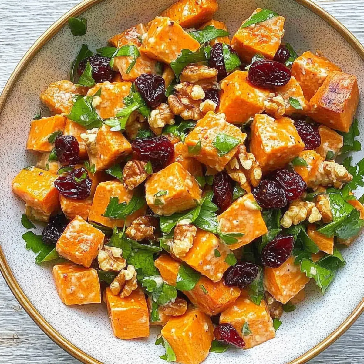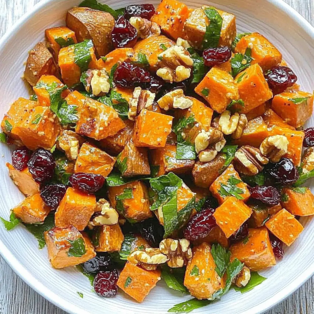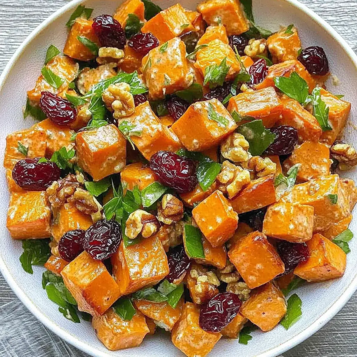 This Sweet Potato Salad is a flavorful, gluten-free dish perfect for potlucks, featuring roasted sweet potatoes, walnuts, and dried cherries.