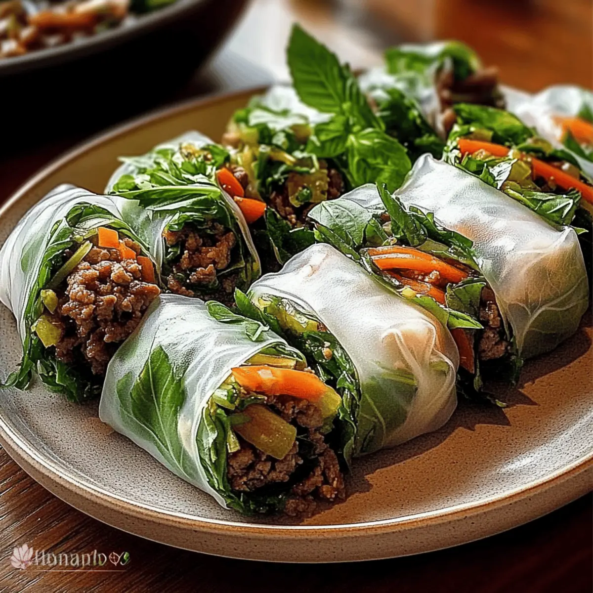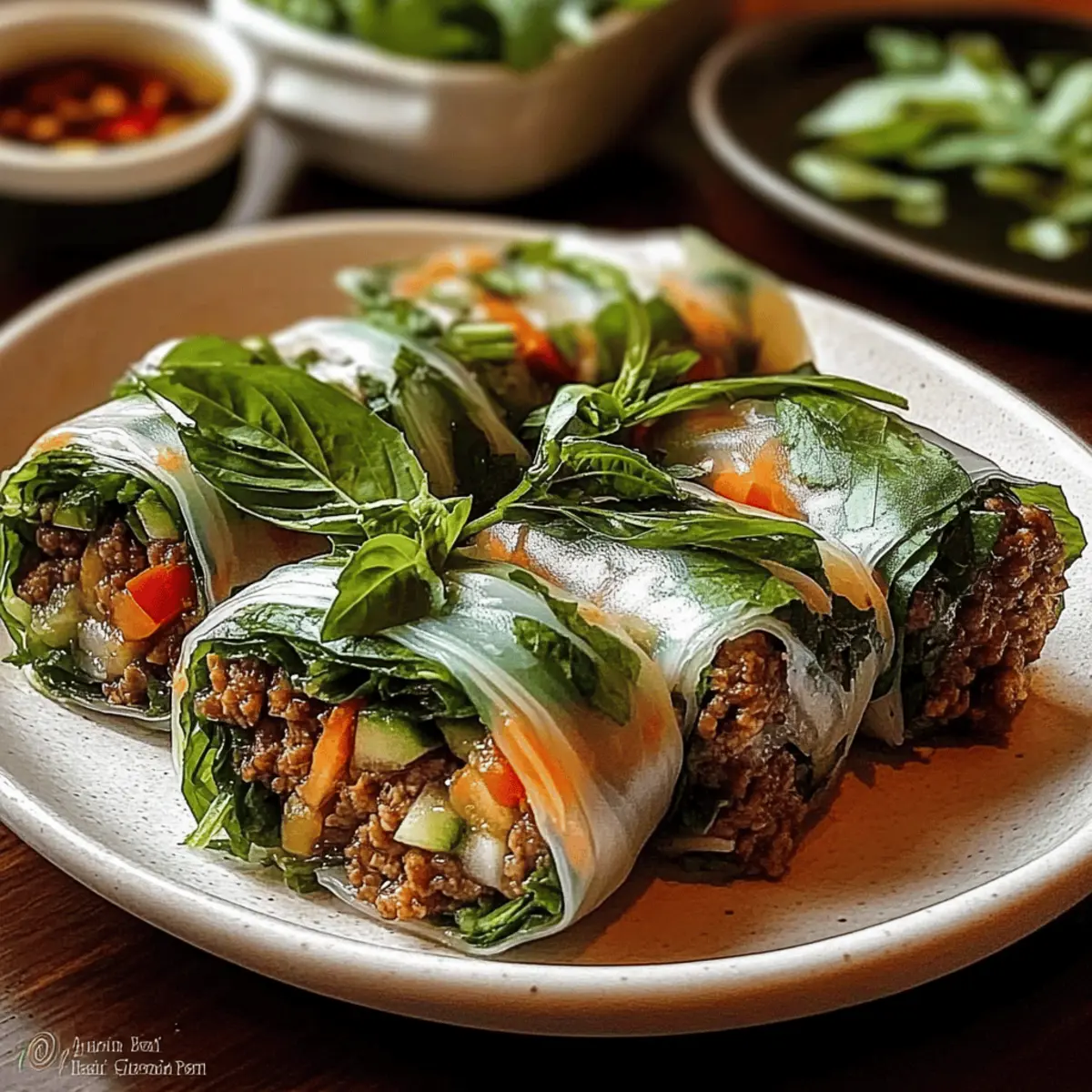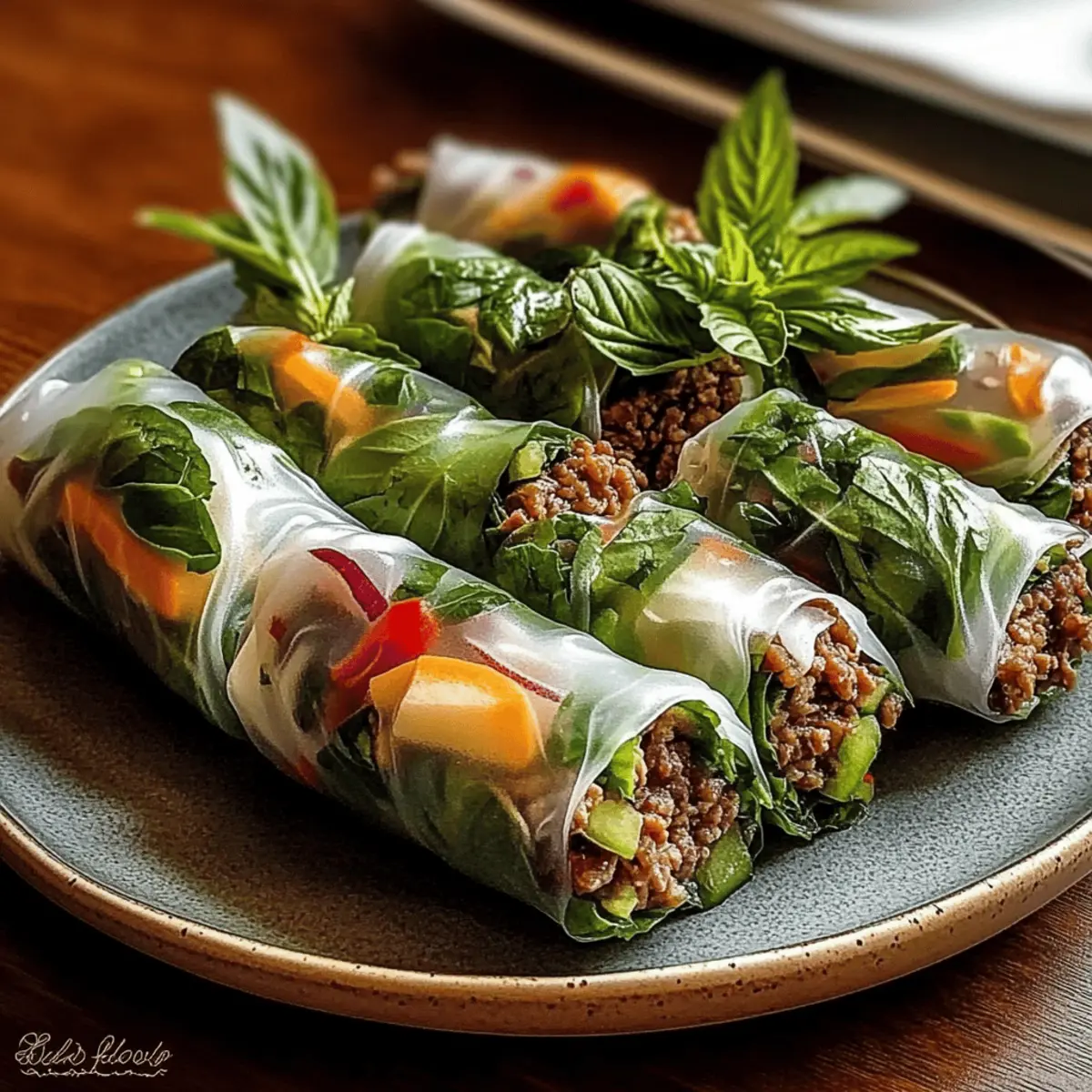 As I rolled up my sleeves and prepared for a Thai culinary adventure, the delightful aroma of fresh herbs wafted through my kitchen, whispering promises of vibrant flavors. These Thai Basil Beef Rolls are not just a meal; they’re a playful canvas for creativity, ensuring you can customize the fillings to suit your taste — be it fresh veggies or alternate proteins. With a gluten-free touch and ready in a flash, these rolls transform simple ingredients into a stunning dish that’s perfect for any occasion. They serve as a light yet satisfying option, making it easy to impress family or friends without spending hours in the kitchen. Curious to see how you can create your own delicious rolls? Let’s dive in! Why Are Thai Basil Beef Rolls Perfect? Customization Galore: The beauty of these rolls lies in their ability to adapt. Swap in chicken, shrimp, or even tofu for a unique twist. Fresh and Flavorful: Each roll bursts with the aromatic essence of Thai basil and vibrant ingredients, elevating your meal experience. Quick Preparation: Dinner in a flash! You can whip these up in under 30 minutes, perfect for busy weeknights. Healthy Indulgence: With approximately 210 calories per roll, they make for a guilt-free treat, balancing protein and fresh flavors beautifully. Crowd-Pleasing Appeal: Whether for a family dinner or a friend’s gathering, these rolls are sure to impress! Pair with a refreshing Thai iced tea or your choice of dipping sauce from Cinnamon Roll Rolls for an unforgettable experience. Thai Basil Beef Rolls Ingredients For the Filling • Vegetable Oil – Adds fat for sautéing; consider using canola or sunflower oil for a neutral flavor. • Garlic – Provides aromatic depth; always use fresh minced garlic for the best flavor. • Shallot – Adds mild onion sweetness; can be replaced with green onions or finely chopped onion if desired. • Ground Beef (85/15) – The main protein source; juicy without excess grease, but leaner options may need added moisture. • Soy Sauce – Infuses the dish with umami and saltiness; opt for gluten-free tamari if necessary. • Oyster Sauce – Brings depth and sweetness; a plant-based alternative can be used for a vegetarian twist. • Brown Sugar – Balances flavors with sweetness; honey or maple syrup are great substitutes. • Fresh Lime Juice – Brightens the filling; it’s essential for achieving that fresh flavor balance. • Chili Flakes – Adds heat; adjust to taste or substitute with fresh Thai chilies to kick it up a notch. • Fresh Thai Basil Leaves – The star herb for authentic flavor; you can substitute or mix with fresh mint or cilantro. For the Wraps • Rice Paper Wrappers (8-10) – Encases all the delicious filling, providing a light texture; look for Vietnamese-style for the best results. • Optional Vegetables – Consider using julienned carrots, cucumbers, mint, cilantro, or green onions to enhance texture and flavor based on your preferences. For Dipping Sauce • Dipping Sauce – Essential for a flavorful finish; a soy-lime or chili-garlic blend can elevate your Thai Basil Beef Rolls. With these simple yet flavorful Thai Basil Beef Rolls ingredients, you’re well on your way to creating a delightful dish that’s sure to impress! Step‑by‑Step Instructions for Thai Basil Beef Rolls Step 1: Sauté Aromatics In a skillet, heat 1 tablespoon of vegetable oil over medium heat. Add 2 cloves of minced garlic and 1 finely chopped shallot, sautéing for about 1 minute until fragrant. Ensure they turn a light golden color to enhance their flavor. This aromatic base is key for your Thai Basil Beef Rolls. Step 2: Cook the Beef Add 1 pound of ground beef to the skillet, breaking it apart with a spatula. Cook for about 5 to 7 minutes or until the beef is browned and no longer pink. This will ensure your filling is juicy and packed with flavor, providing the perfect protein for your rolls. Step 3: Combine Sauces and Seasoning Stir in 2 tablespoons of soy sauce, 1 tablespoon of oyster sauce, 1 tablespoon of brown sugar, and a pinch of chili flakes. Allow this mixture to simmer for 2-3 minutes, stirring occasionally until it thickens slightly. The aroma will be intoxicating as it melds into the beef filling for your Thai Basil Beef Rolls. Step 4: Add Fresh Ingredients Remove the skillet from heat, and stir in the juice of half a fresh lime and a generous handful of fresh Thai basil leaves. Allow the mixture to cool for a few minutes, ensuring that the heat doesn’t damage the rice paper wrappers you’ll be using to assemble your rolls. Step 5: Prepare Rolling Station Fill a shallow bowl with warm water (not hot) and set it close to your workspace. Lay out the rice paper wrappers next to the bowl, along with the cooled beef mixture and any additional crunchy vegetables you want. This setup will streamline the process of assembling your Thai Basil Beef Rolls. Step 6: Soak Rice Paper Wrappers Take one rice paper wrapper and dip it in the warm water for about 5-10 seconds until it becomes pliable. Place it carefully on a clean, flat surface. The wrapper should be soft but not overly soggy, as this helps with rolling while maintaining a nice structure. Step 7: Fill the Wrapper At the lower edge of the moistened rice paper, add a small amount of the beef filling along with your choice of fresh herbs and optional vegetables. Aim for the filling to cover only about a third of the wrapper to allow enough space for rolling without overstuffing. Step 8: Roll It Up Fold the bottom of the rice paper wrapper over the filling, then tuck in the sides tightly to encase the filling. Roll it up gently but firmly from the bottom to the top, creating a neat cigar shape. This technique ensures that your Thai Basil Beef Rolls will hold together beautifully. Step 9: Repeat the Process Continue soaking, filling, and rolling the remaining rice paper wrappers with the beef filling until all ingredients are used. Keep finished rolls on a 