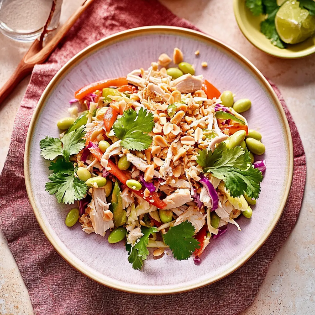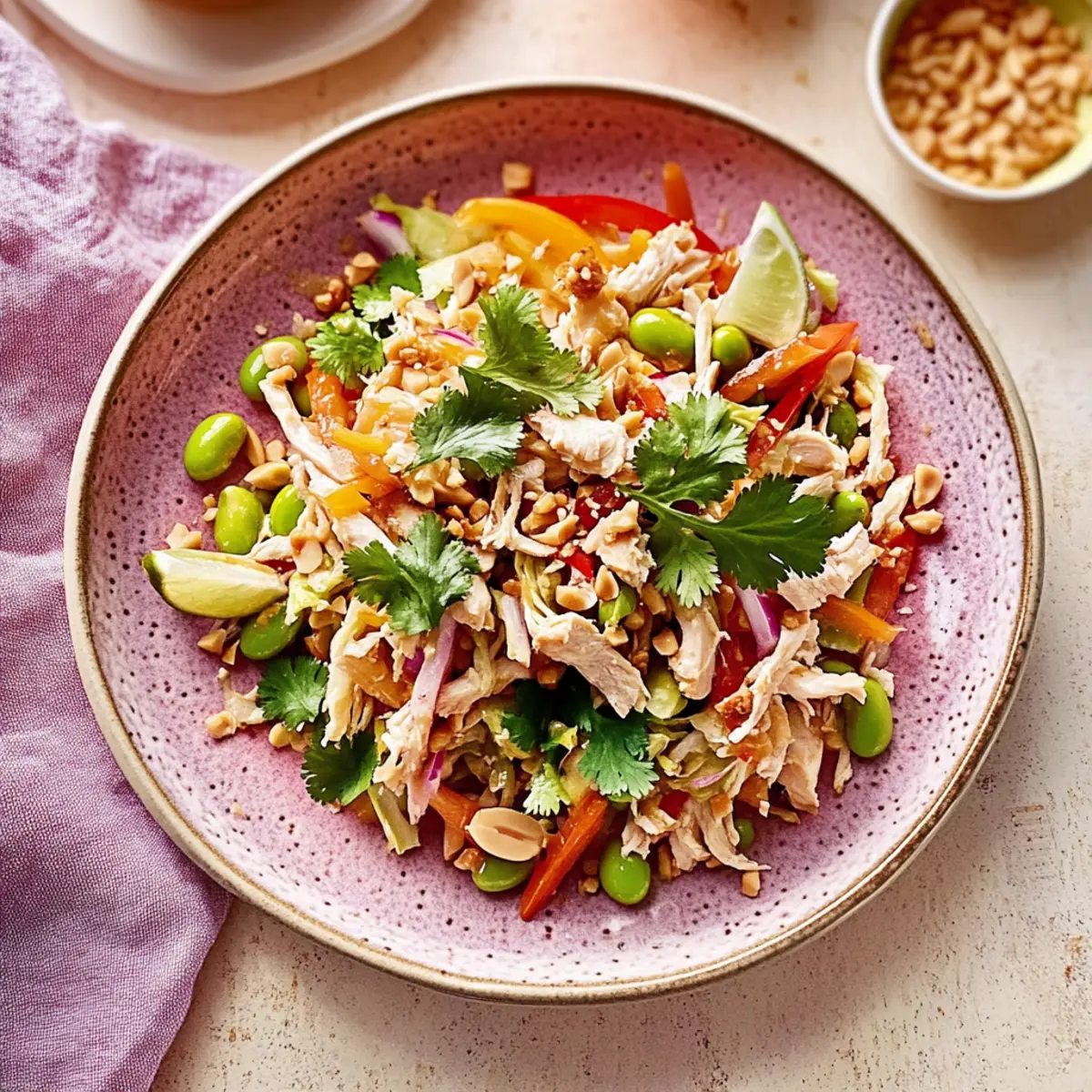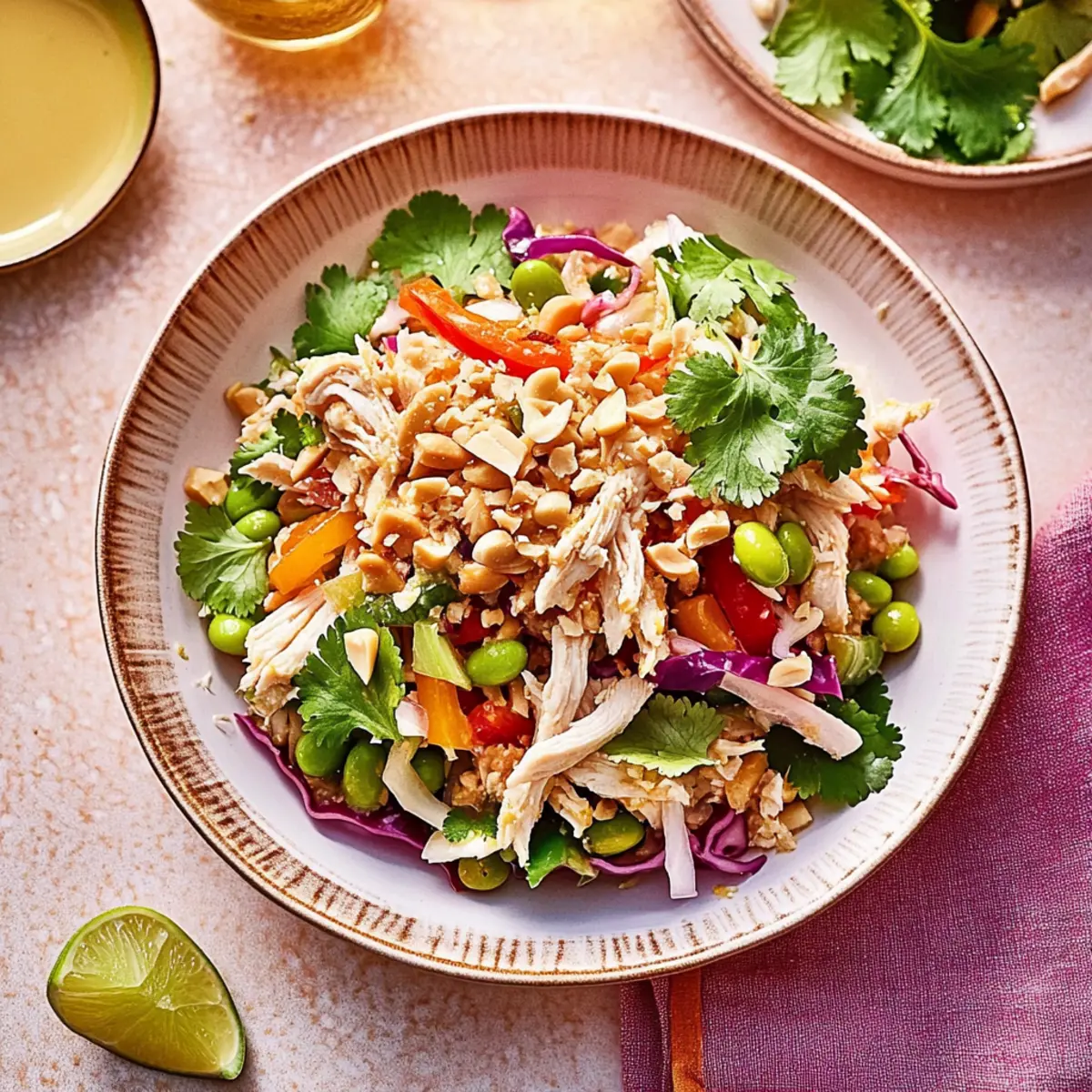 As I tossed the vibrant colors of this salad together, I could almost hear the bustling streets of Bangkok calling my name, filled with the enticing aromas of fresh ingredients. This High-Protein Thai-Inspired Chicken Salad is not just a dish; it’s a delightful marriage of crunchy cabbage slaw, succulent chicken, and a zesty peanut-lime dressing that’s gluten-free and dairy-free. Perfect for meal prep, this recipe saves not only time but also elevates your lunch game with bold, savory-sweet goodness. It’s light yet fulfilling, making it a go-to for those busy days when fast food feels all too tempting. Ready to take your lunch from mundane to extraordinary? Let’s dive into this flavor-packed adventure! Why is Thai-Inspired Chicken Salad a Must-try? Vibrant Flavors: This salad showcases a delicious amalgamation of tastes, blending sweet, salty, and tangy flavors for an unforgettable meal. High Protein: Packed with over 50 grams of protein, it ensures you stay energized and satisfied throughout your day. Meal Prep Friendly: Ideal for easy weeknight dinners or quick lunches, you can whip it up ahead of time and store it in the fridge. Customizable: Whether you stick with chicken or opt for shrimp or tofu, this recipe is perfect for clean-out-the-fridge creativity. Quick Assembly: With minimal cooking required, this dish is perfect for those frantic days when every minute counts. Pair it with some delicious Garlic Butter Chicken or a refreshing Crispy Orange Chicken for a perfect meal duo! Thai-Inspired Chicken Salad Ingredients This salad is as fun to make as it is to eat, and the ingredients shine with freshness! For the Salad • Slaw Mix – A crunchy base that adds texture; using a pre-packaged mix saves time. • Red Bell Pepper – Offers a burst of sweetness and vibrant color; swap for yellow or orange if desired. • Yellow Bell Pepper – Provides a milder flavor; can be omitted if you’re not a fan. • Cooked Chicken Breast – The main protein source, shredded or diced; rotisserie chicken makes it a breeze. • Honey Crisp Apple – Adds a delightful crunch and hint of sweetness; any crisp apple works in its place. • Shelled Edamame – Boosts protein while adding a pop of green; just thaw frozen edamame for convenience. • Cilantro Leaves – Fresh herb flavor that brightens the dish; parsley makes a fine alternative if you’re not a cilantro lover. • Scallion Greens – Provides a mild onion flavor; green onions can be used as a substitute. • Dry Roasted Peanuts – Adds a nice crunch; substitute with almonds or sunflower seeds for a nut-free option. • Toasted Sesame Seeds – Great for garnish, enhancing flavor and texture; feel free to omit if you prefer. For the Dressing • PBfit Peanut Butter Powder – Adds peanut flavor while lightening the dressing; regular peanut butter works too. • Lime Juice – Brightens the dressing with acidity; opt for fresh for the best taste. • Low Sodium Soy Sauce – Infuses umami; use gluten-free tamari to keep it gluten-free. • Maple Syrup – Sweetens the dressing; swap for agave for a vegan option. • Toasted Sesame Oil – Adds depth of flavor; avocado oil can serve as a neutral substitute. • Sriracha – Adds a kick; adjust the amount for your desired spice level. • Grated Ginger – Provides warmth and spice; ginger paste is a convenient substitute if you’re in a hurry. This Thai-Inspired Chicken Salad will surely add a burst of flavor to your meal prep while keeping you fueled and satisfied! Step‑by‑Step Instructions for High-Protein Thai-Inspired Chicken Salad Step 1: Prepare the Dressing In a medium bowl, whisk together ¼ cup of PBfit peanut butter powder, the juice of one lime, ¼ cup water, 2 tablespoons low sodium soy sauce, 1 tablespoon maple syrup, 1 tablespoon toasted sesame oil, 1 teaspoon sriracha, and 1 teaspoon grated ginger. Blend until the mixture is smooth and well-combined, creating a light dressing that will enhance the flavors in your Thai-Inspired Chicken Salad. Step 2: Combine Salad Ingredients In a large mixing bowl, combine your slaw mix with 1 diced red bell pepper, 1 diced yellow bell pepper, and 2 cups shredded cooked chicken breast. Next, add 1 diced honey crisp apple, 1 cup shelled edamame, ½ cup chopped cilantro leaves, and ¼ cup chopped scallion greens. Mix the colorful ingredients thoroughly, ensuring everything is evenly distributed for a delightful crunch in each bite. Step 3: Dress the Salad If you’re planning to serve the salad immediately, drizzle the prepared dressing over the combined salad ingredients. Then, sprinkle ¼ cup dry roasted peanuts and 1 tablespoon toasted sesame seeds on top. Toss everything gently to ensure each piece is coated in the zesty dressing, creating a beautiful medley of textures and flavors for your High-Protein Thai-Inspired Chicken Salad. Step 4: Meal Prep Storage For meal prep, it’s best to store the dressing separately to keep the salad fresh. Transfer the salad mixture to an airtight container, and pour the dressing into a small jar or container. Refrigerate both until you’re ready to serve, ensuring maximum crunch and flavor when it’s mealtime. The salad can stay fresh in the fridge for up to three days. How to Store and Freeze Thai-Inspired Chicken Salad Fridge: Store the Thai-Inspired Chicken Salad in an airtight container for up to 3 days, keeping the dressing separate until serving to maintain freshness. Freezer: It’s not recommended to freeze the salad due to the texture of the fresh vegetables; however, you can freeze the dressing for up to 1 month. Thaw in the fridge before use. Reheating: If you decide to use leftover cooked chicken, simply heat it in a microwave until warmed through, but avoid reheating the salad itself to preserve the crunch. Expert Tips for Thai-Inspired Chicken Salad • Choose Fresh Ingredients: Use fresh vegetables and herbs to elevate the flavors of your Thai-Inspired Chicken Salad, enh