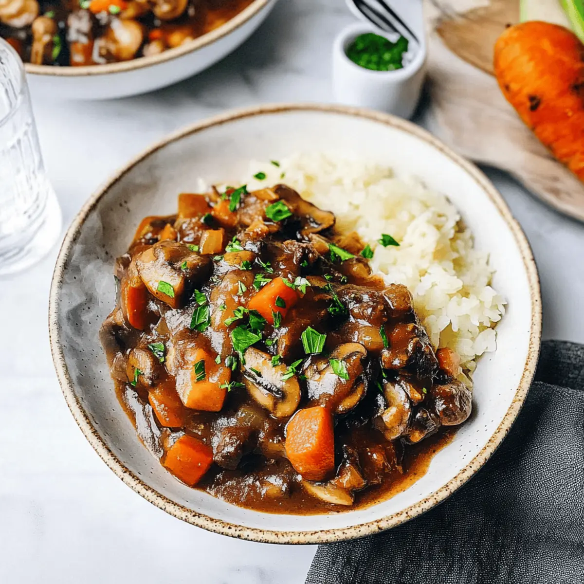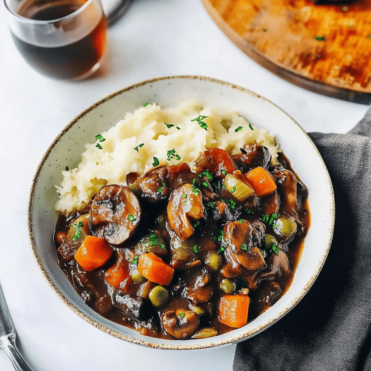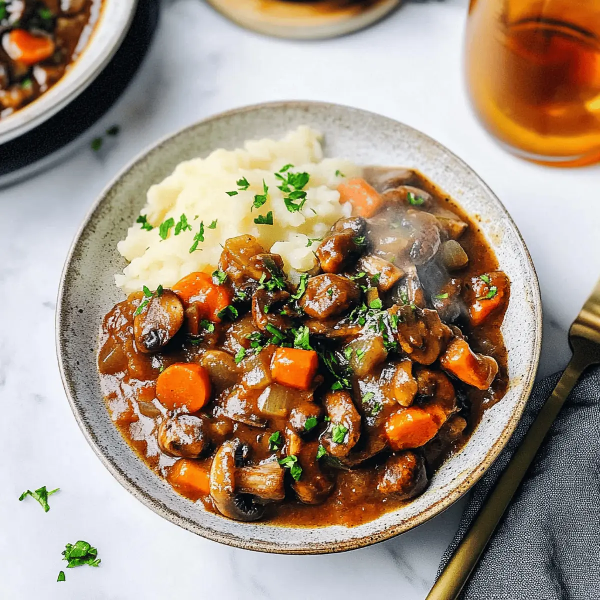 As I flipped through my favorite cookbook one chilly evening, I stumbled upon a recipe that seemed to whisper promises of warmth and comfort: Vegan Mushroom Bourguignon. This dish brings a delightful vegan twist to a beloved classic, making it perfect for those of us seeking hearty, satisfying meals without the meat. Rich in umami flavor and dressed in a velvety sauce, it’s the ultimate comfort food to share on a romantic night in or simply to savor on a quiet evening at home. Plus, its flexibility with ingredient substitutions means you can adapt it to what you have on hand, making it both practical and exciting. Are you ready to create a cozy masterpiece that will please not just your taste buds but your heart as well? Let’s dive into this delightful recipe together! Why is Vegan Mushroom Bourguignon a Must-Try? Comforting Warmth: This hearty dish brings an unbeatable combination of flavors to your table, perfect for chilly evenings. Flavor Explosion: Packed with umami-rich mushrooms and aromatic herbs, every bite is a journey through deep, savory notes. Versatile Ingredients: Discover the freedom to swap ingredients based on your pantry, whether it’s using different mushrooms or flavorful side dishes like mashed potatoes or even spinach mushroom pasta. Quick and Easy: With straightforward steps, you’ll have a delicious dinner ready in no time, allowing you to focus on cozying up with loved ones. Impressive Presentation: Serve it in a beautiful dish to create an elegant meal that looks just as good as it tastes, perfect for a romantic night in or a gathering with friends. Vegan Mushroom Bourguignon Ingredients For the Mushroom Base • Dried Porcini Mushrooms – Adds intense flavor and umami depth; substitute with any dried mushrooms available if necessary. • Cremini Mushrooms – Fresh mushrooms that enhance the dish’s texture and taste; use button mushrooms if cremini aren’t on hand. • Garlic Cloves – Infuses aroma and depth of flavor; for convenience, garlic powder can be used, though fresh is preferred. For the Vegetables • Yellow Onion – Provides sweetness and base flavor; red onion can be substituted for a slightly sharper taste. • Carrots – Adds natural sweetness and texture; any color of carrots can be utilized for variety. • Red Bell Pepper – Contributes sweetness and color; swap with green bell peppers for a different flavor profile. For the Cooking Fat • Extra Virgin Olive Oil – Used for sautéing vegetables; can be swapped with avocado oil or your preferred cooking oil. • Vegan Butter – For a creamy finish; substitute with margarine or coconut oil for a dairy-free option. For Seasoning and Thickness • Flour – Helps to thicken the sauce; consider using all-purpose or gluten-free flour like garbanzo bean flour. • Dried Thyme & Oregano – These herbs add flavor; fresh herbs can be used, increasing the amounts to three times for fresh equivalents. For the Sauce • Tomato Paste – Adds richness and color; can be replaced with crushed tomatoes but reduce the liquid elsewhere. • Full-Bodied Red Wine – Enhances richness and depth; for a non-alcoholic version, mix vegetable broth with pomegranate juice. • Salt & Pepper – Essential for seasoning to taste; adjust based on your preference. For Serving • Mashed Potatoes or Pasta – Pairs beautifully with the bourguignon; explore alternatives like polenta or rice for variety. Step‑by‑Step Instructions for Vegan Mushroom Bourguignon Step 1: Rehydrate the Dried Mushrooms Begin by placing the dried porcini mushrooms in a bowl and covering them with 1 cup of hot water. Allow them to soak for about 20 minutes until they are plump and tender. Once rehydrated, carefully remove the mushrooms, ensuring no sand or grit is included, and retain the soaking liquid for later use in the Vegan Mushroom Bourguignon. Step 2: Sauté the Vegetables In a large pot, heat 2 tablespoons of extra virgin olive oil over medium heat. Add the chopped yellow onion, diced carrots, and diced red bell pepper. Sauté the vegetables for approximately 3 minutes, stirring occasionally, until the onions become translucent and the bell pepper begins to soften. This step sets the base flavor for your comforting Vegan Mushroom Bourguignon. Step 3: Add Fresh Mushrooms and Garlic Now, add the sliced cremini mushrooms and minced garlic to the pot, stirring well to combine. Continue to cook for 7 to 10 minutes, allowing the mushrooms to release their liquid and turn golden brown. This step infuses your dish with rich, deep flavors that are essential for a hearty Vegan Mushroom Bourguignon. Step 4: Incorporate Porcini and Tomato Paste Chop the rehydrated porcini mushrooms and add them to the pot along with 2 tablespoons of tomato paste. Stir everything together and cook for another 3 minutes, ensuring the tomato paste becomes fragrant and well integrated into the mix. This adds a layer of richness to your Vegan Mushroom Bourguignon. Step 5: Deglaze with Wine and Mushroom Liquid Pour in 1 cup of full-bodied red wine and the reserved mushroom soaking liquid to deglaze the pot. Bring the mixture to a boil, scraping any browned bits off the bottom, then reduce the heat to low and let it simmer for about 10 minutes. This process will concentrate the flavors, enriching your Vegan Mushroom Bourguignon perfectly. Step 6: Thicken the Sauce In a small bowl, mix together 2 tablespoons of vegan butter with 2 tablespoons of flour to create a crumbly texture. Gradually add this mixture to the simmering pot while stirring continuously until the sauce thickens. This will give your Vegan Mushroom Bourguignon a luxurious, velvety consistency that is absolutely delightful. Step 7: Final Seasoning and Serve Taste the Vegan Mushroom Bourguignon and adjust with salt and pepper as needed. Once seasoned to your liking, serve the dish warm over a bed of creamy mashed potatoes or pasta. Garnish with freshly chopped chives for a pop of color and a