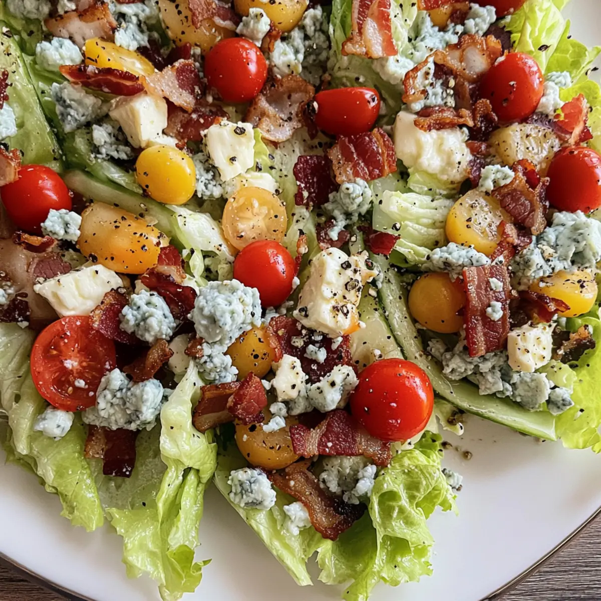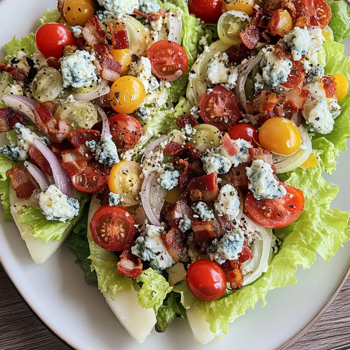 As I took my first bite, the refreshing crunch of icy lettuce paired with the smoky richness of crisp bacon sent my taste buds into joyous celebration. This Mind-Blowing Wedge Salad is more than just another side dish; it’s an unforgettable culinary experience that elevates meals to new heights. With its vibrant colors and a tantalizing mix of textures, this salad is not only a feast for the eyes but also an irresistible addition to your dining table. Whether you’re cooking for a wholesome family dinner or hosting friends, this gluten-free option is a main dish that delivers both satisfaction and health benefits. Ready to impress everyone with a salad that’s anything but ordinary? Let’s dive into creating this stunning dish! Why is Wedge Salad a Must-Try? Irresistible crunch: The refreshing bite of crisp lettuce makes this salad a delight for your palate. Flavor explosion: Smoky bacon and tangy blue cheese elevate each forkful, tantalizing your taste buds. Versatile variations: From a Summer Celebration Wedge Salad to Whole30 options, you can customize this recipe to suit any dietary preference! Colorful presentation: With vibrant ingredients like cherry tomatoes and marinated onions, it’s as pleasing to the eyes as it is delicious. Perfect as a main dish: Whether paired with grilled meats or served alone, this wedge salad is not just a side—it’s a showstopper that works wonderfully for any occasion. Explore how to complement it with a refreshing Cucumber Caprese Salad or a hearty Crab Pasta Salad for a complete meal experience! Wedge Salad Ingredients • Discover the satisfying components that make this wedge salad truly mind-blowing! For the Salad Base Iceberg/Romaine Lettuce – Crisp leafy greens provide the perfect crunch; swap with your favorite crisp green if desired. Gluten-Free Croutons – Adds delightful crunch and flavor; opt for homemade if you want a personal touch. For the Toppings Cherry Tomatoes – Bring bursts of sweetness to the salad; grape tomatoes are a great substitute. Bacon – Adds a smoky richness; choose Whole30-compatible bacon for a diet-friendly version. Blue Cheese Crumbles – Creamy and tangy goodness that elevates every bite; feel free to replace with feta or goat cheese for a different flavor. Marinated Onions – Offers a zesty crunch; you can mix in fresh onions for a sharper taste. For the Dressing Olive Oil – The foundation of the dressing; enhances all flavors beautifully. Lemon Juice – Adds brightness and acidity, balancing out the richness; lime juice can also work well as a swap. Whole30 Mayo – Essential for a creamy dressing; regular mayo is fine for non-Whole30 preparations. Embrace the crispiness and flavors of this Wedge Salad as you explore our balanced ingredient list, guaranteed to create a dish that’s both satisfying and visually stunning! Step‑by‑Step Instructions for Wedge Salad Step 1: Prepare the Lettuce Start by rinsing the iceberg or romaine lettuce under cold water to remove any dirt. Pat it dry using a clean kitchen towel or paper towel. Using a sharp knife, slice the lettuce head into quarters, creating wedges. Aim for even cuts to maintain the structural integrity of each wedge, which will serve as the base of your Wedge Salad. Step 2: Cook the Bacon In a large skillet, heat over medium heat and add your bacon strips. Cook for about 5–7 minutes, or until the bacon is golden brown and crispy, flipping once to ensure even cooking. Once done, transfer the crispy bacon to a paper towel-lined plate to drain excess grease. Crumble the cooled bacon into bite-sized pieces to top your Wedge Salad later. Step 3: Make the Dressing In a blender or mixing bowl, combine olive oil, fresh lemon juice, Whole30 mayonnaise, salt, and pepper. Blend or whisk until the dressing achieves a smooth and creamy consistency, approximately 1–2 minutes. Taste and adjust the seasoning as necessary; you want the dressing to be flavorful yet balanced, ready to complement the mixture of textures in your Wedge Salad. Step 4: Assemble the Salad On a large serving platter or individual plates, arrange the lettuce wedges upright. Begin layering by adding gluten-free croutons generously over the top of each wedge. Follow this by sprinkling the crumbled bacon, cherry tomatoes, and blue cheese crumbles over the lettuce. Finally, heap the marinated onions on top, creating a delightful visual appeal that will invite everyone to dig in. Step 5: Drizzle with Dressing Once the Wedge Salad is beautifully arranged, take your freshly prepared dressing and drizzle it generously over each lettuce wedge. Ensure every component gets a touch of that creamy goodness. For an extra touch of color, garnish with freshly chopped chives or herbs if desired; this not only boosts the flavor but enhances the overall presentation of your magnificent Wedge Salad. Wedge Salad Variations & Substitutions Feel free to give your Wedge Salad a personal twist by exploring these delightful variations! Grilled Protein: Add grilled shrimp or chicken to make this salad heartier. If you’re striving for a well-rounded meal, the smoky warmth of grilled protein complements the salad beautifully. Dairy-Free Delight: Substitute blue cheese with a creamy vegan alternative like cashew cheese or a dairy-free feta. This not only caters to vegan diets but also introduces a lovely nutty flavor. Spicy Kick: Toss in some sliced jalapeños or a sprinkle of red pepper flakes for an extra layer of heat. This twist not only excites the palate but also adds a zing that pairs well with the rich bacon. Zesty Dressing: Switch up the dressing by trying a homemade Green Goddess or Creamy Avocado dressing for a refreshing change. Each offers a vibrant tang that brightens the salad further. Veggie Power: Enhance the salad’s nutrient profile by adding extra colorful veggies, like bell peppers or radishes. The added crunch and color make the presentation pop! Savory Swaps: Replace bacon with cr